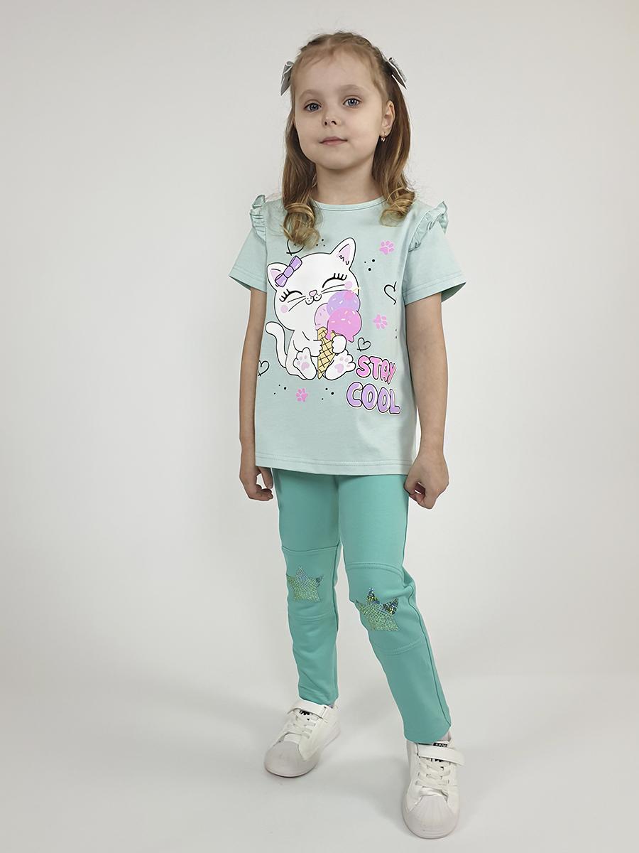 Кулирное полотно:100% х/б. Фуфайка-силуэт трапеция,короткий втачной рукав,в пройме рюша.Горловина окантована,застежка на пуговицу по спинке.Печать на переде.