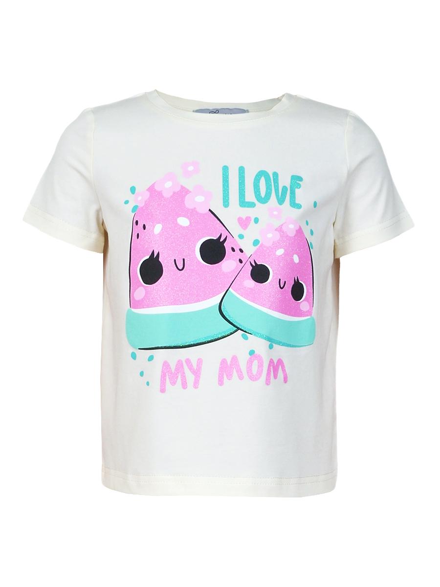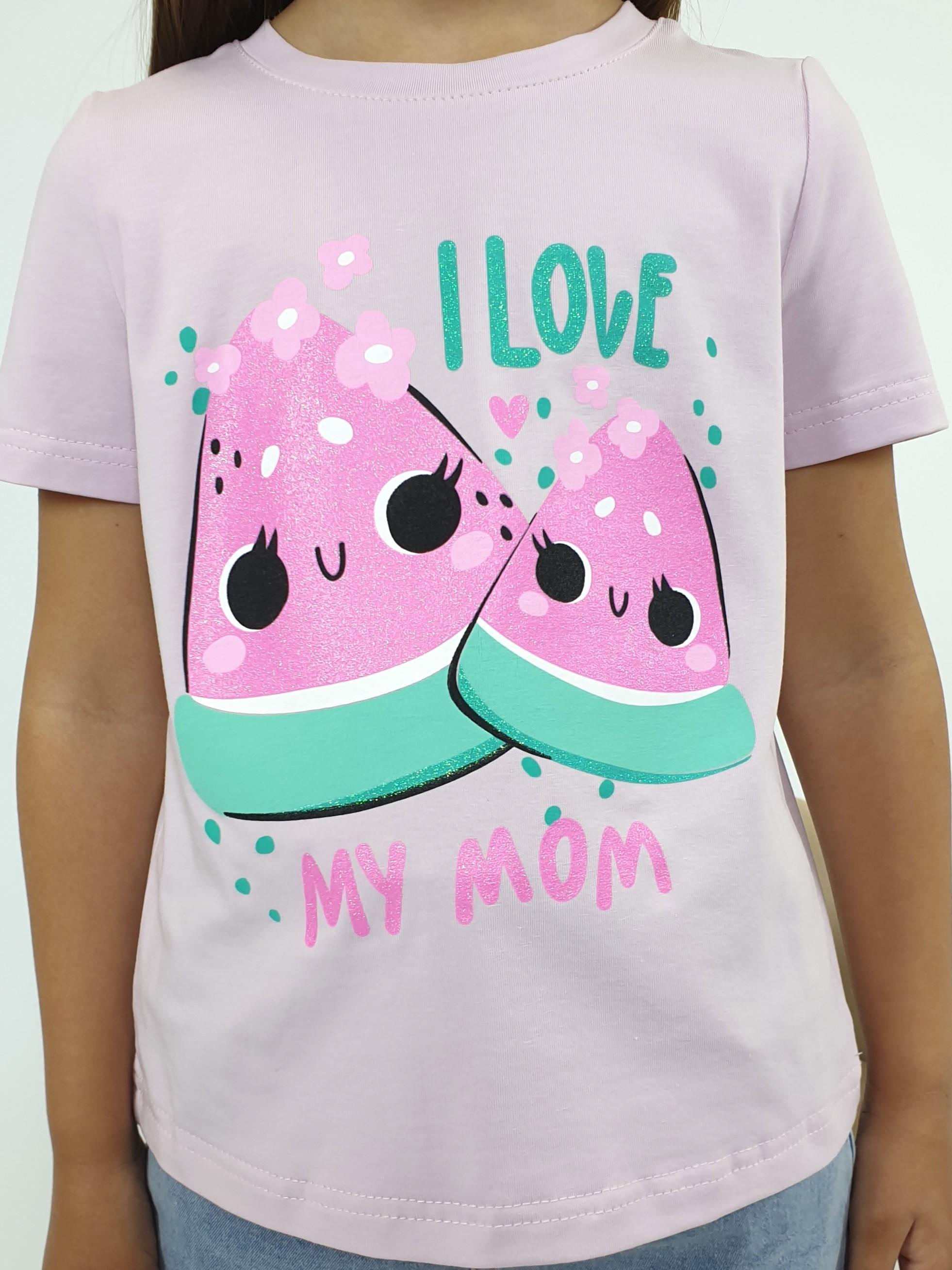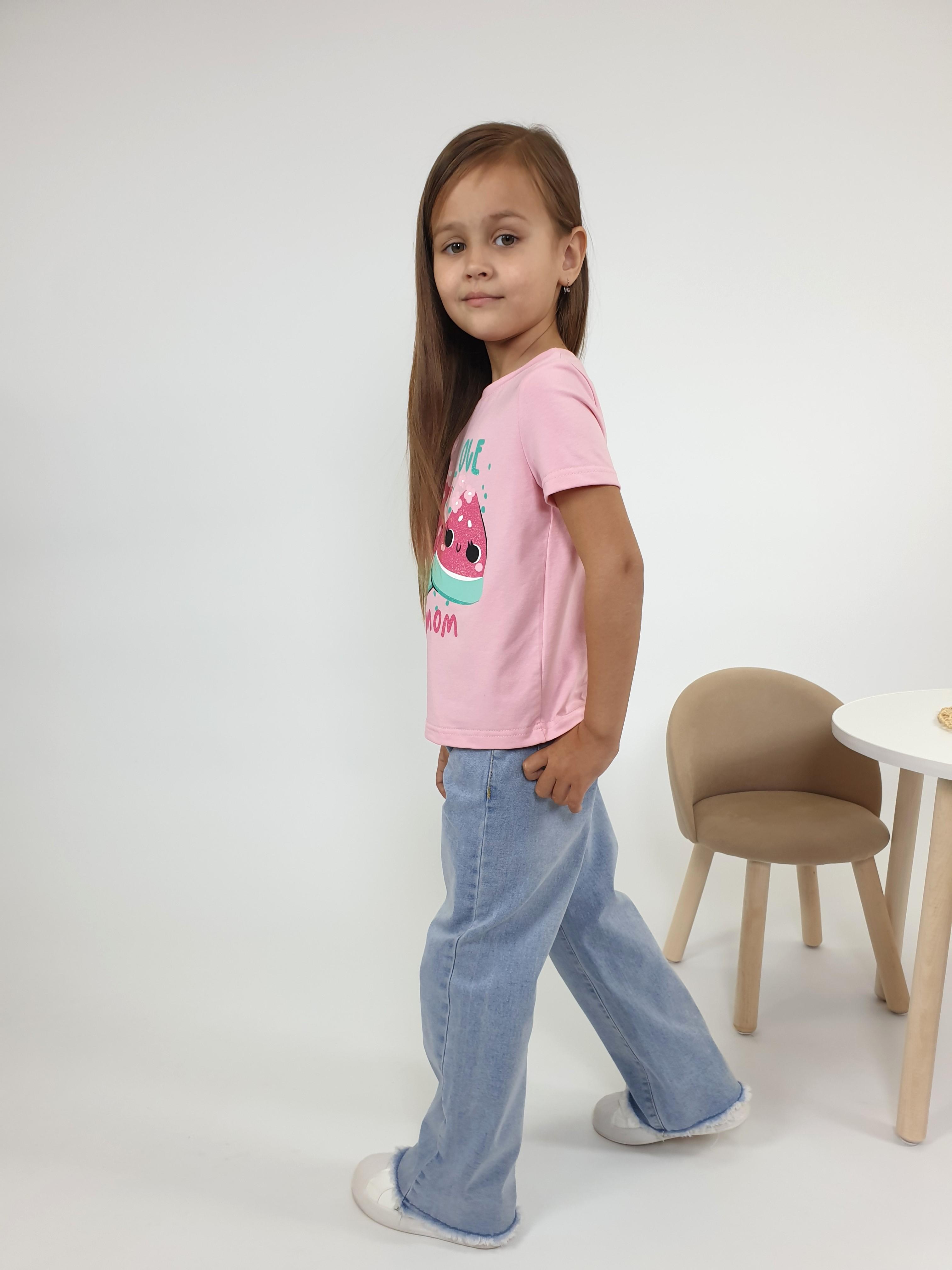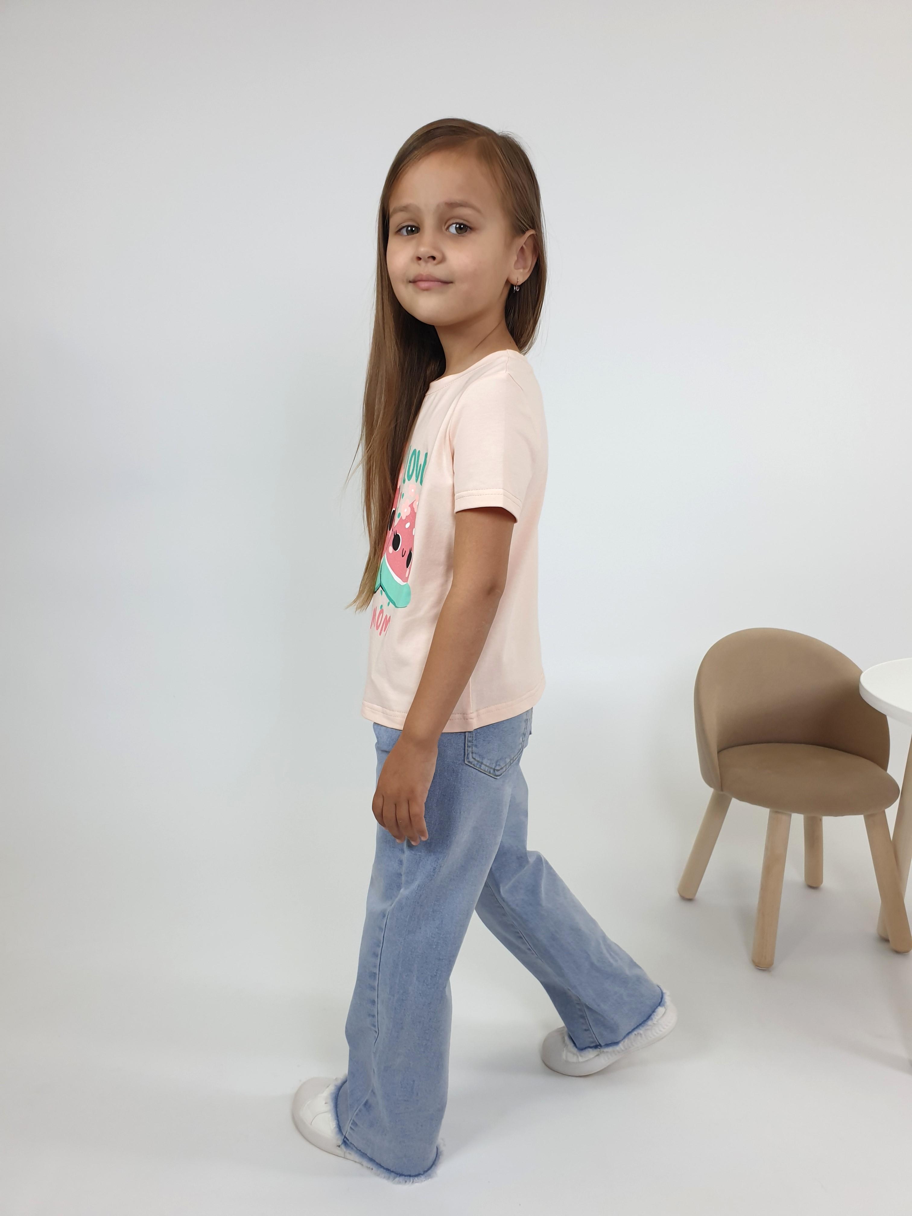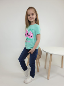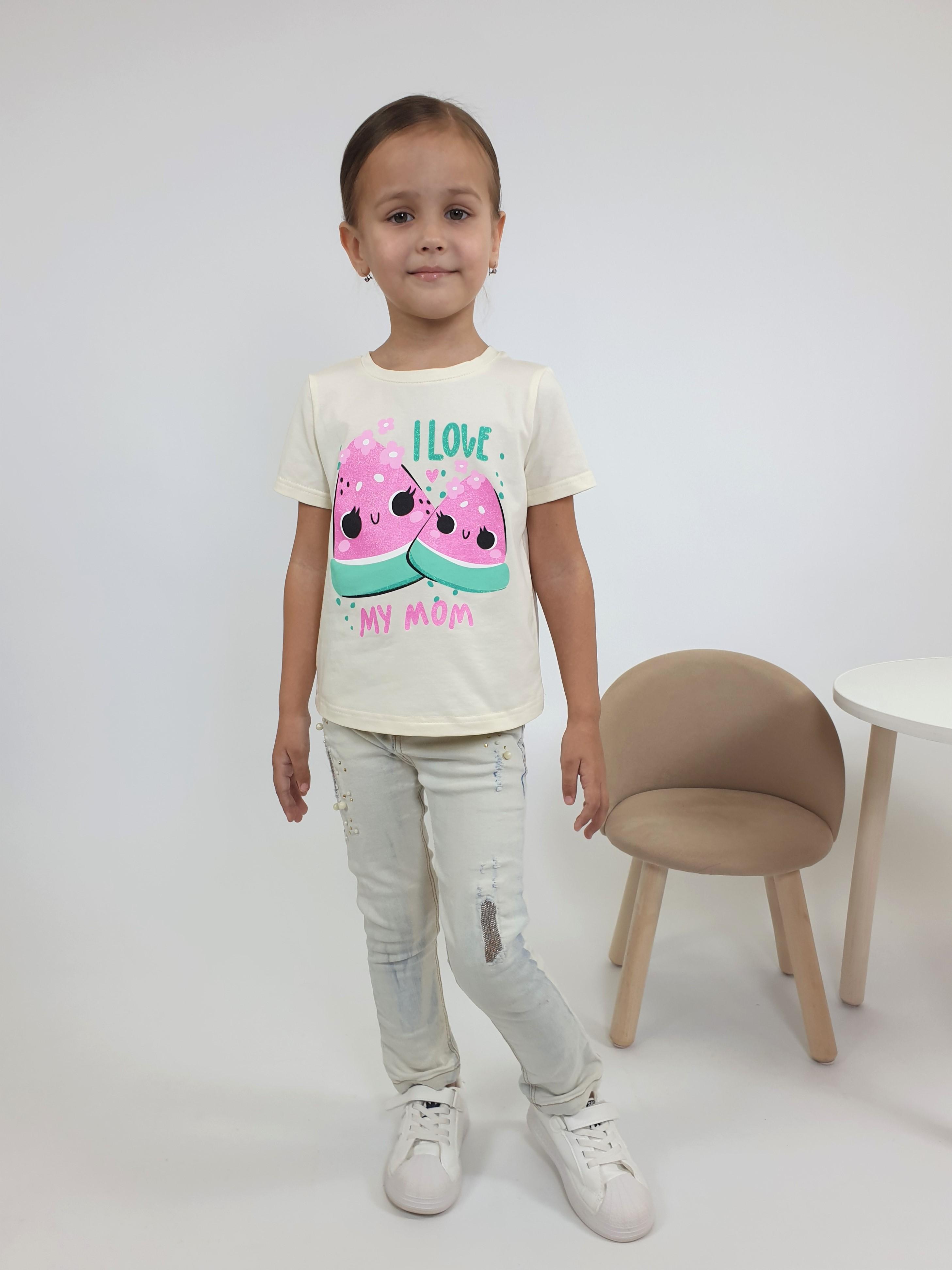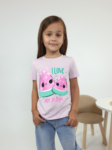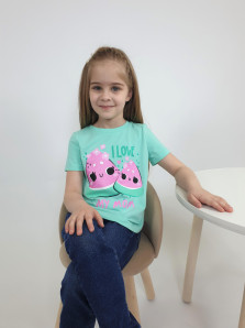 Кулирное полотно:95% х/б,5% лайкра. Фуфайка-прямой силуэт,печать на переде,короткий втачной рукав.Низ рукава и фуфайки подшит.Горловина обработана ластиком.