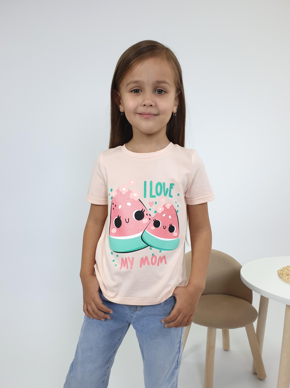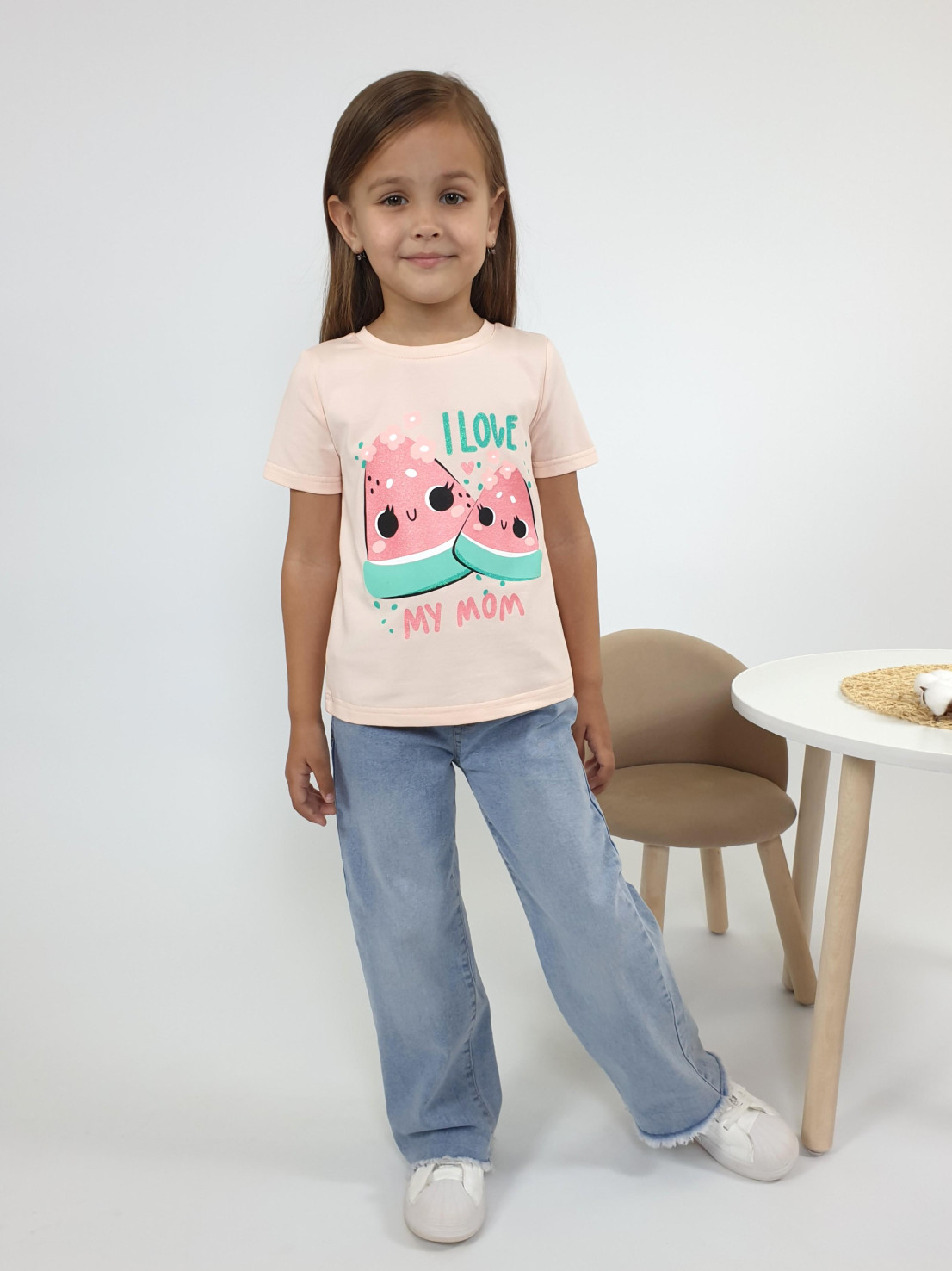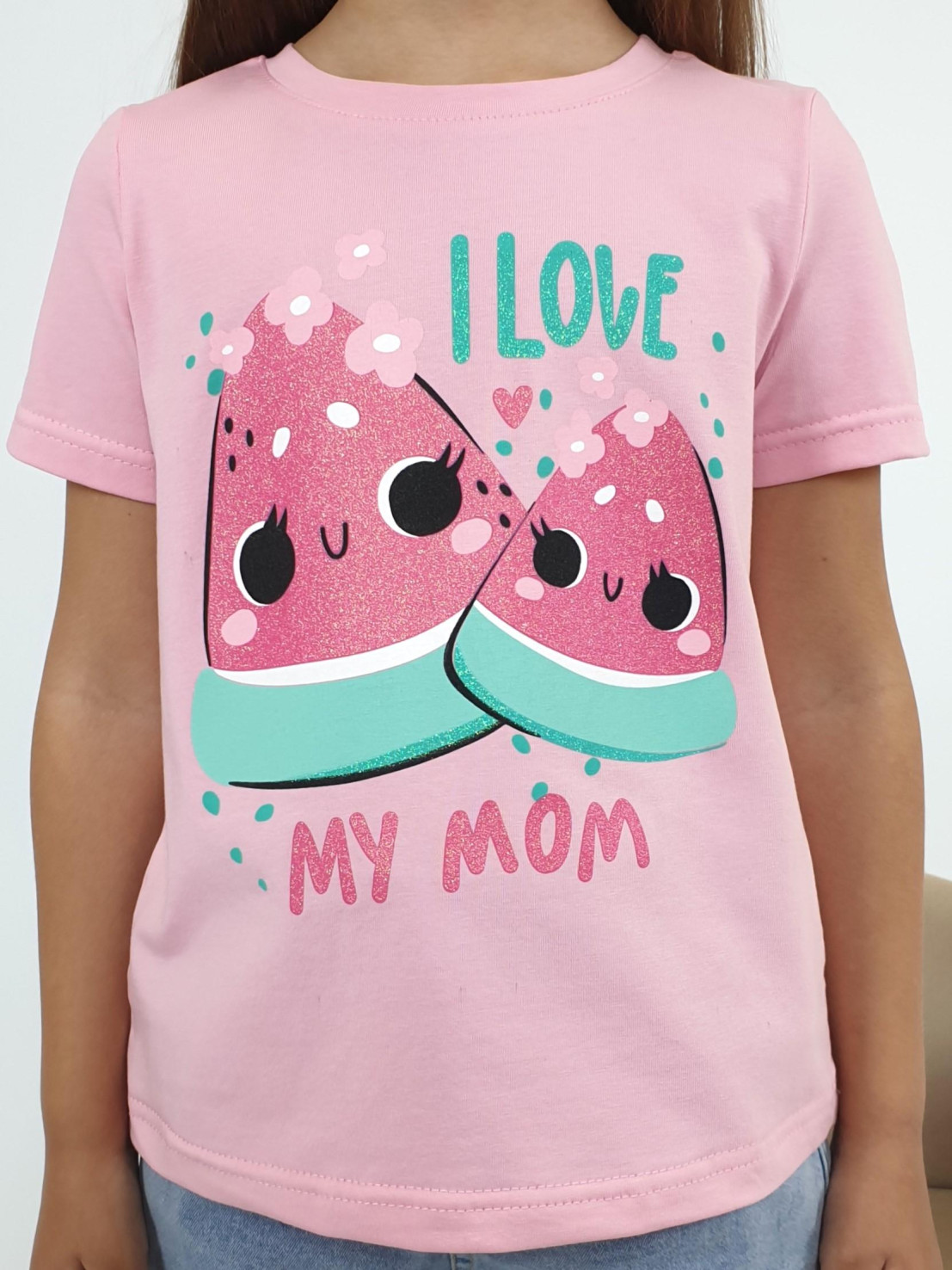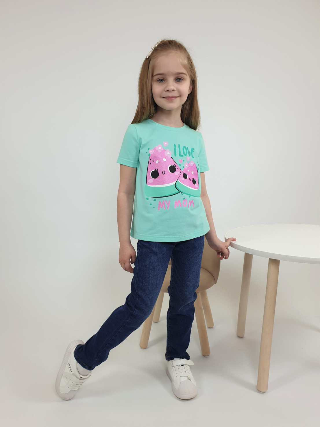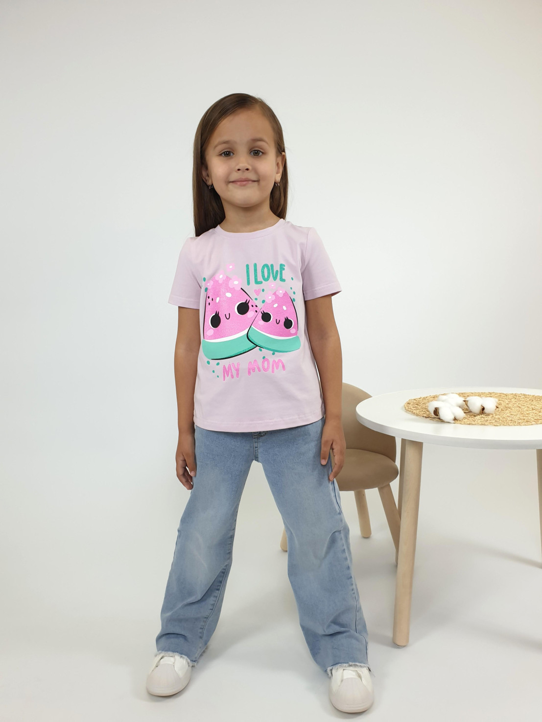 Кулирное полотно:95% х/б,5% лайкра. Фуфайка-прямой силуэт,печать на переде,короткий втачной рукав.Низ рукава и фуфайки подшит.Горловина обработана ластиком.