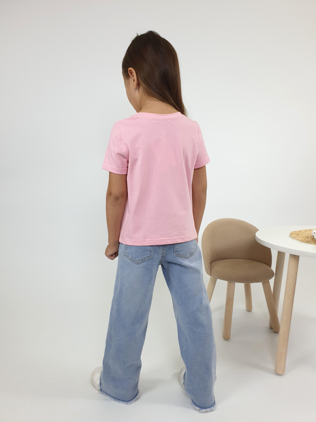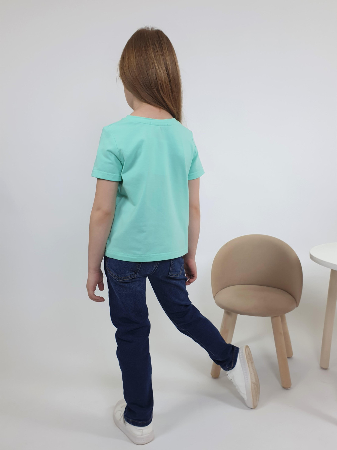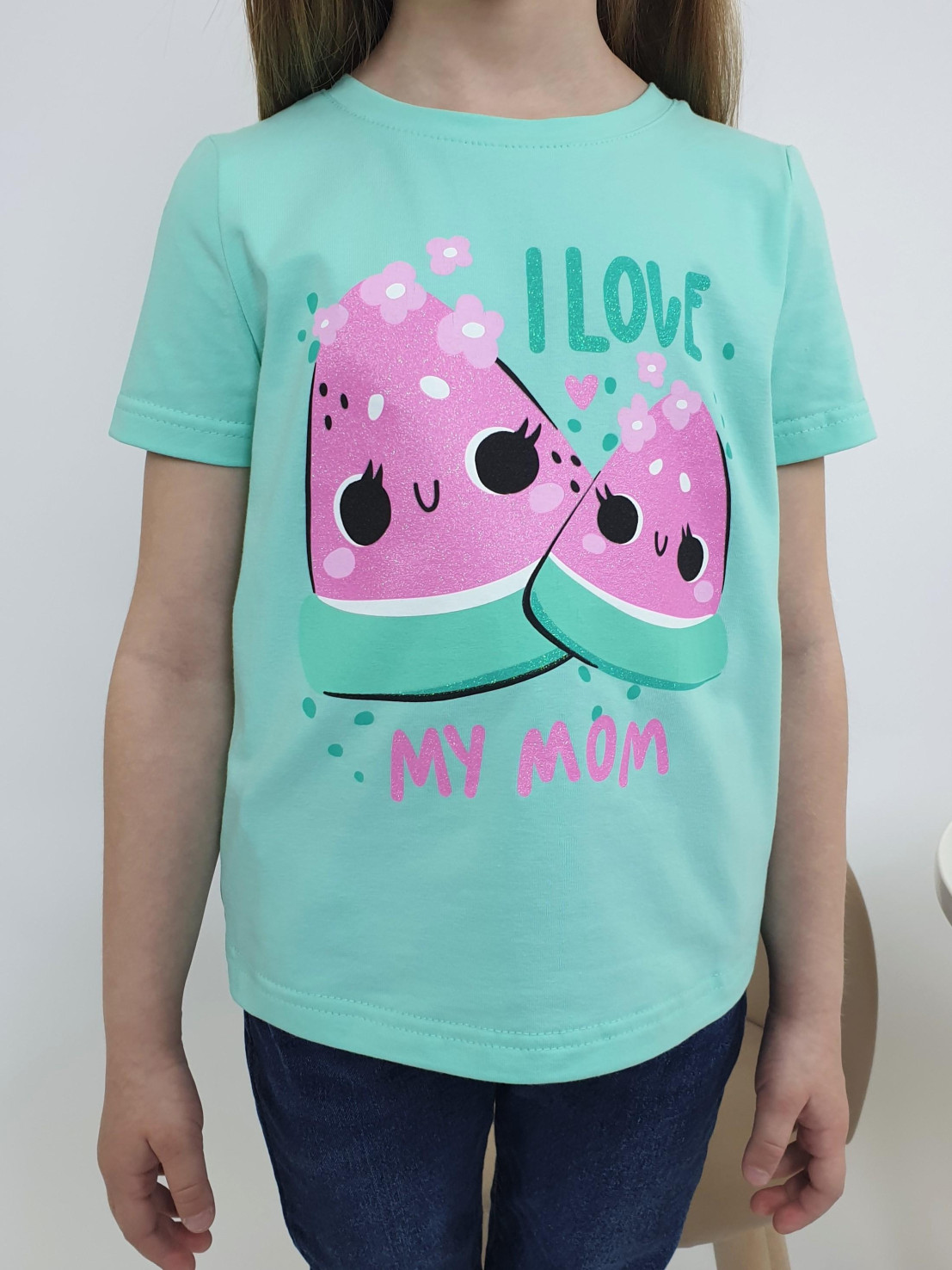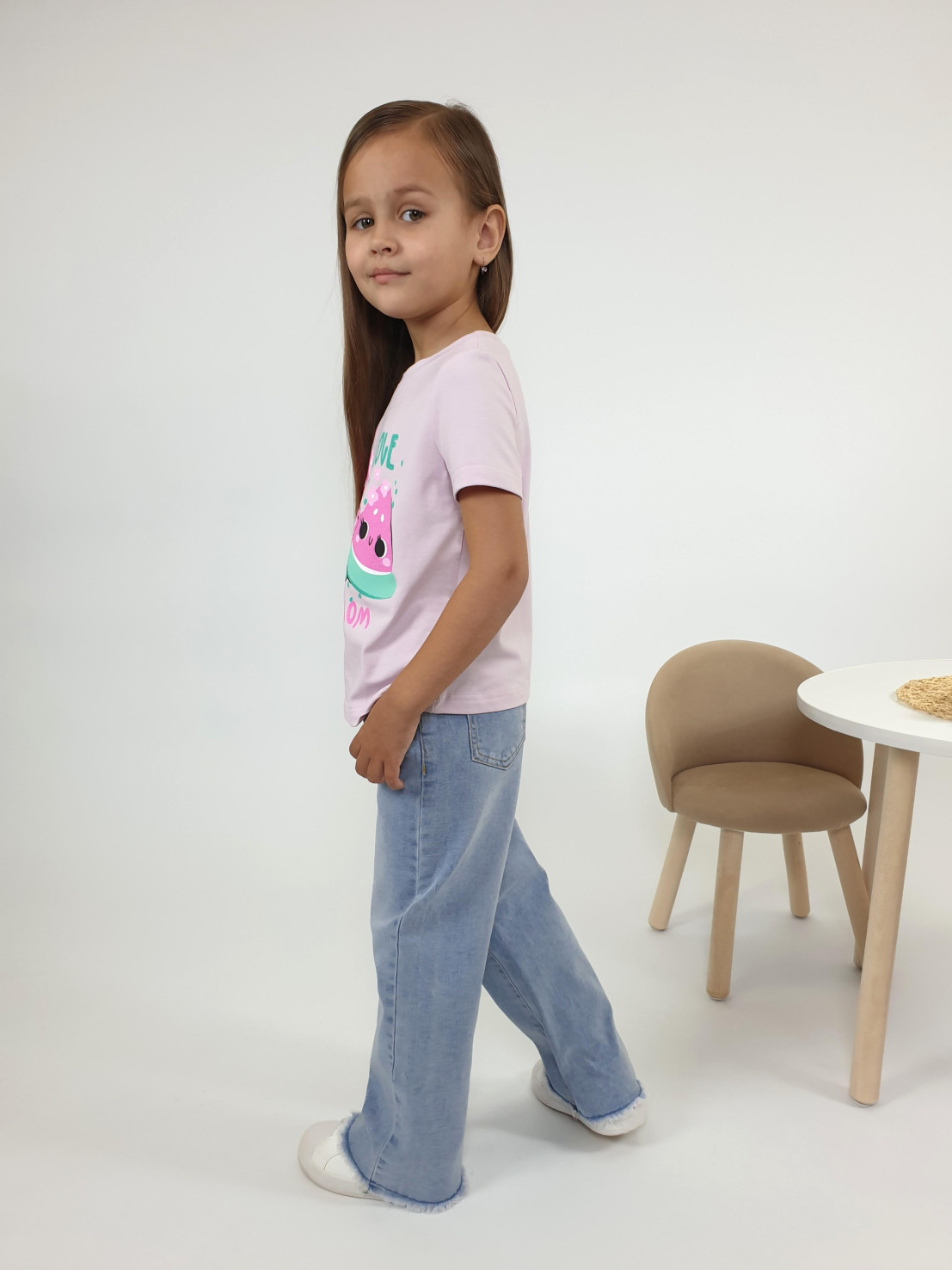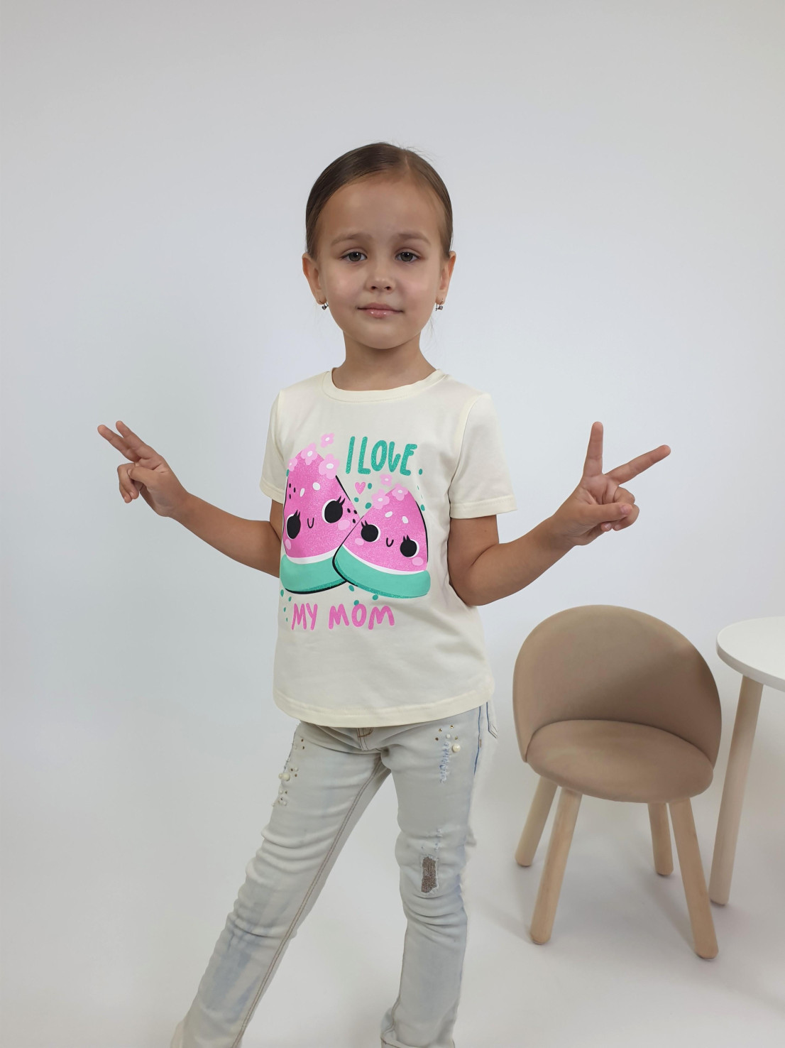 Кулирное полотно:95% х/б,5% лайкра. Фуфайка-прямой силуэт,печать на переде,короткий втачной рукав.Низ рукава и фуфайки подшит.Горловина обработана ластиком.