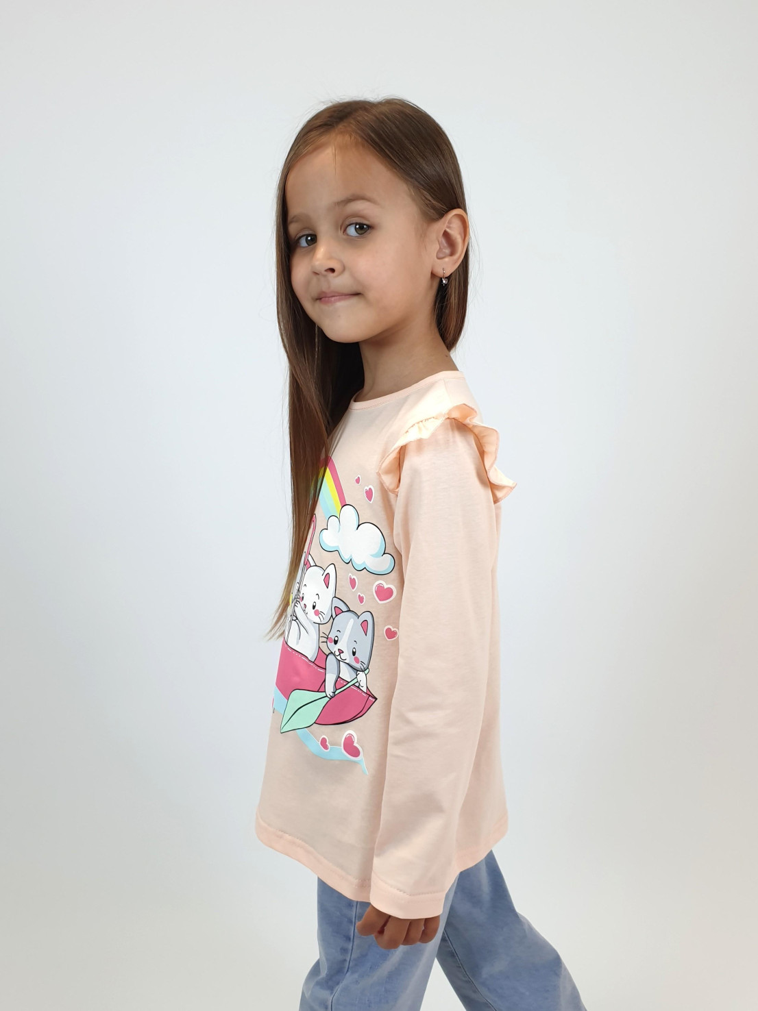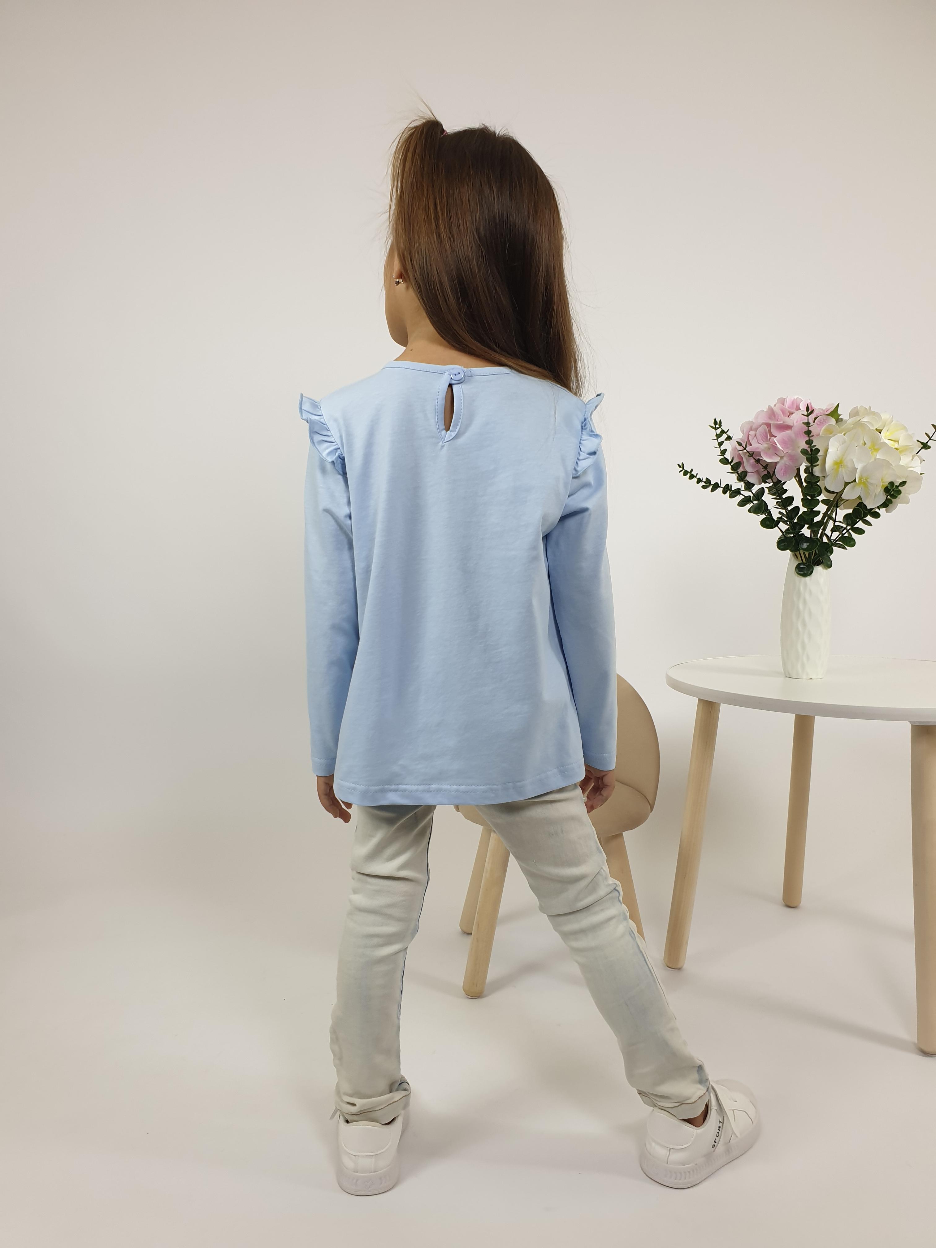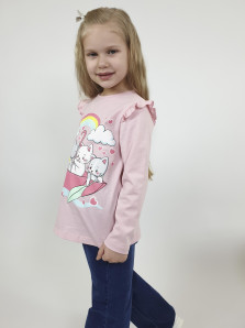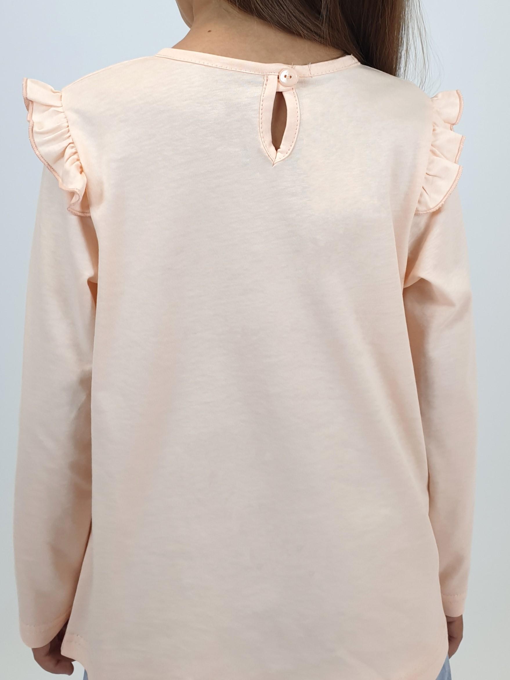 Кулирное полотно:100% х/б. Фуфайка-силуэт трапеция,длинный втачной рукав,в пройме рюша.Горловина окантована,застежка на пуговицу по спинке.Печать на переде.