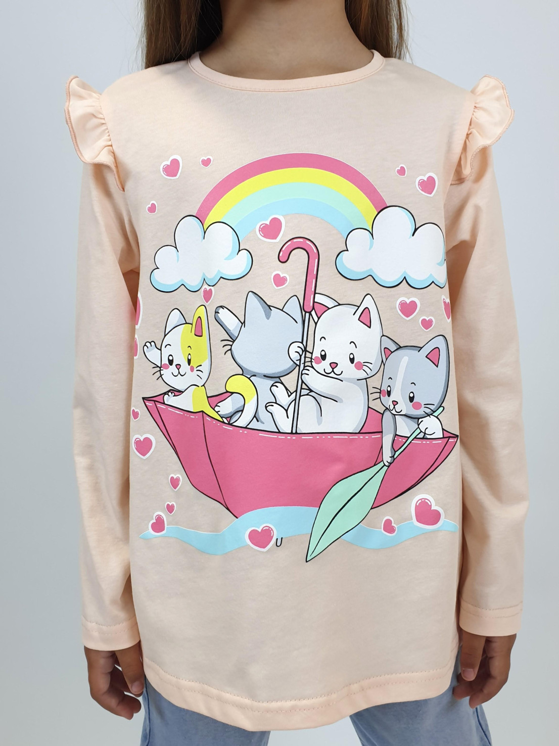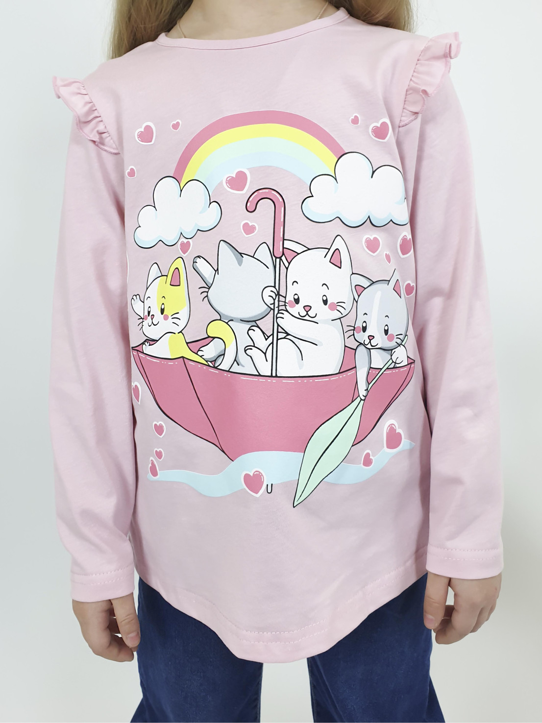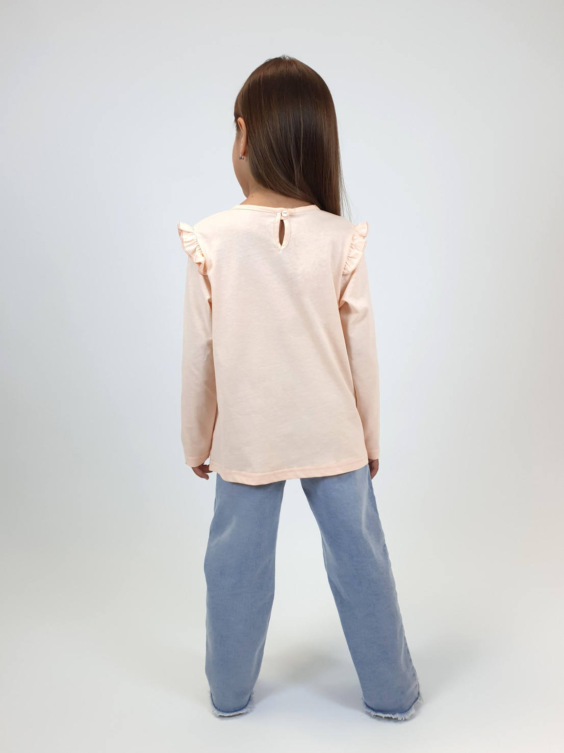 Кулирное полотно:100% х/б. Фуфайка-силуэт трапеция,длинный втачной рукав,в пройме рюша.Горловина окантована,застежка на пуговицу по спинке.Печать на переде.