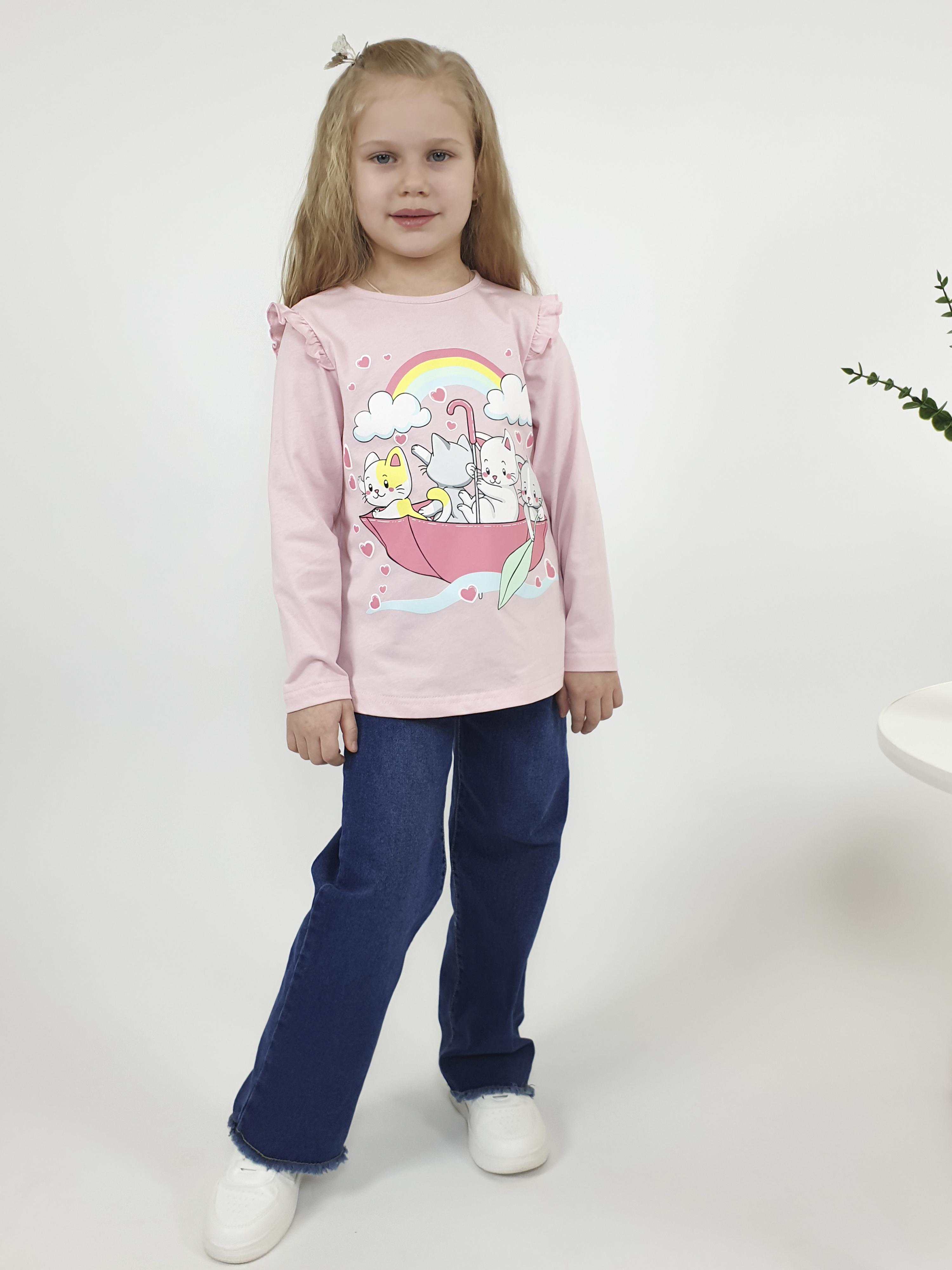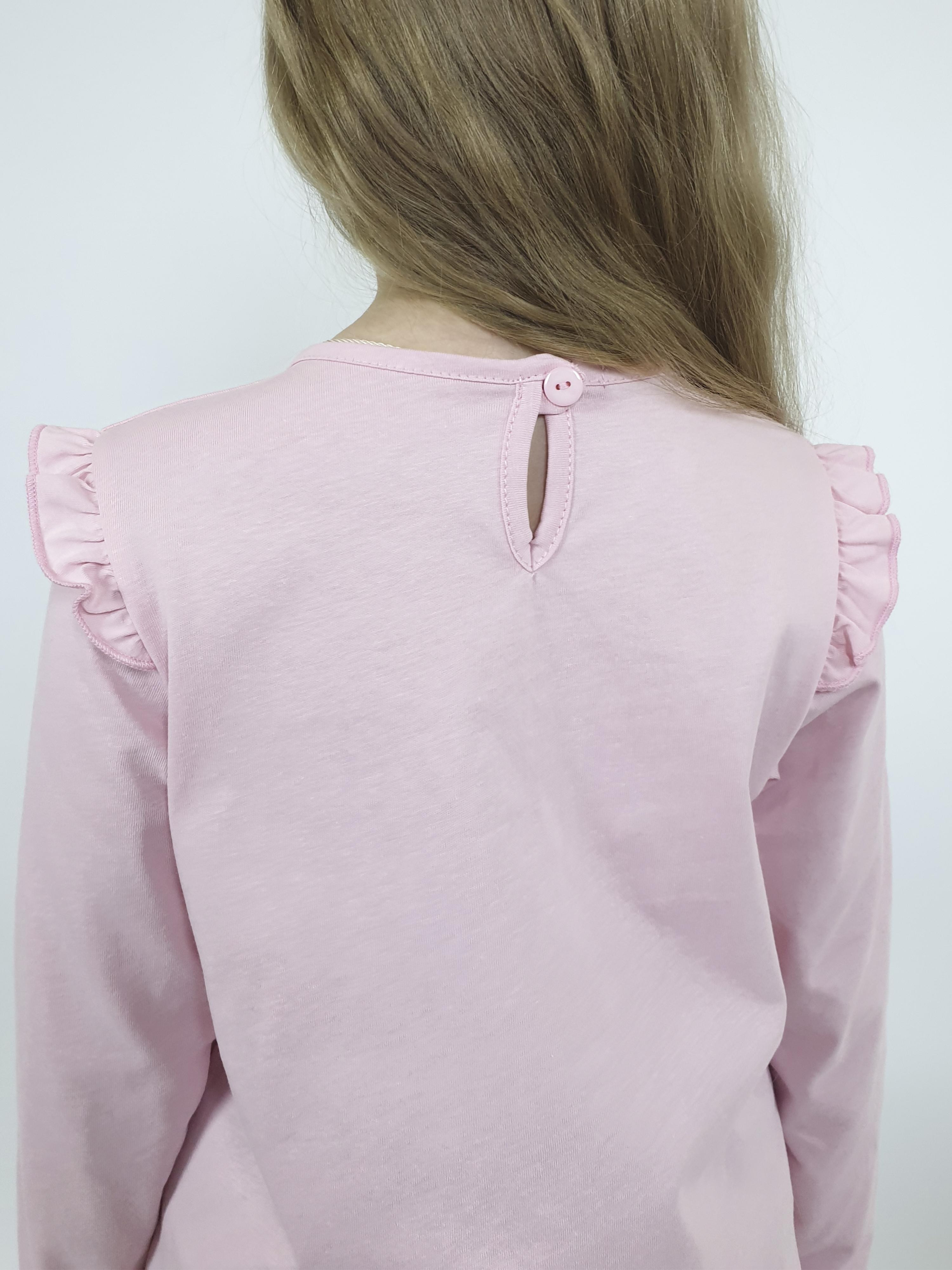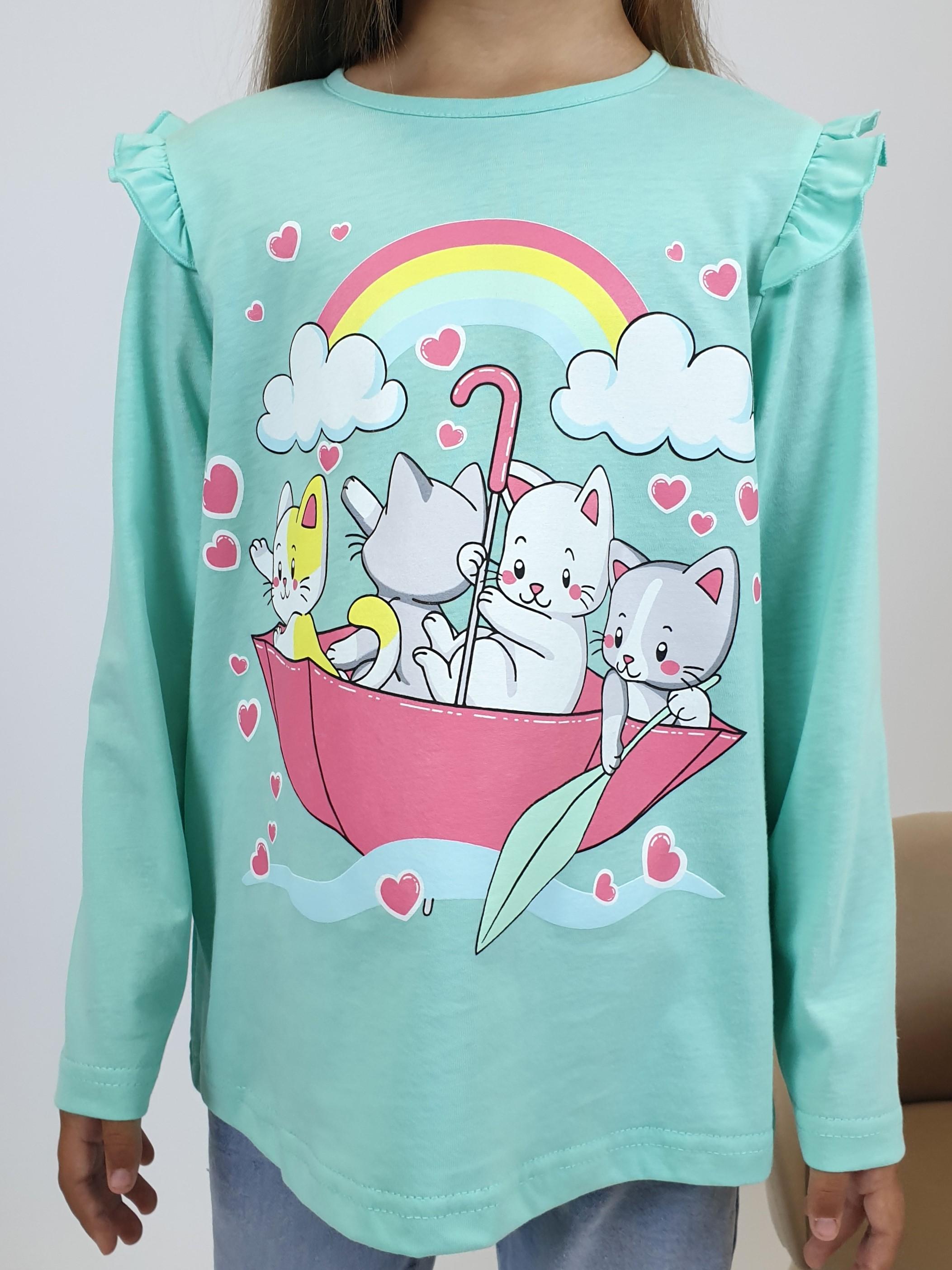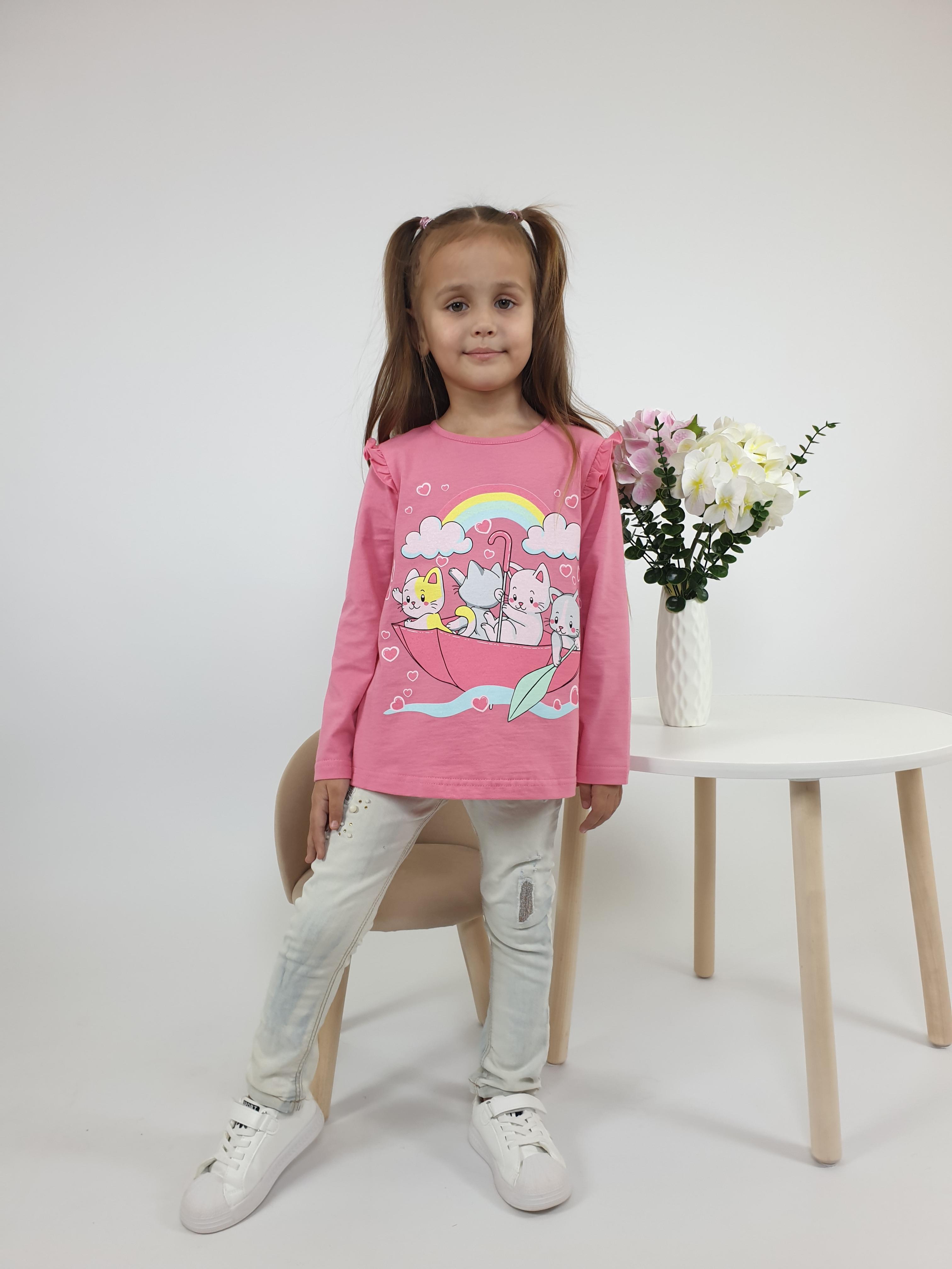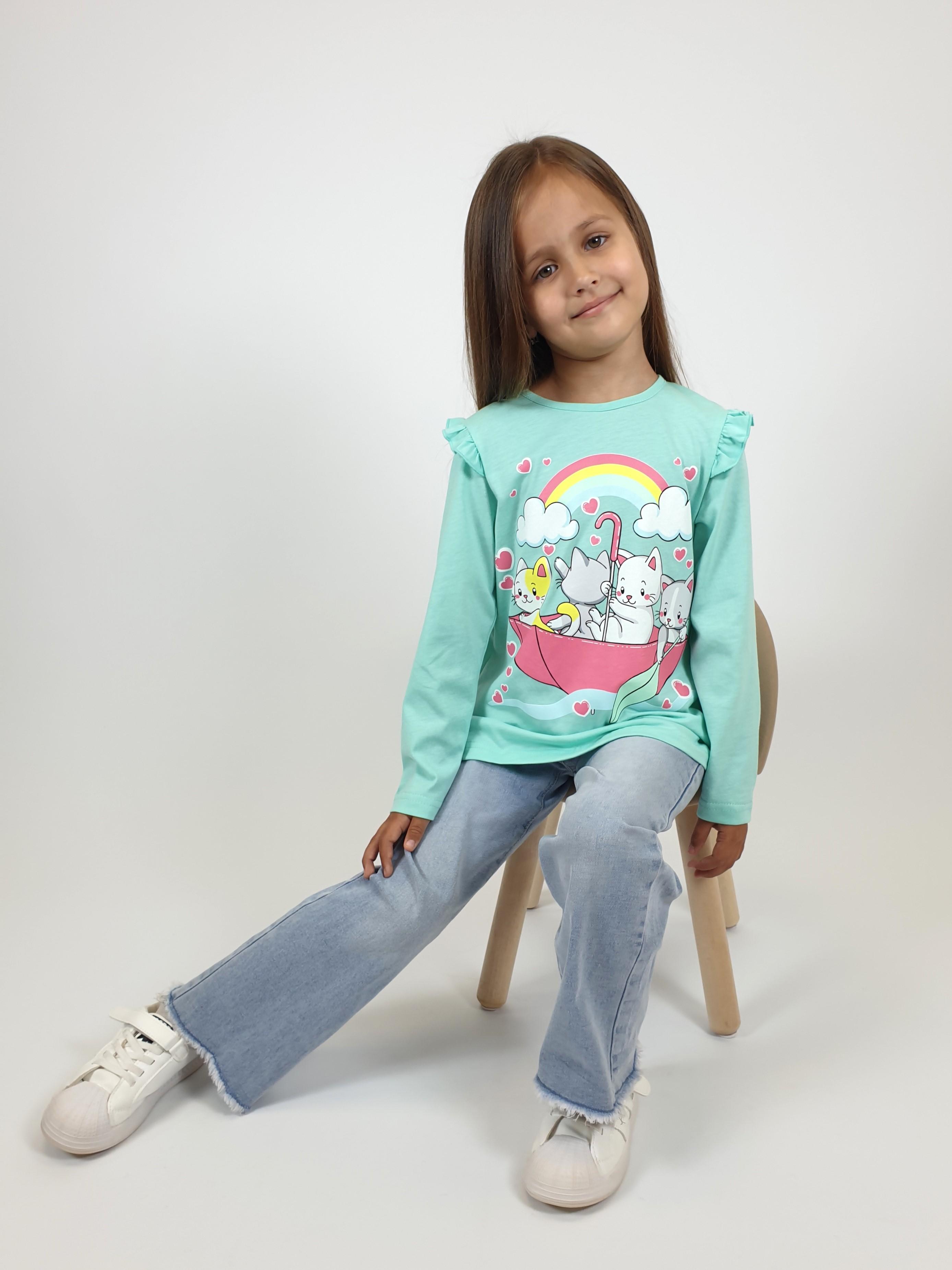 Кулирное полотно:100% х/б. Фуфайка-силуэт трапеция,длинный втачной рукав,в пройме рюша.Горловина окантована,застежка на пуговицу по спинке.Печать на переде.