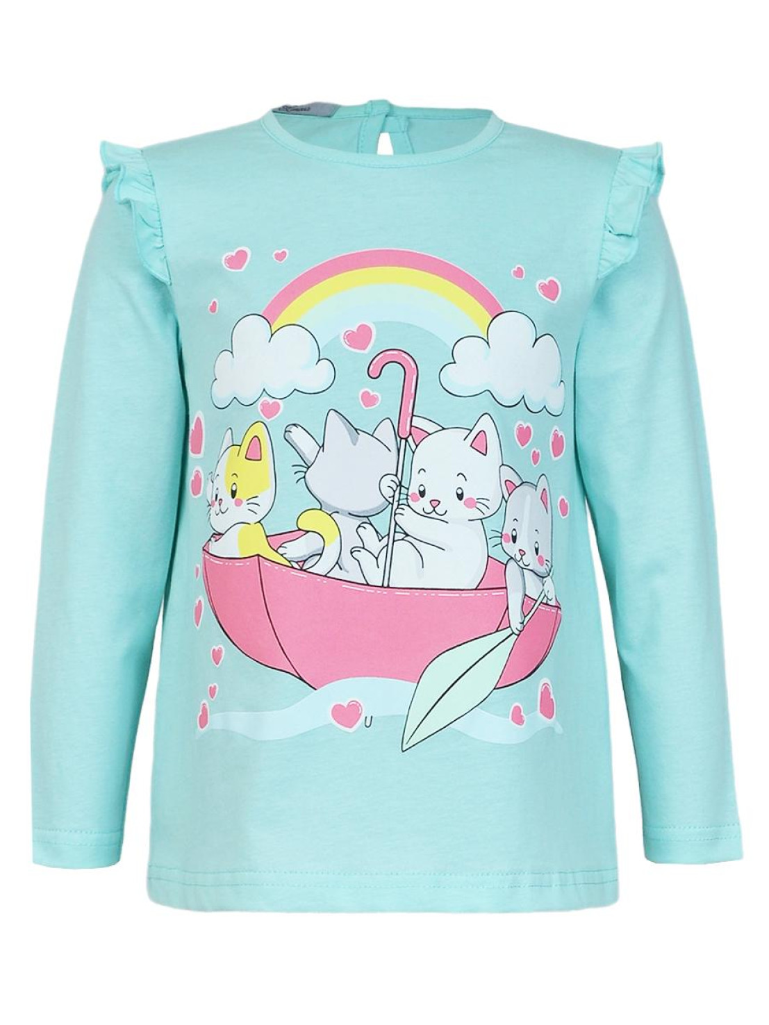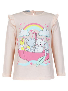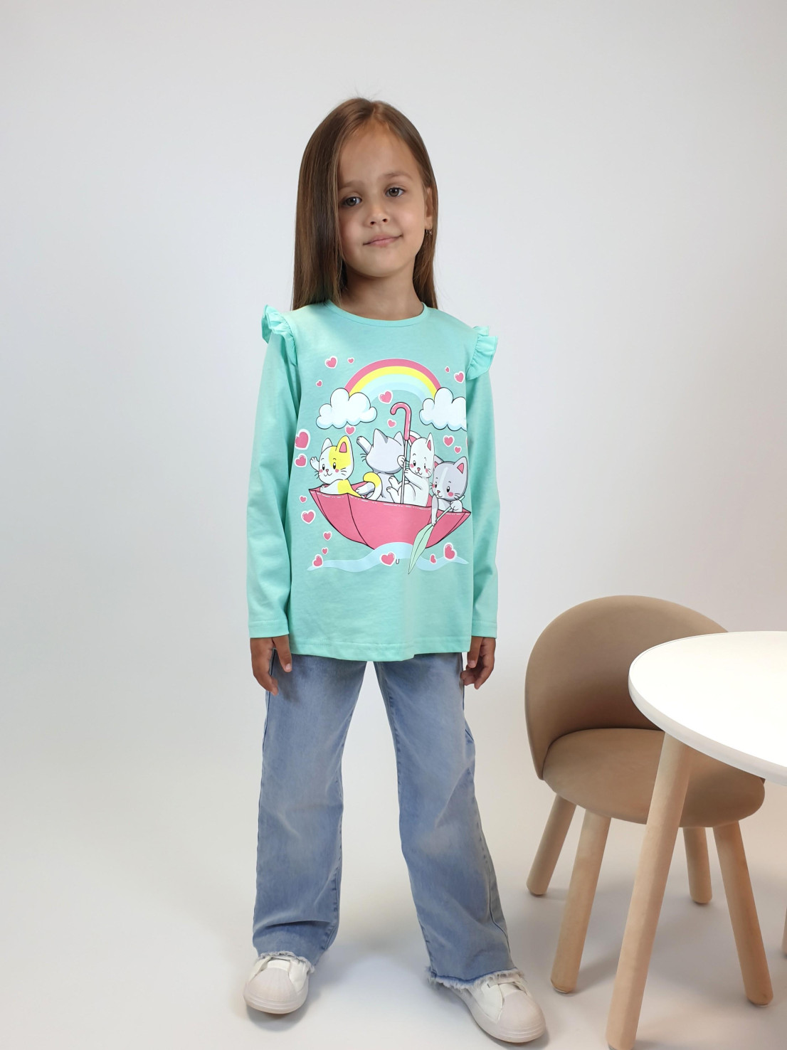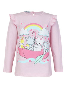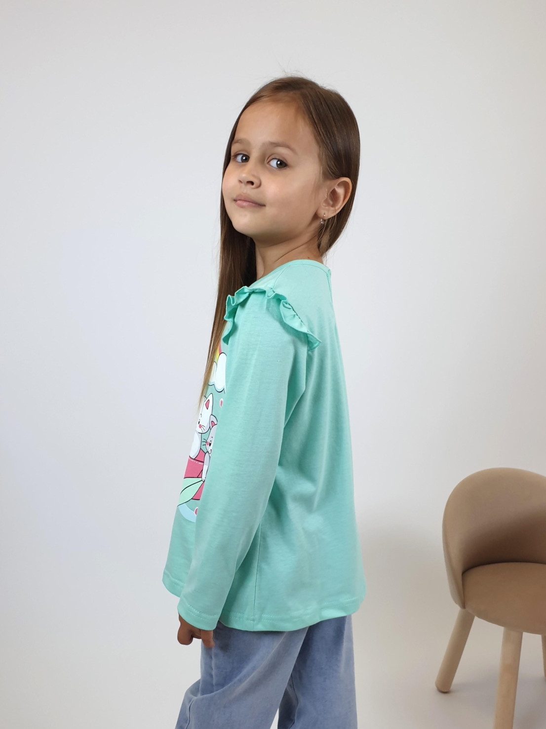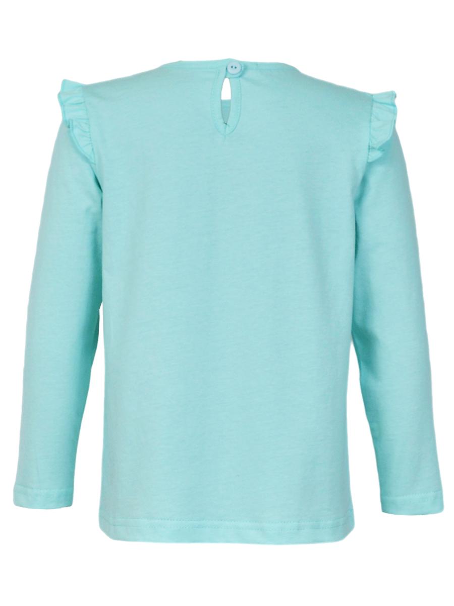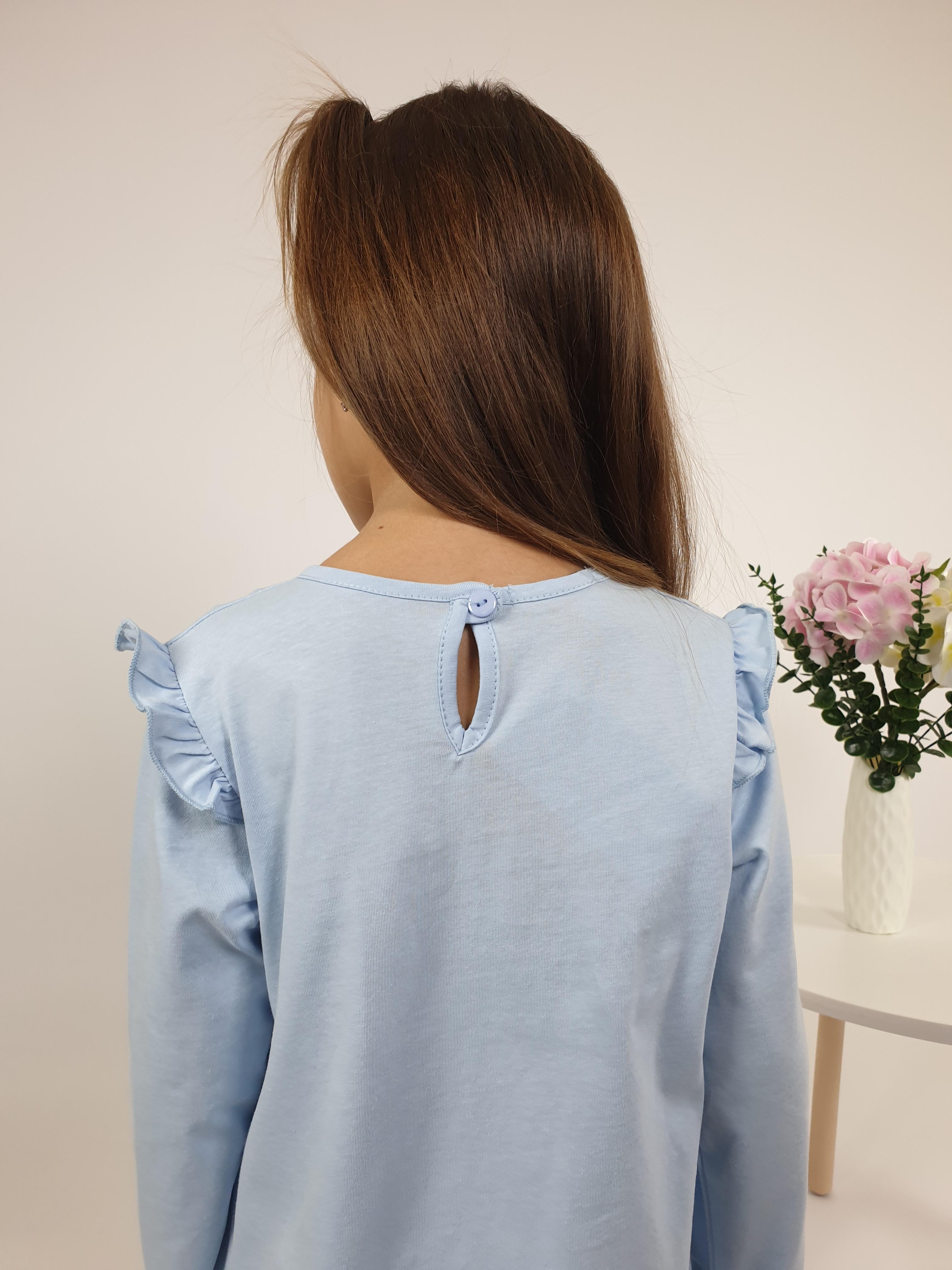 Кулирное полотно:100% х/б. Фуфайка-силуэт трапеция,длинный втачной рукав,в пройме рюша.Горловина окантована,застежка на пуговицу по спинке.Печать на переде.