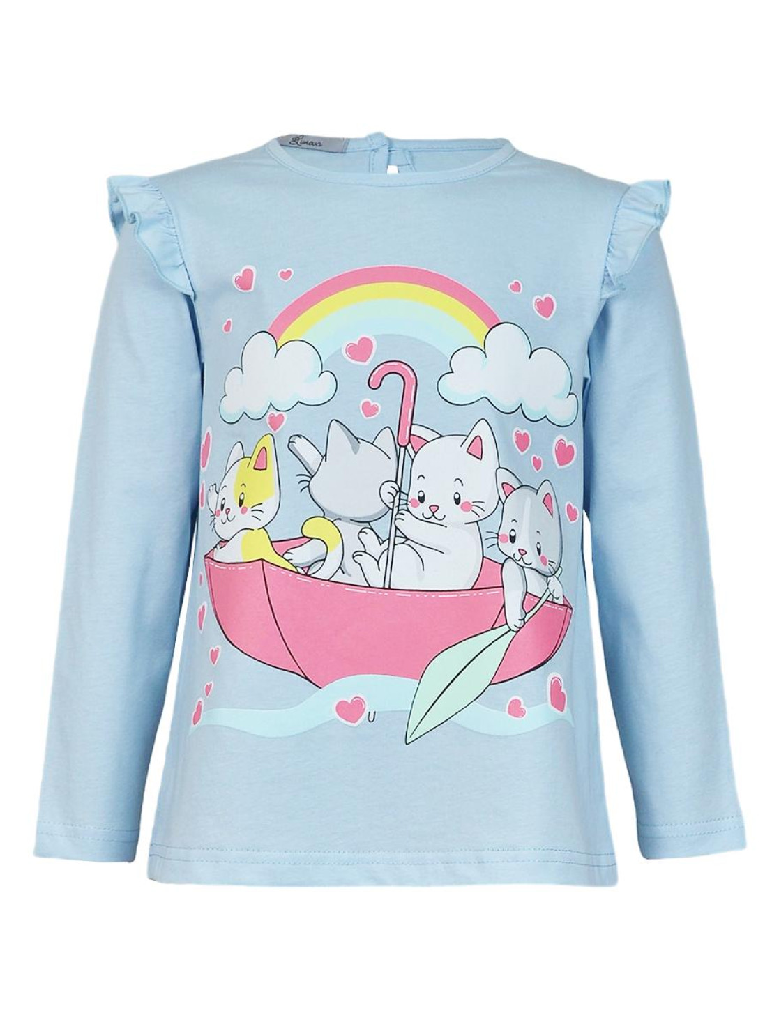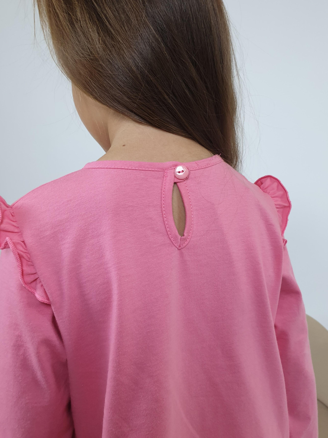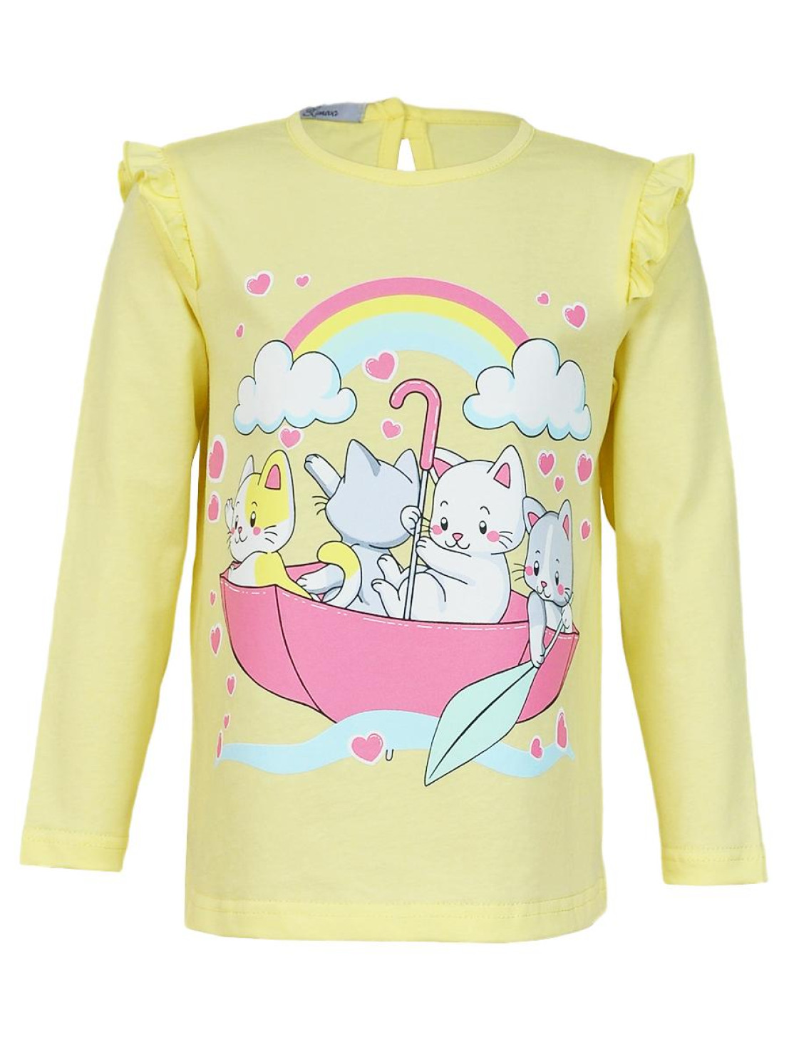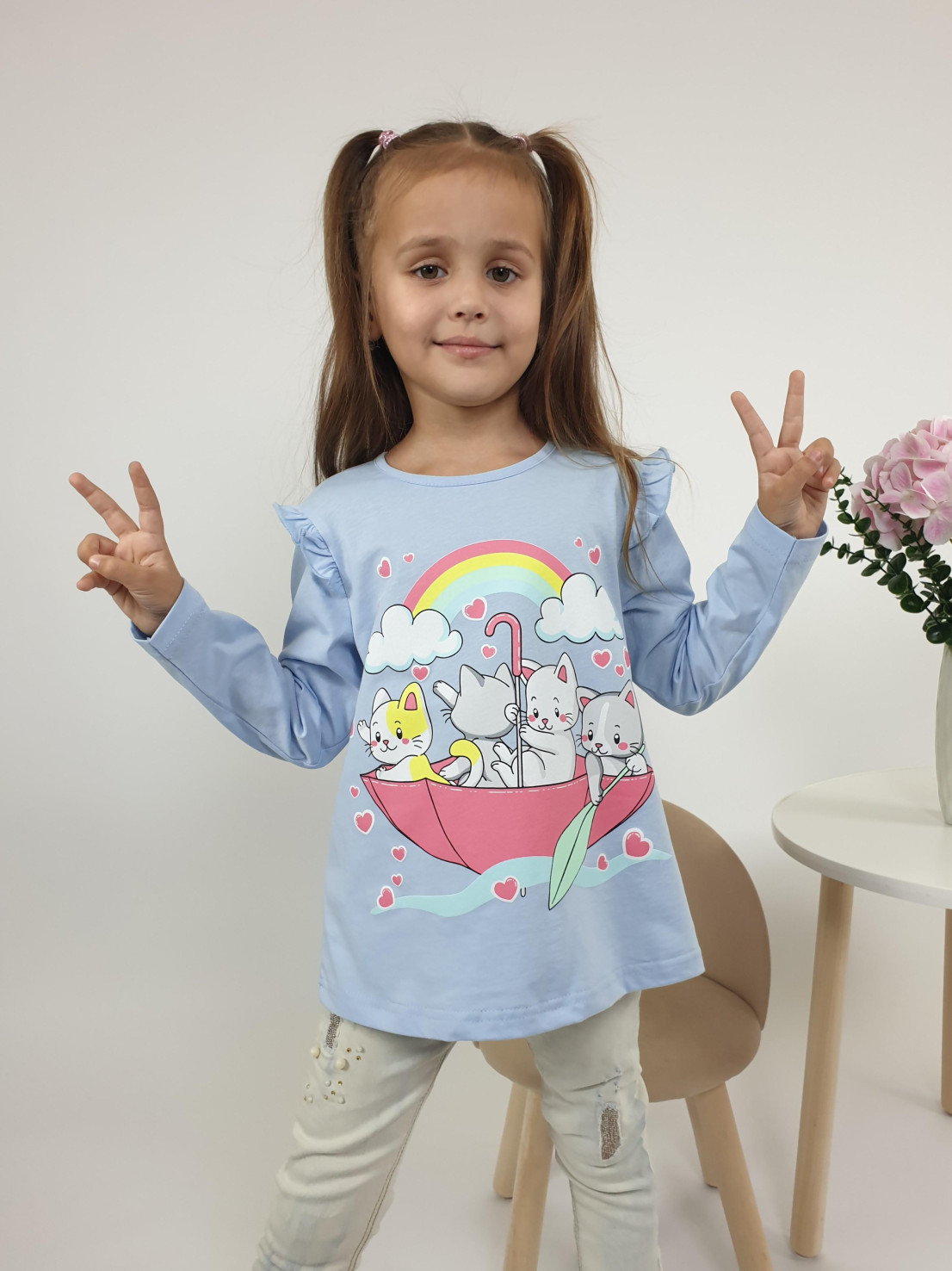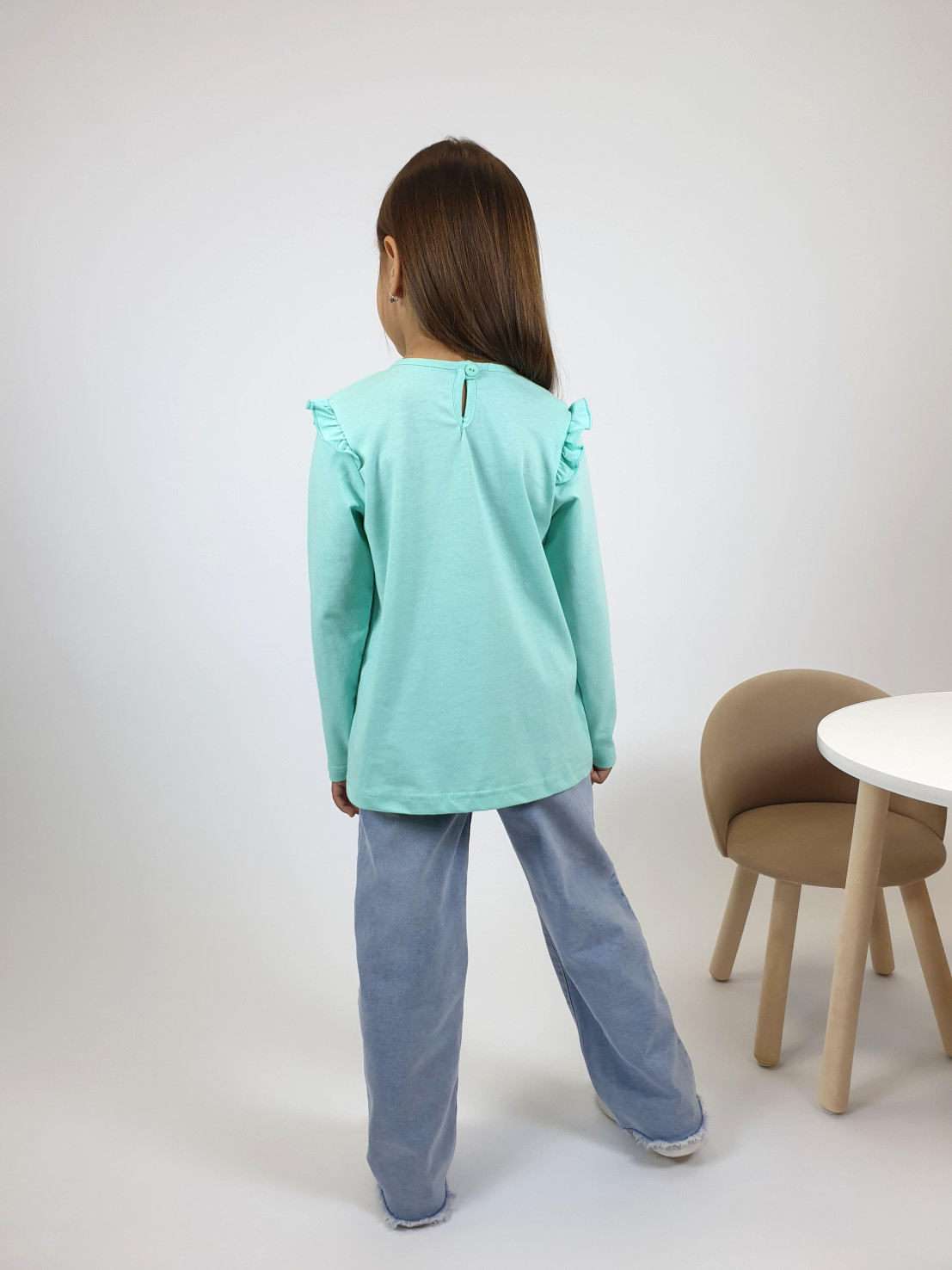 Кулирное полотно:100% х/б. Фуфайка-силуэт трапеция,длинный втачной рукав,в пройме рюша.Горловина окантована,застежка на пуговицу по спинке.Печать на переде.