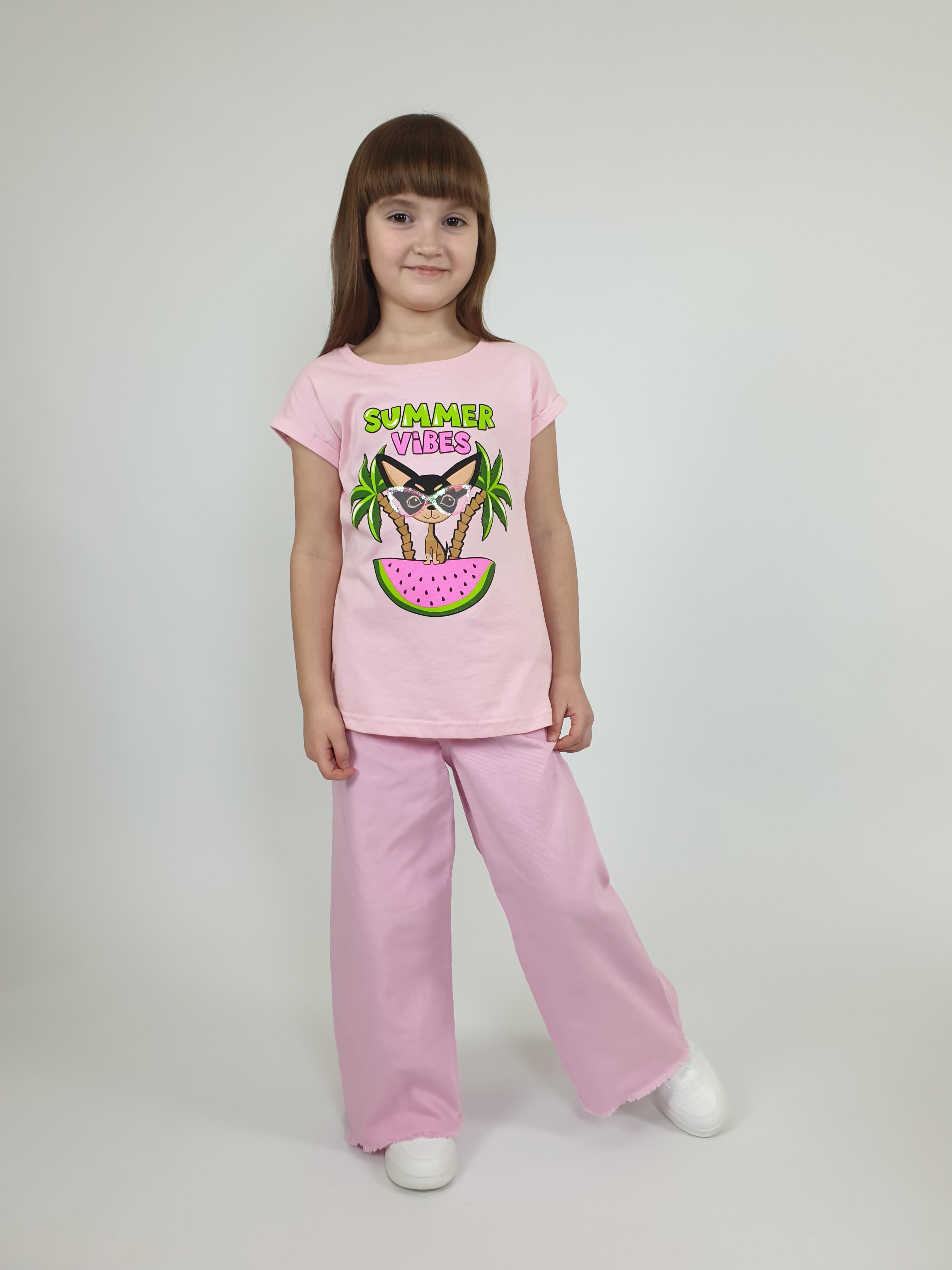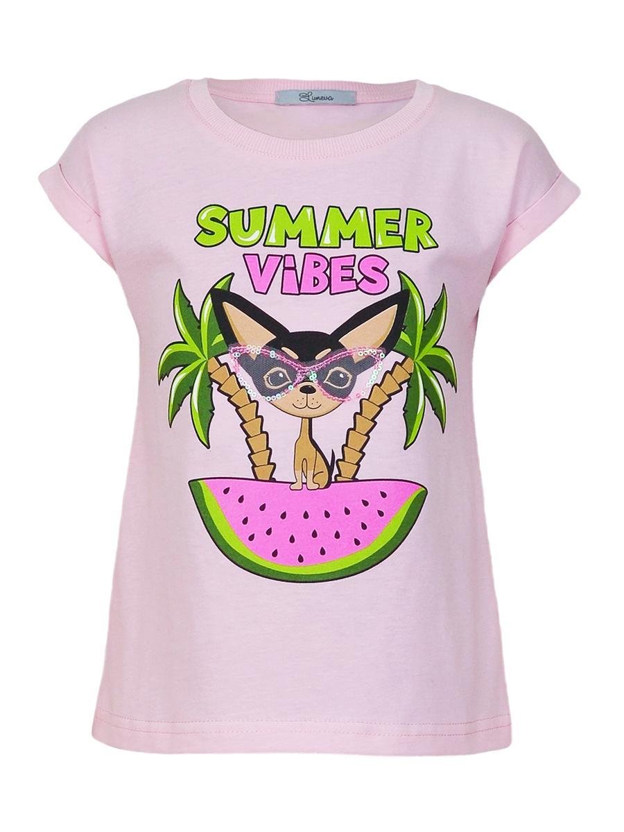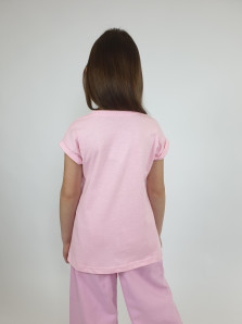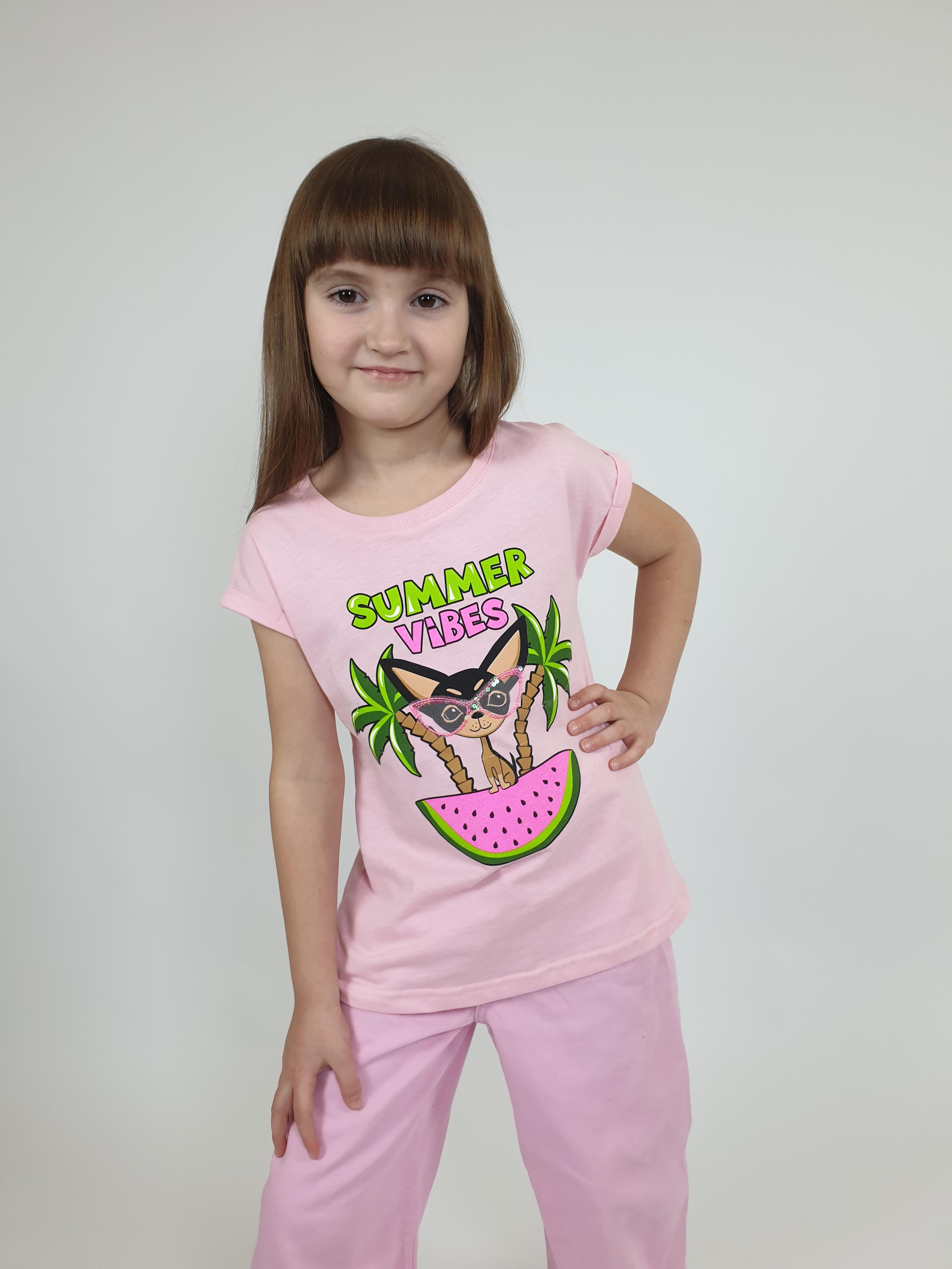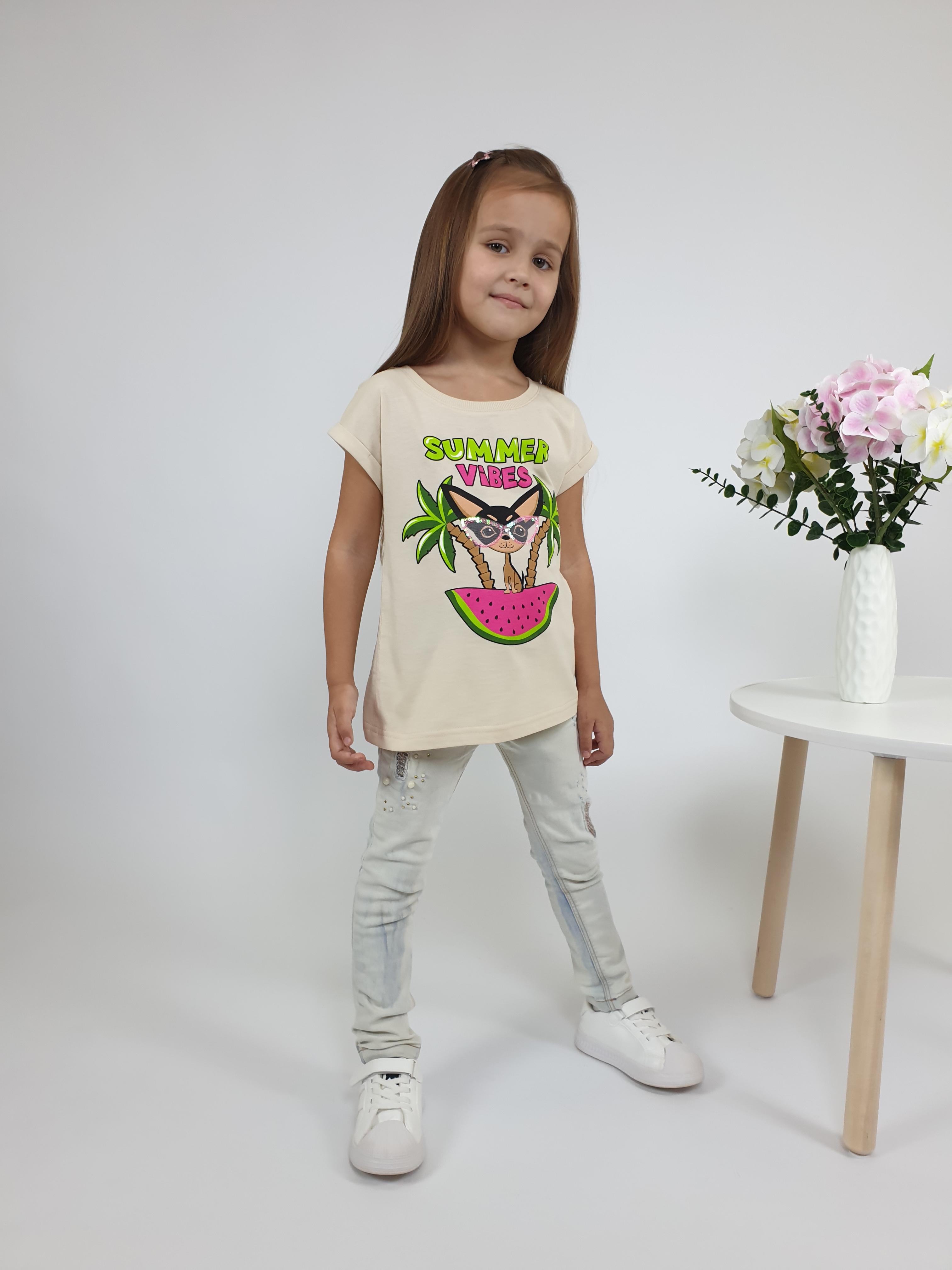 Кулирное полотно:100% х/б. Фуфайка-полуприлегающего силуэта с цельнокроенным рукавом с отворотом.Перед с печатью и вышивкой(пайетки и сетка).Горловина обработана ластиком.