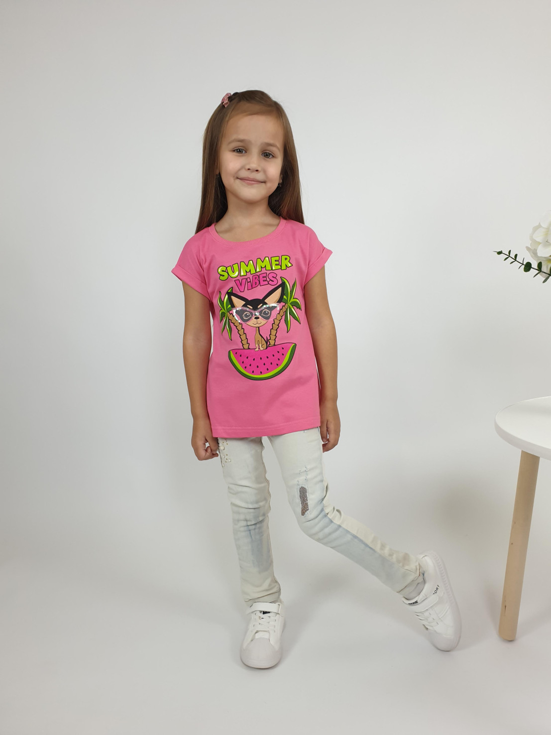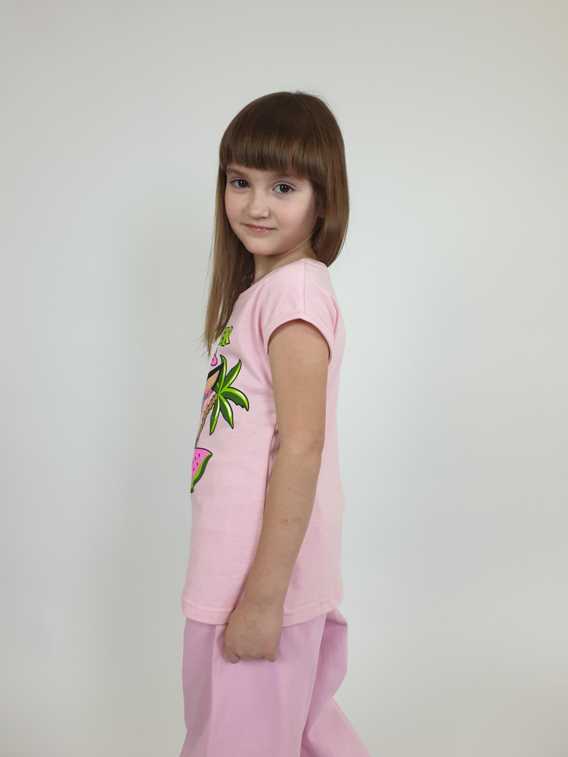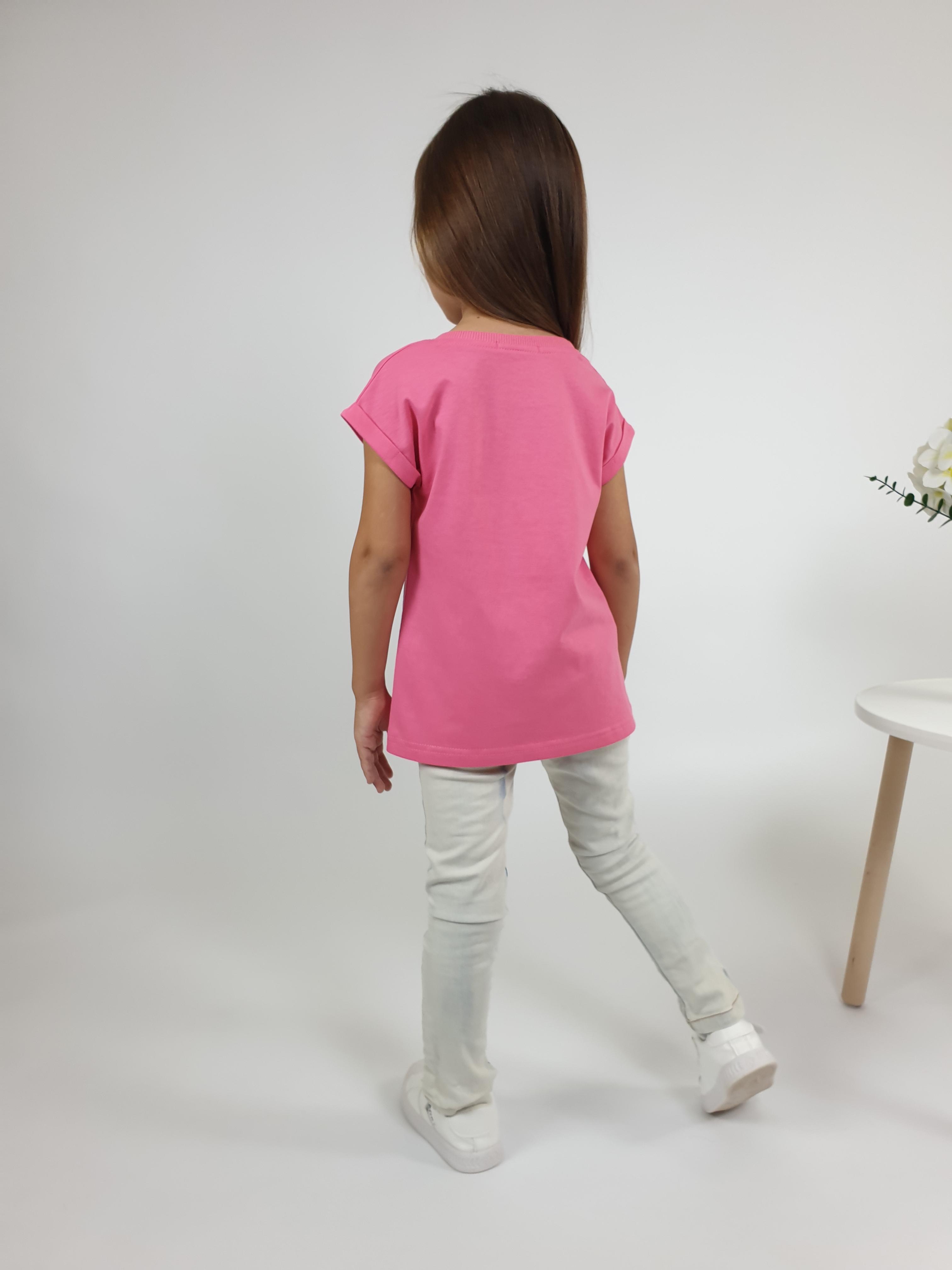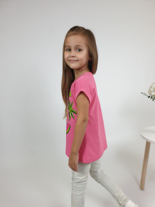 Кулирное полотно:100% х/б. Фуфайка-полуприлегающего силуэта с цельнокроенным рукавом с отворотом.Перед с печатью и вышивкой(пайетки и сетка).Горловина обработана ластиком.