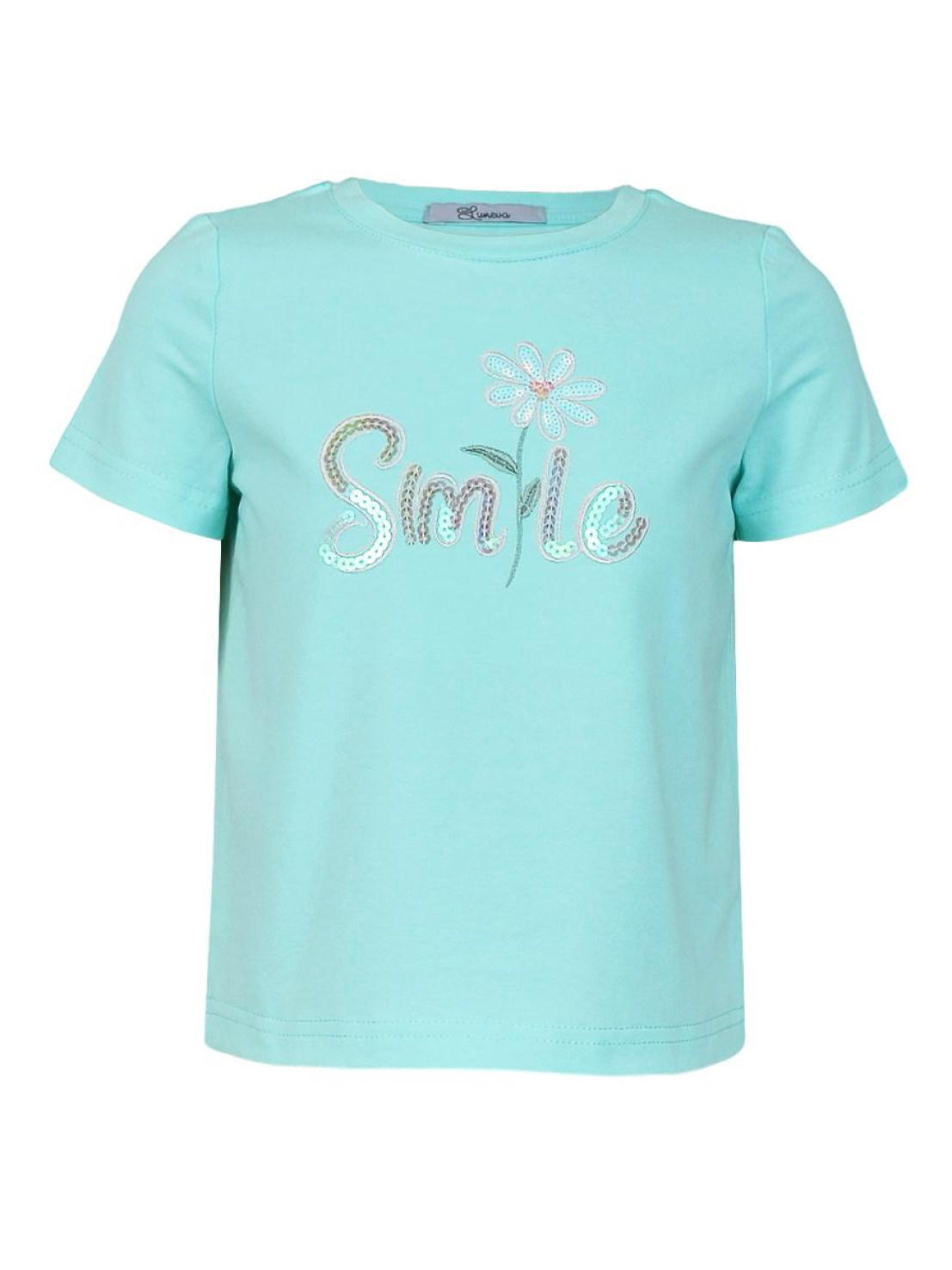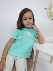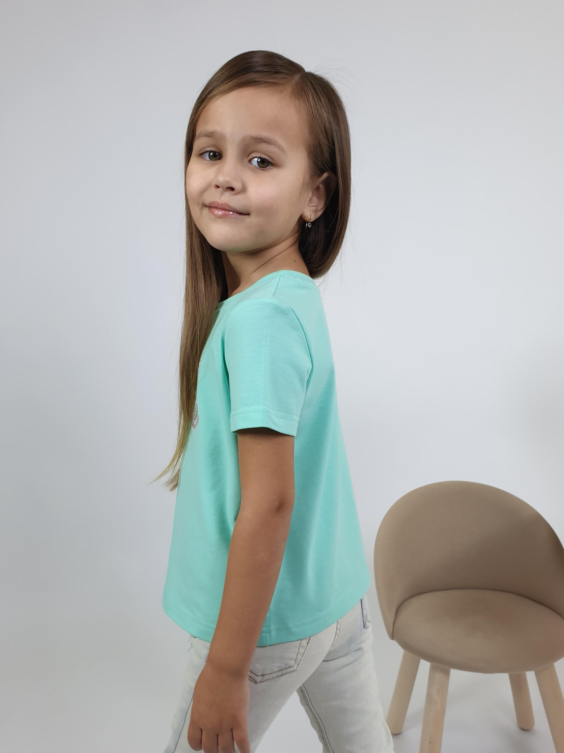 Кулирное полотно:95% х/б,5% лайкра. Фуфайка-прямой силуэт,печать и вышивка(пайетки) на переде,короткий втачной рукав.Низ рукава и фуфайки подшит.Горловина обработана ластиком.