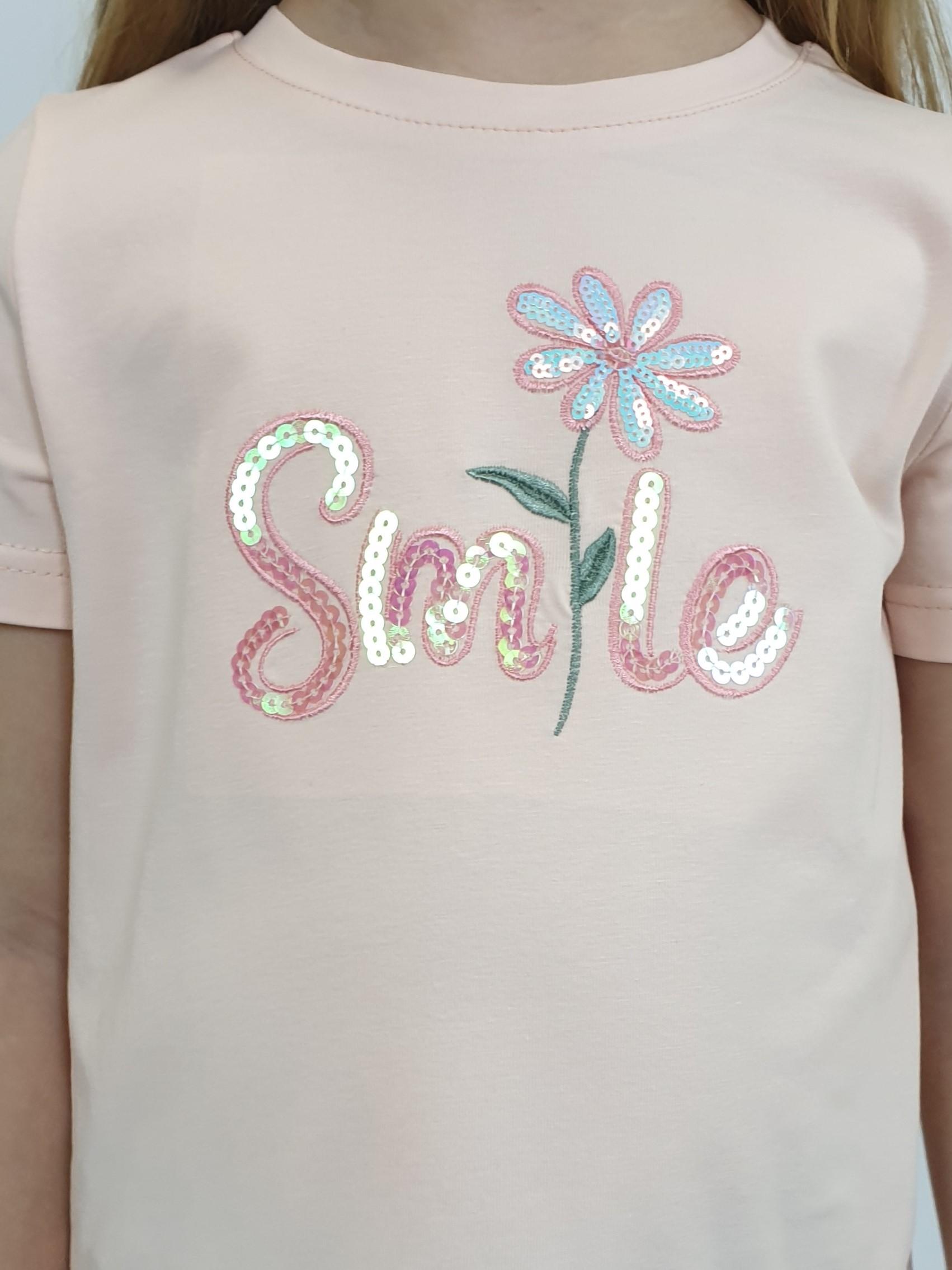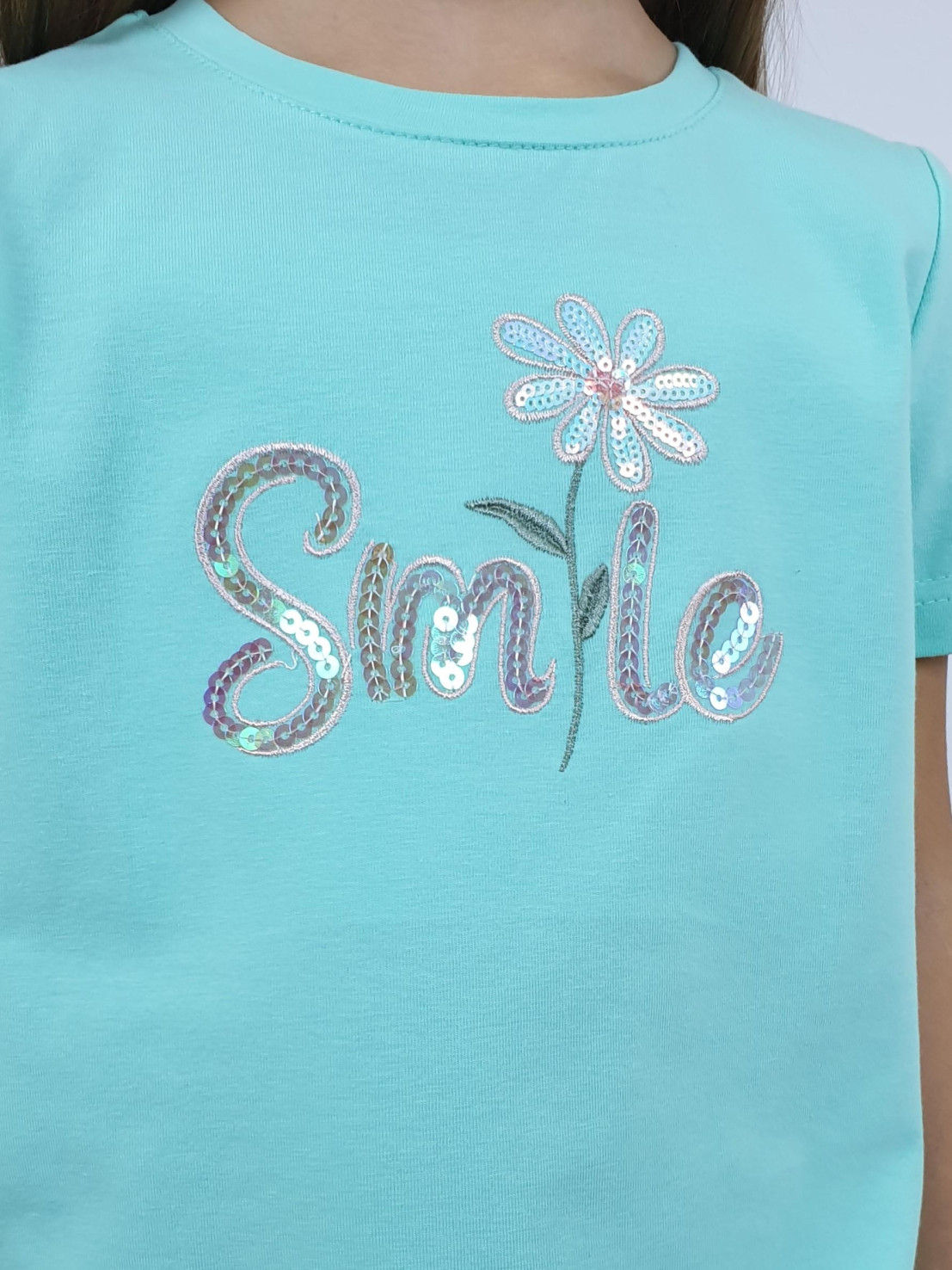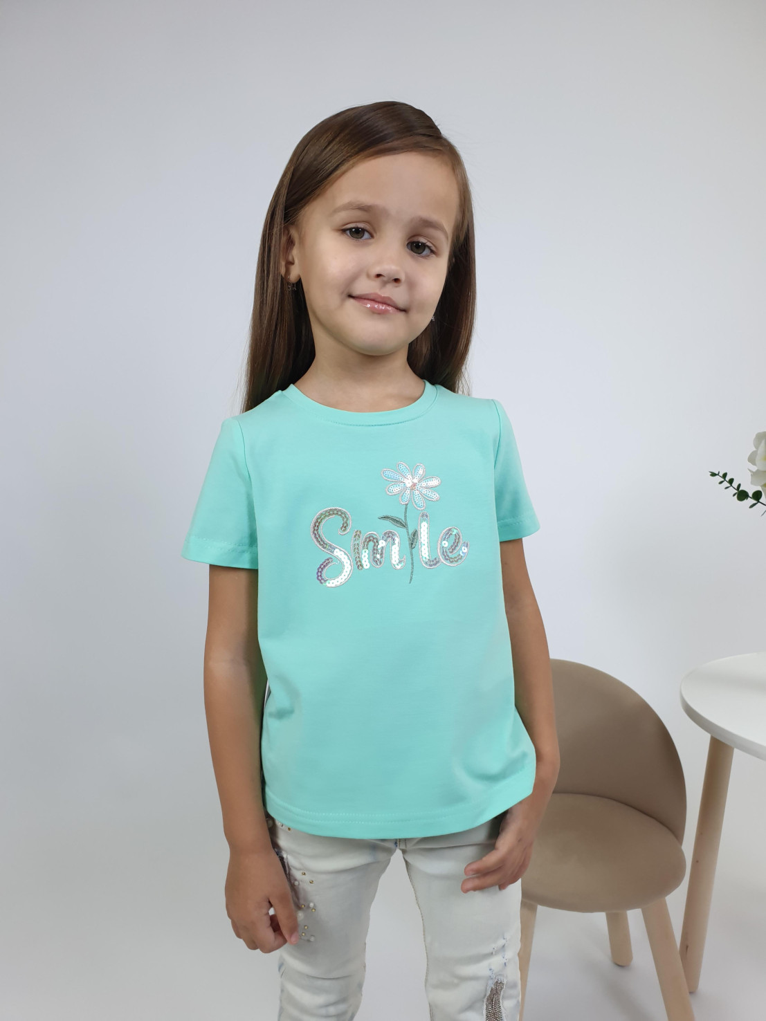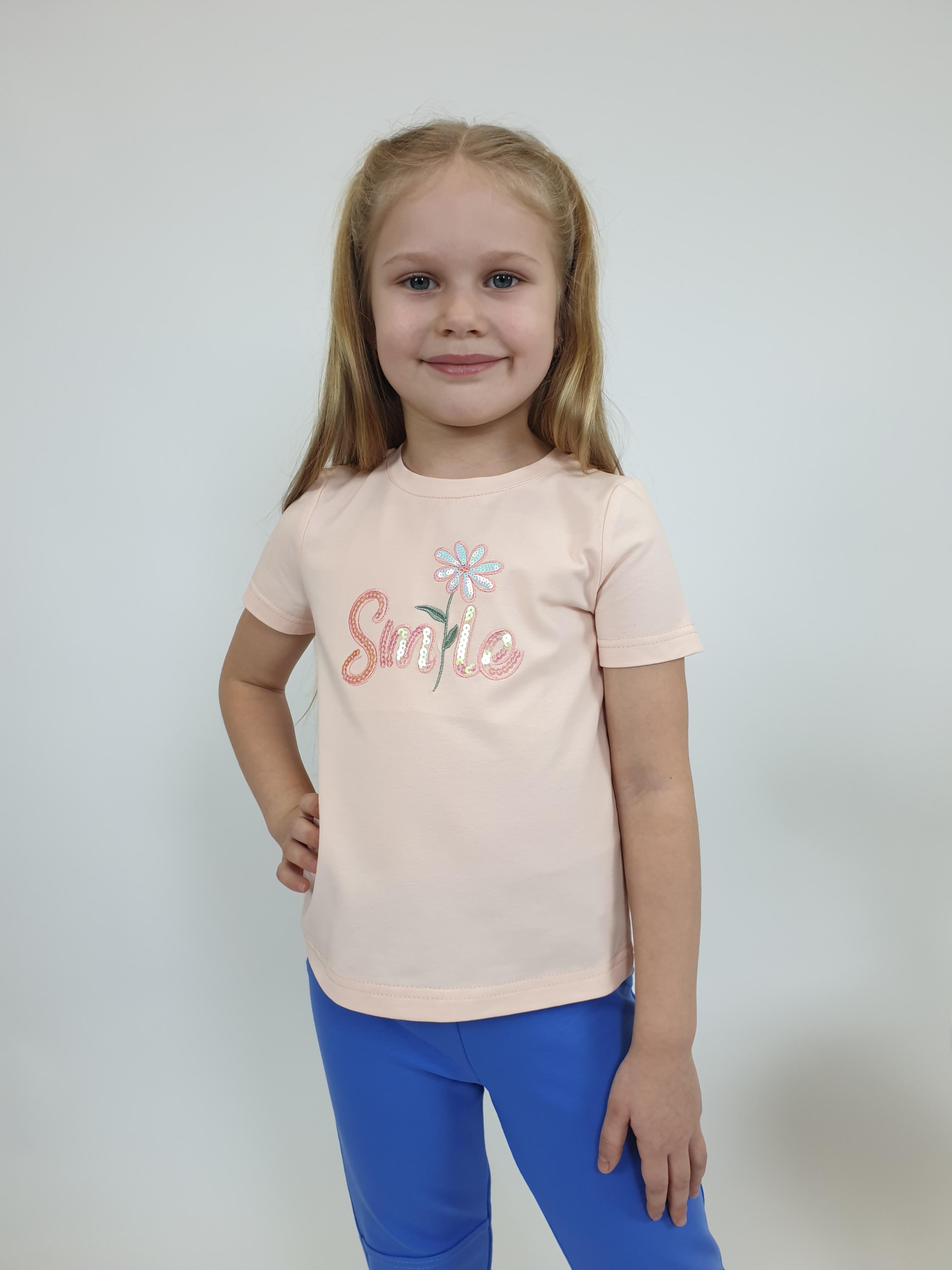 Кулирное полотно:95% х/б,5% лайкра. Фуфайка-прямой силуэт,печать и вышивка(пайетки) на переде,короткий втачной рукав.Низ рукава и фуфайки подшит.Горловина обработана ластиком.