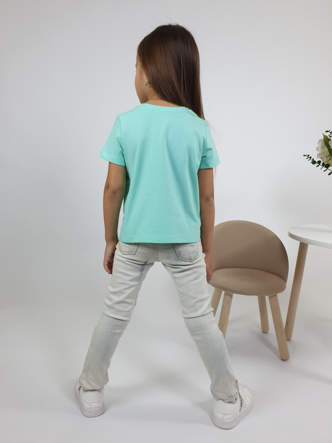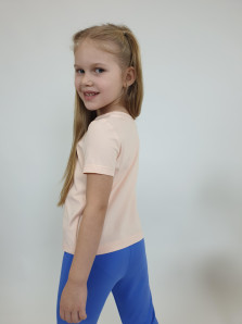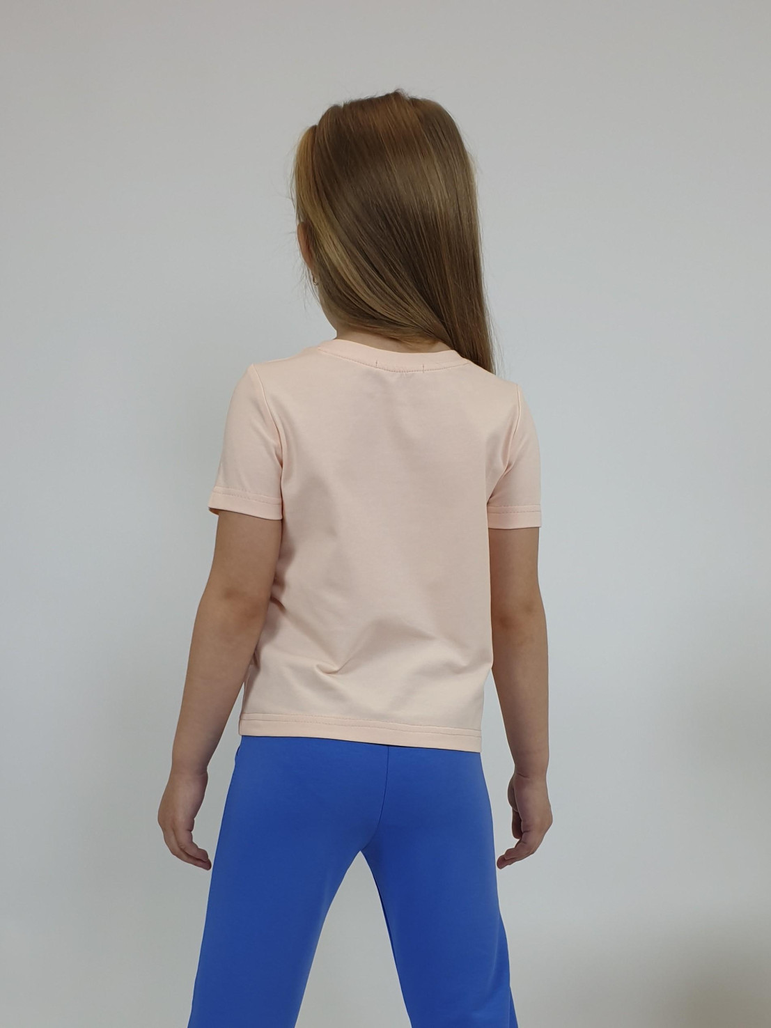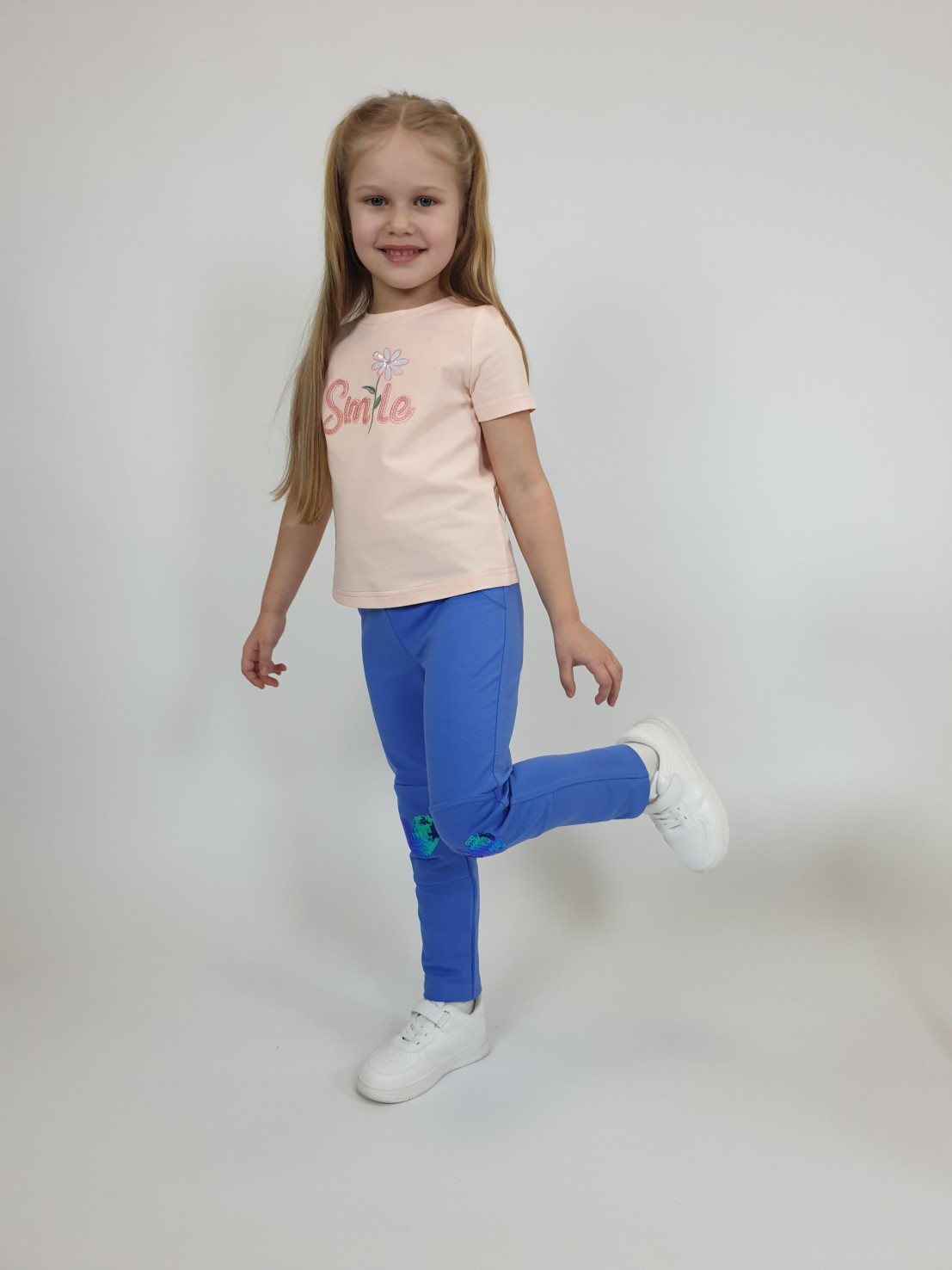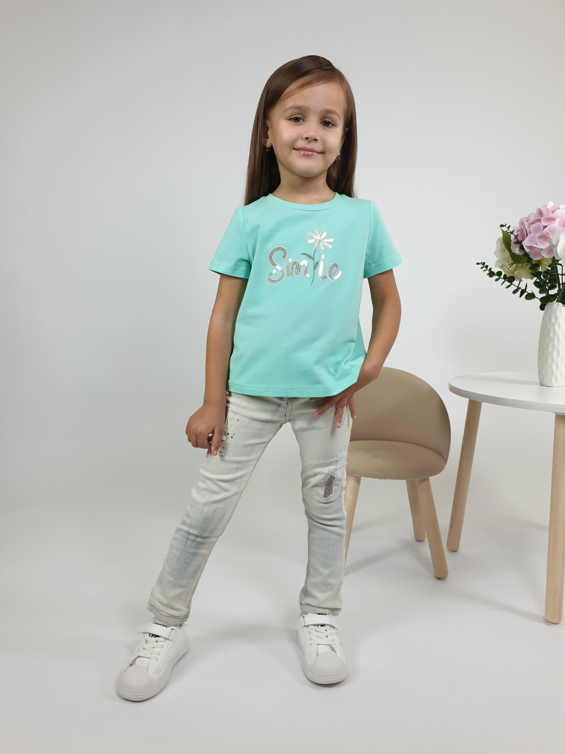 Кулирное полотно:95% х/б,5% лайкра. Фуфайка-прямой силуэт,печать и вышивка(пайетки) на переде,короткий втачной рукав.Низ рукава и фуфайки подшит.Горловина обработана ластиком.