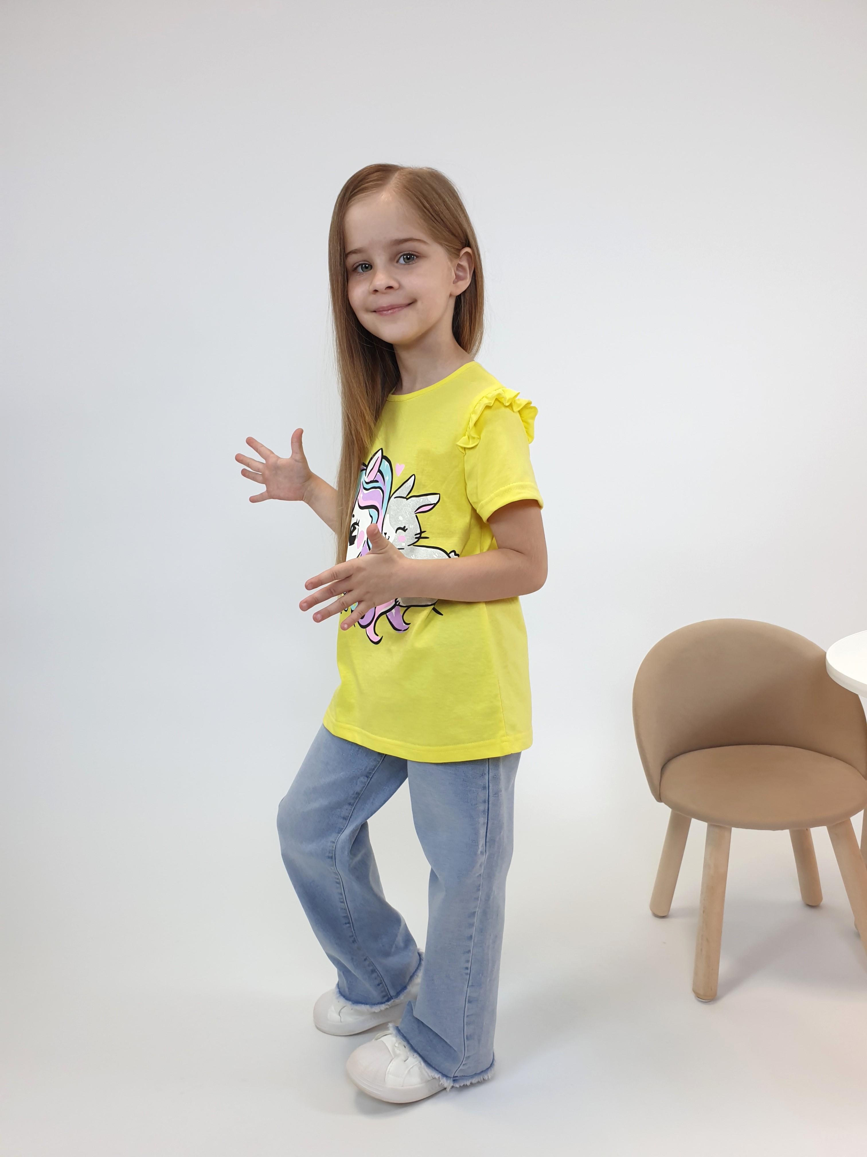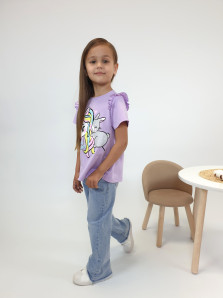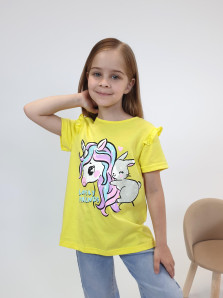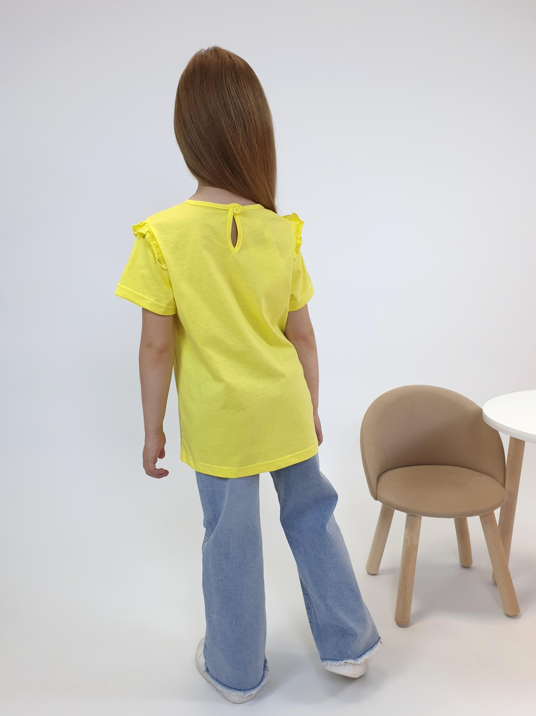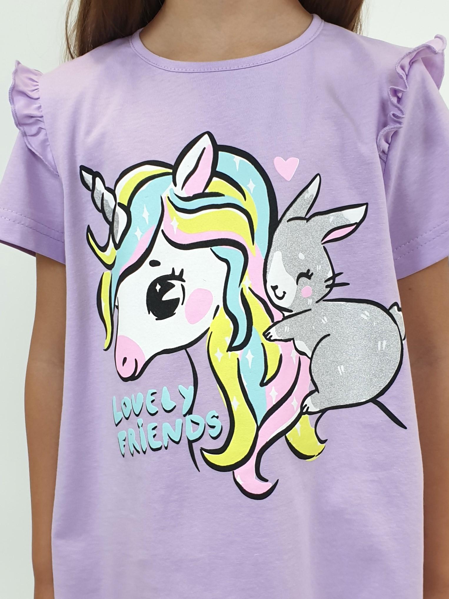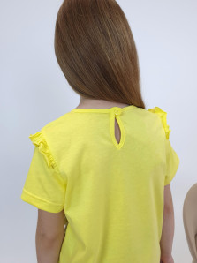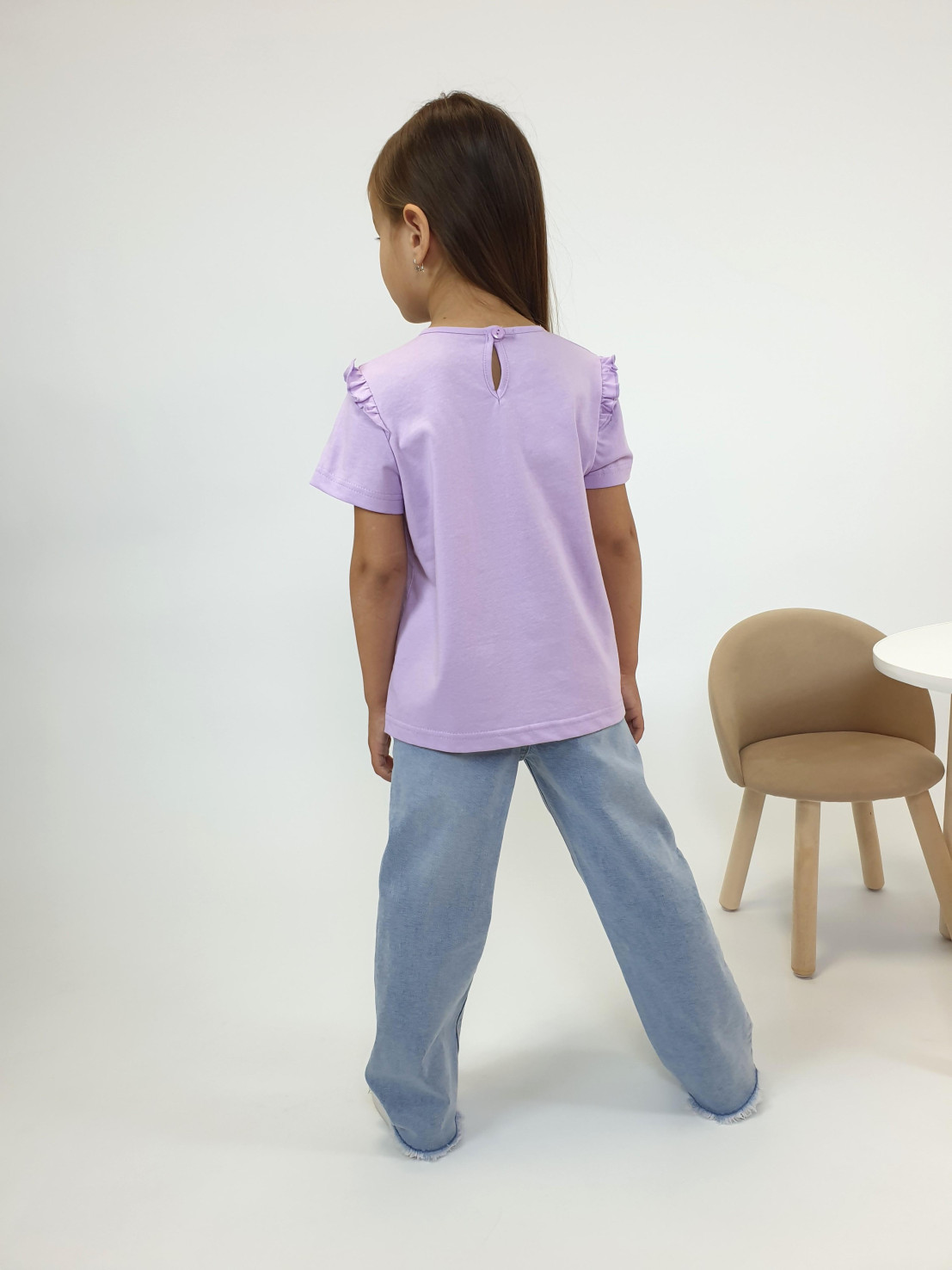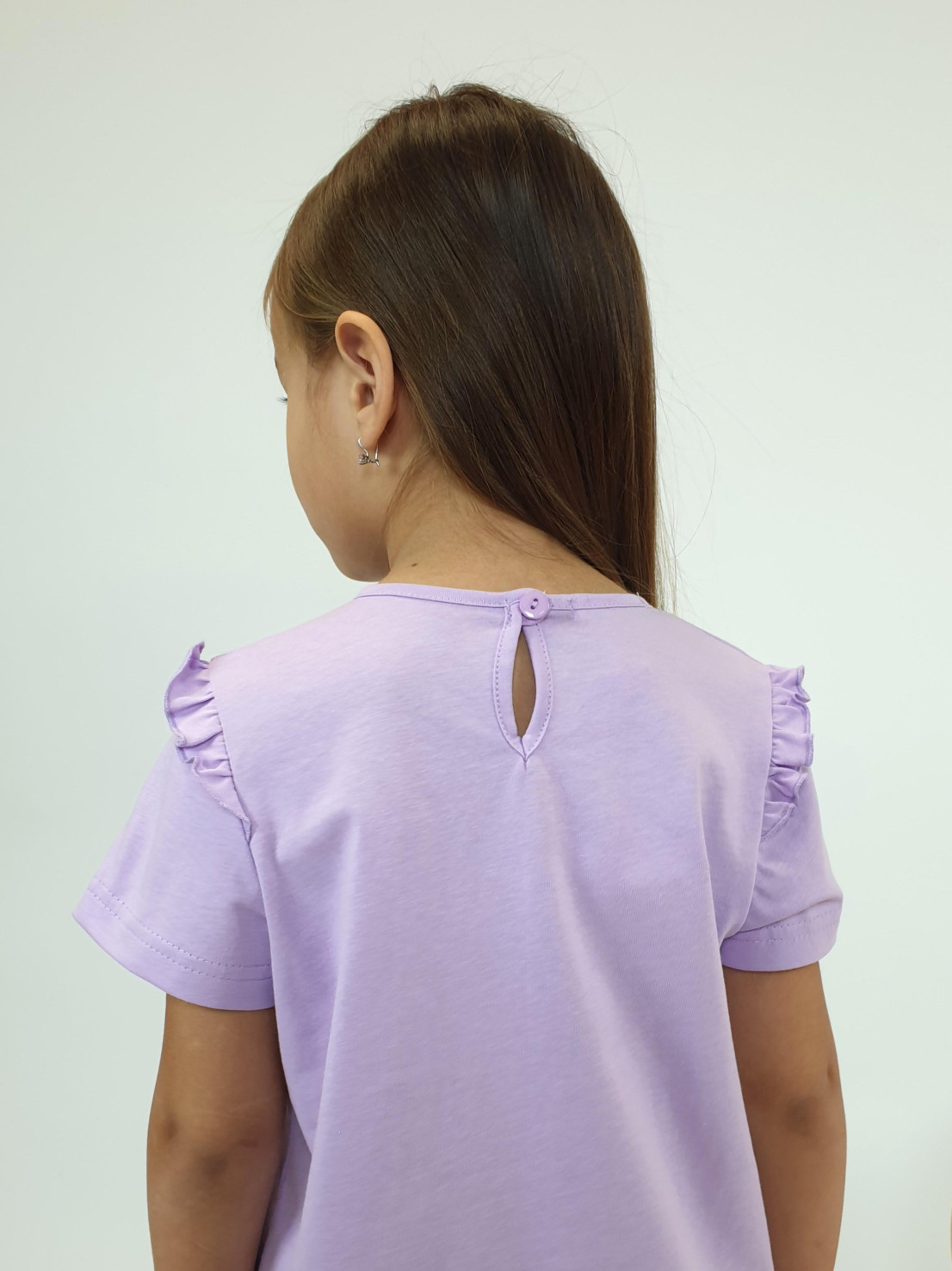 Кулирное полотно:100% х/б. Фуфайка-силуэт трапеция,короткий втачной рукав,в пройме рюша.Горловина окантована,застежка на пуговицу по спинке.Печать на переде.