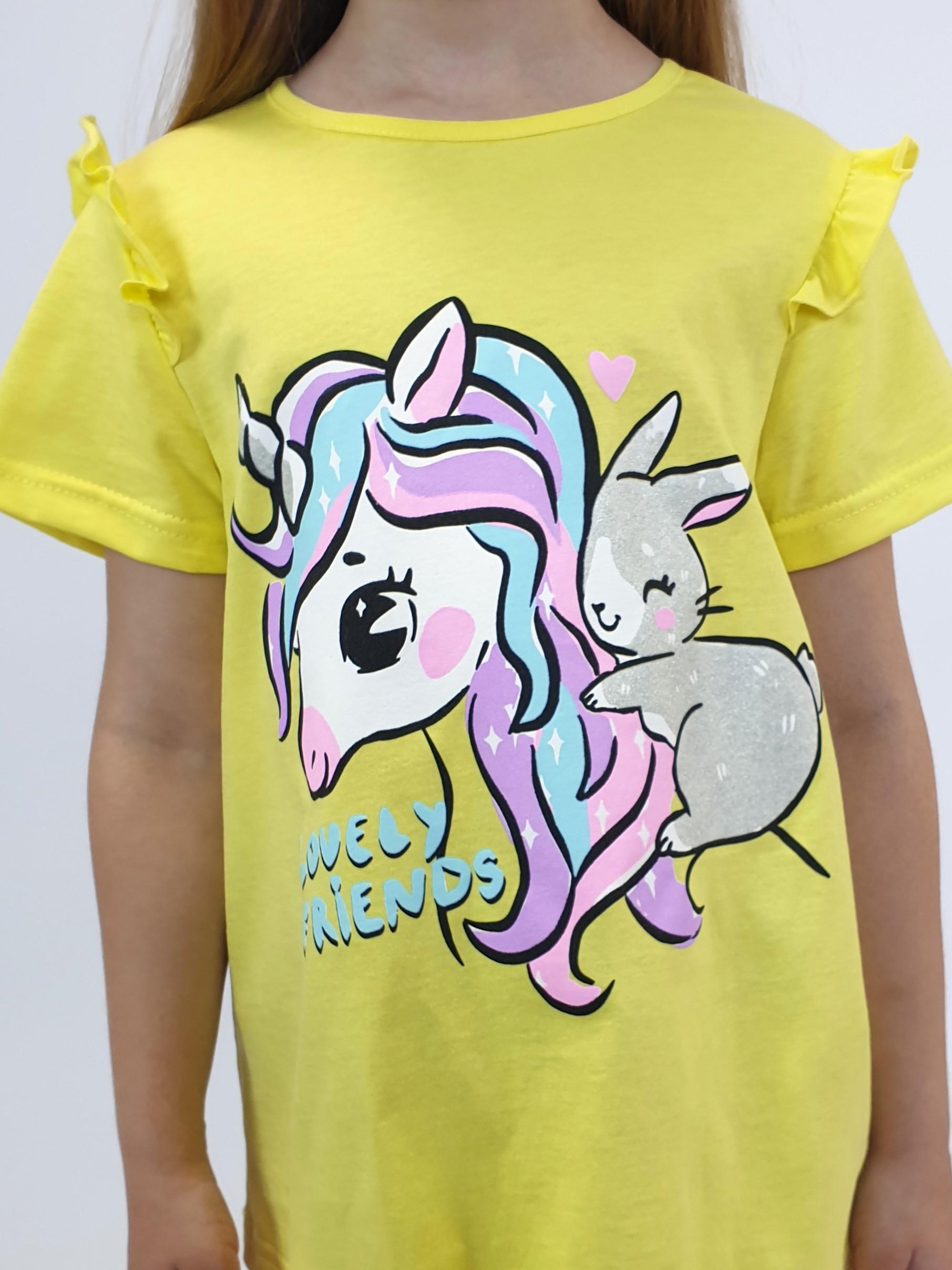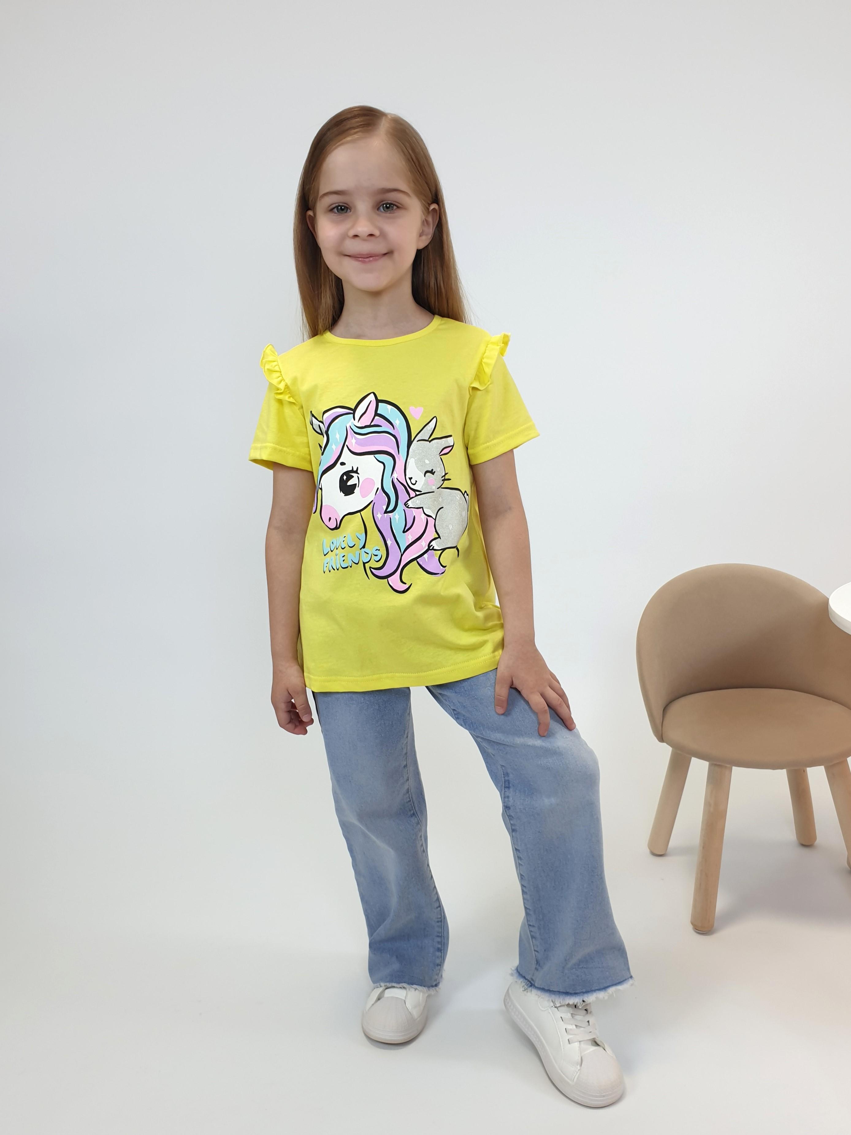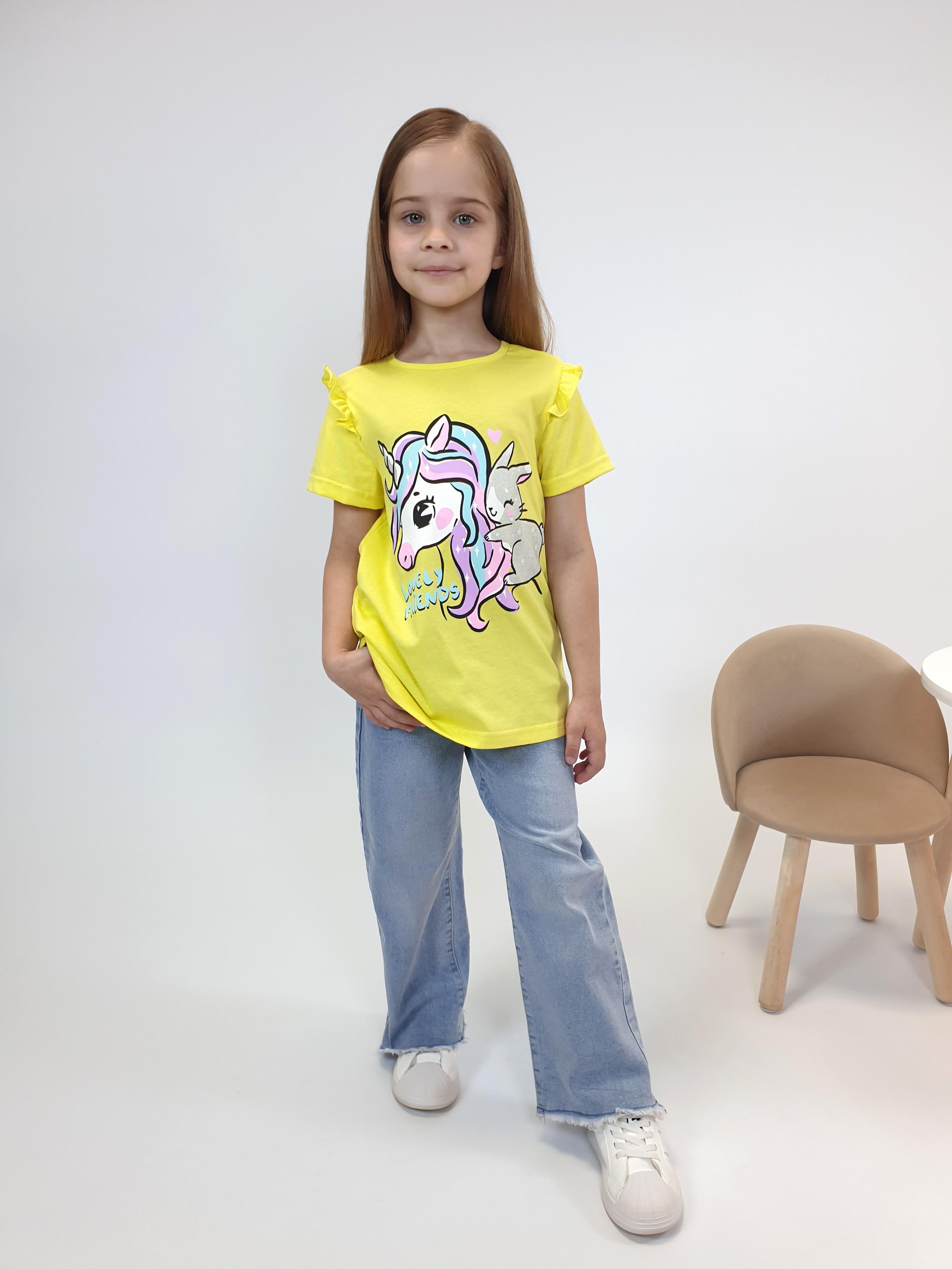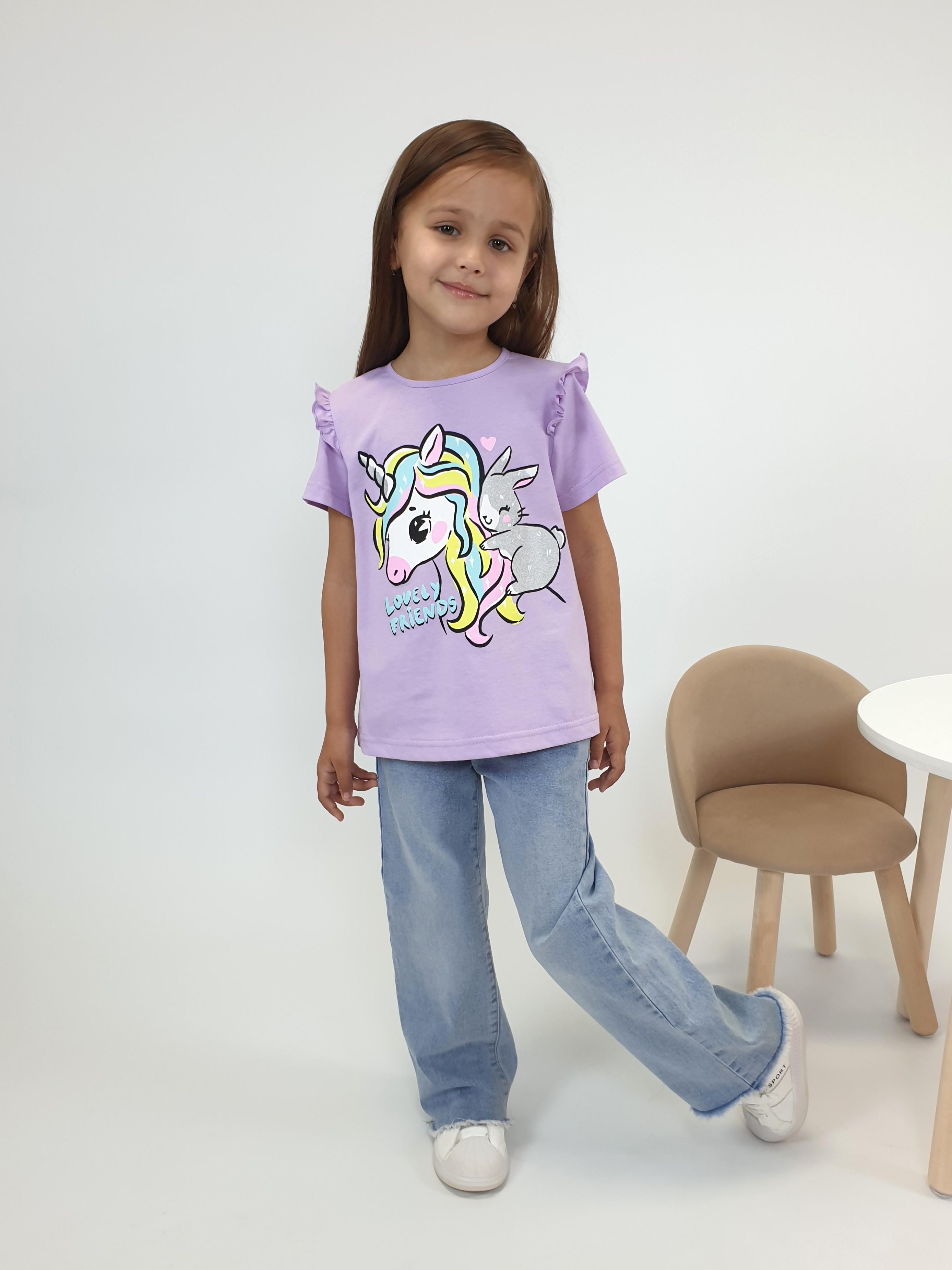 Кулирное полотно:100% х/б. Фуфайка-силуэт трапеция,короткий втачной рукав,в пройме рюша.Горловина окантована,застежка на пуговицу по спинке.Печать на переде.