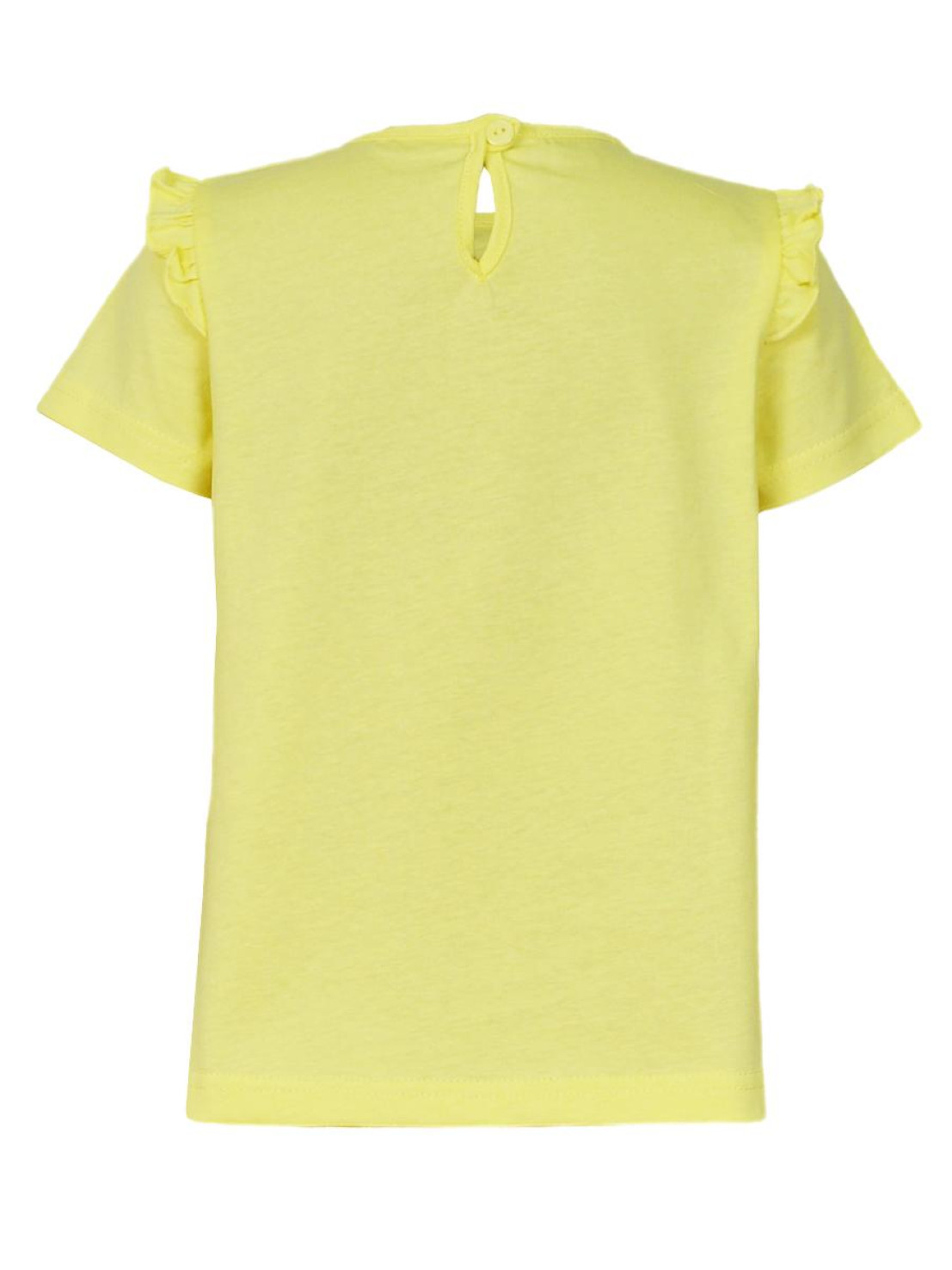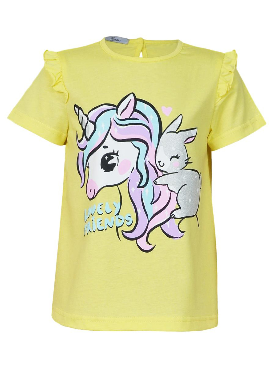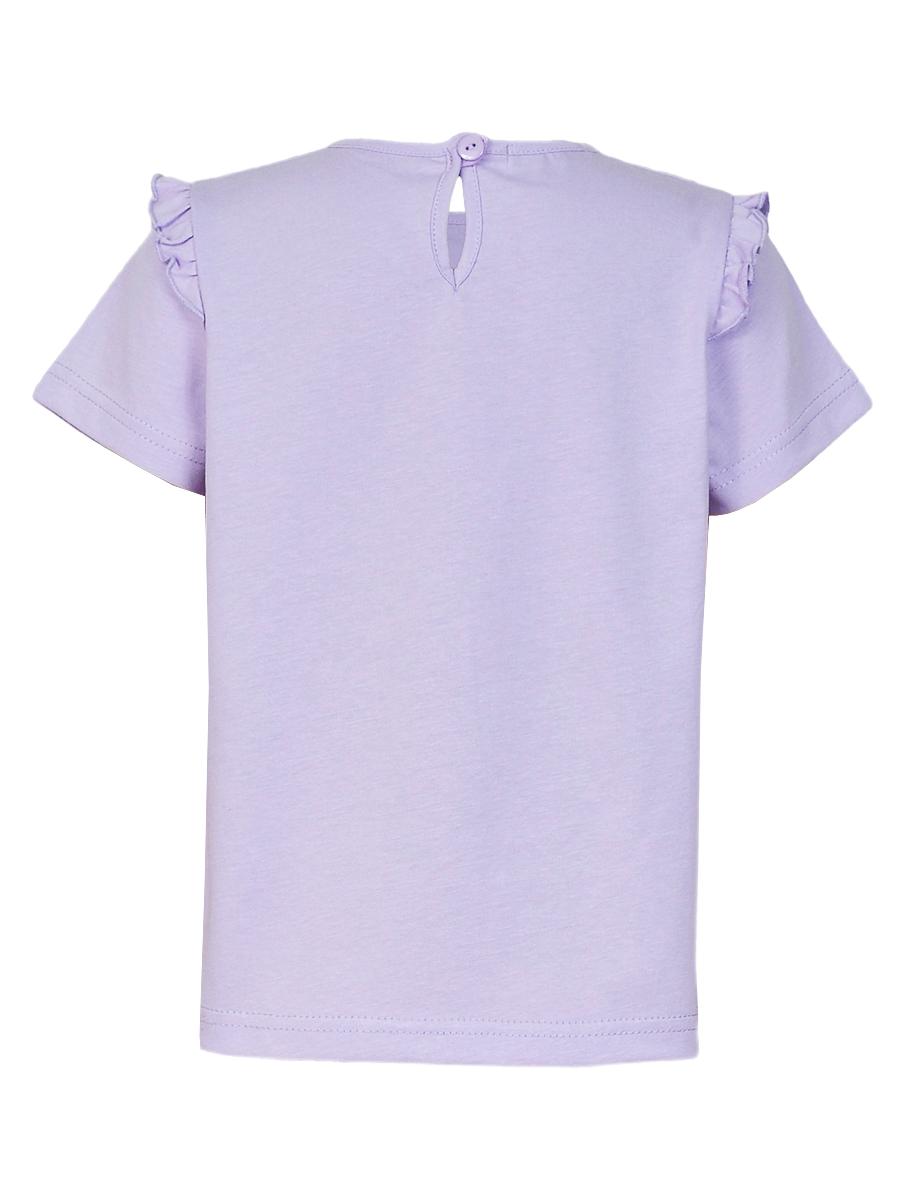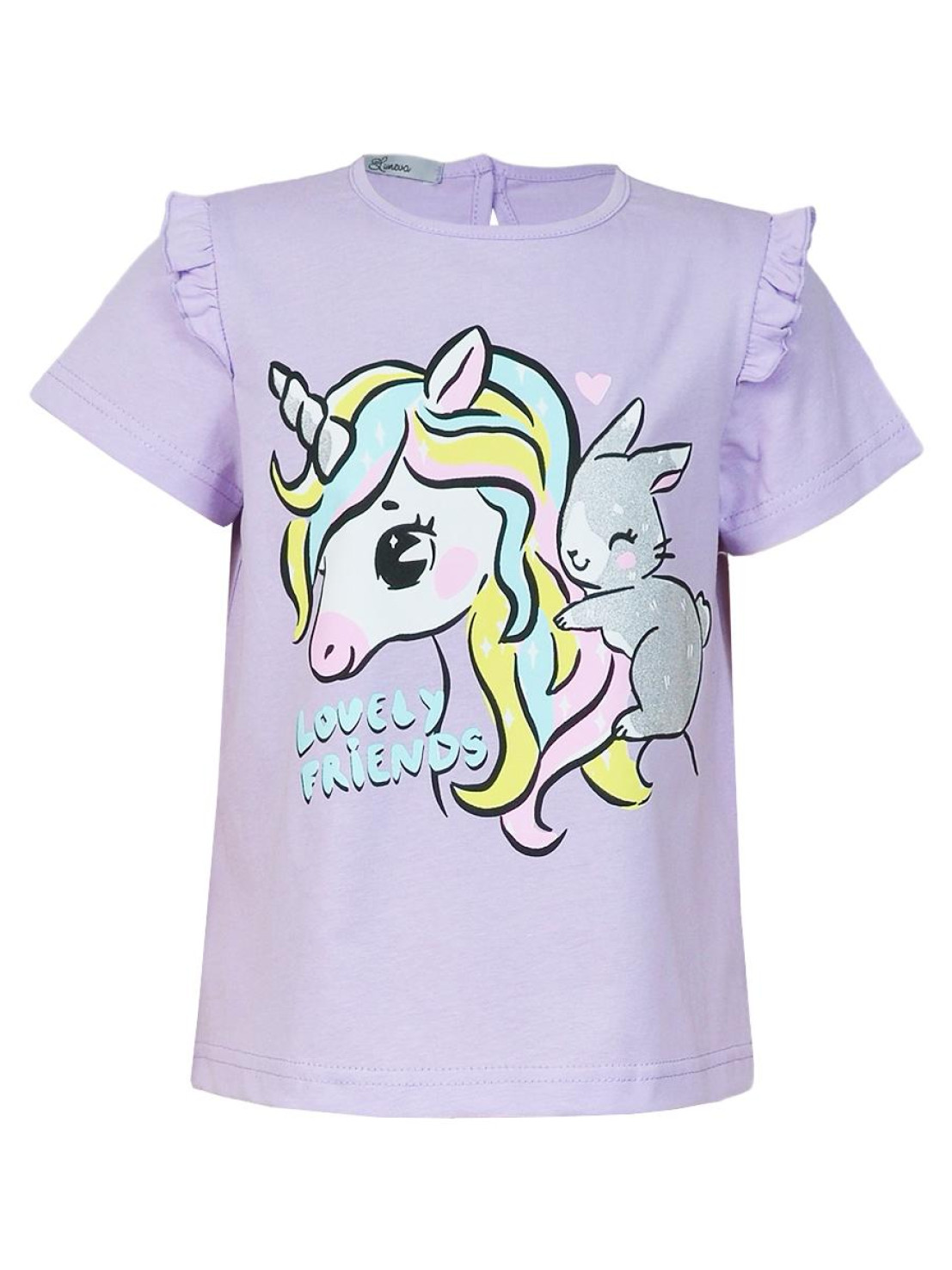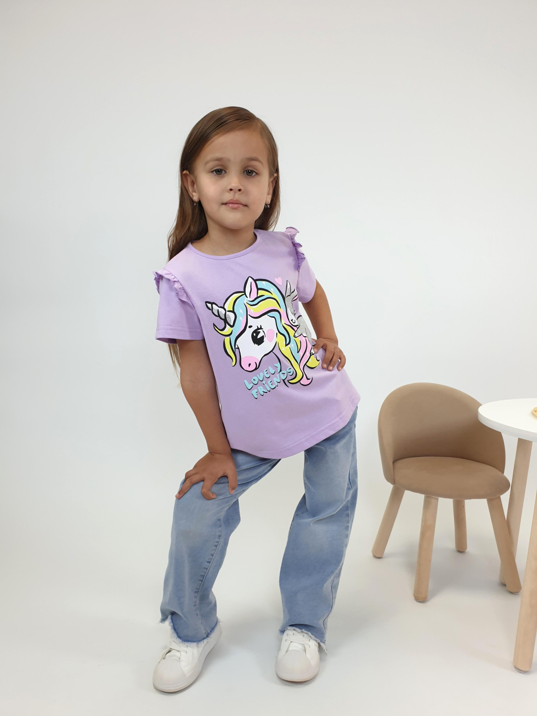 Кулирное полотно:100% х/б. Фуфайка-силуэт трапеция,короткий втачной рукав,в пройме рюша.Горловина окантована,застежка на пуговицу по спинке.Печать на переде.
