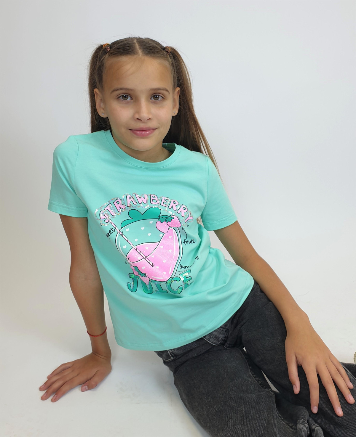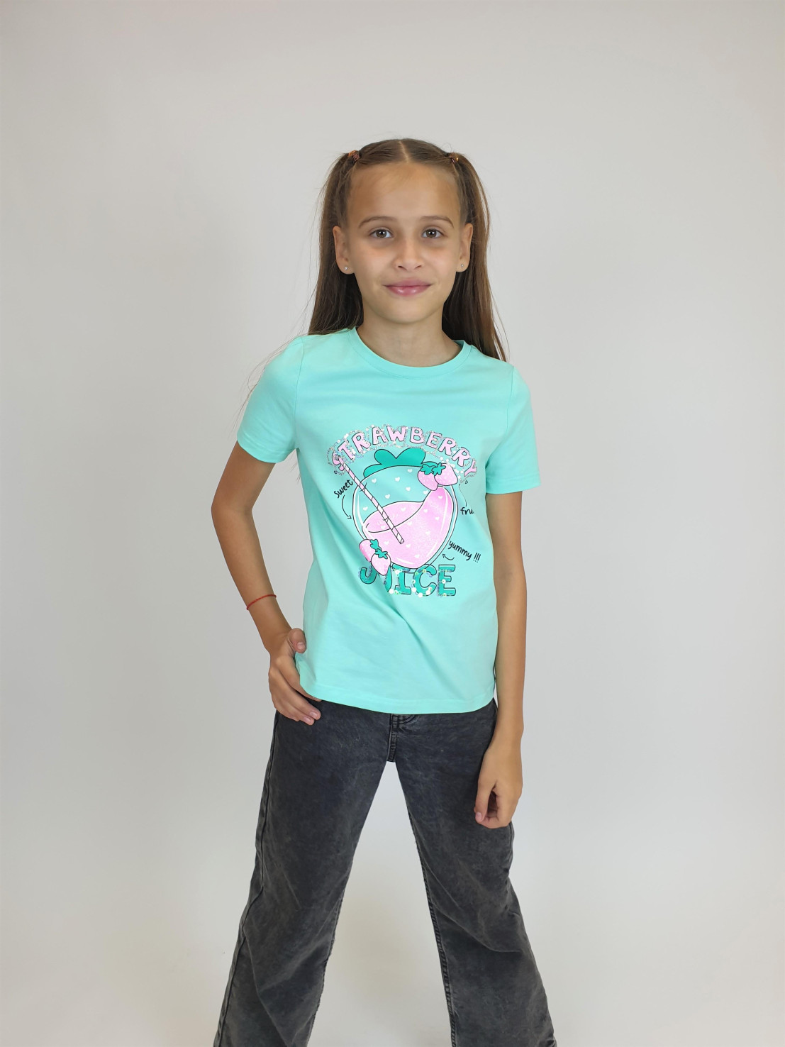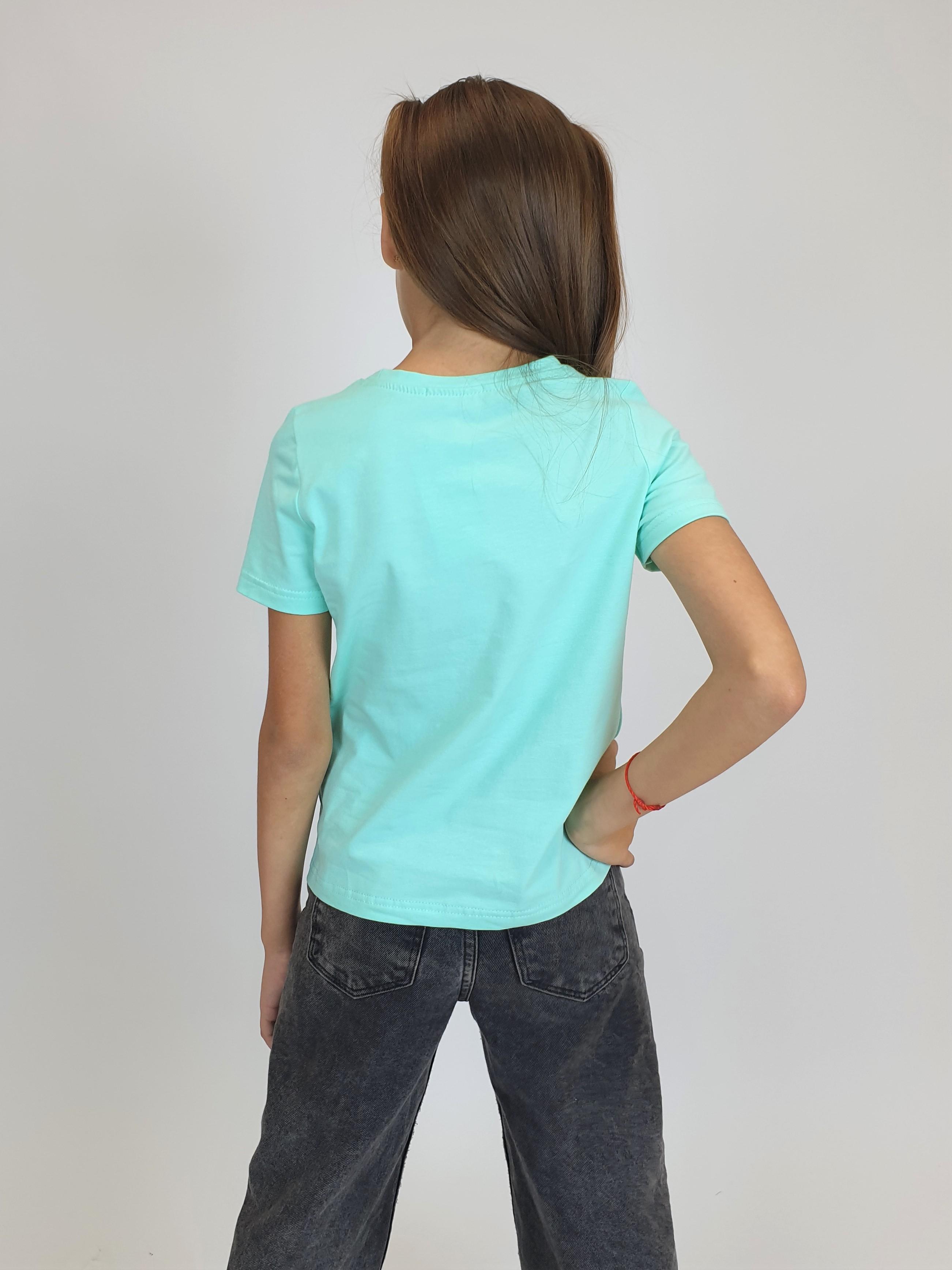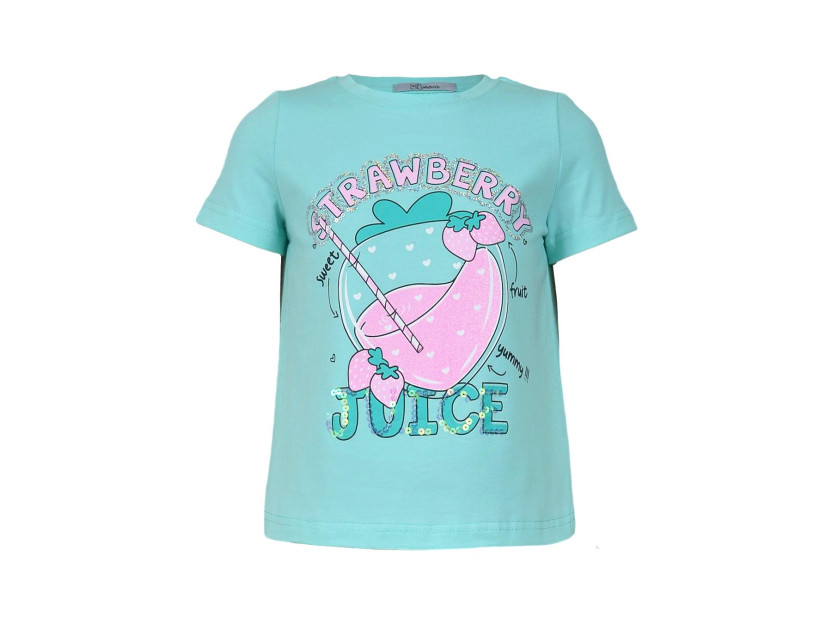 Кулирное полотно:95% х/б,5% лайкра. Фуфайка-прямой силуэт,печать и вышивка(пайетки) на переде,короткий втачной рукав.Низ рукава и фуфайки подшит.Горловина обработана ластиком.