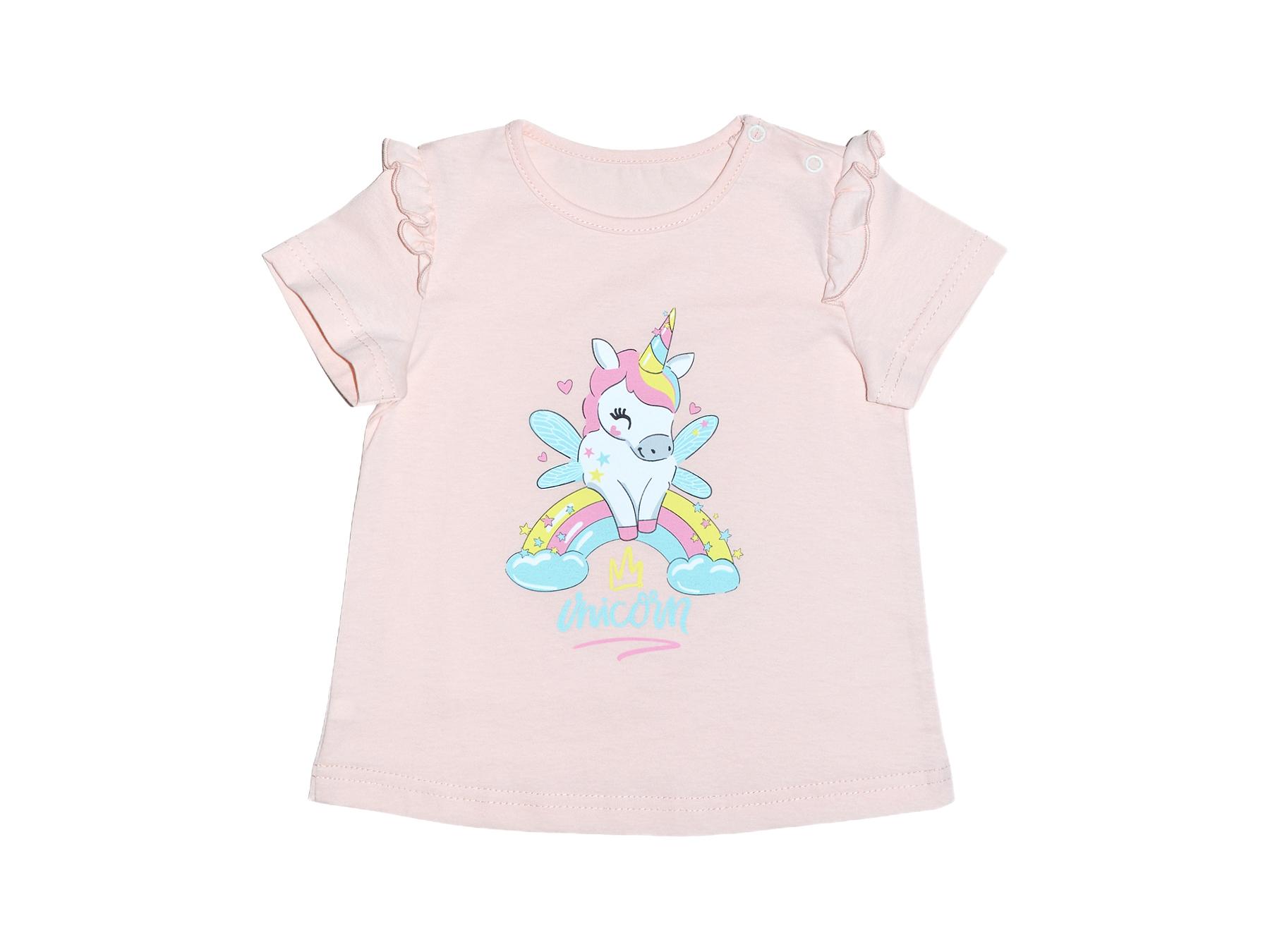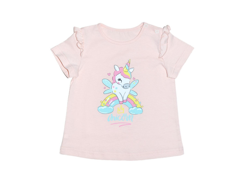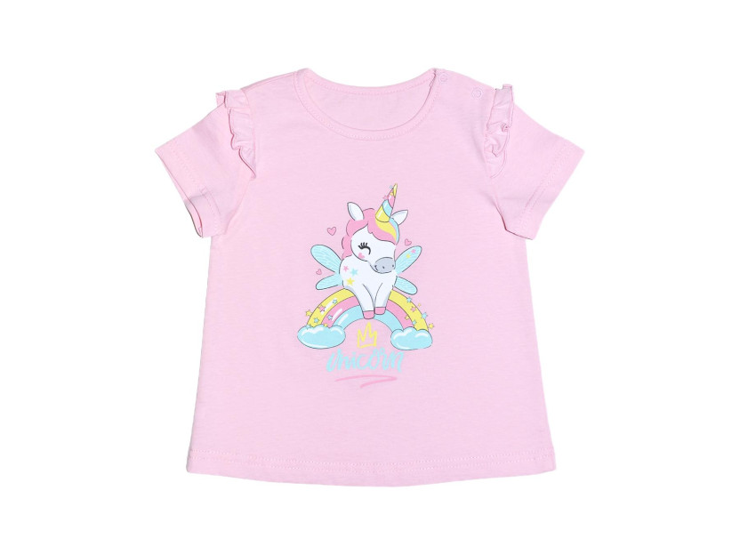 Кулирное полотно: 100% х/б. Фуфайка- силуэт трапеция,короткий втачной рукав,в пройме рюша.Горловина окантована,застежка в плечевом шве на кнопки.Печать на переде.