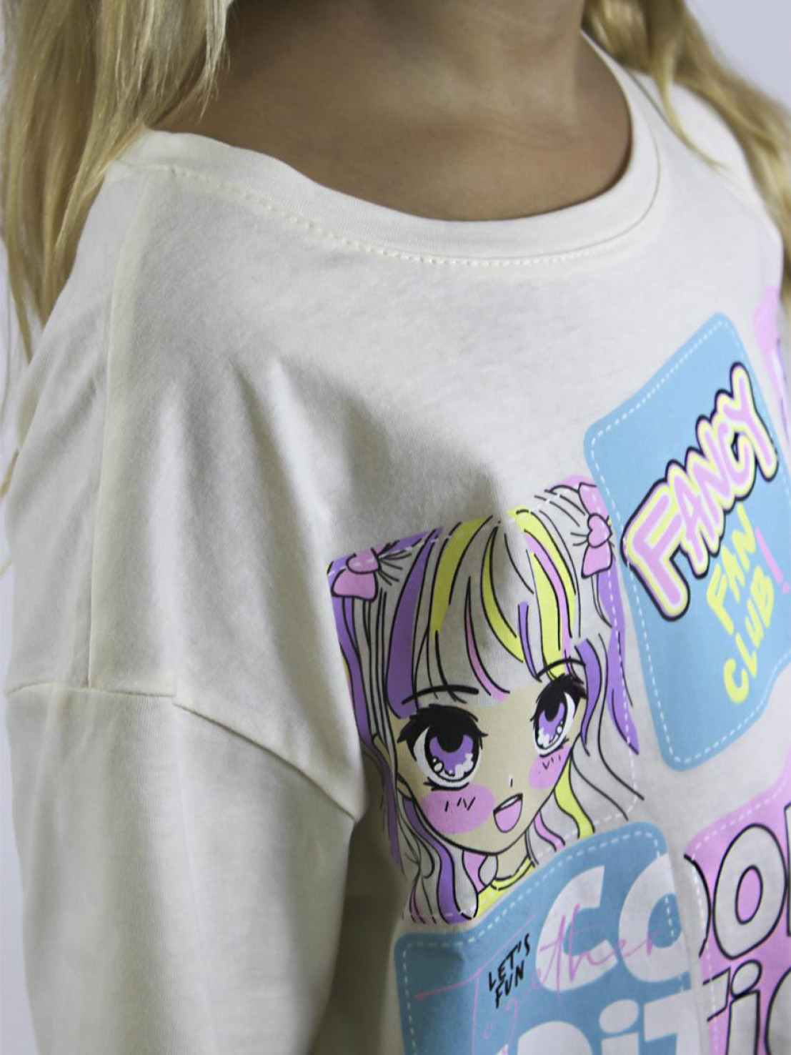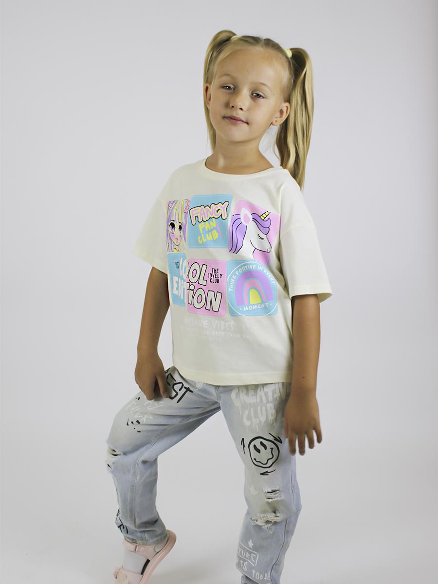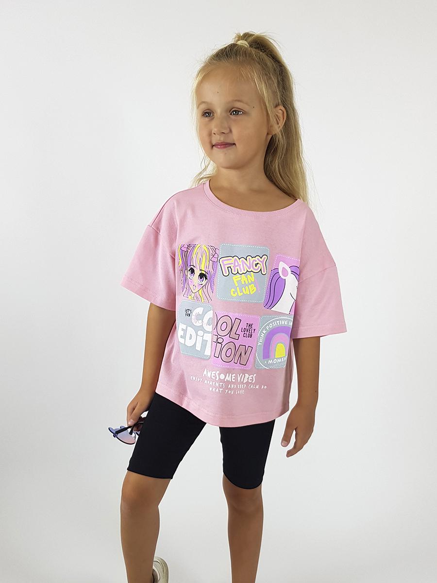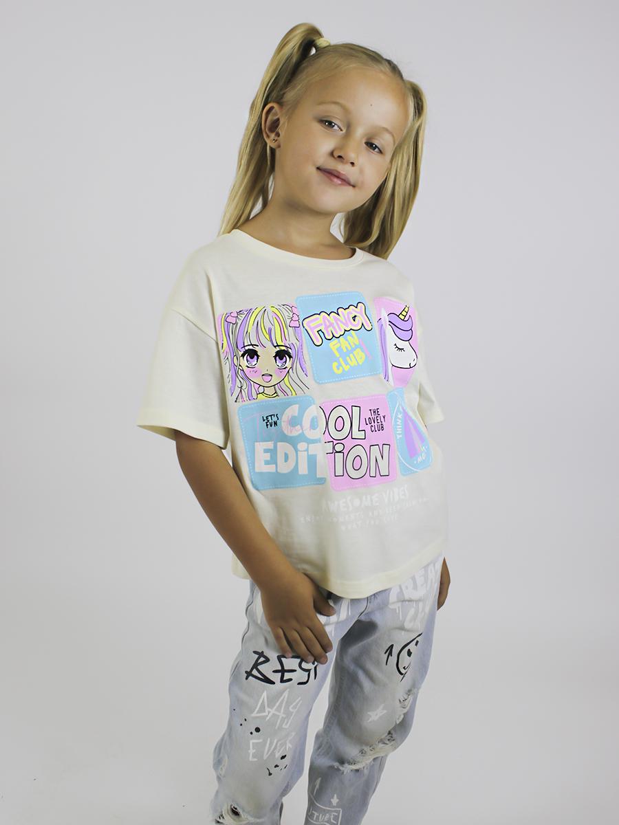 Кулирное полотно:100% х/б. Фуфайка(оверсайз)-спущенное плечо,короткий рукав.Печать на переде,горловина окантована планкой.