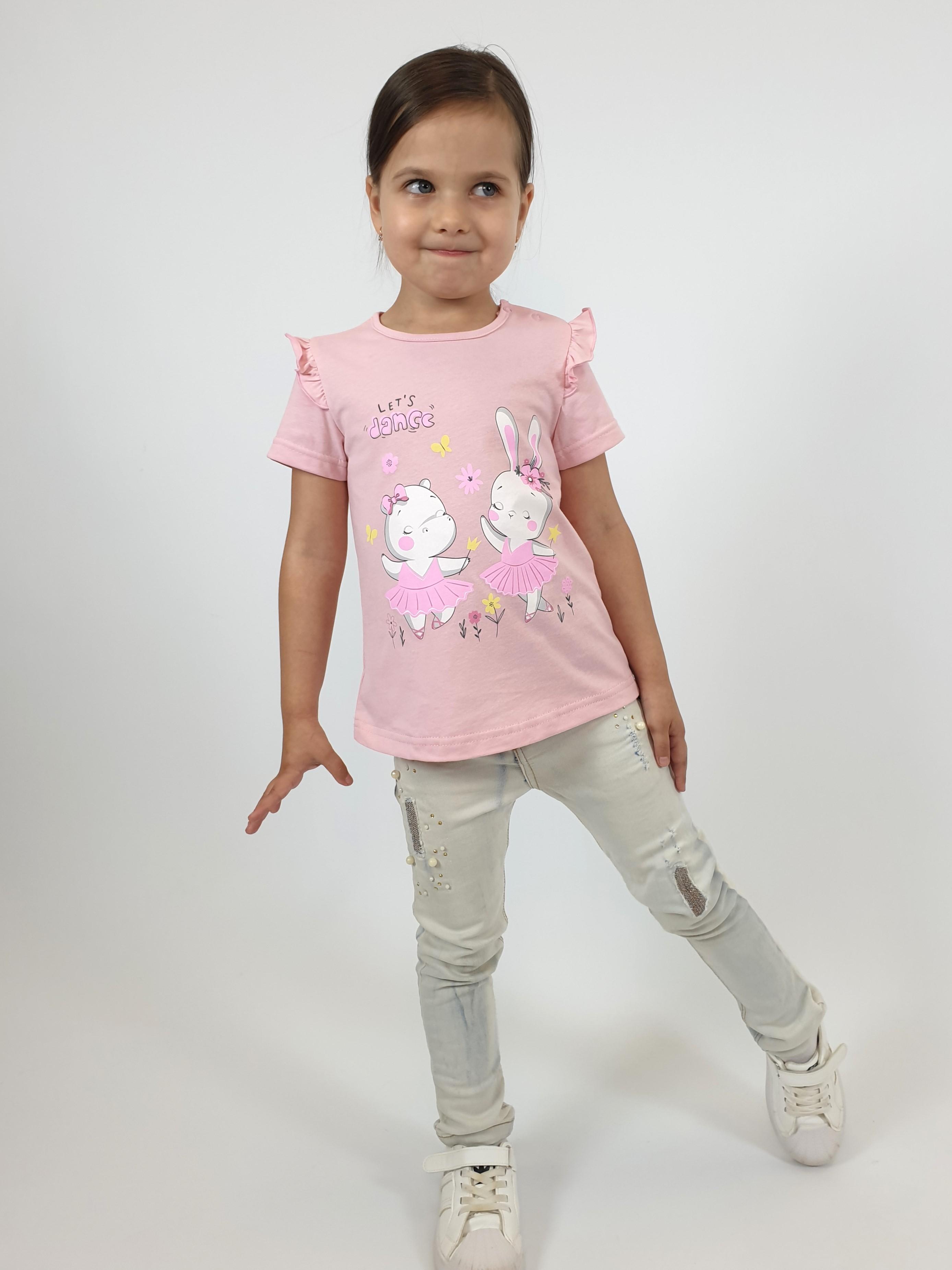 Кулирное полотно: 100% х/б. Фуфайка-силуэт трапеция,короткий втачной рукав,в пройме рюша..Горловина окантована,застежка в плечевом шве на кнопки.Печать на переде.