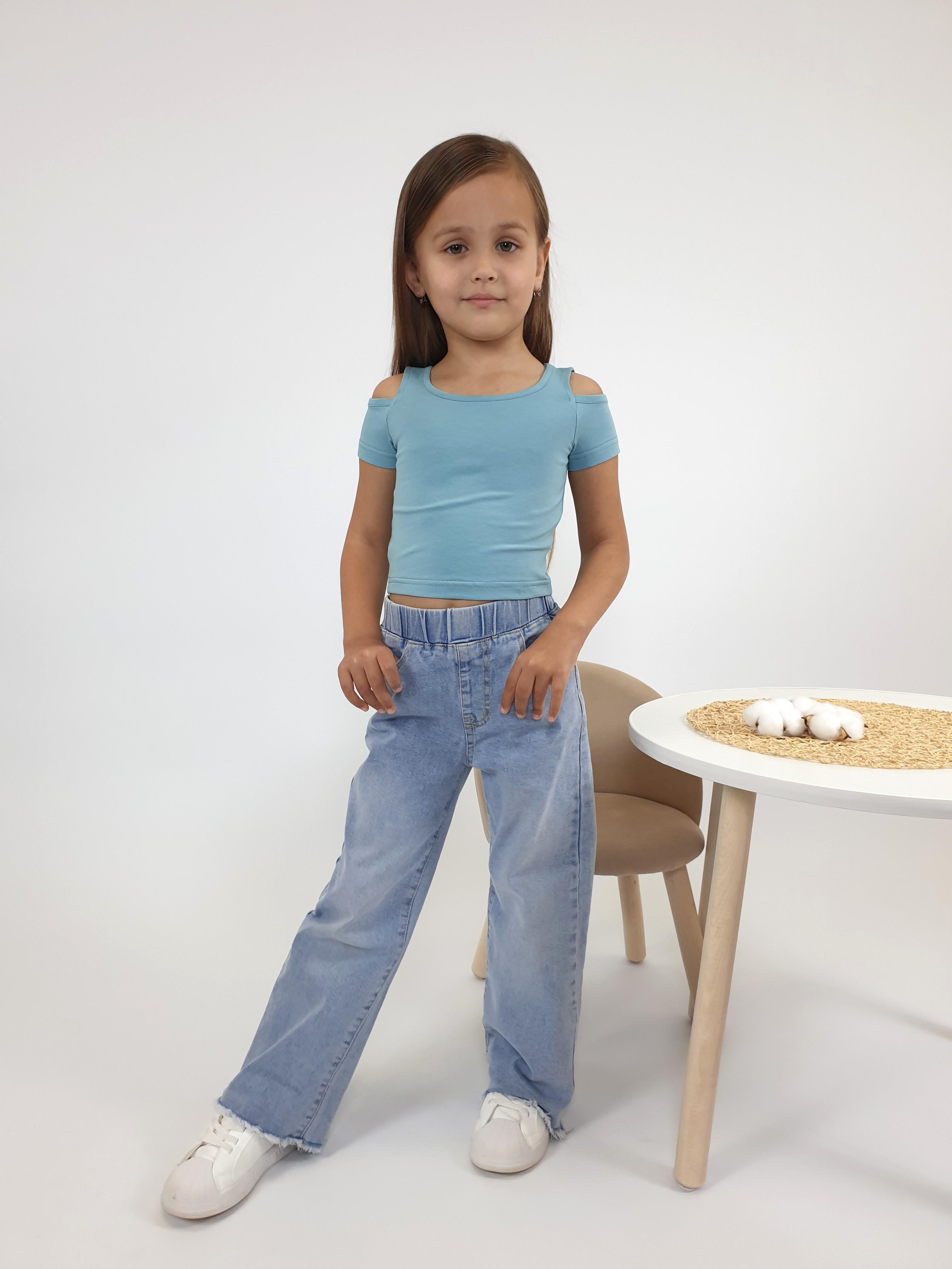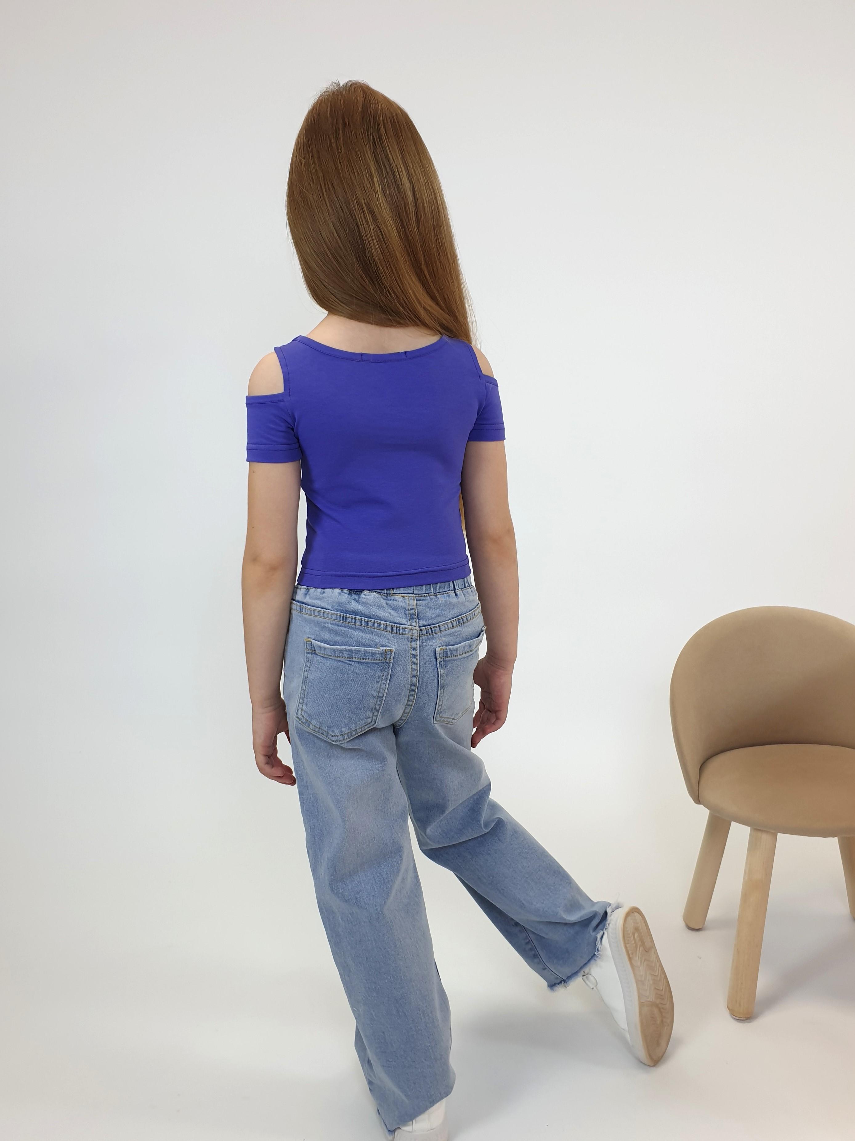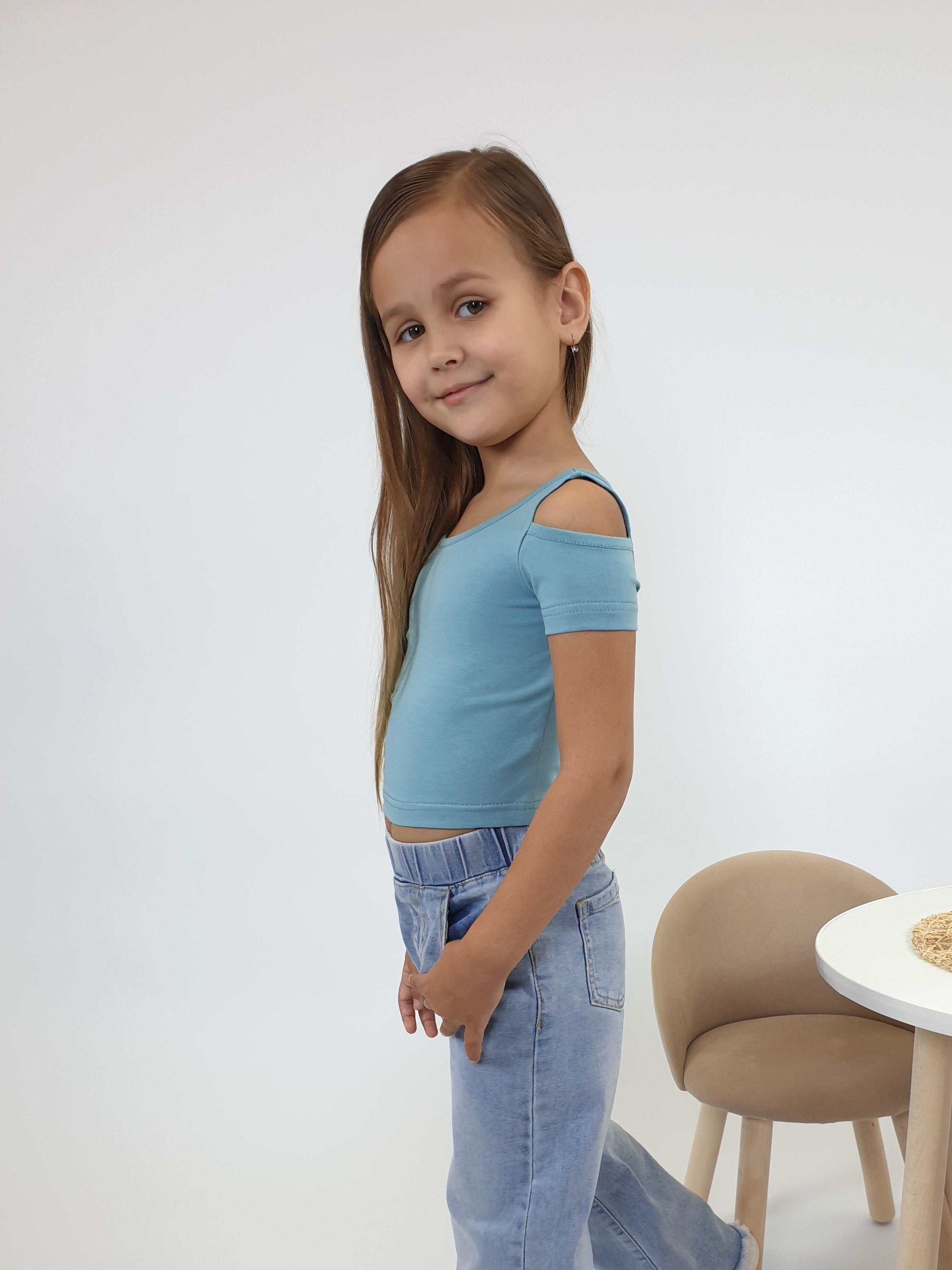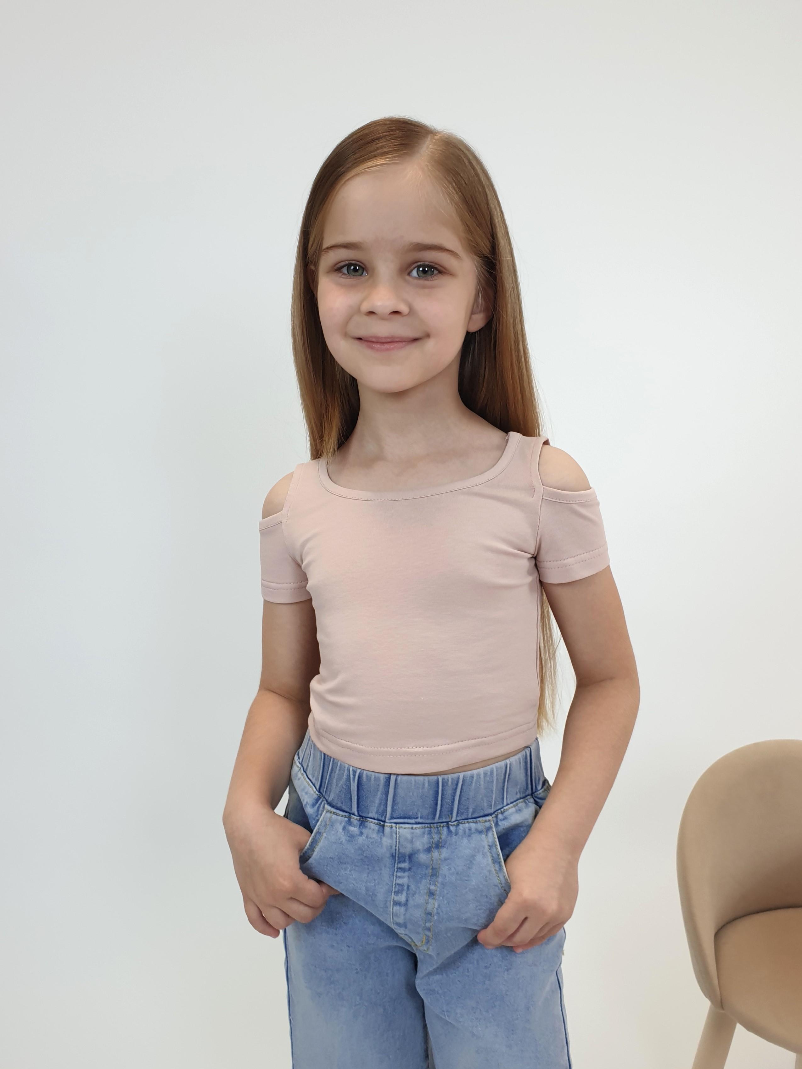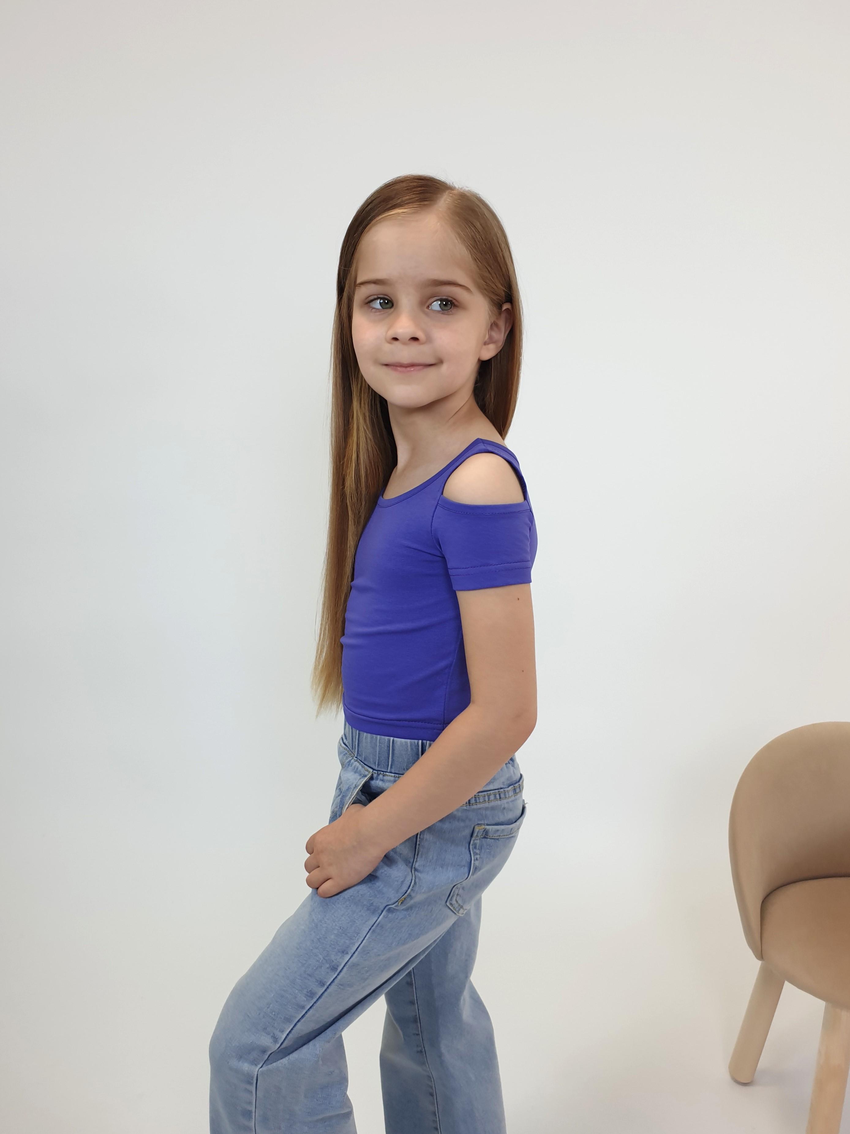 Кулирное полотно: 95% х/б,5% лайкра. Фуфайка-укороченная с коротким рукавом,с вырезом на плече.Горловина окантована.