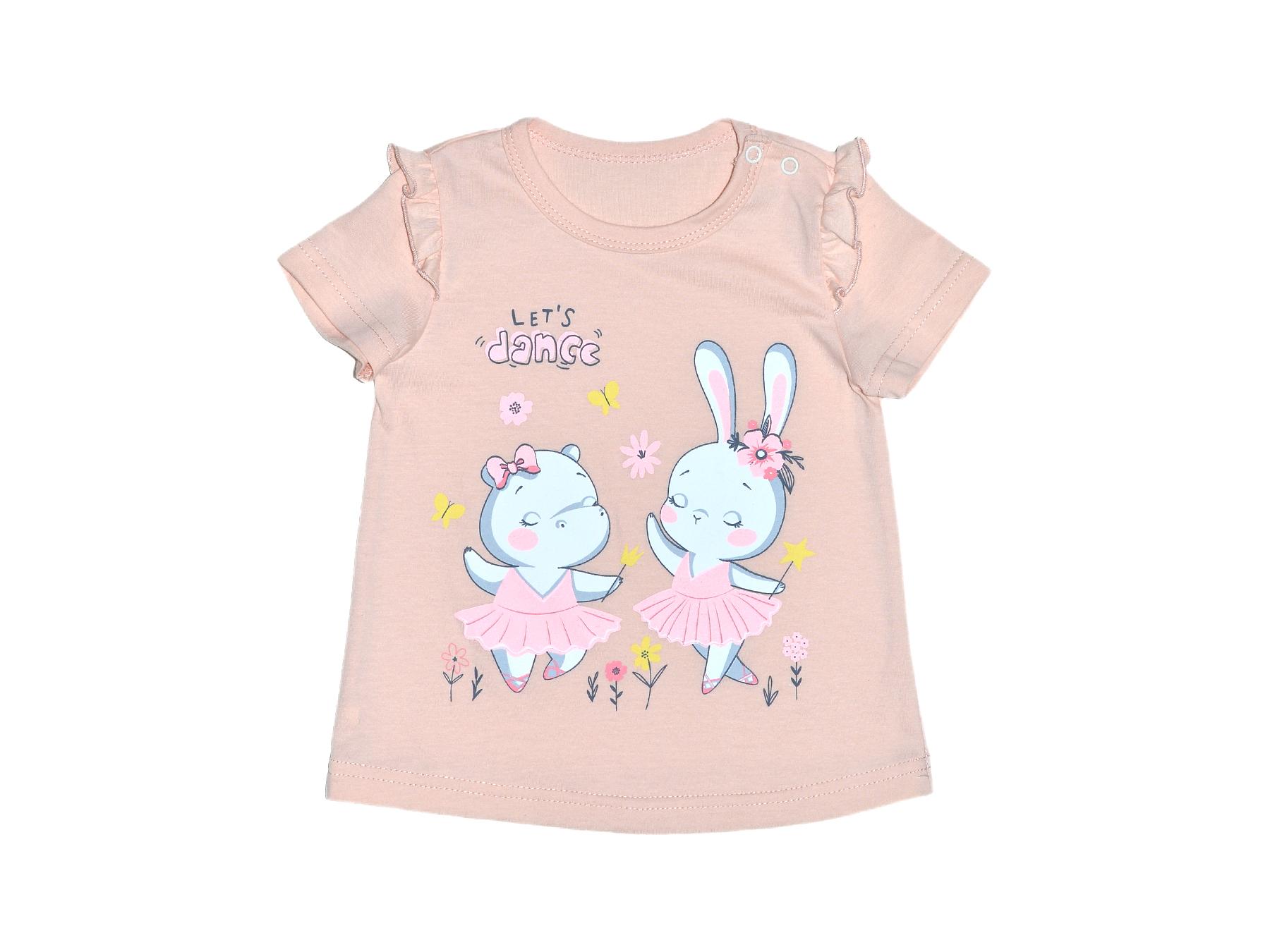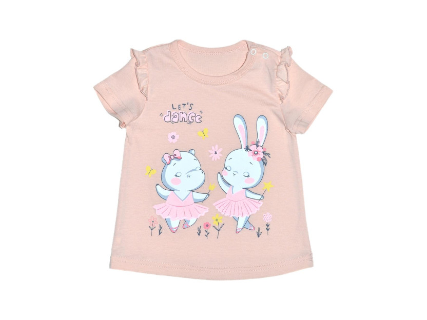 Кулирное полотно: 100% х/б. Фуфайка-силуэт трапеция,короткий втачной рукав,в пройме рюша..Горловина окантована,застежка в плечевом шве на кнопки.Печать на переде.