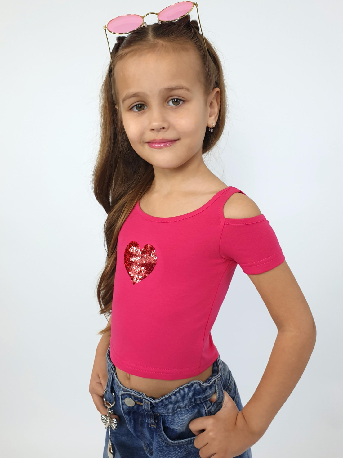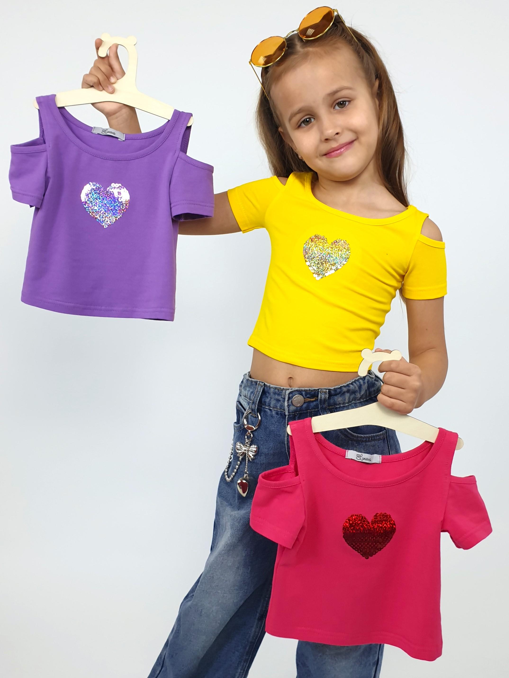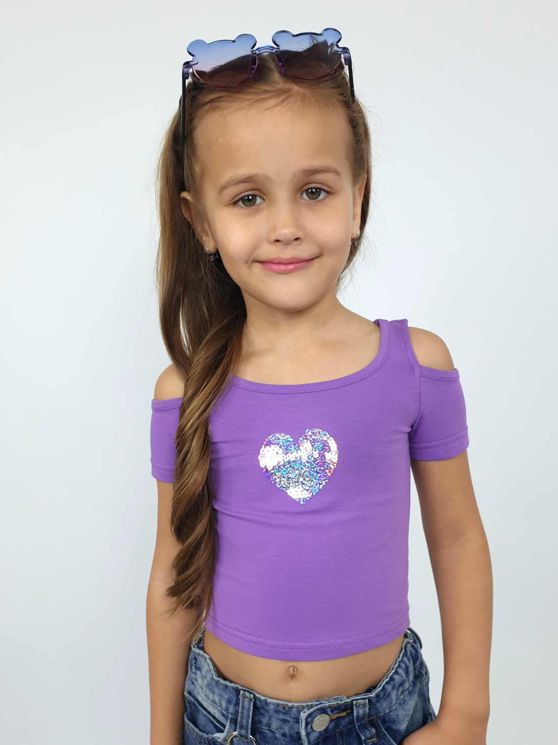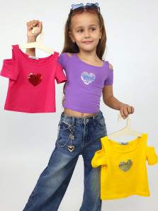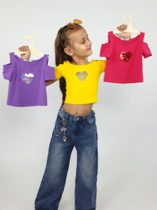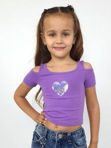 Кулирное полотно: 95% х/б,5% лайкра. Фуфайка-укороченная с коротким рукавом,с вырезом на плече.Горловина окантована.Перед с вышивкой.