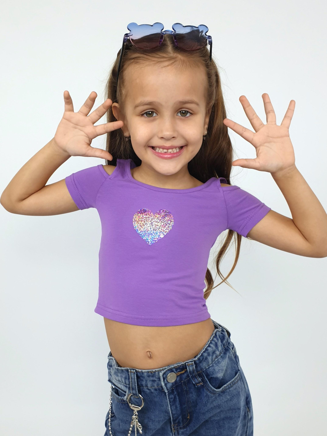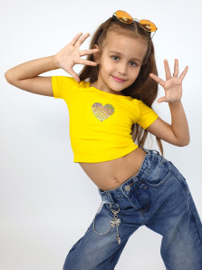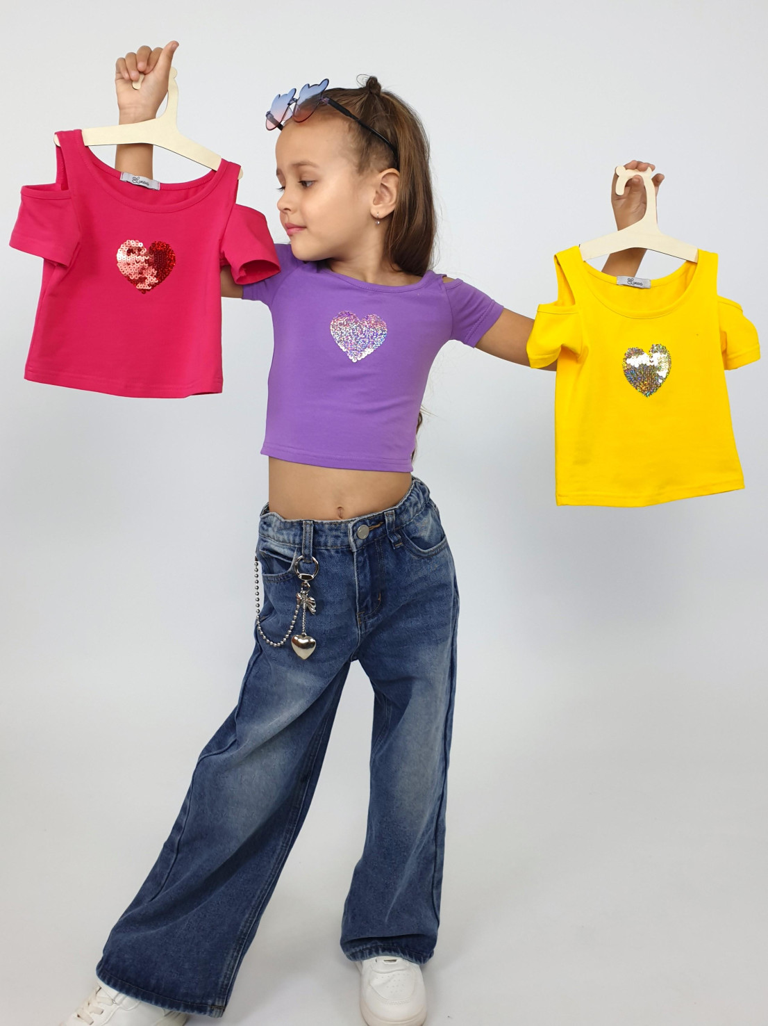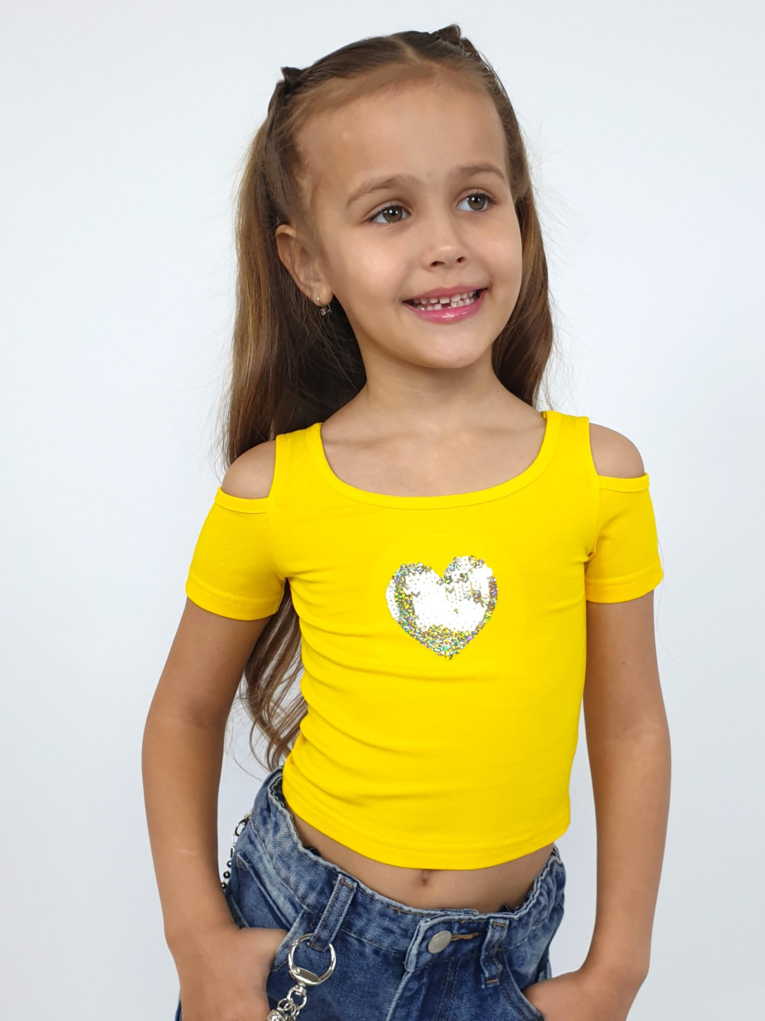 Кулирное полотно: 95% х/б,5% лайкра. Фуфайка-укороченная с коротким рукавом,с вырезом на плече.Горловина окантована.Перед с вышивкой.