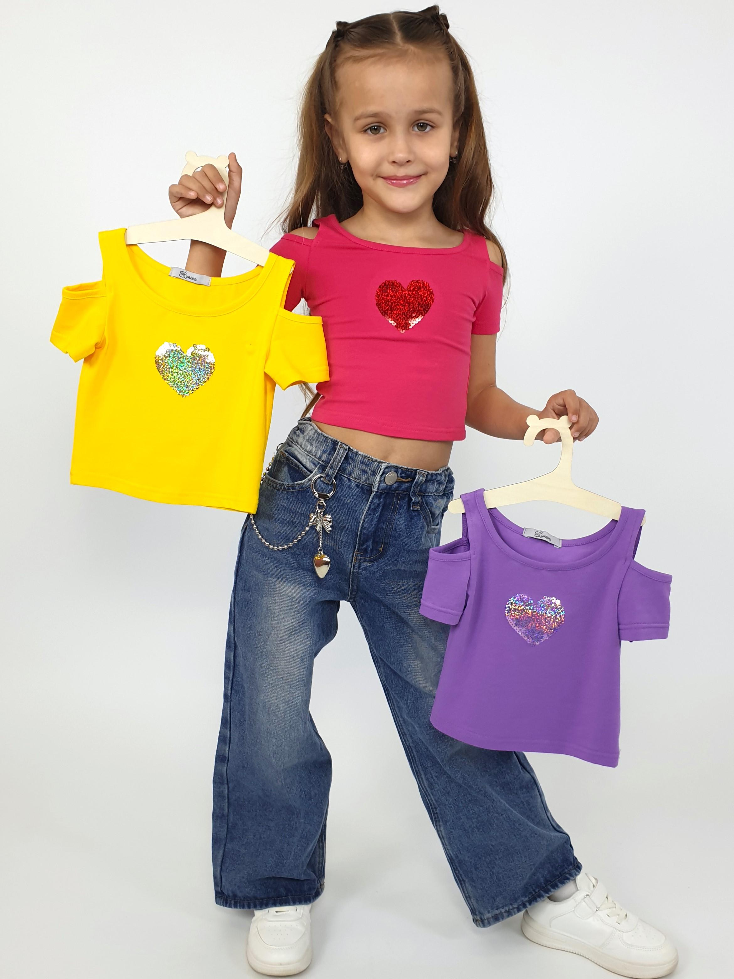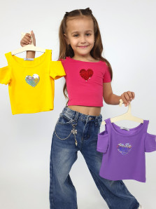 Кулирное полотно: 95% х/б,5% лайкра. Фуфайка-укороченная с коротким рукавом,с вырезом на плече.Горловина окантована.Перед с вышивкой.
