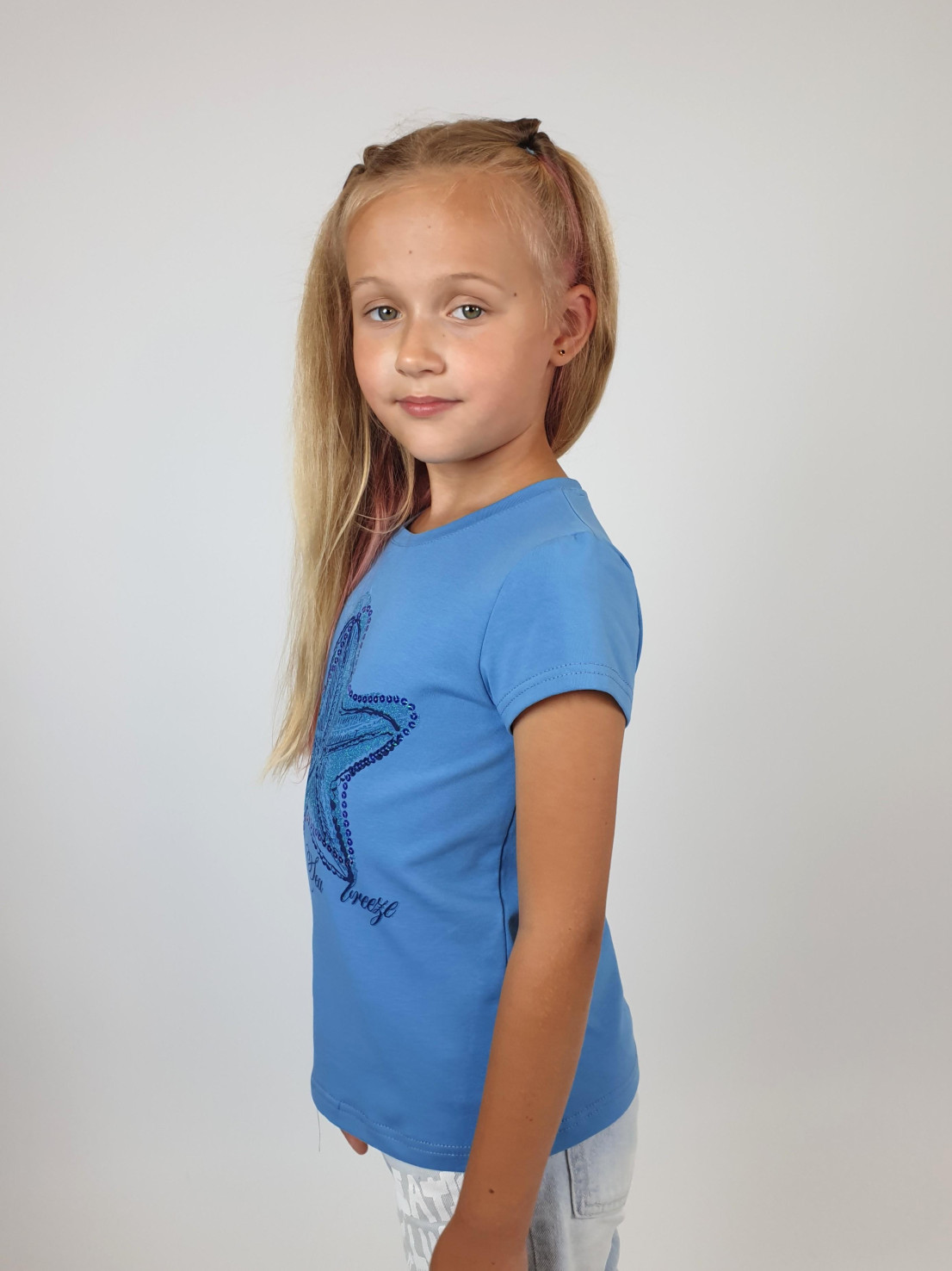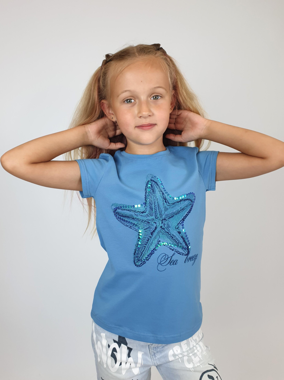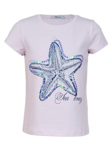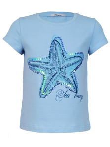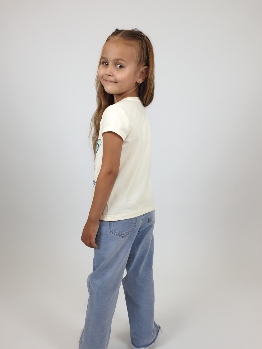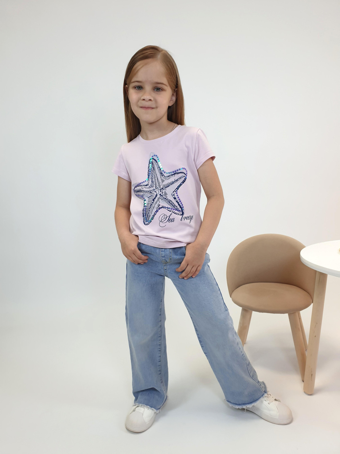 Футболка для девочки изготовлена из кулирного полотна (95 % хлопок, 5% лайкра). Модель полуприлегающего силуэта. Оригинальный принт с вышивкой (пайетки) точно понравится юным модницам. Ткань изделия мягкая, дышащая и приятная к телу.
