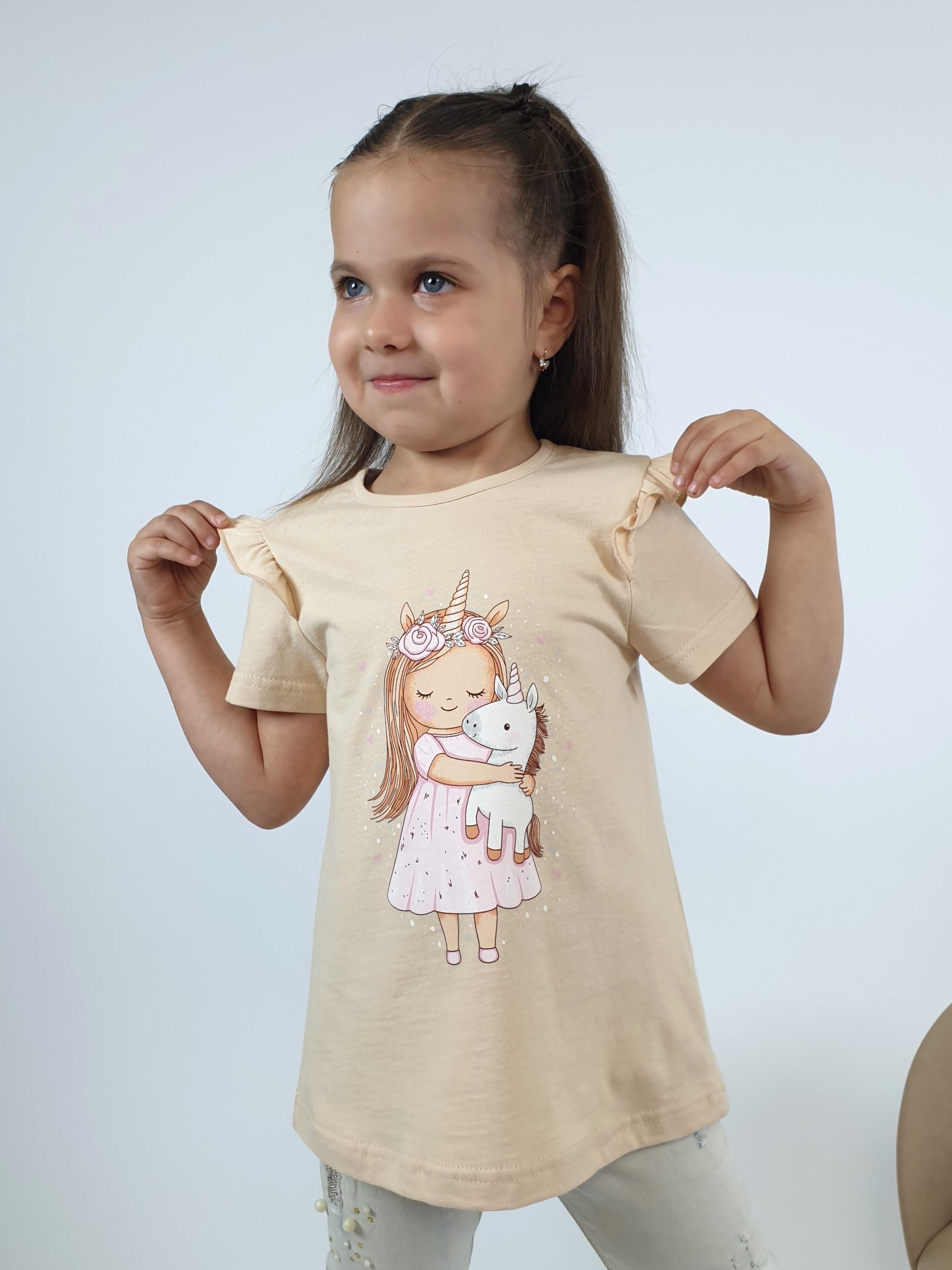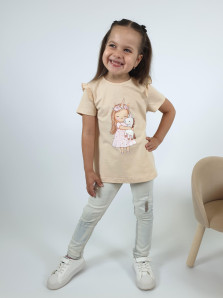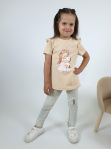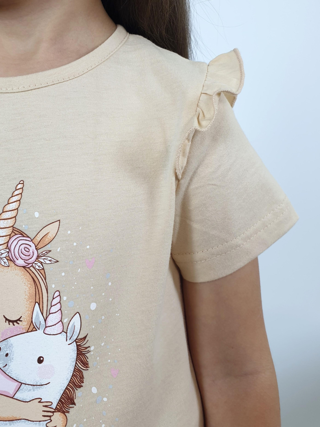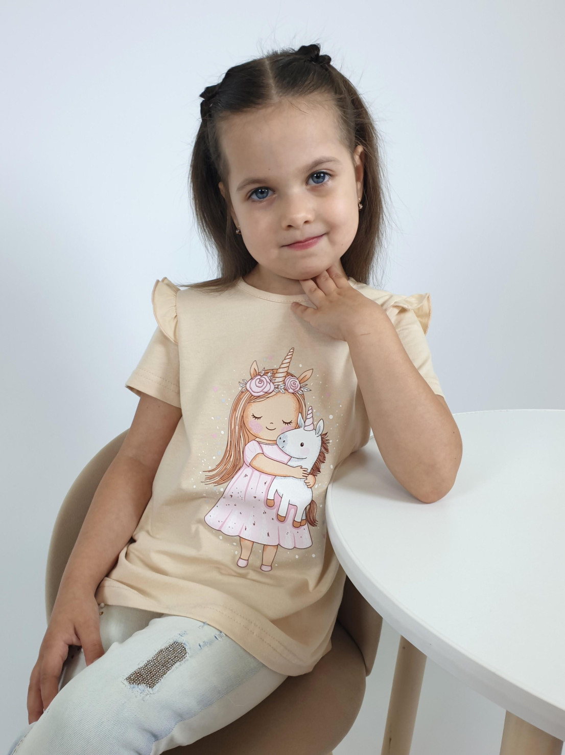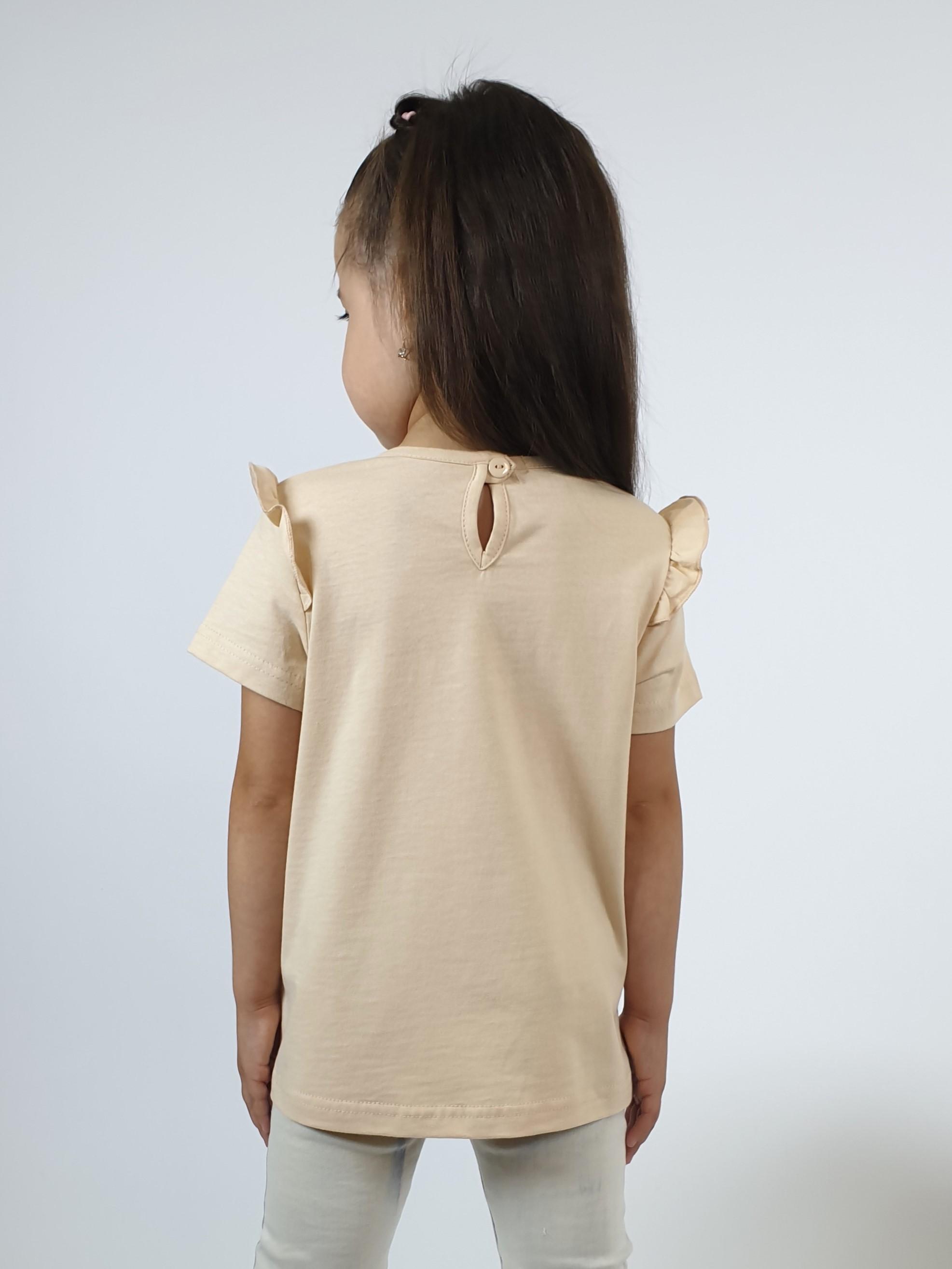 Кулирное полотно:100% х/б. Фуфайка-силуэт трапеция,короткий втачной рукав,в пройме рюша.Горловина окантована,застежка на пуговицу по спинке.Печать на переде.