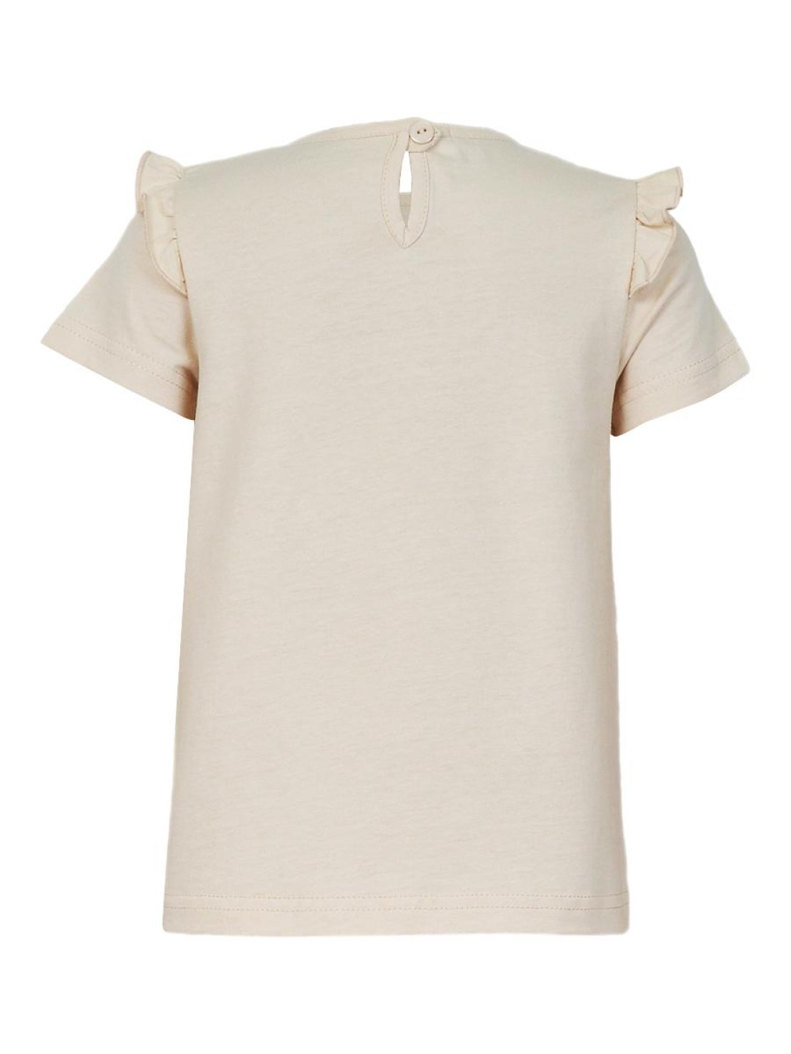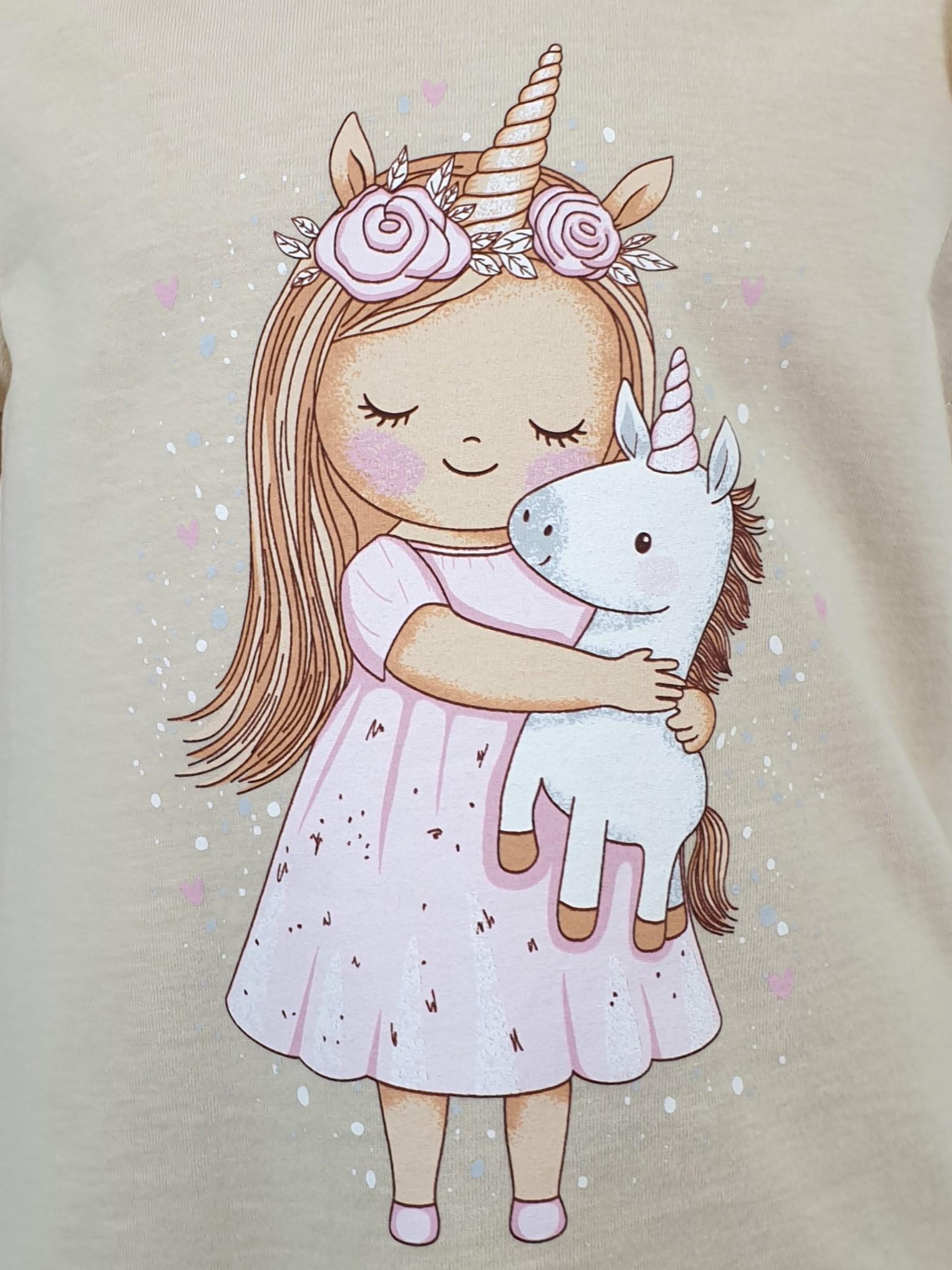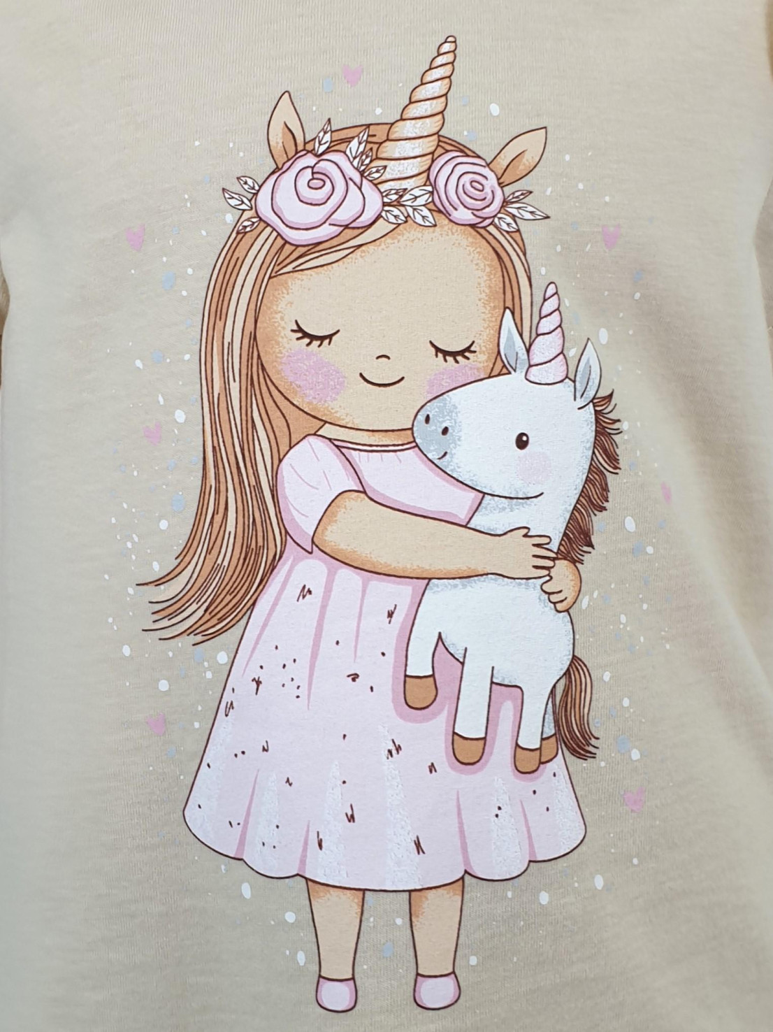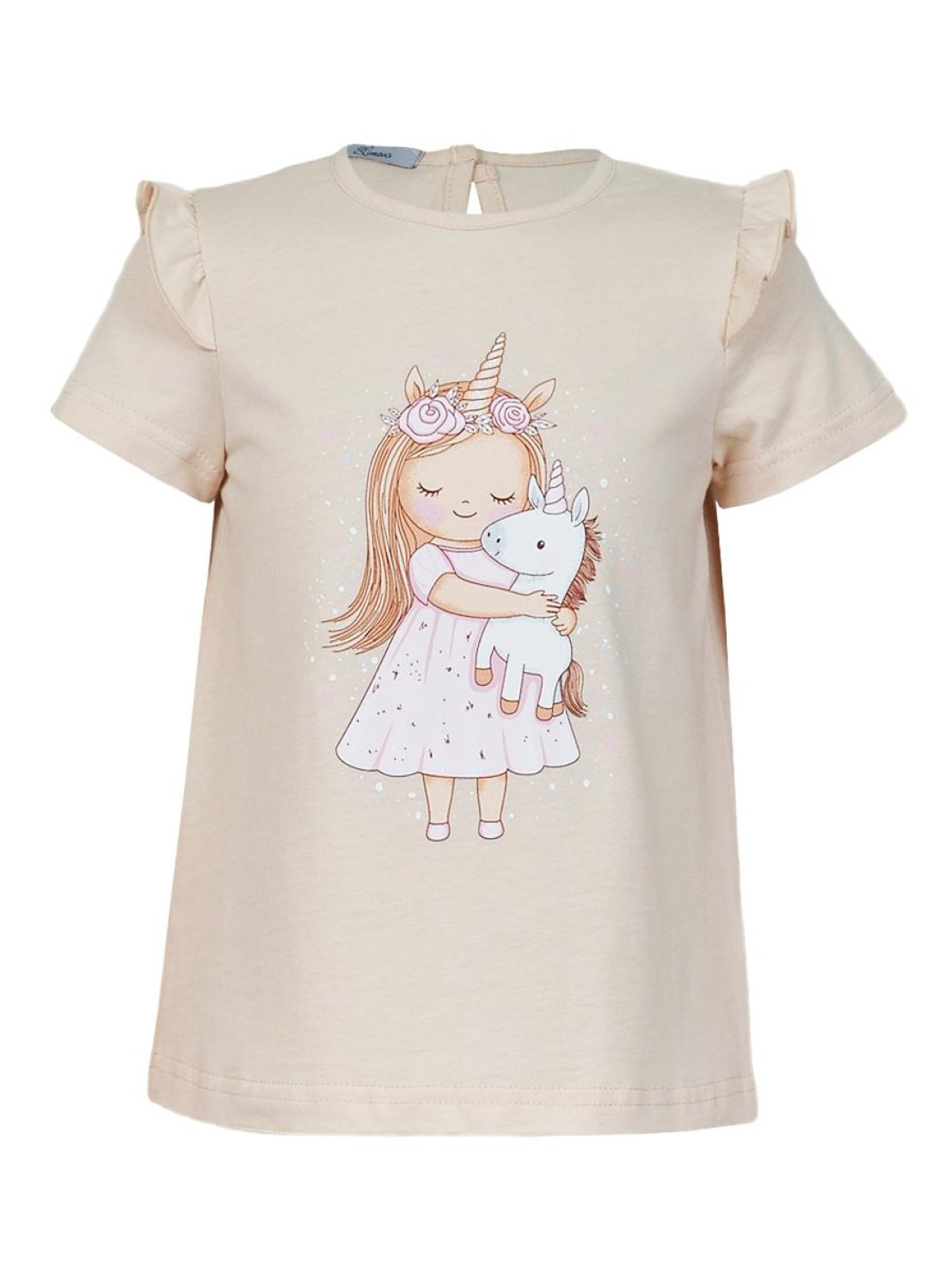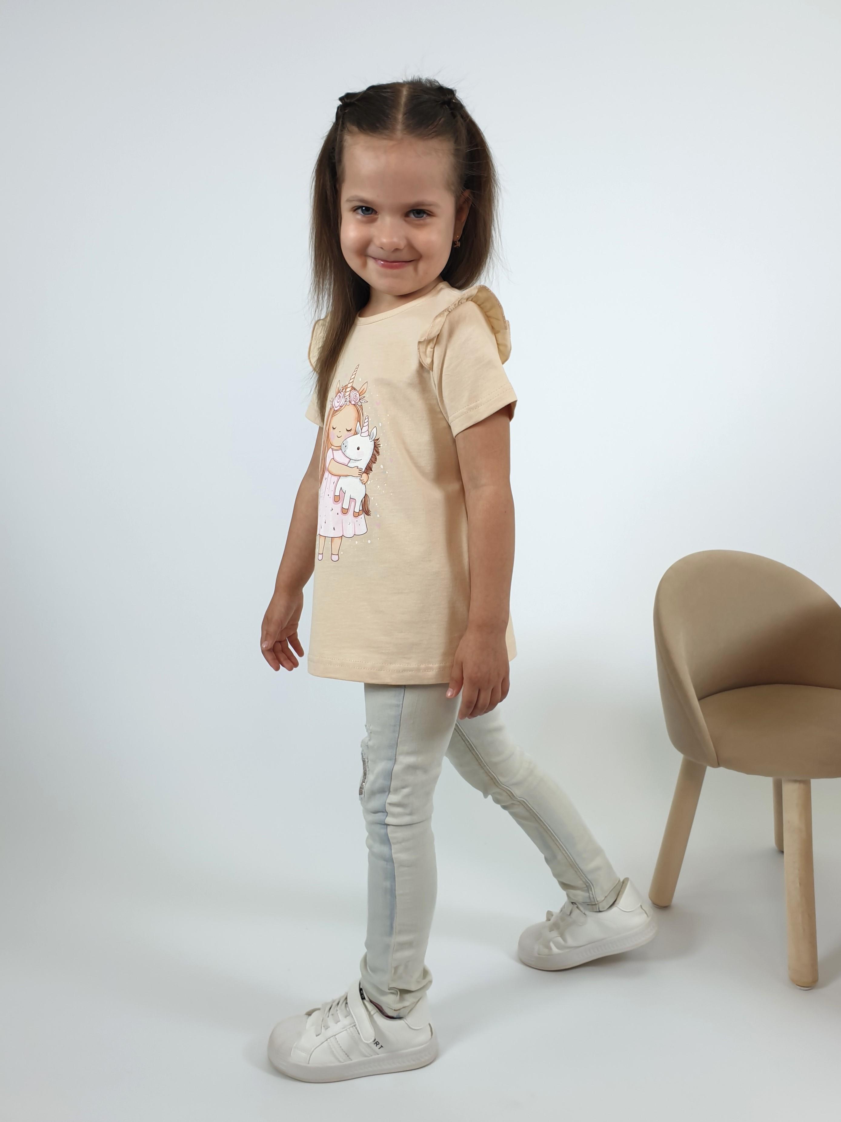 Кулирное полотно:100% х/б. Фуфайка-силуэт трапеция,короткий втачной рукав,в пройме рюша.Горловина окантована,застежка на пуговицу по спинке.Печать на переде.