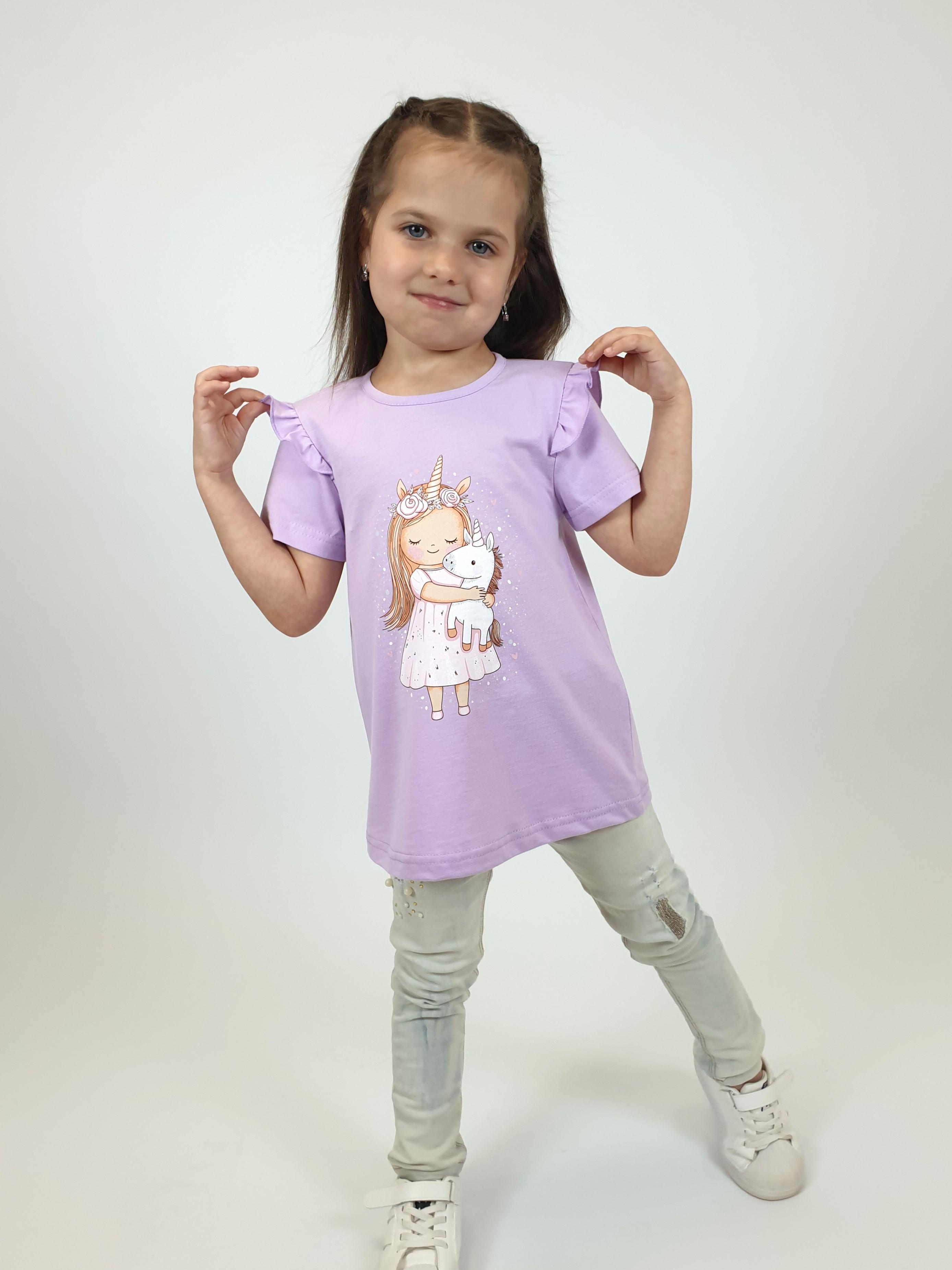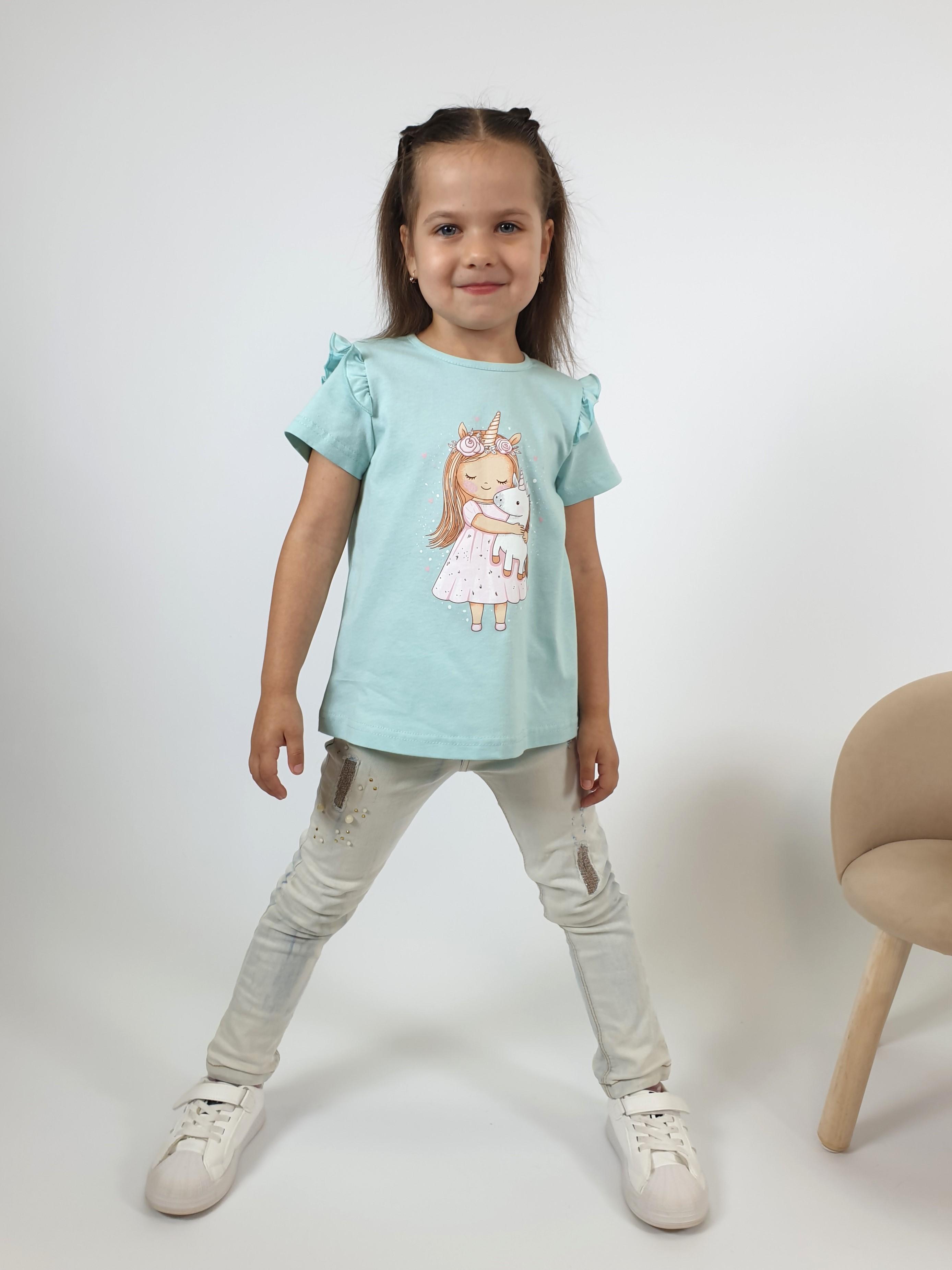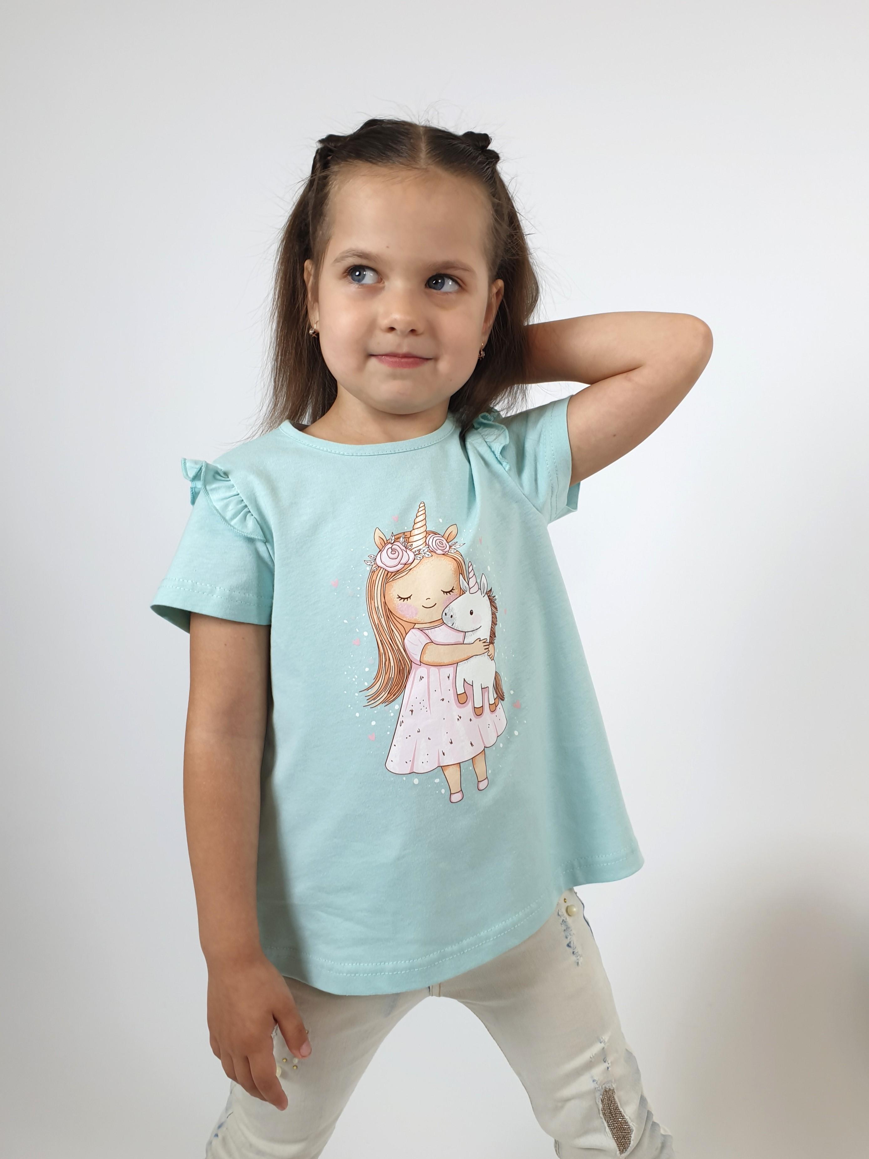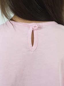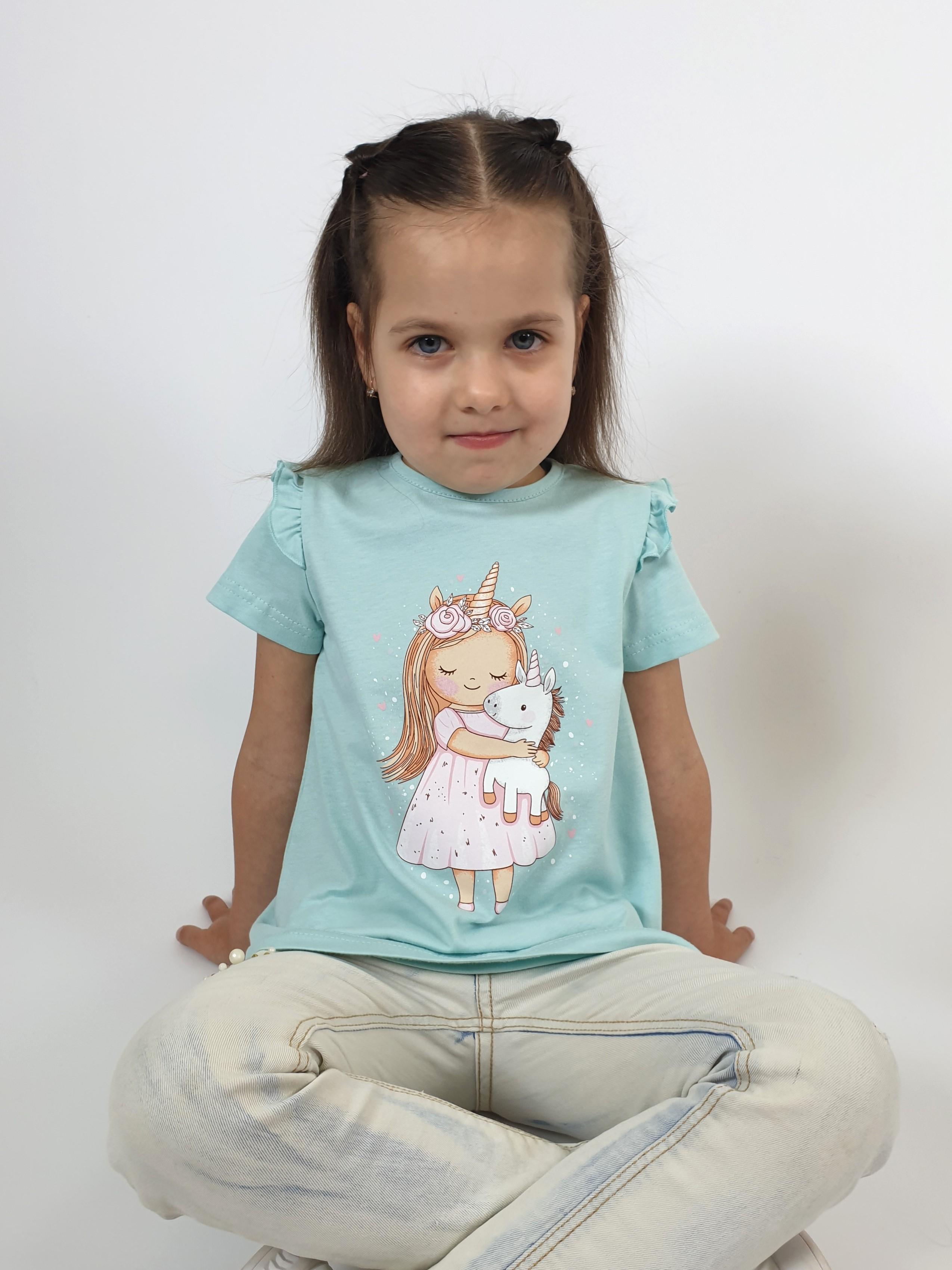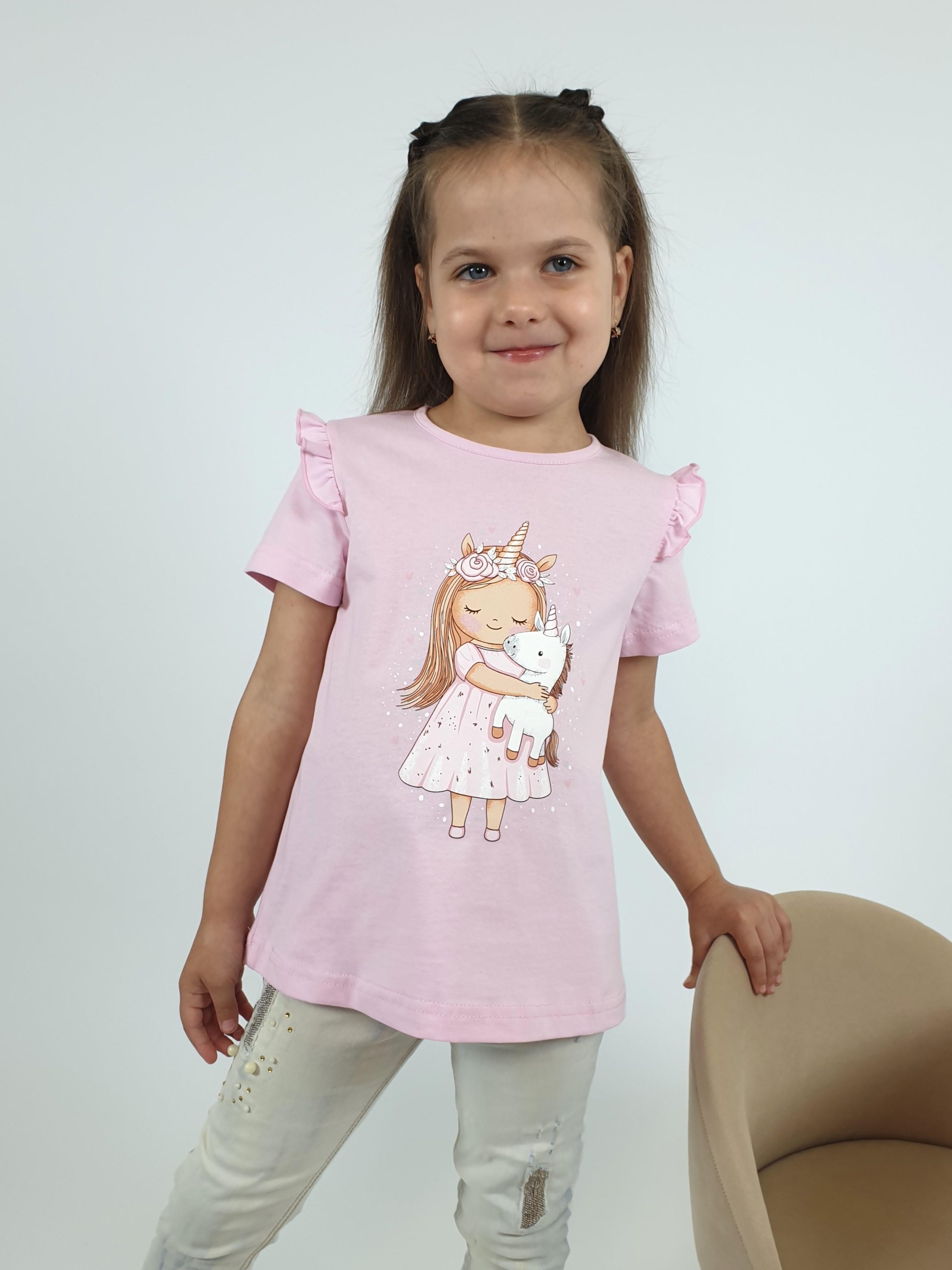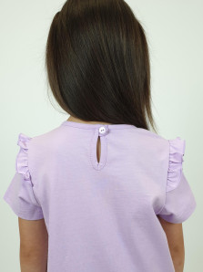 Кулирное полотно:100% х/б. Фуфайка-силуэт трапеция,короткий втачной рукав,в пройме рюша.Горловина окантована,застежка на пуговицу по спинке.Печать на переде.