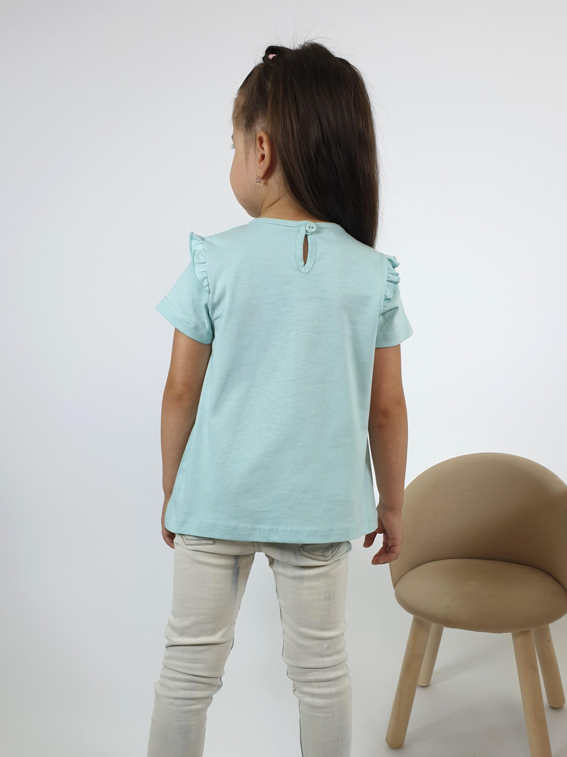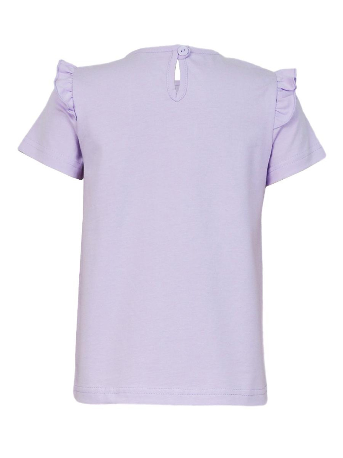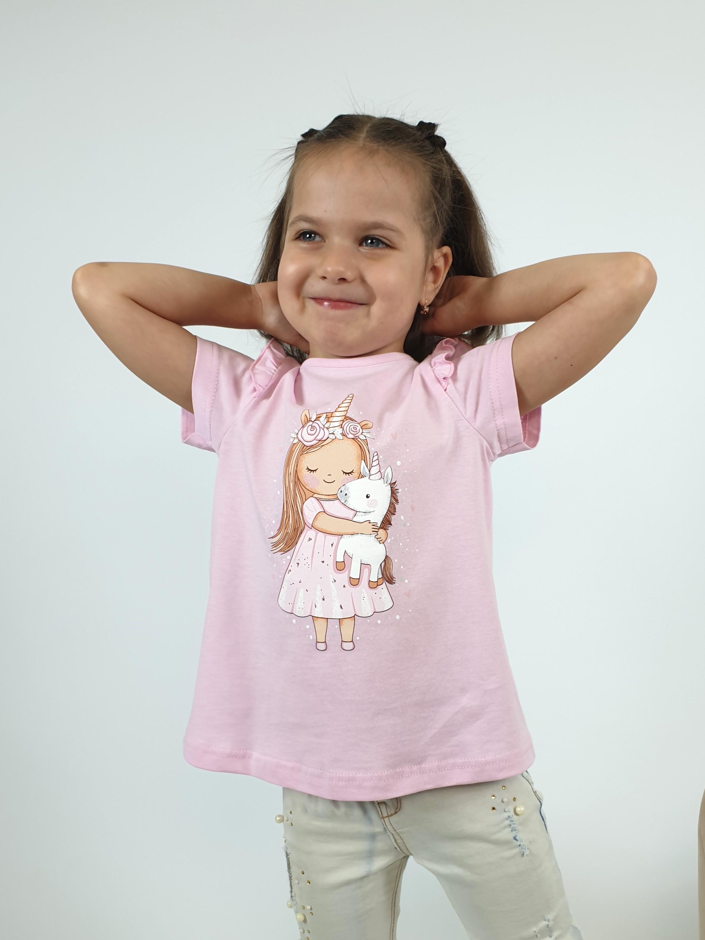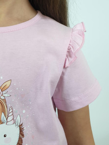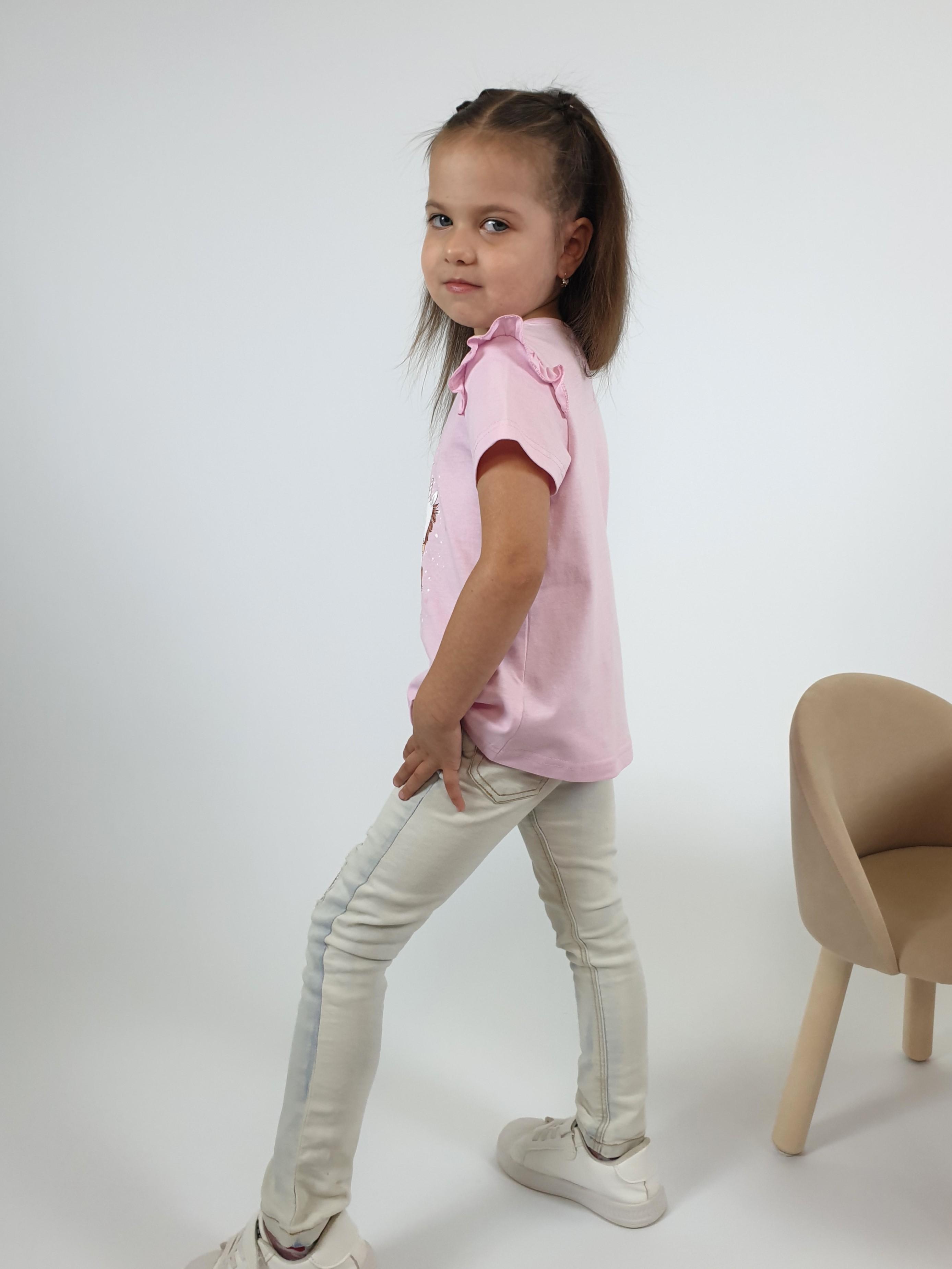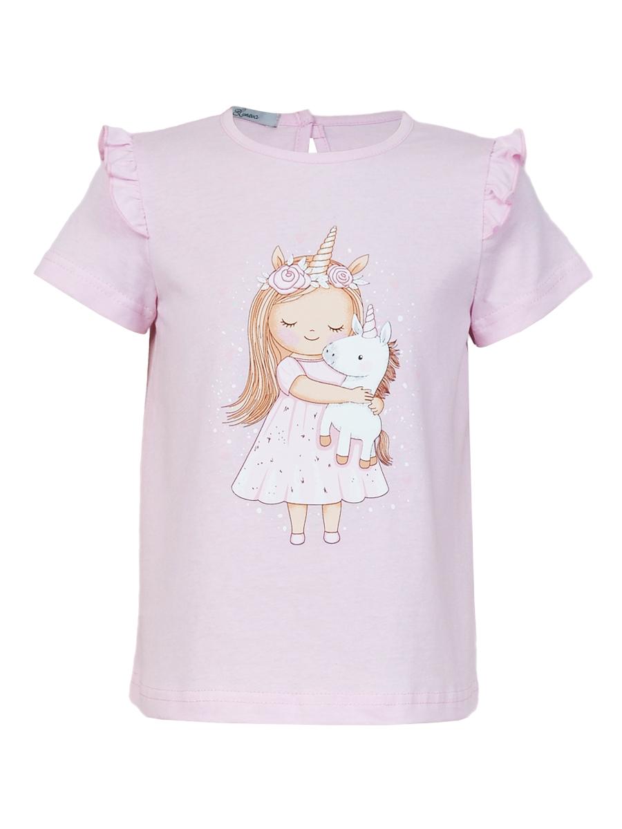Кулирное полотно:100% х/б. Фуфайка-силуэт трапеция,короткий втачной рукав,в пройме рюша.Горловина окантована,застежка на пуговицу по спинке.Печать на переде.