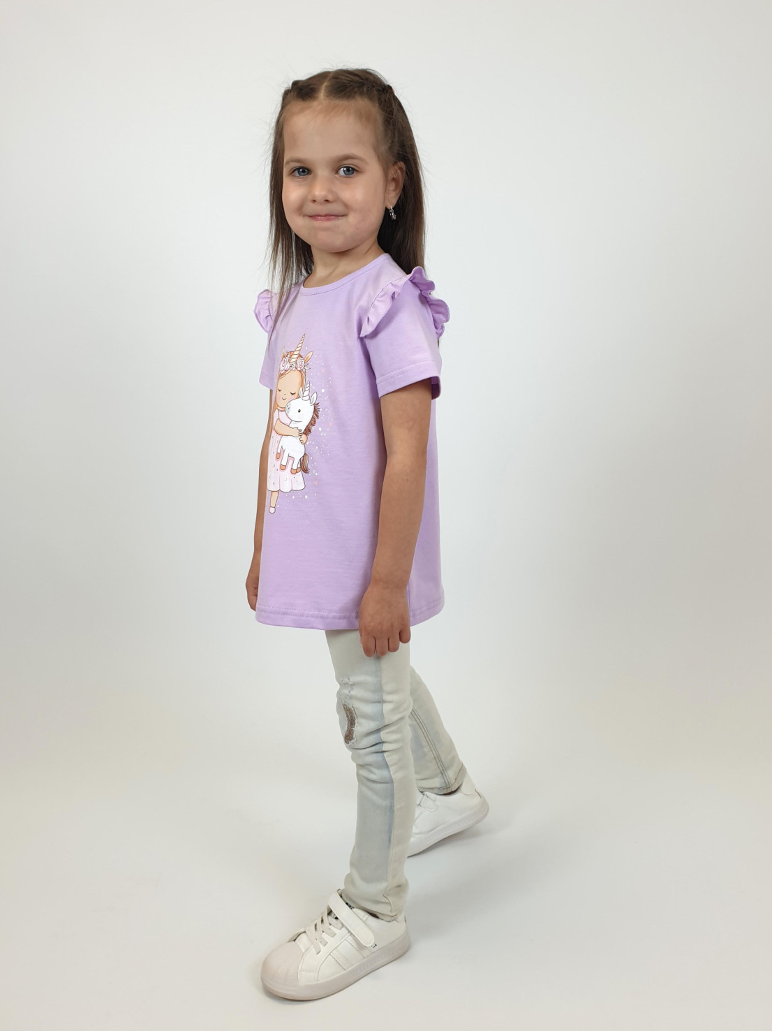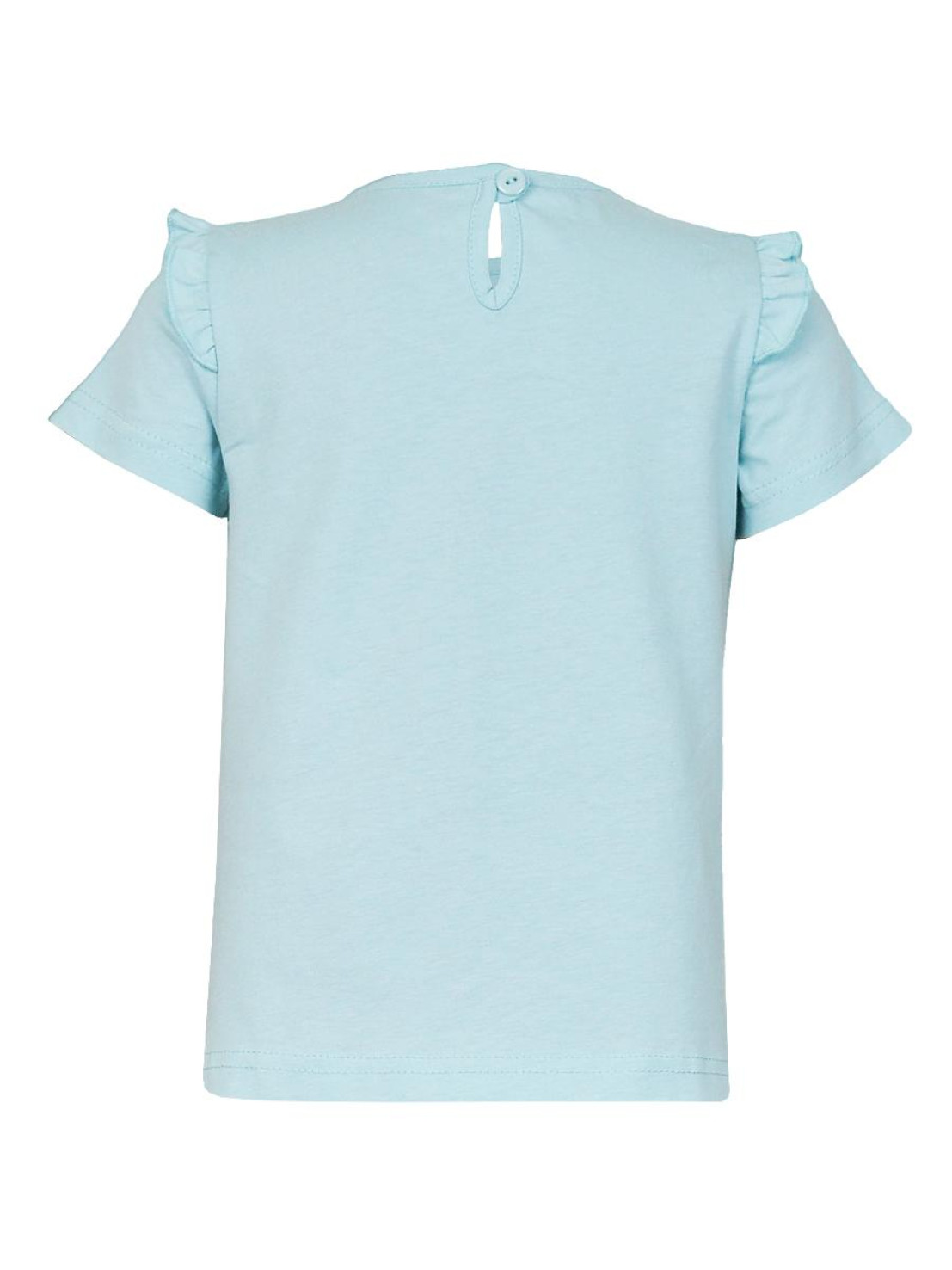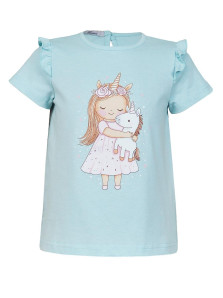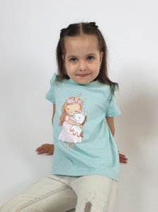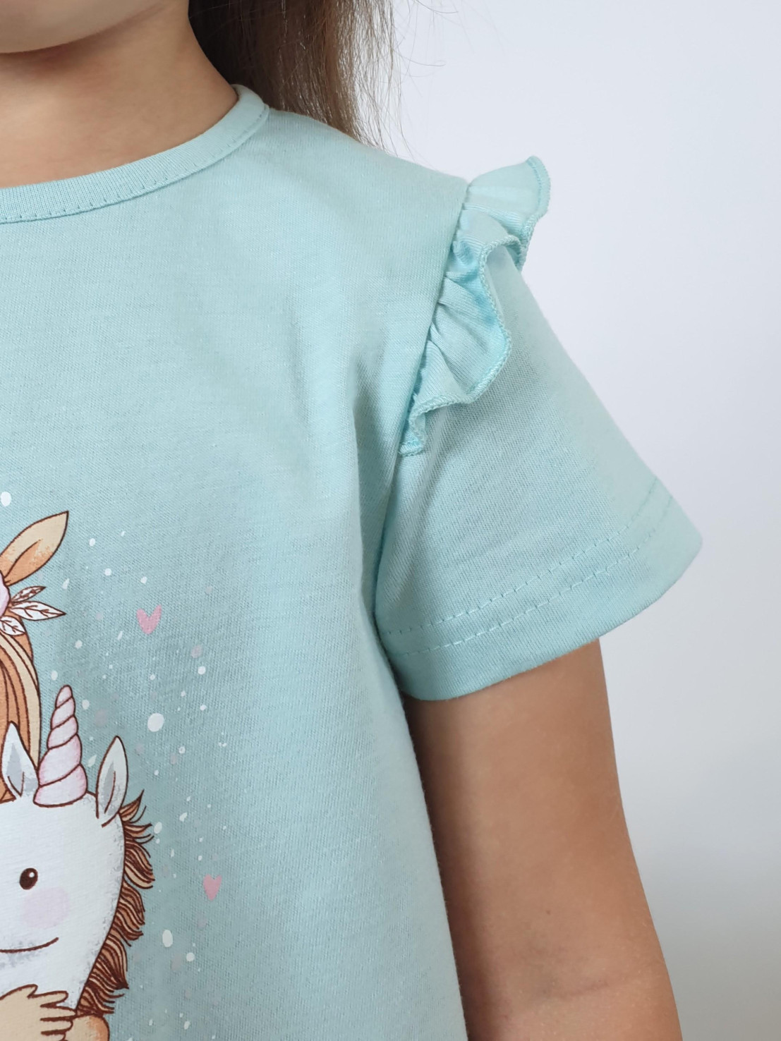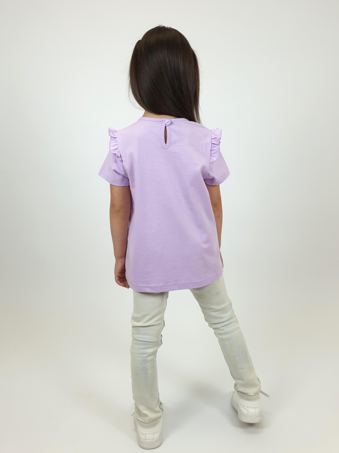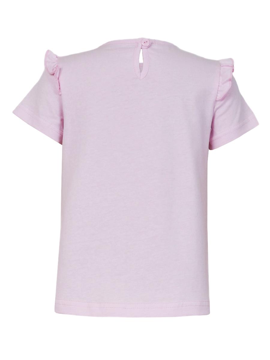 Кулирное полотно:100% х/б. Фуфайка-силуэт трапеция,короткий втачной рукав,в пройме рюша.Горловина окантована,застежка на пуговицу по спинке.Печать на переде.