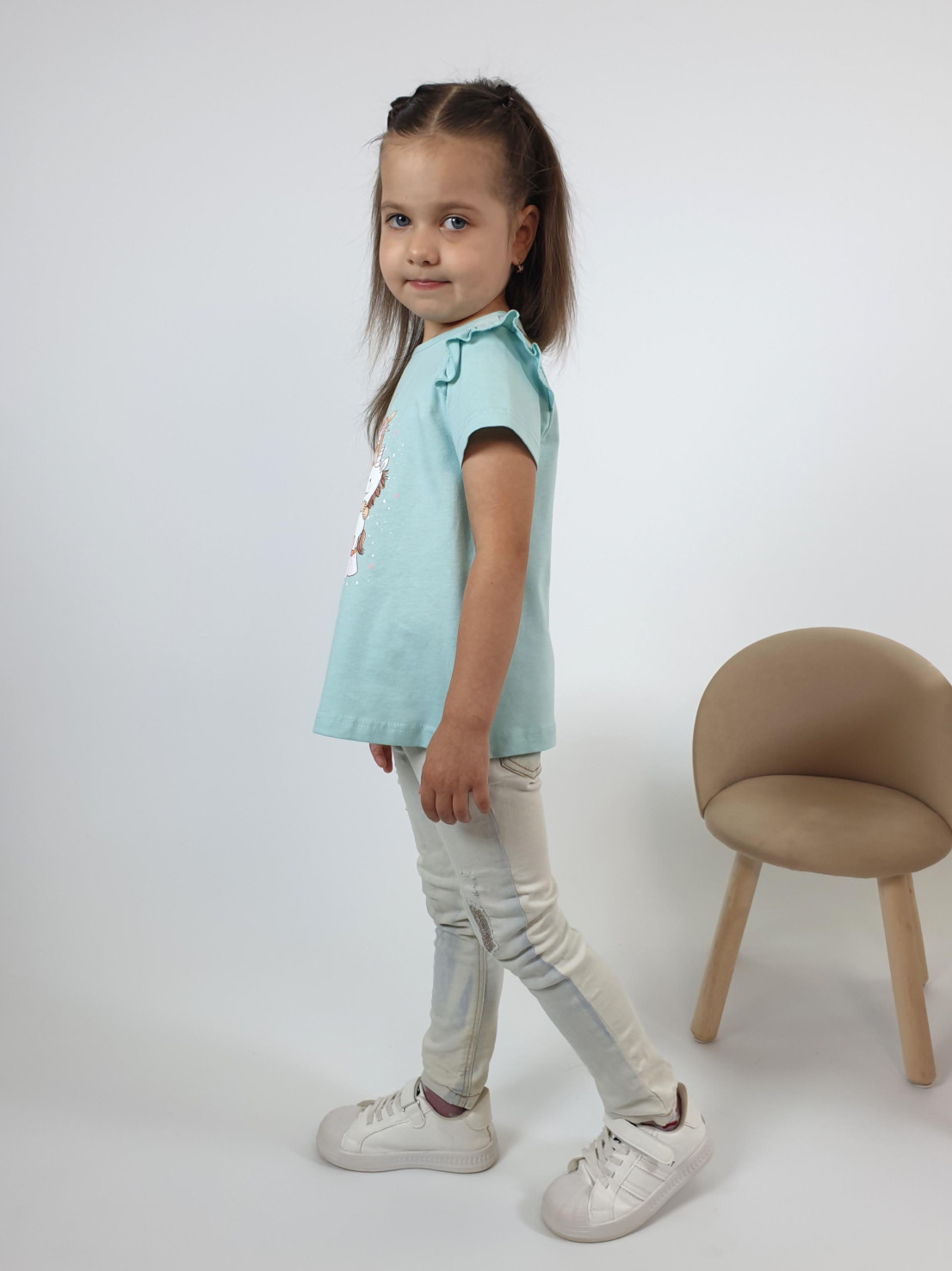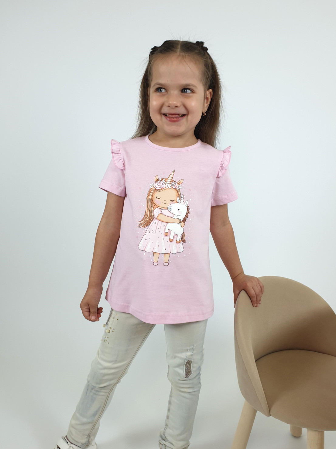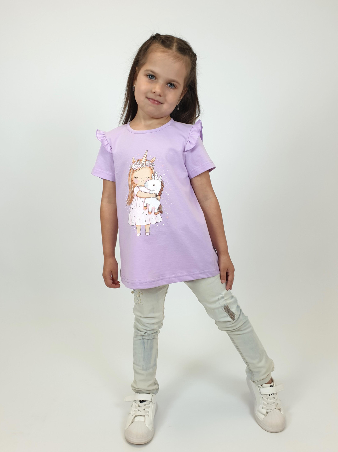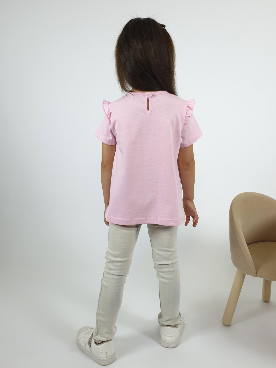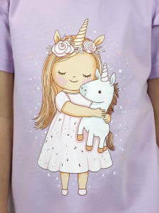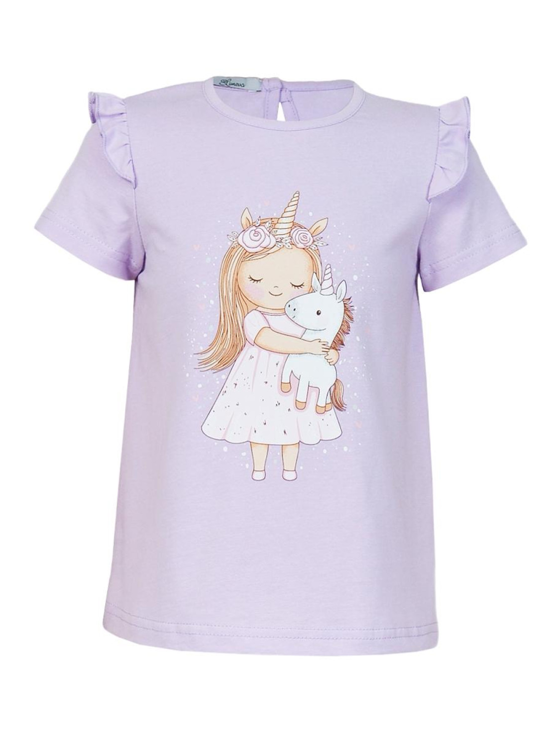 Кулирное полотно:100% х/б. Фуфайка-силуэт трапеция,короткий втачной рукав,в пройме рюша.Горловина окантована,застежка на пуговицу по спинке.Печать на переде.