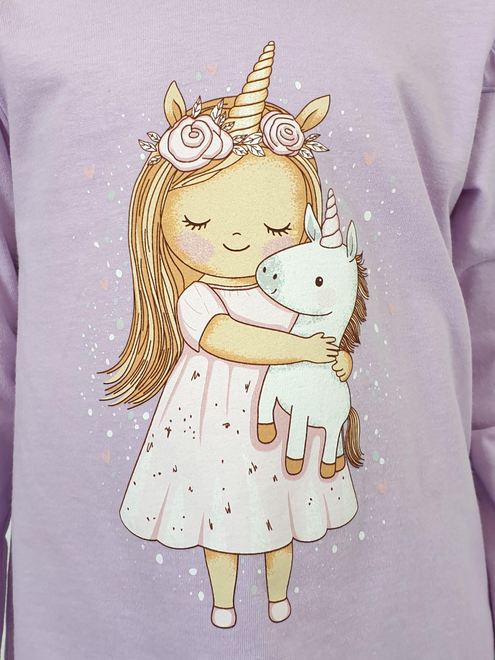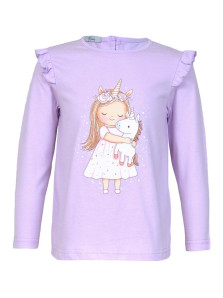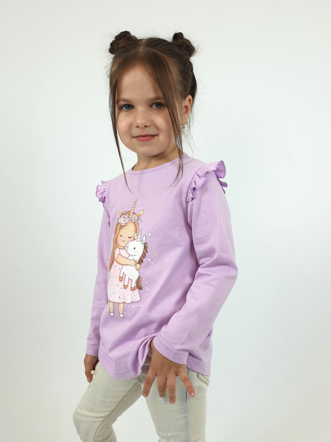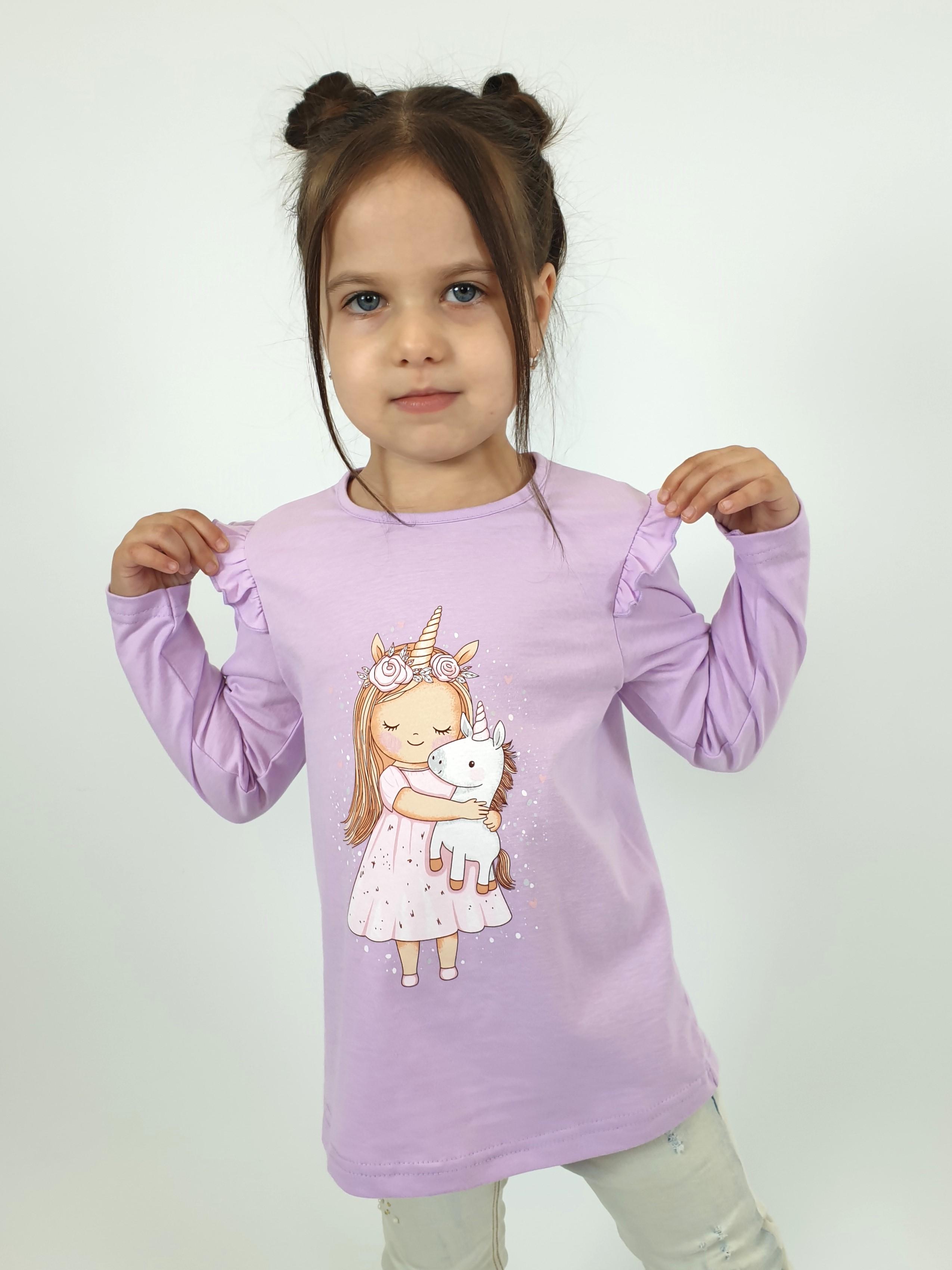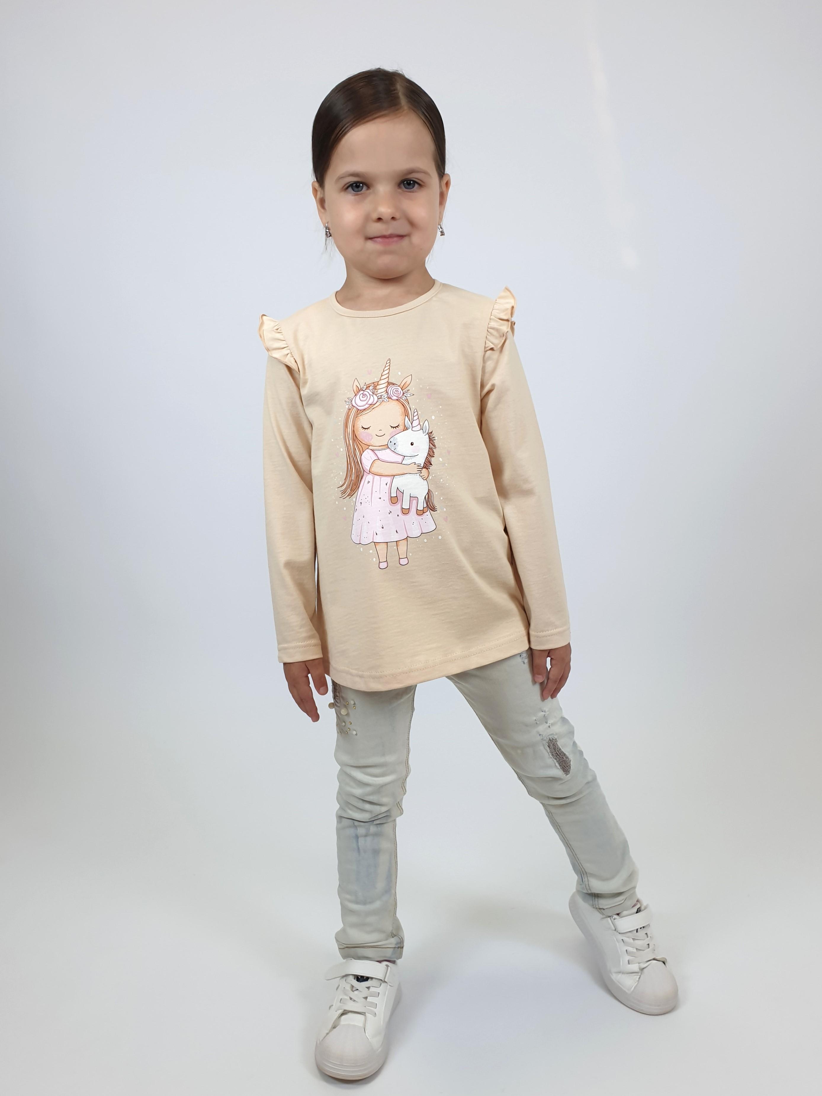 Кулирное полотно:100% х/б. Фуфайка-силуэт трапеция,длинный втачной рукав,в пройме рюша.Горловина окантована,застежка на пуговицу по спинке.Печать на переде.