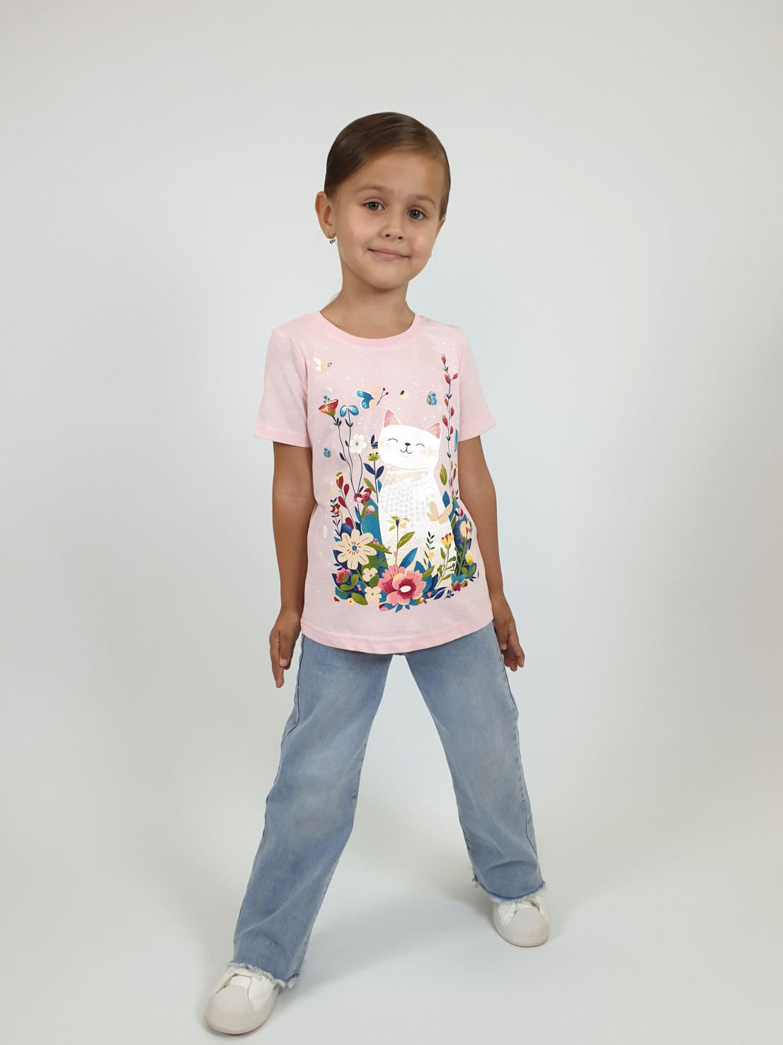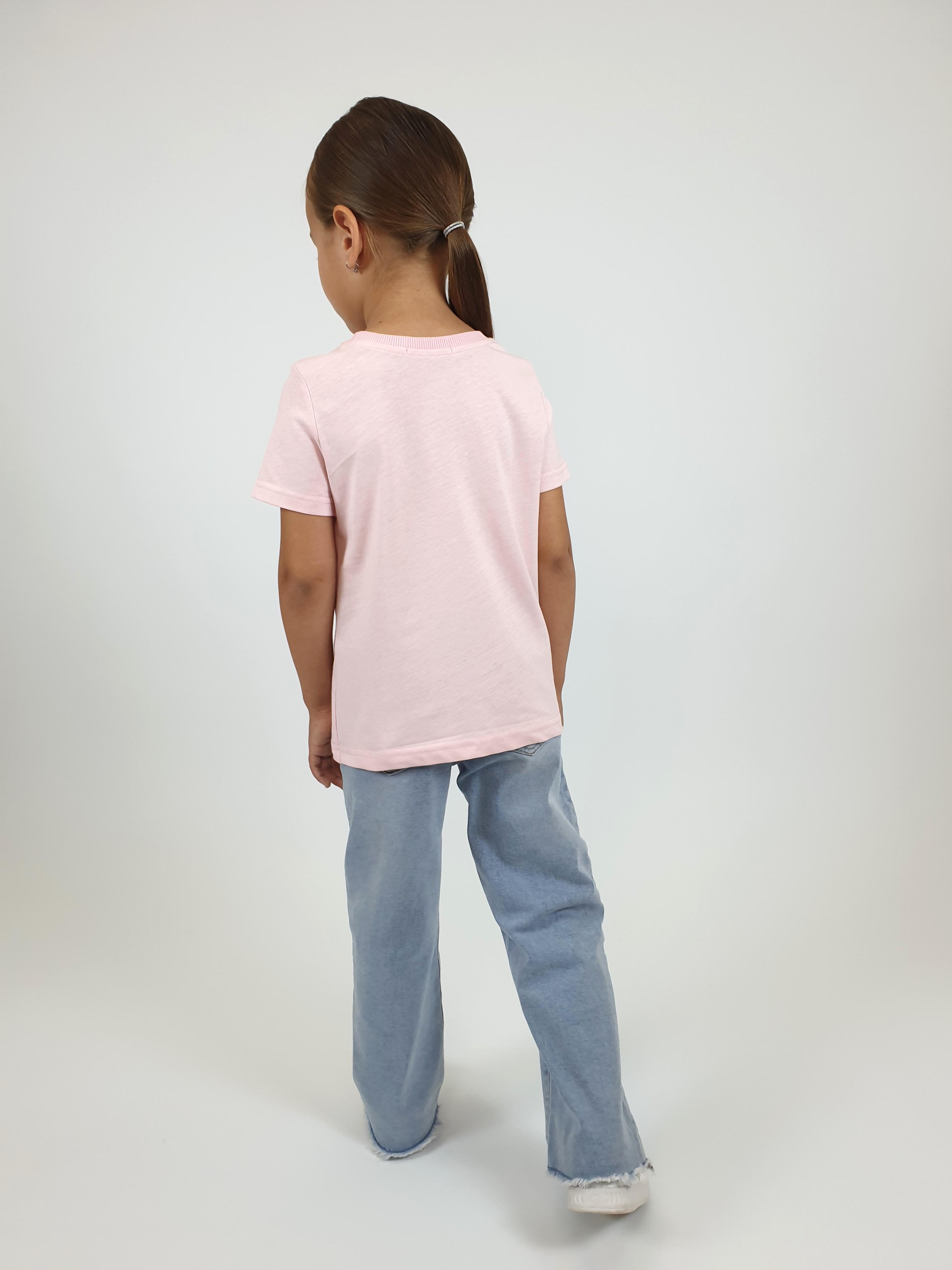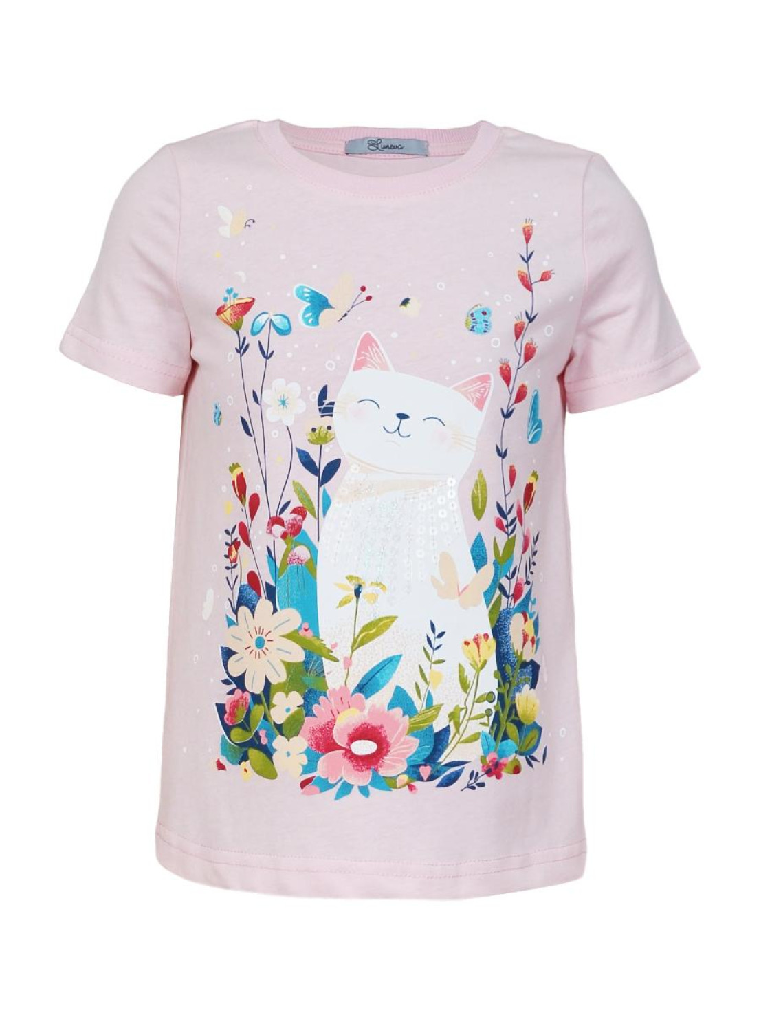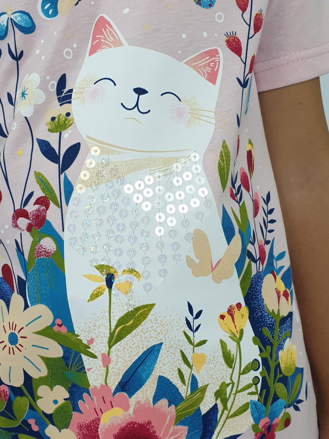 Кулирное полотно:100% х/б. Фуфайка-прямой силуэт,печать и вышивка(пайетки) на переде,короткий втачной рукав.Низ рукава и фуфайки подшит.Горловина обработана ластиком.