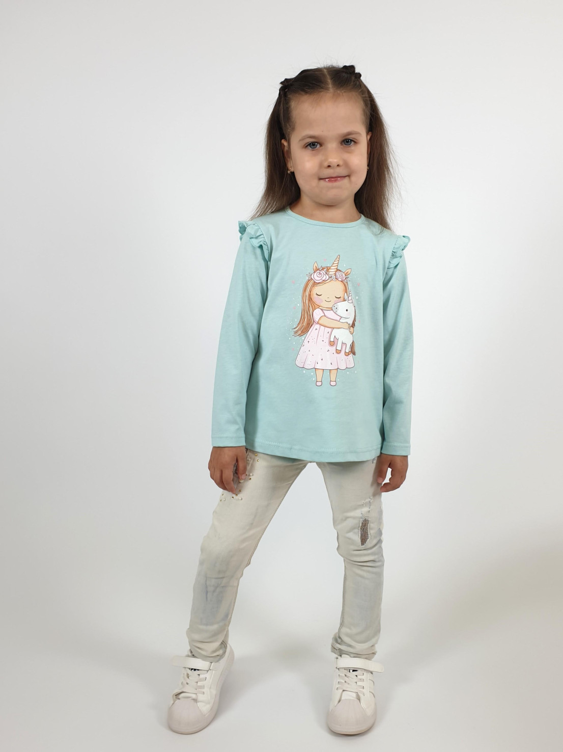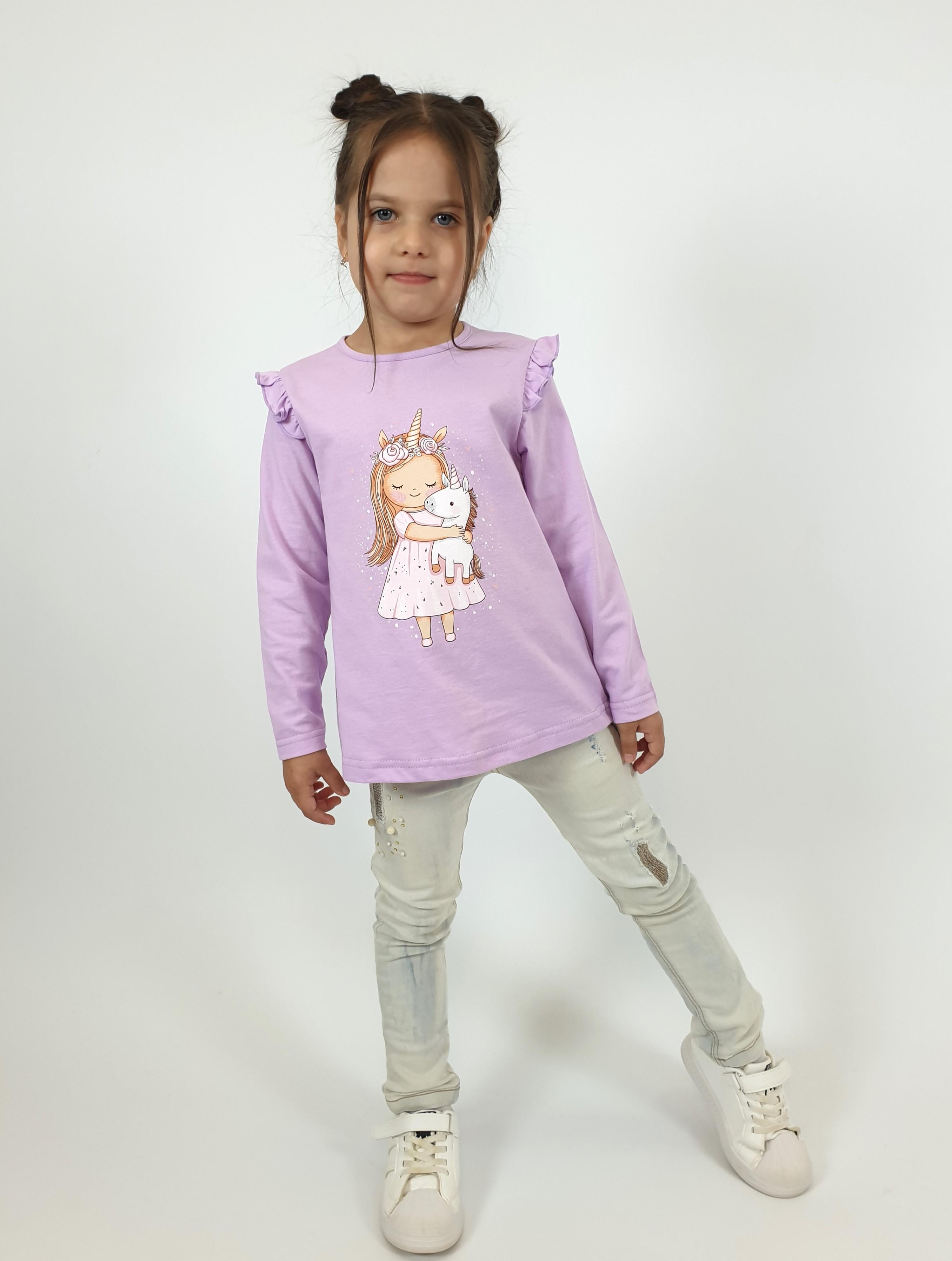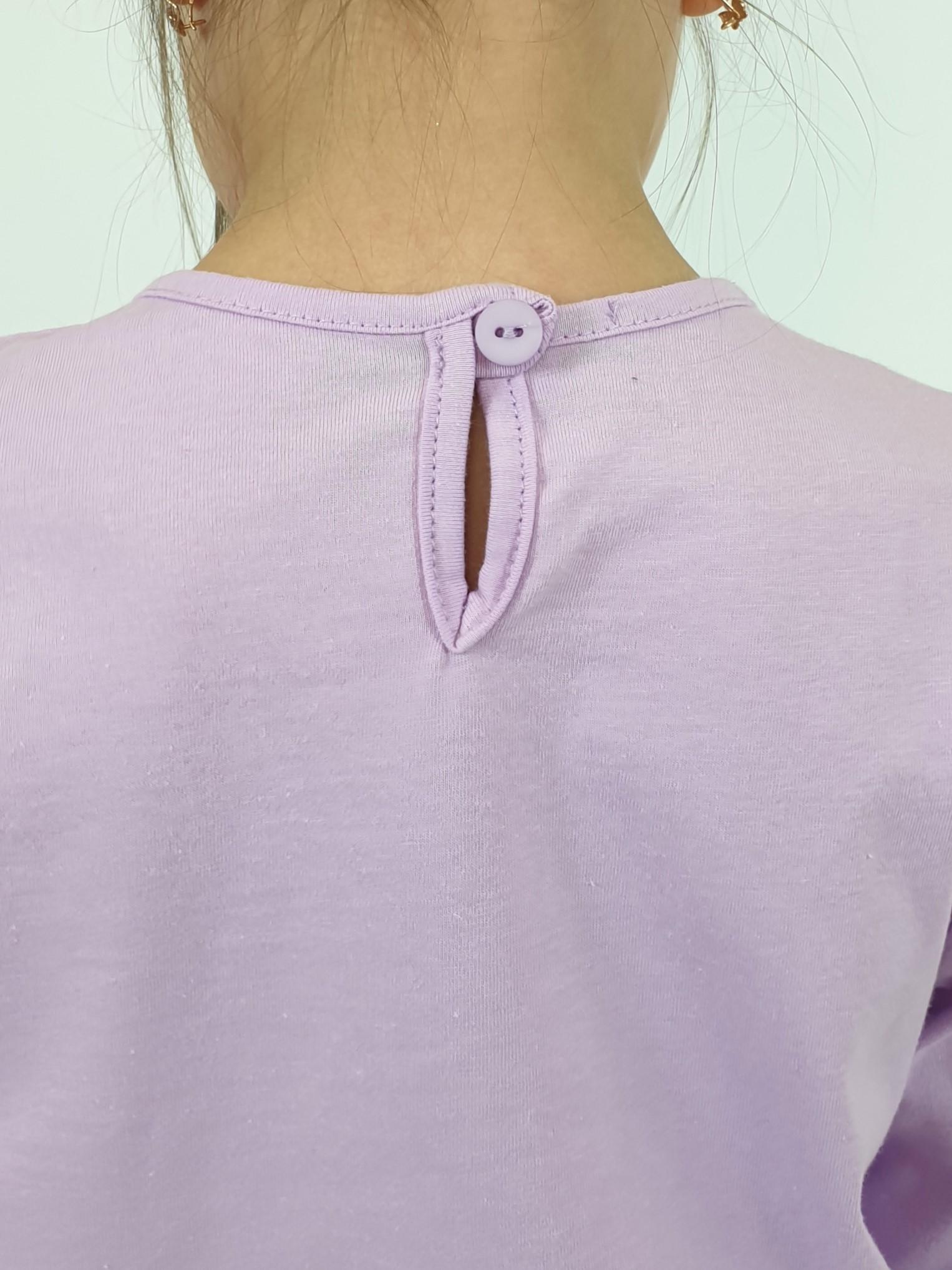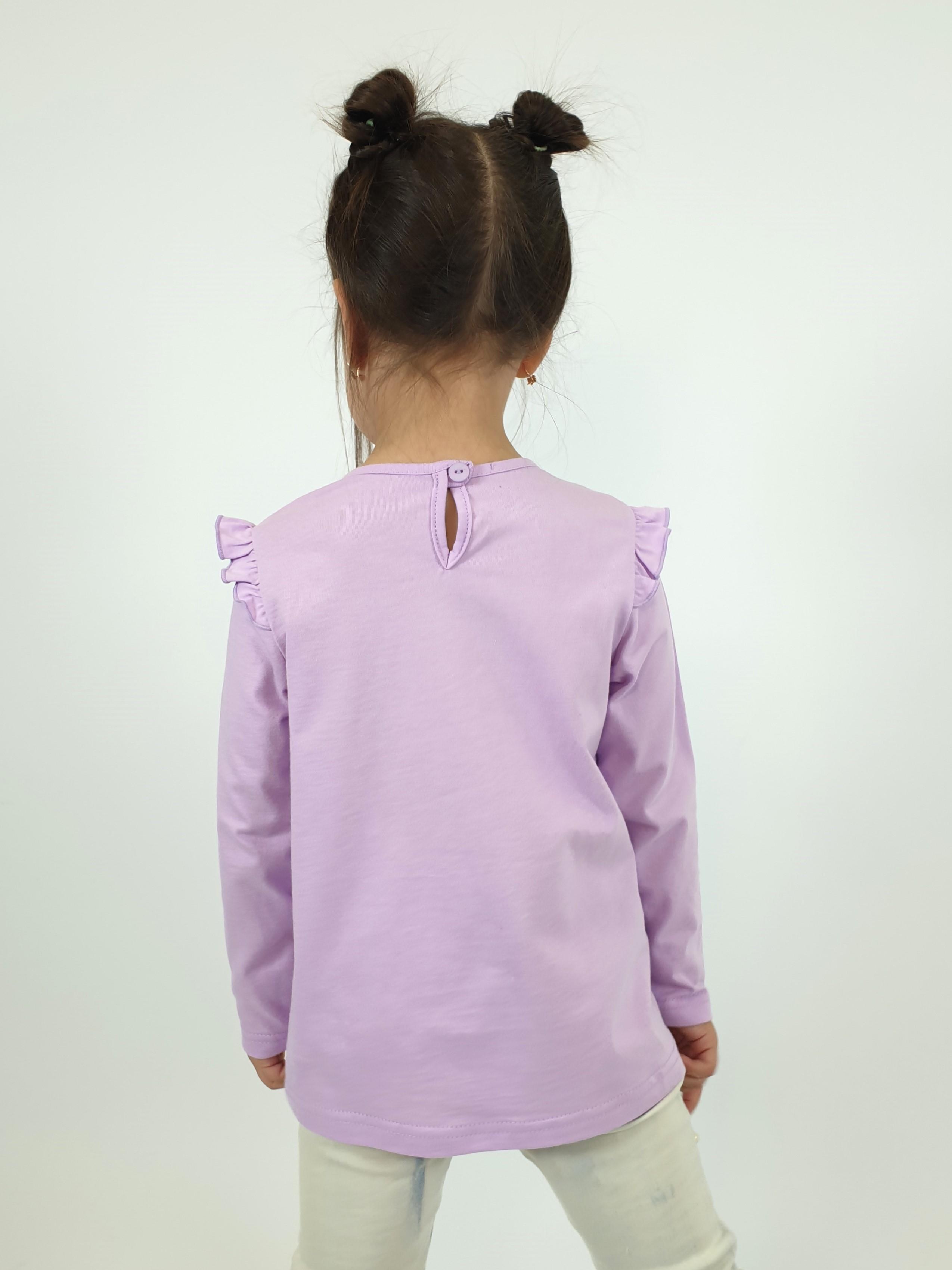 Кулирное полотно:100% х/б. Фуфайка-силуэт трапеция,длинный втачной рукав,в пройме рюша.Горловина окантована,застежка на пуговицу по спинке.Печать на переде.