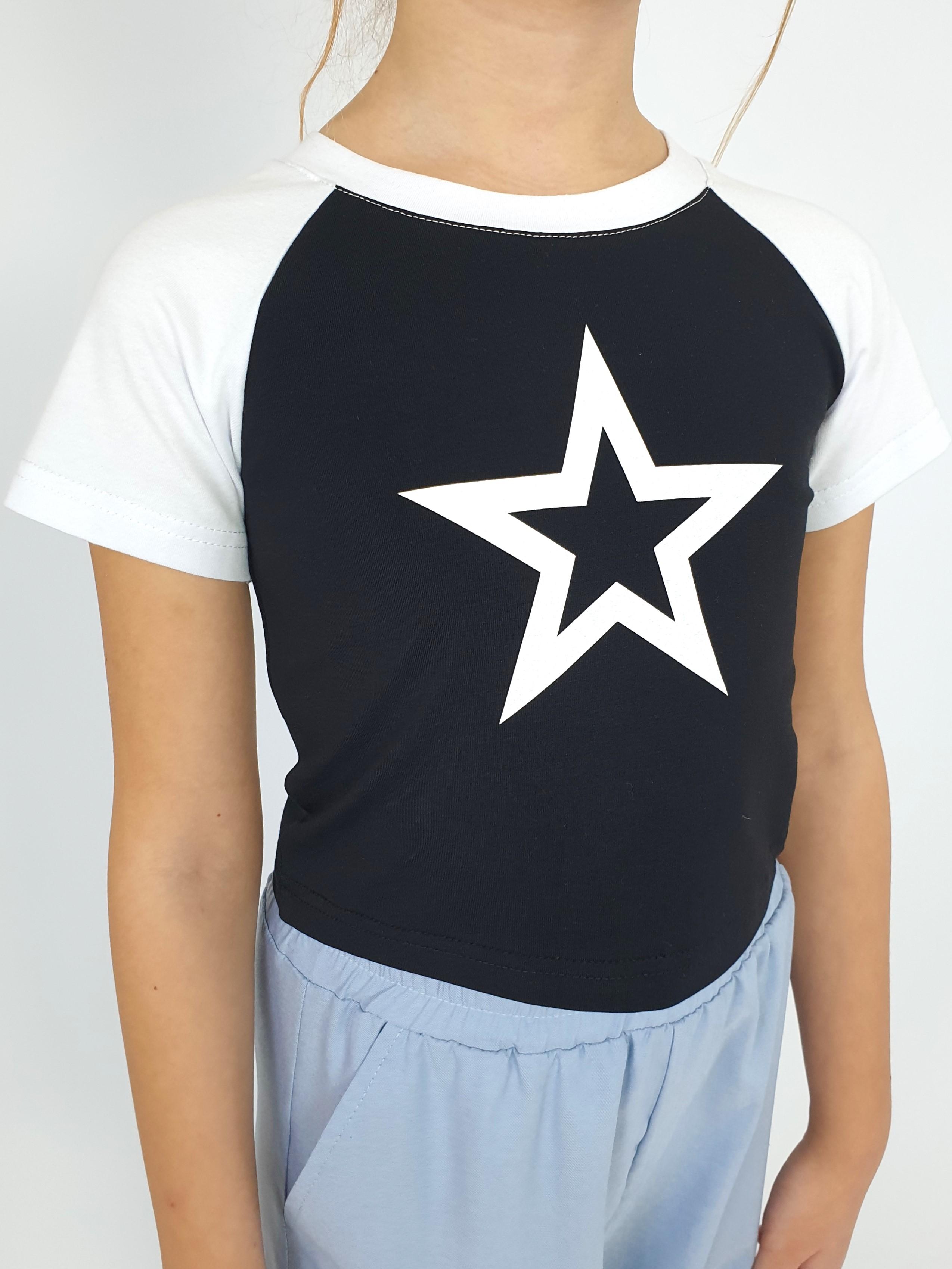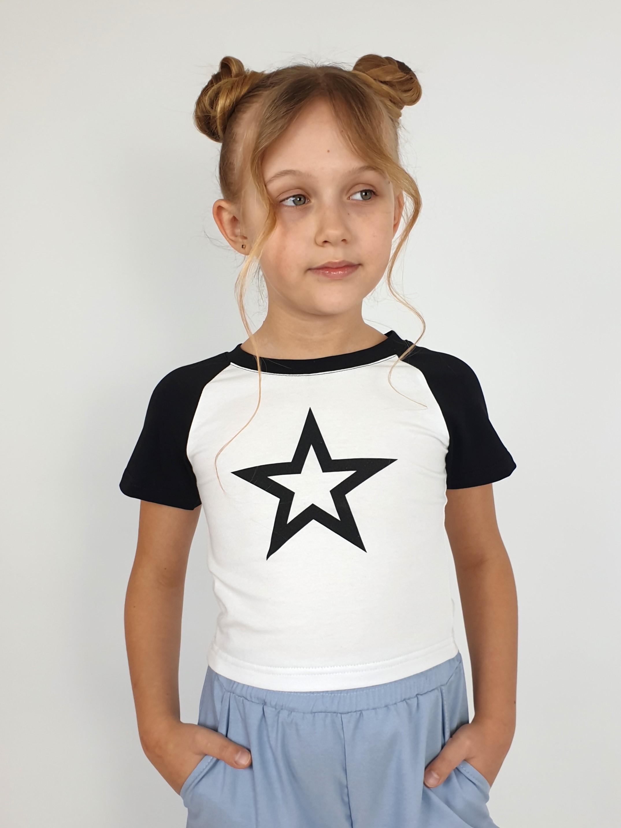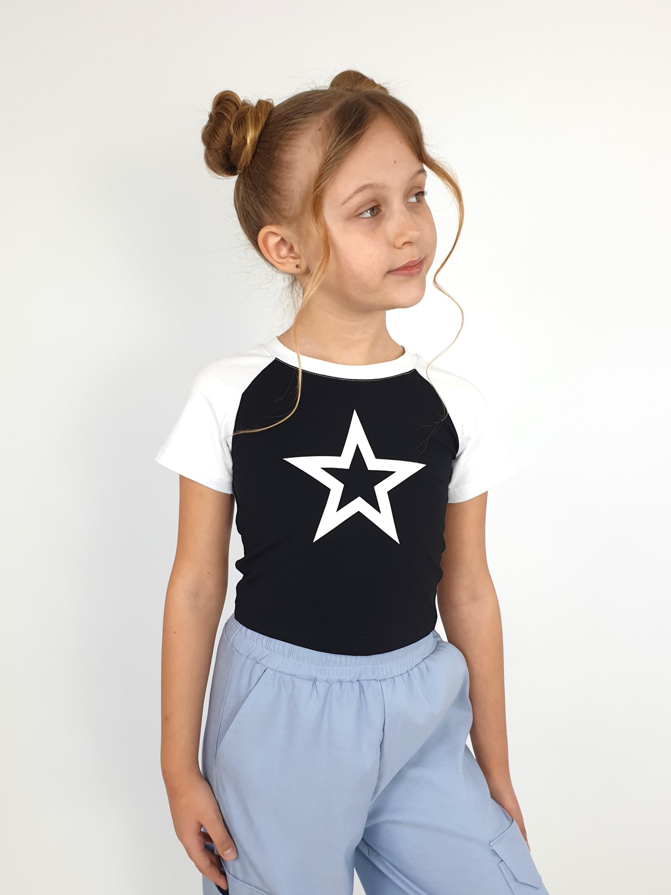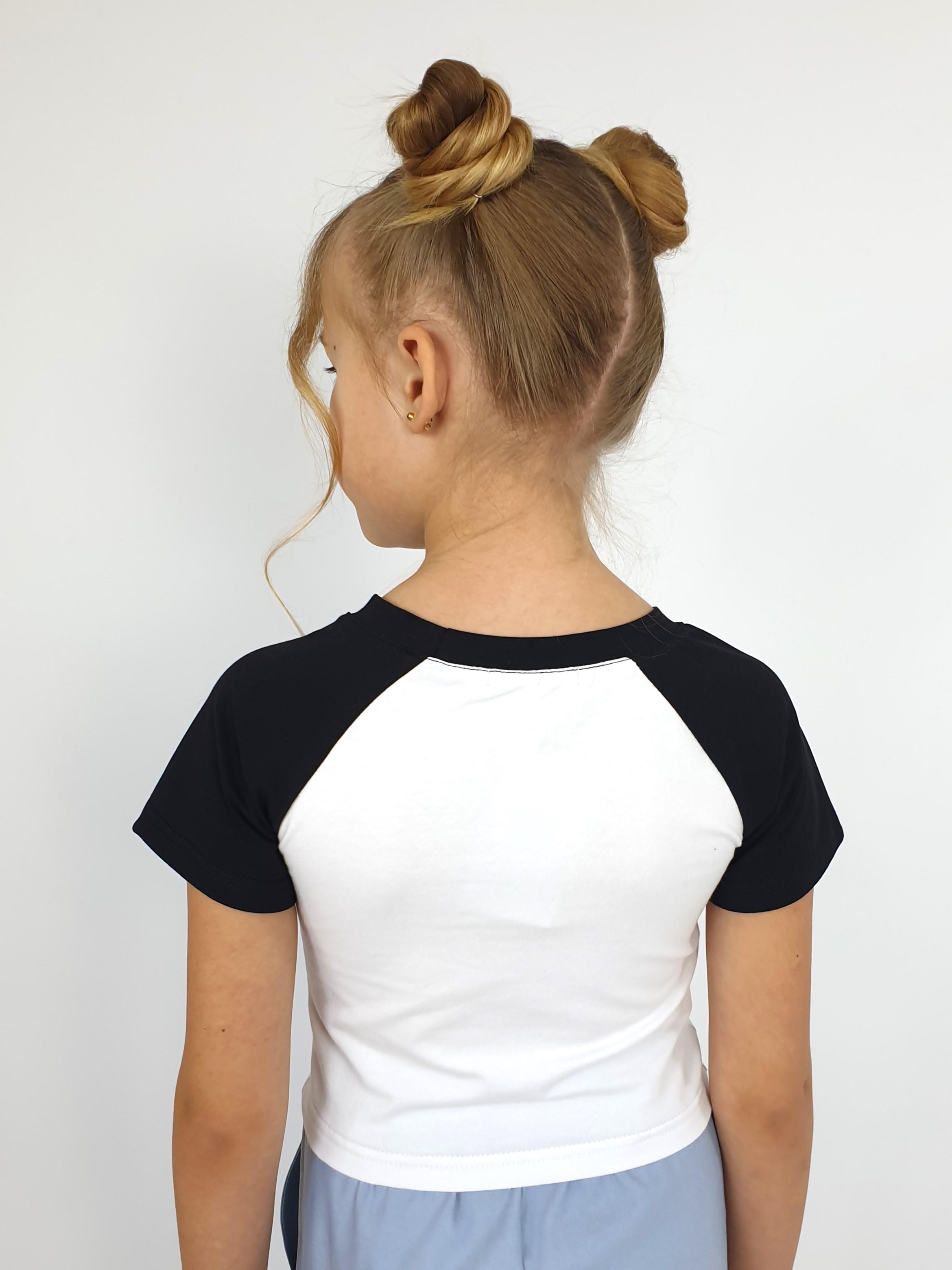 Кулирное полотно: 95% х/б,5% лайкра. Фуфайка-укороченная с коротким рукавом реглан.Горловина обработана планкой.Низ изделия подшит.Печать на переде.