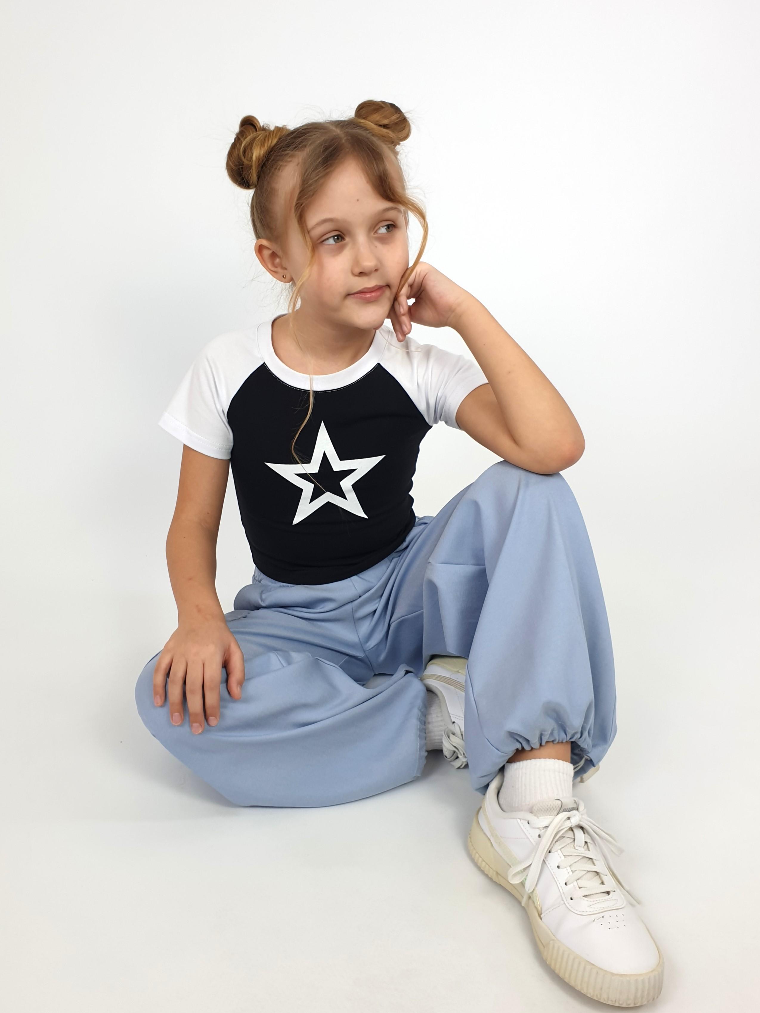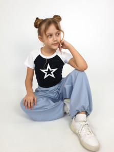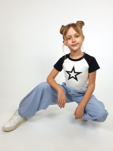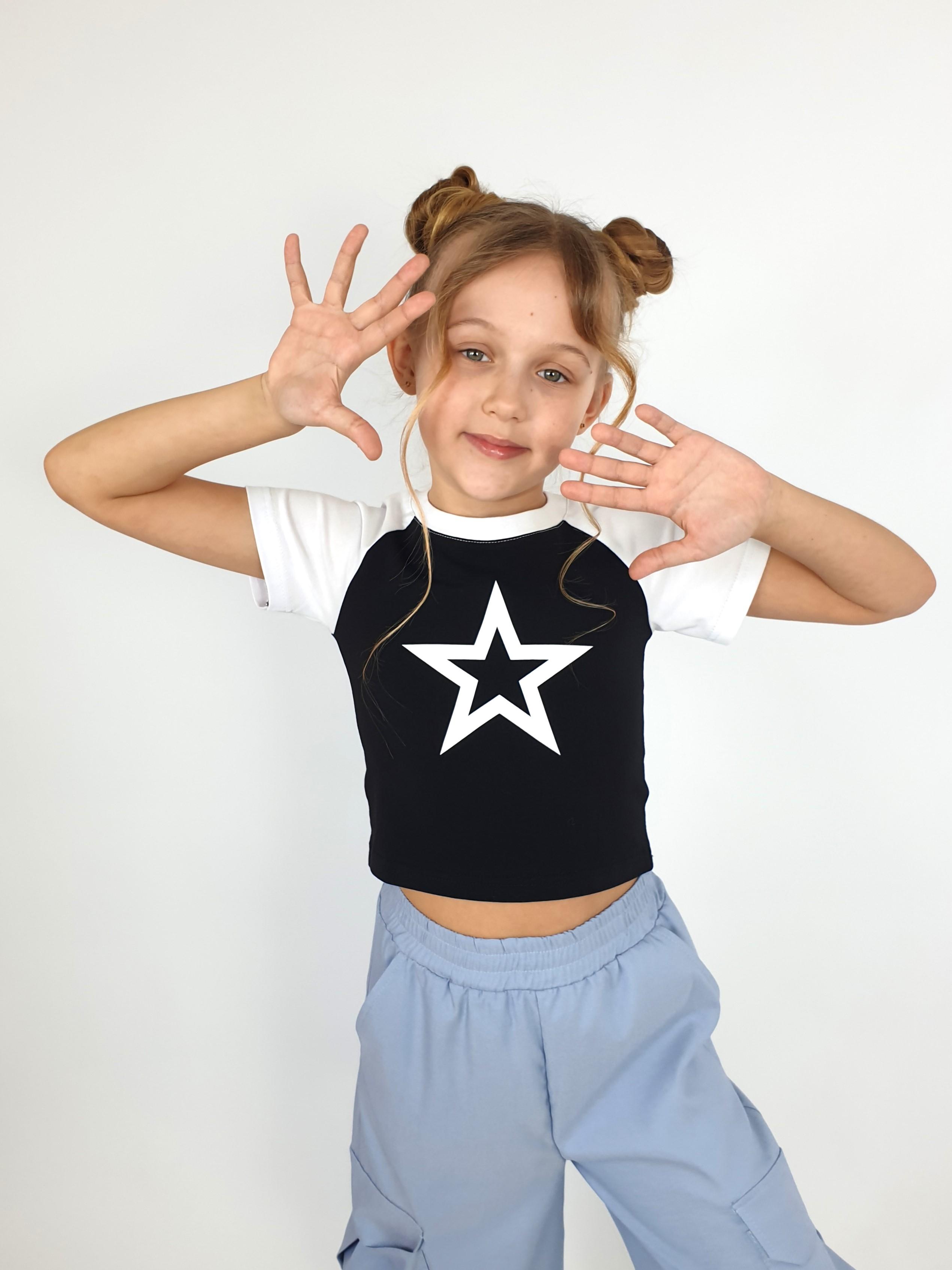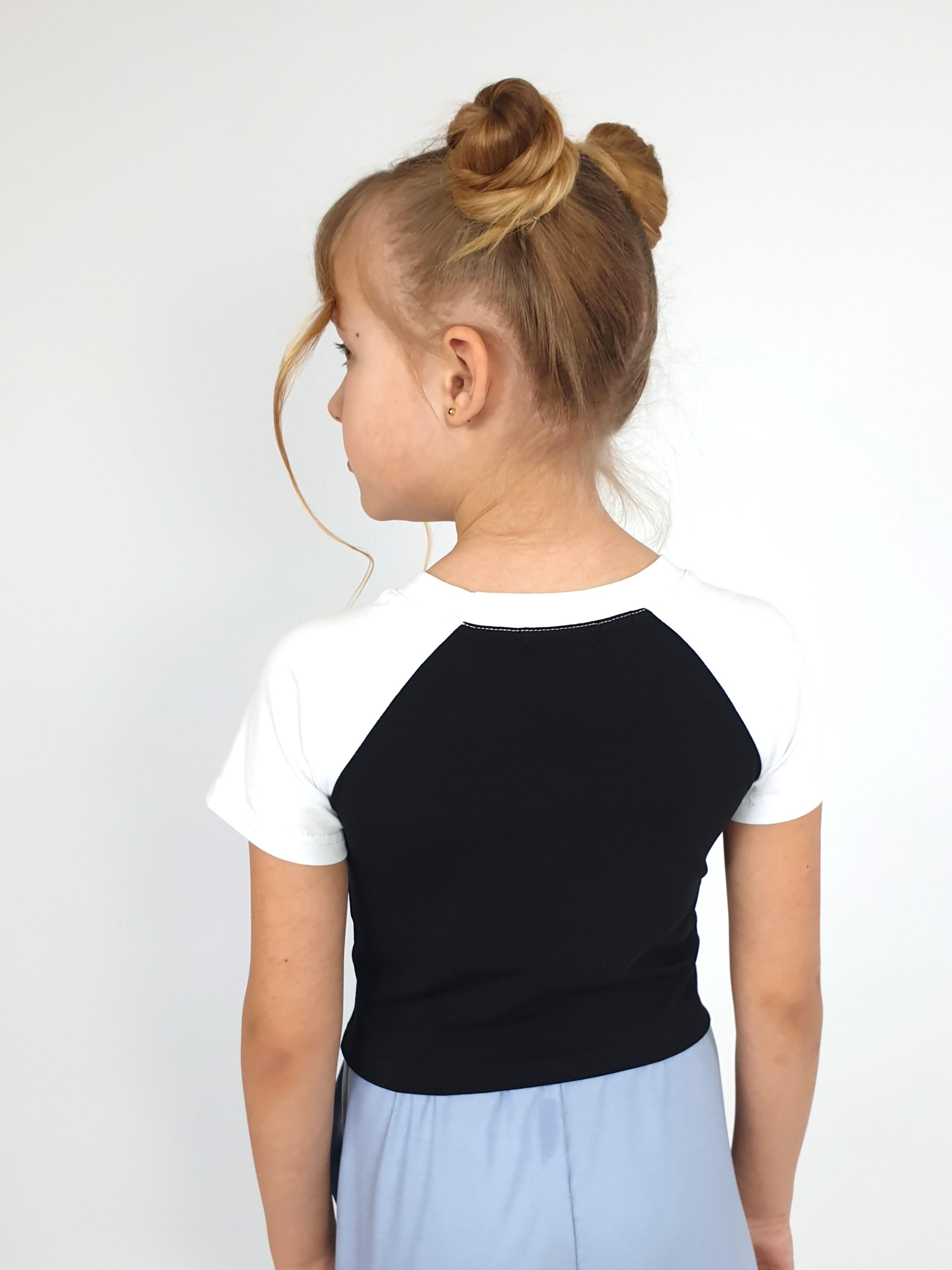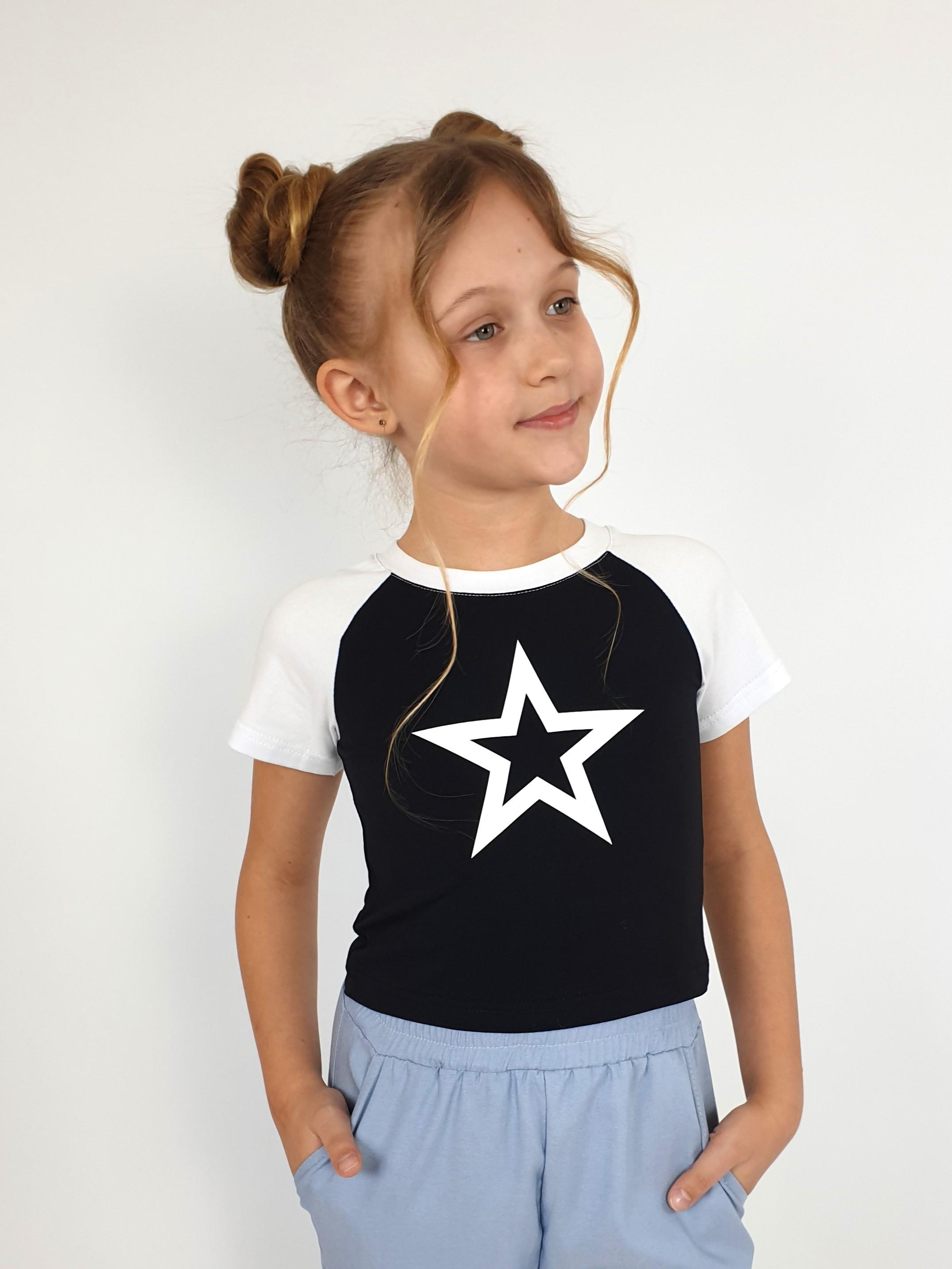Кулирное полотно: 95% х/б,5% лайкра. Фуфайка-укороченная с коротким рукавом реглан.Горловина обработана планкой.Низ изделия подшит.Печать на переде.