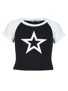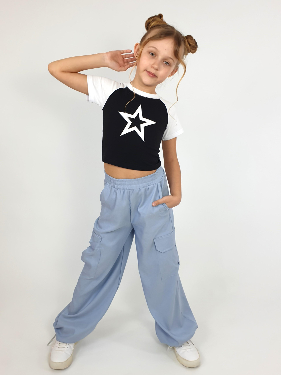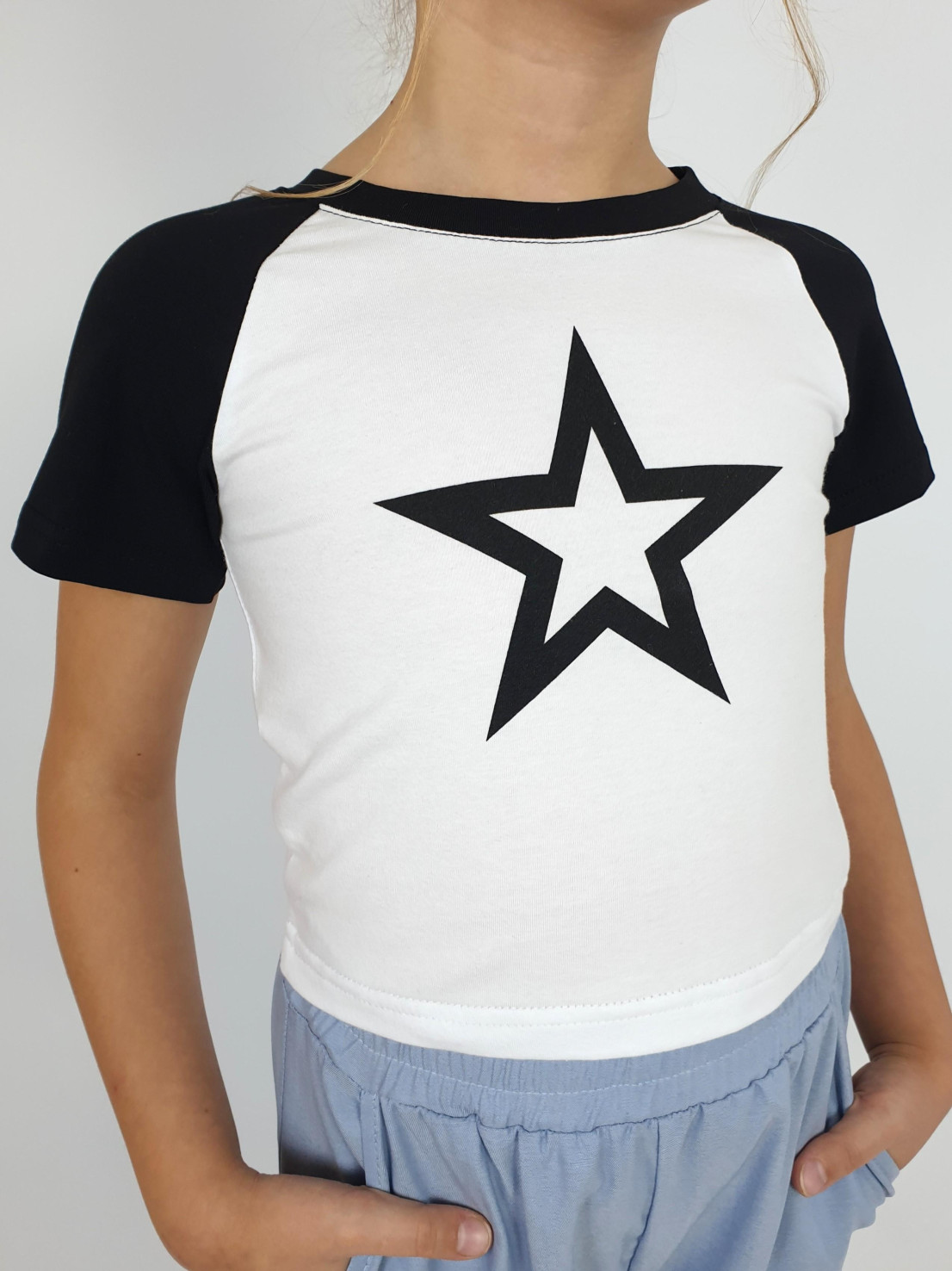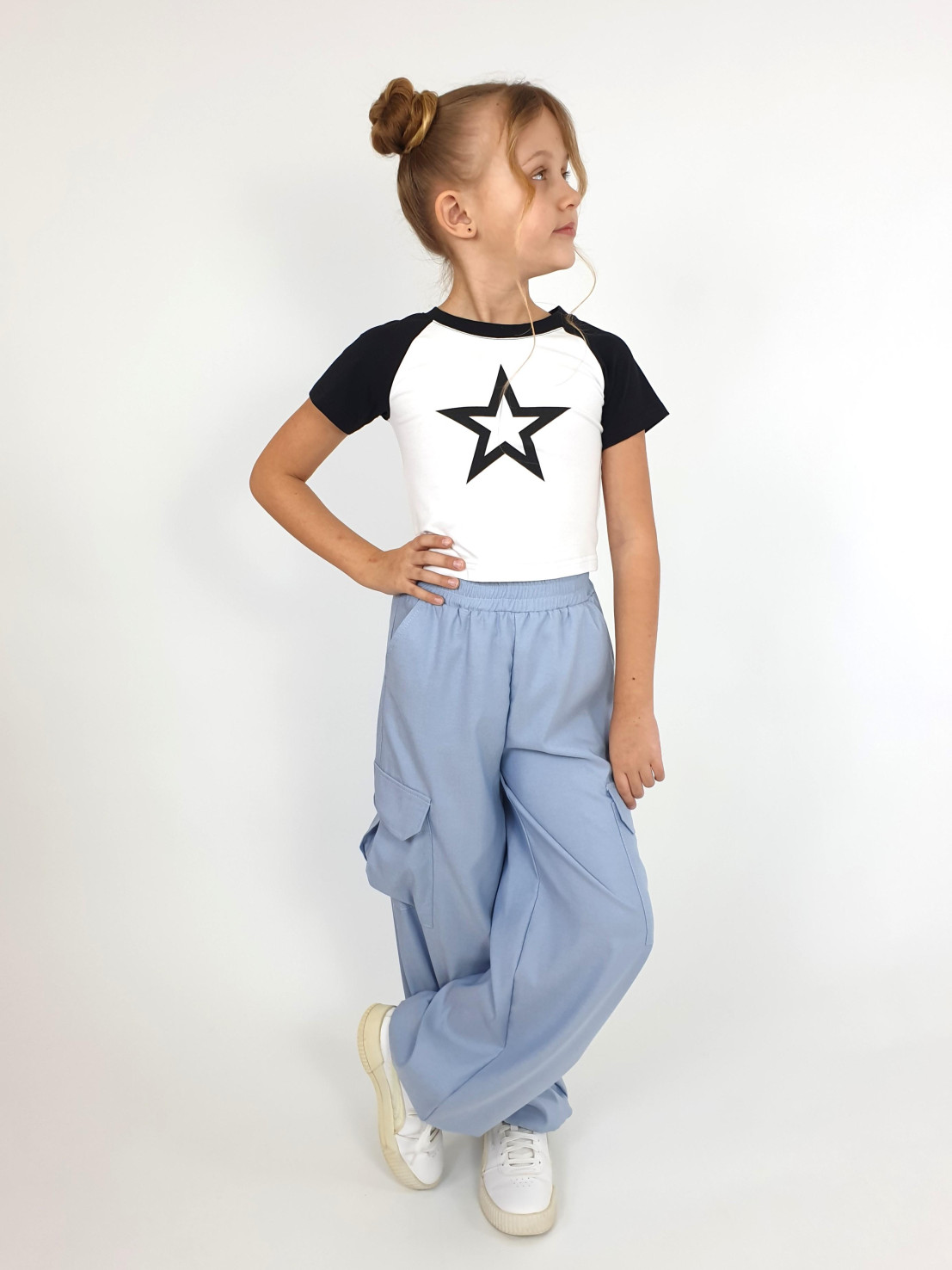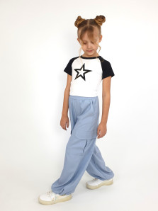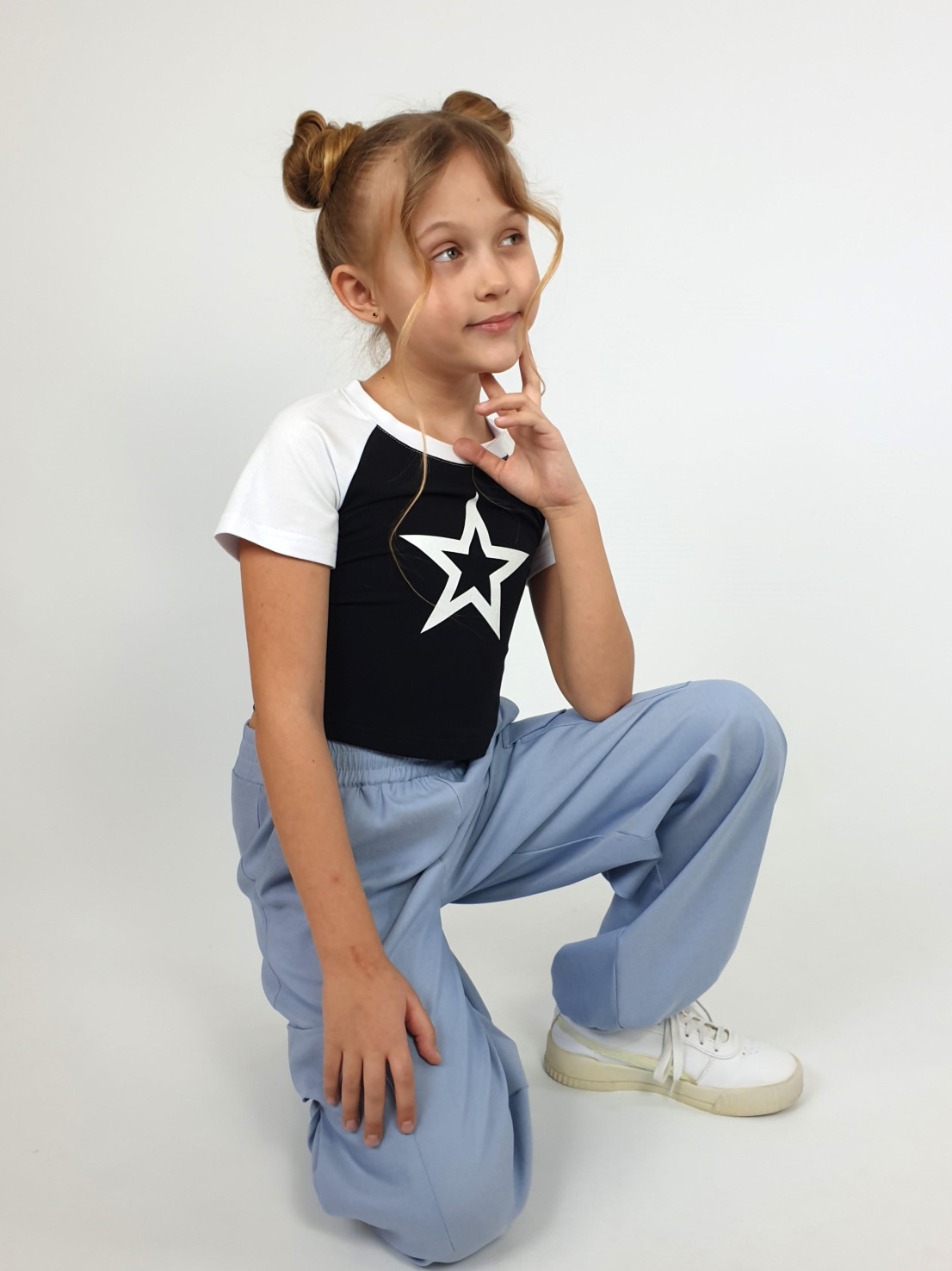 Кулирное полотно: 95% х/б,5% лайкра. Фуфайка-укороченная с коротким рукавом реглан.Горловина обработана планкой.Низ изделия подшит.Печать на переде.