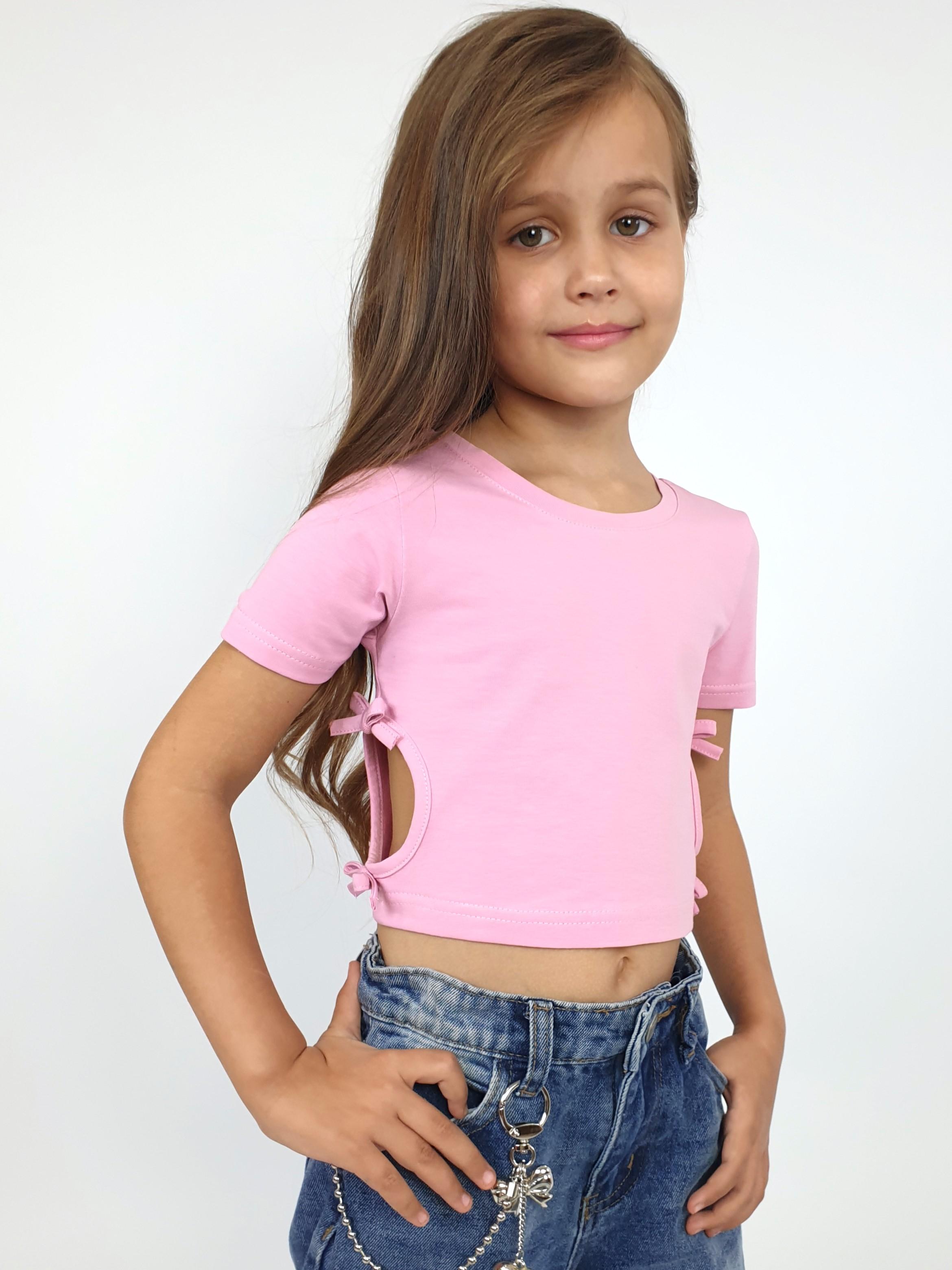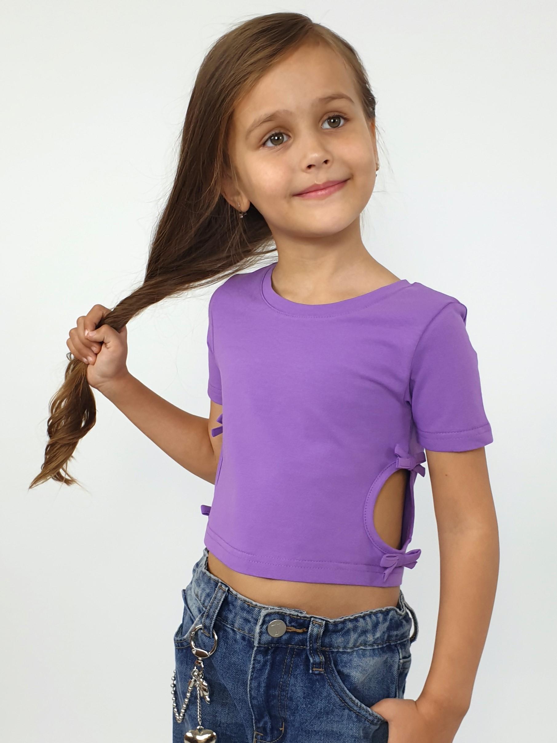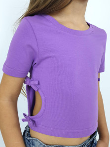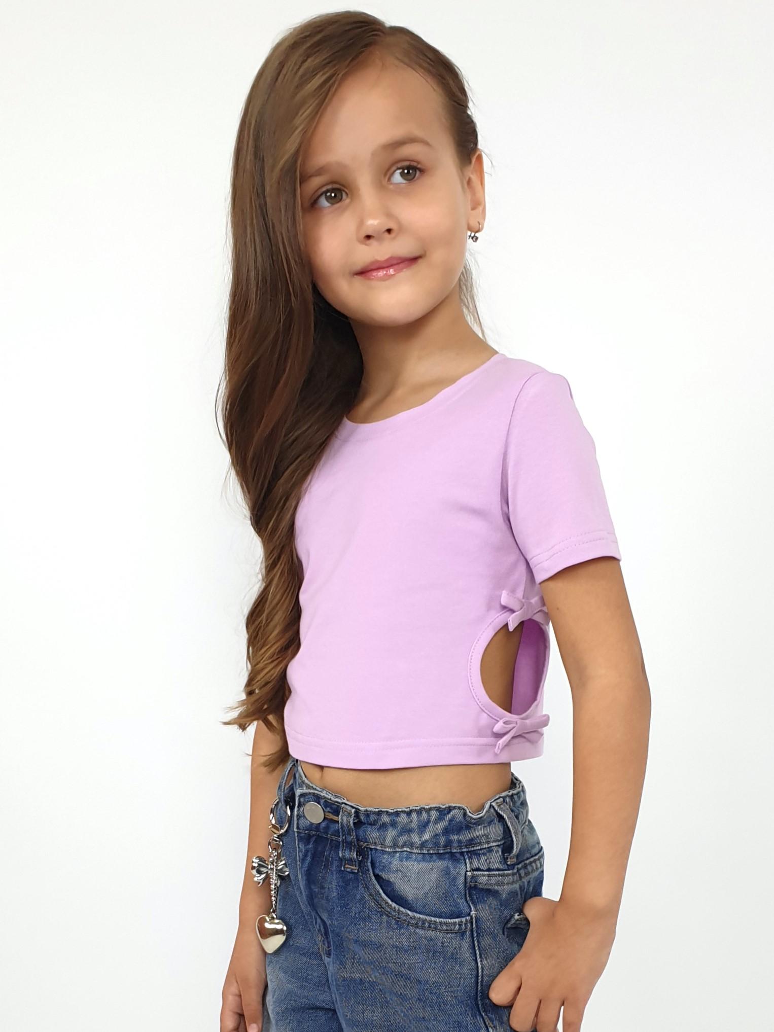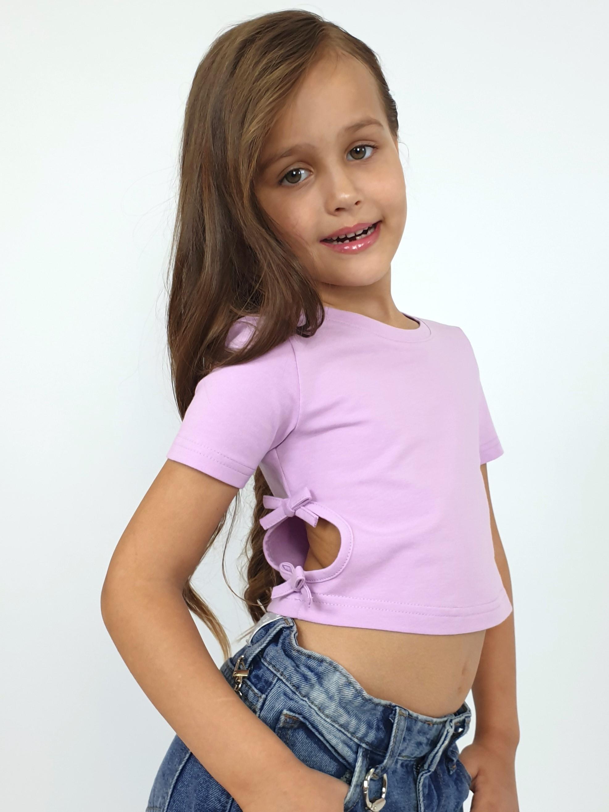 Кулирное полотно: 95% х/б,5% лайкра. Фуфайка-приталенный силуэт,короткий втачной рукав.Низ рукава и фуфайки подшит.Горловина обработана планкой.Вырезы и отделочные бантики в боковых швах.