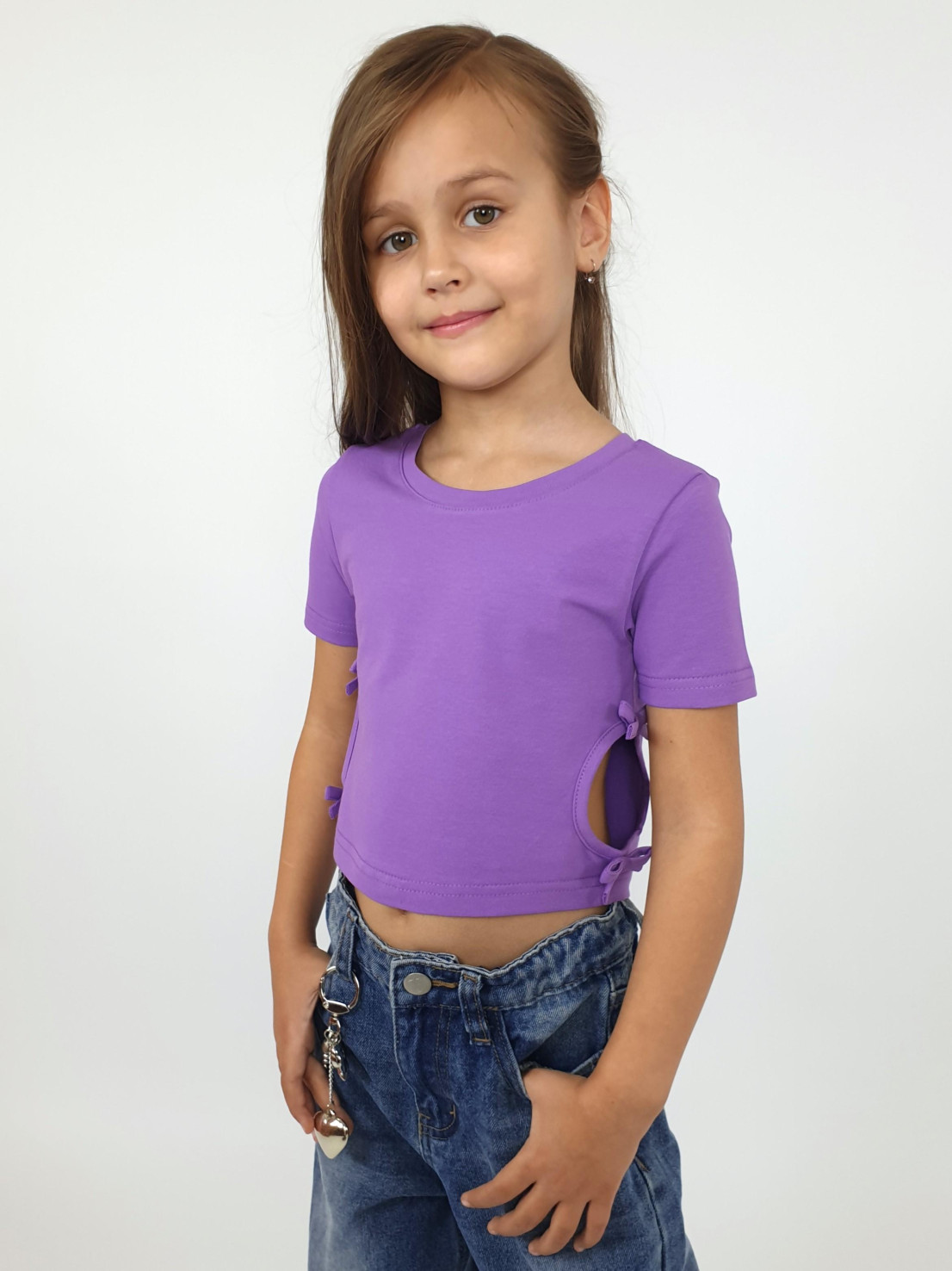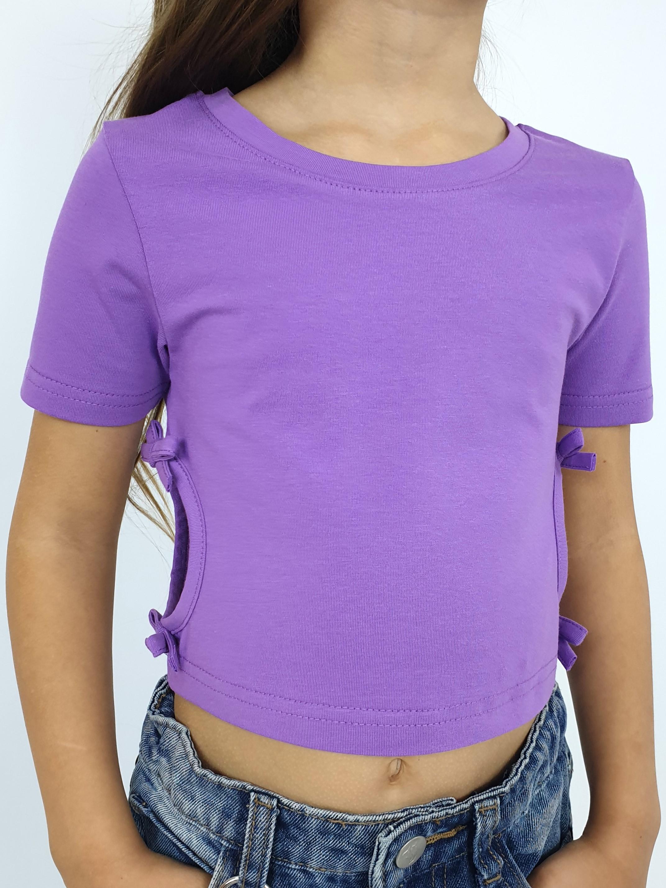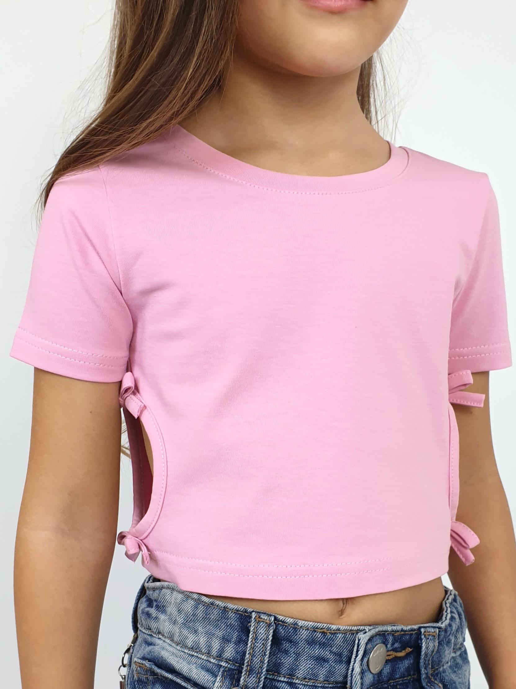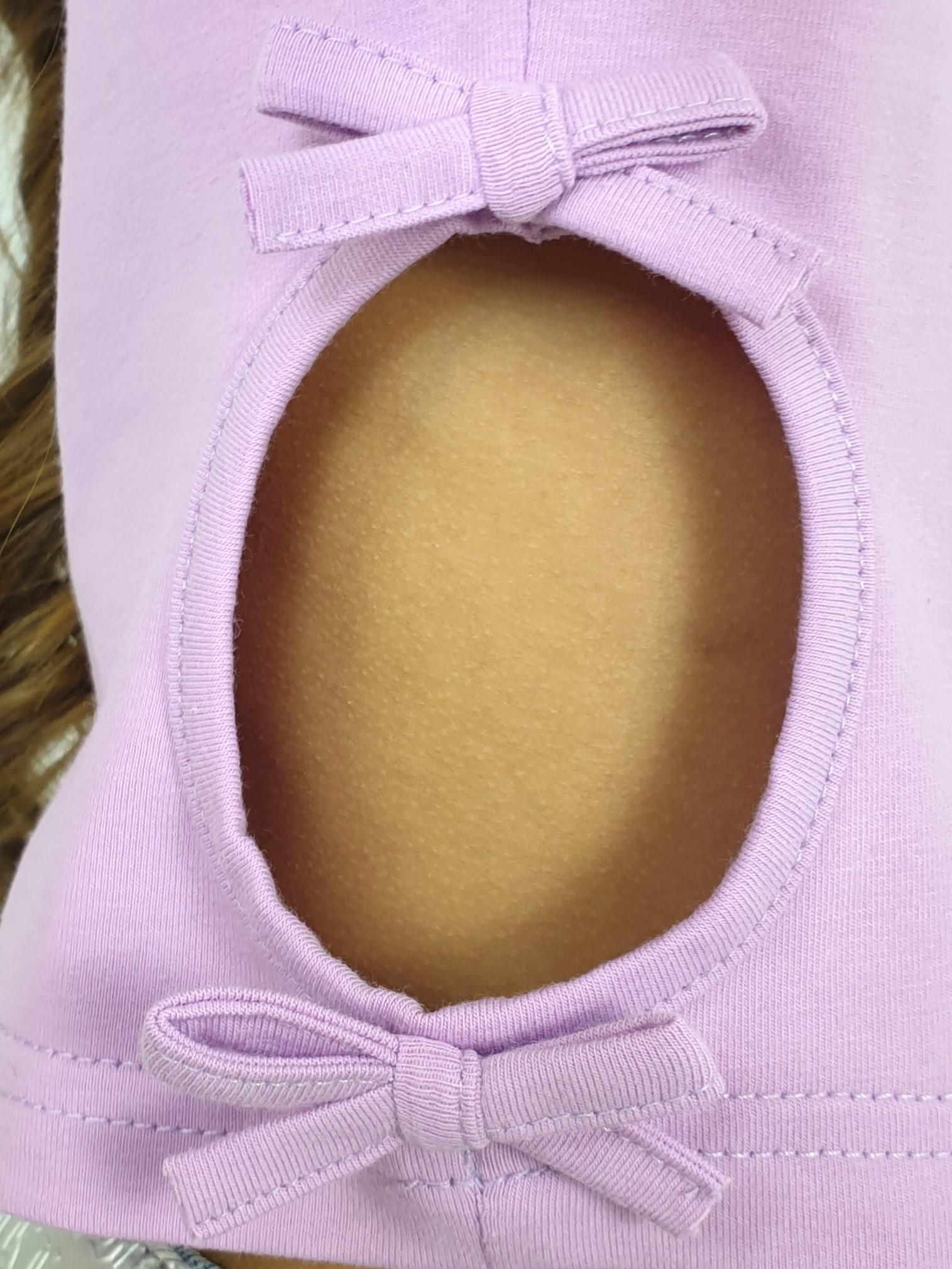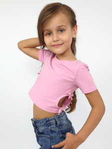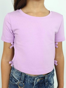 Кулирное полотно: 95% х/б,5% лайкра. Фуфайка-приталенный силуэт,короткий втачной рукав.Низ рукава и фуфайки подшит.Горловина обработана планкой.Вырезы и отделочные бантики в боковых швах.