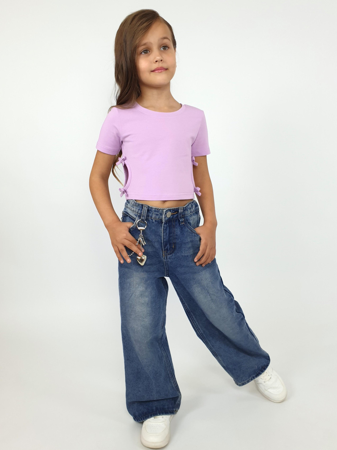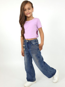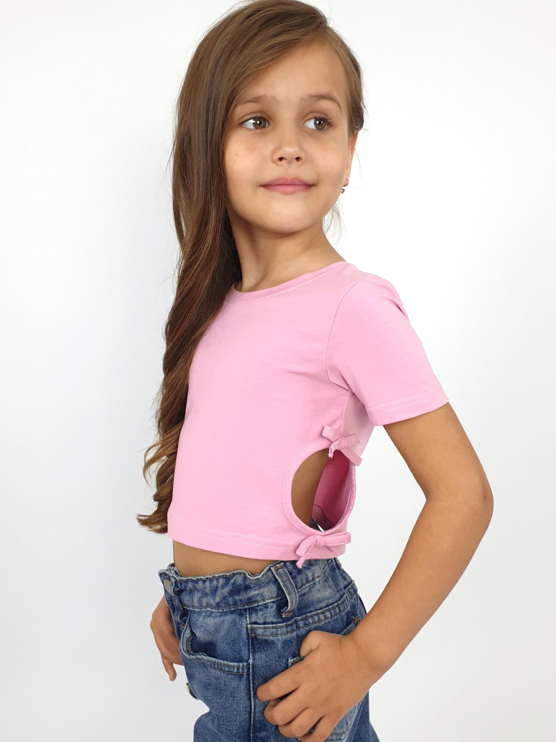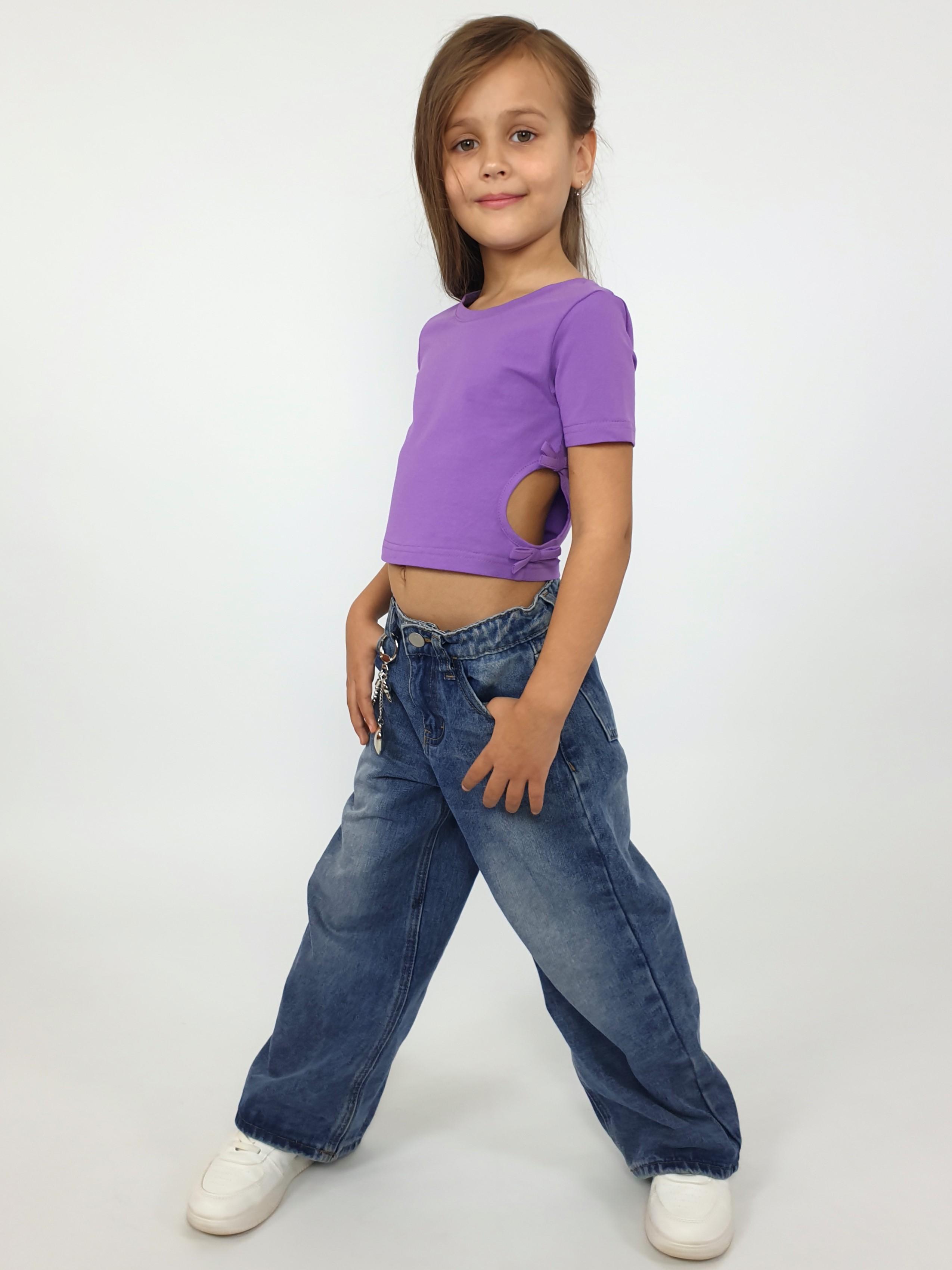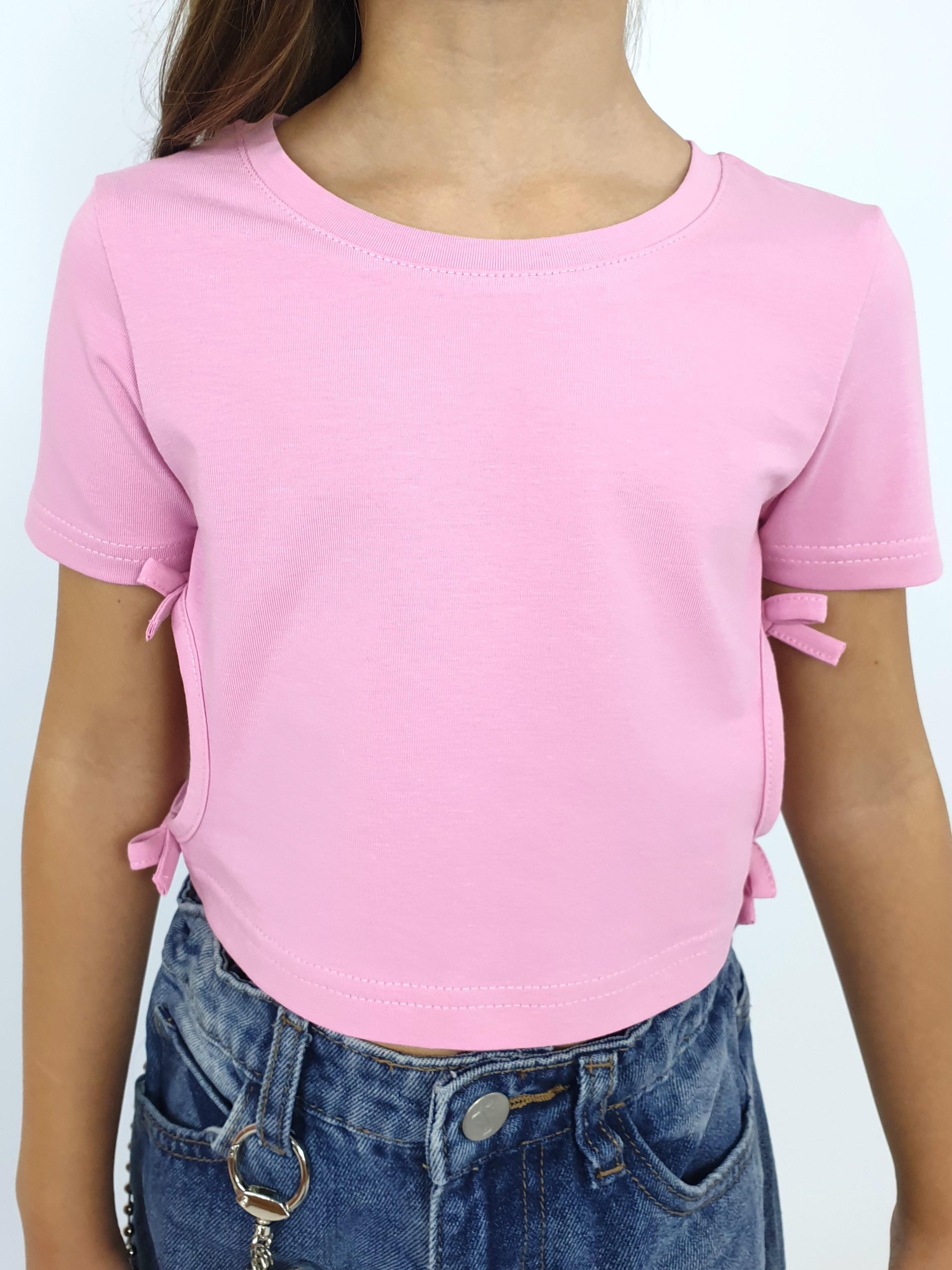Кулирное полотно: 95% х/б,5% лайкра. Фуфайка-приталенный силуэт,короткий втачной рукав.Низ рукава и фуфайки подшит.Горловина обработана планкой.Вырезы и отделочные бантики в боковых швах.