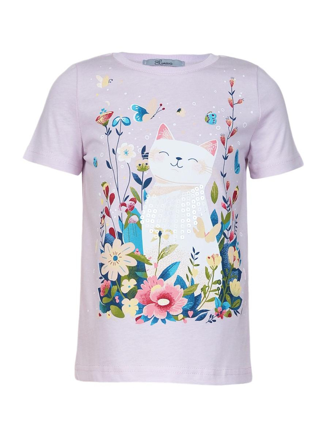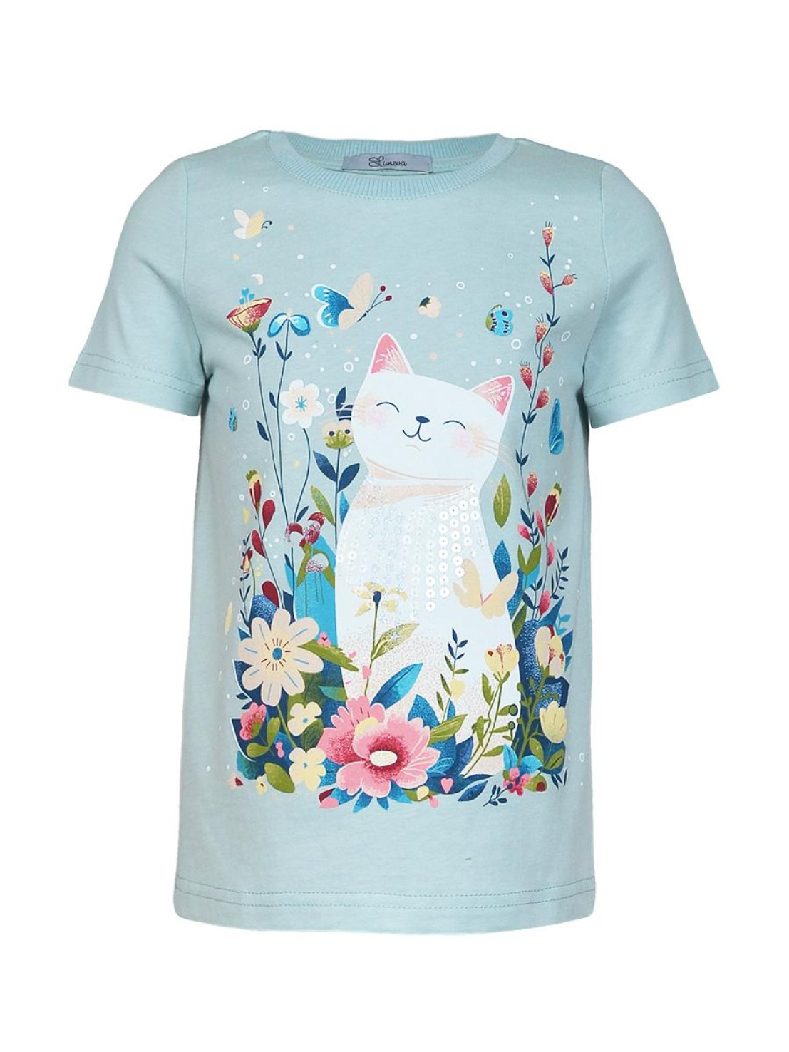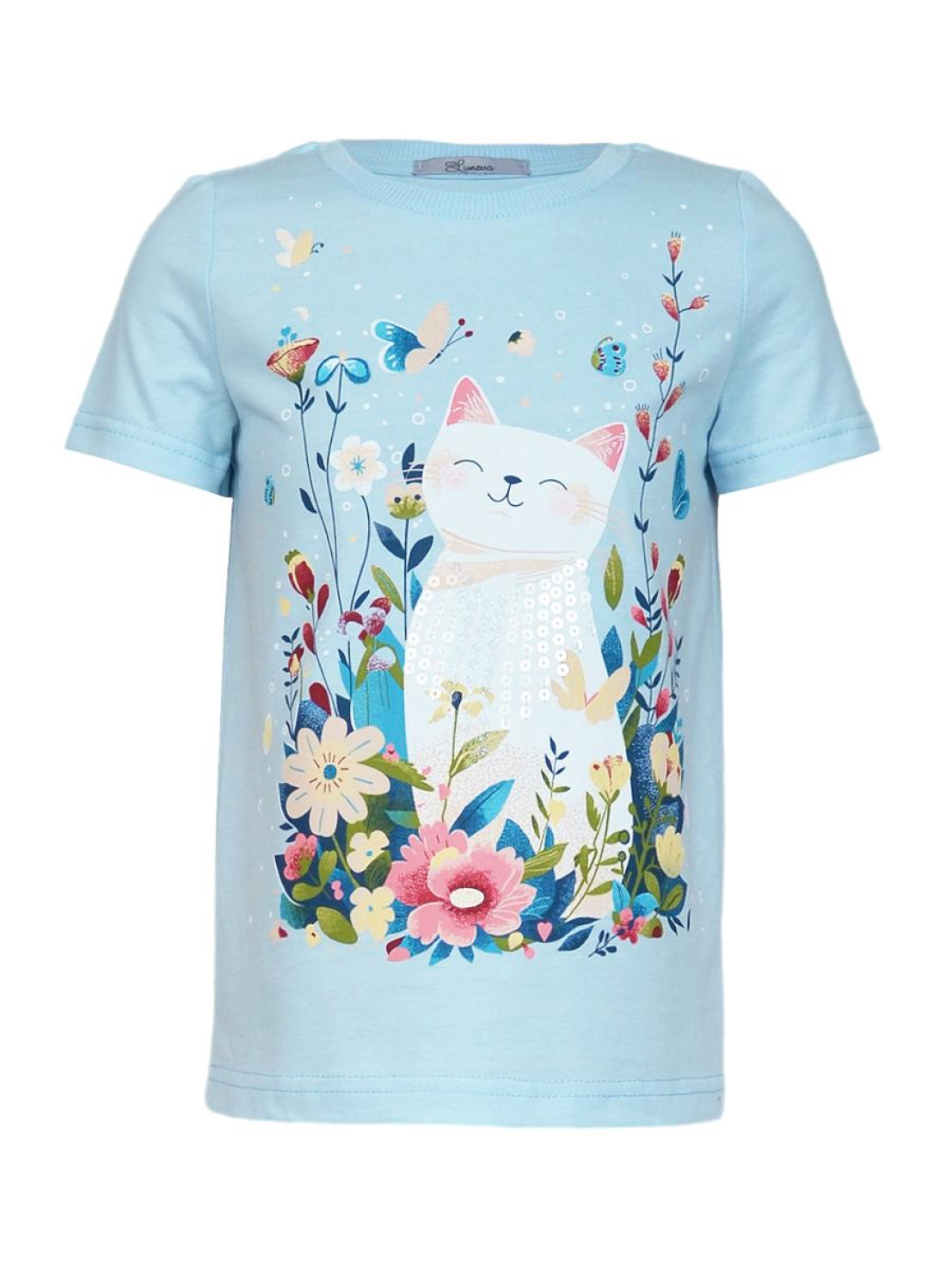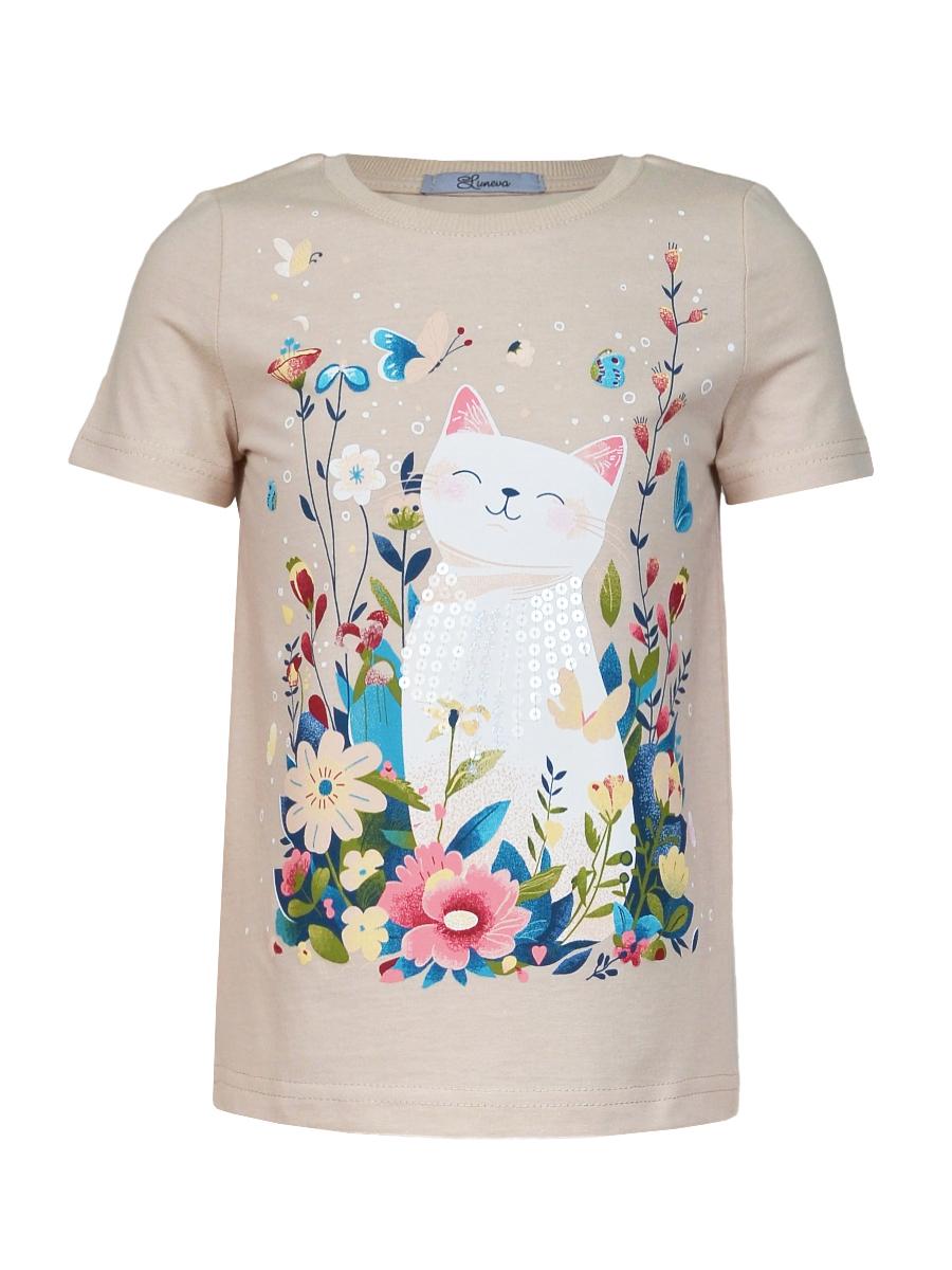 Кулирное полотно:100% х/б. Фуфайка-прямой силуэт,печать и вышивка(пайетки) на переде,короткий втачной рукав.Низ рукава и фуфайки подшит.Горловина обработана ластиком.