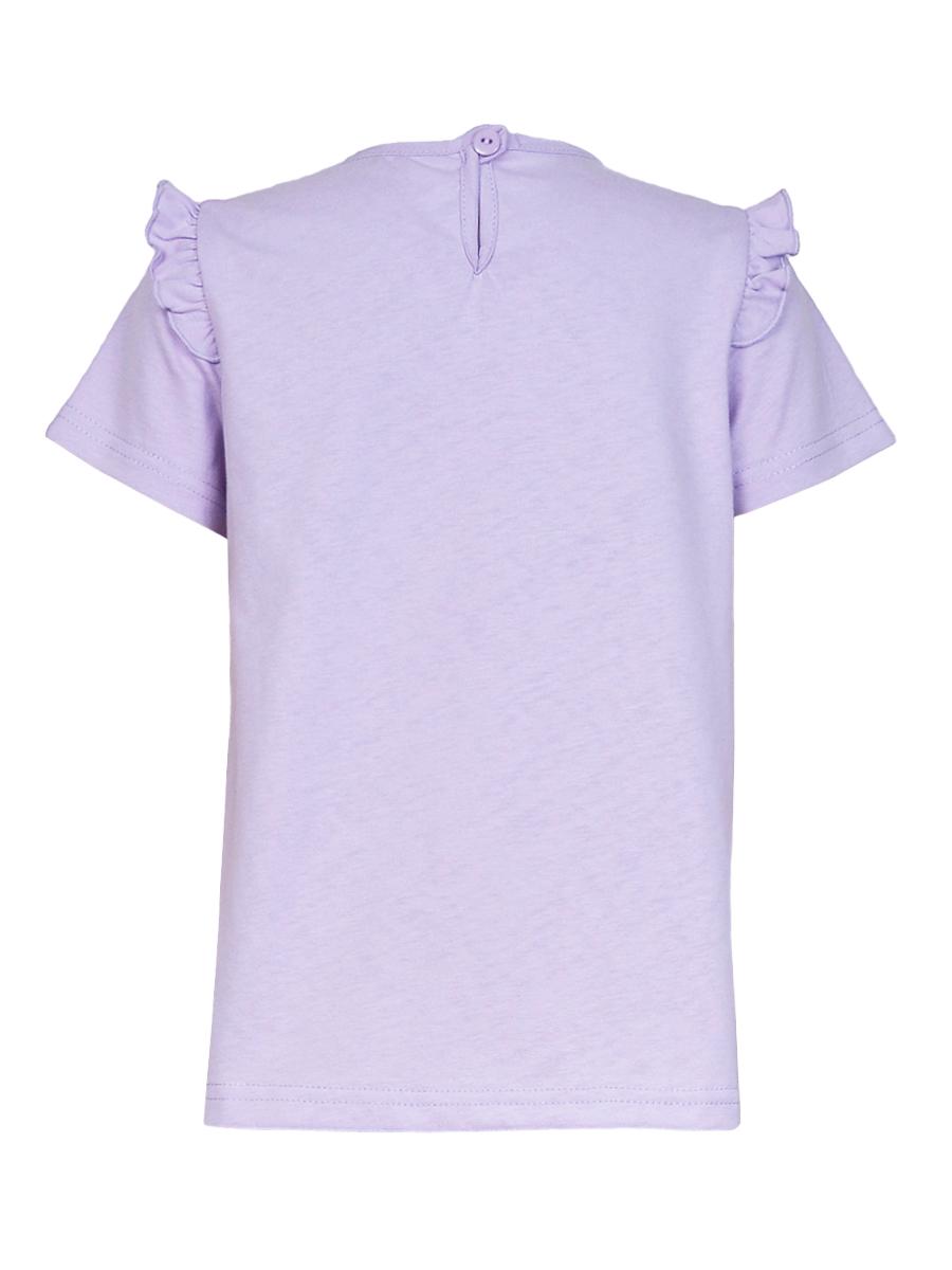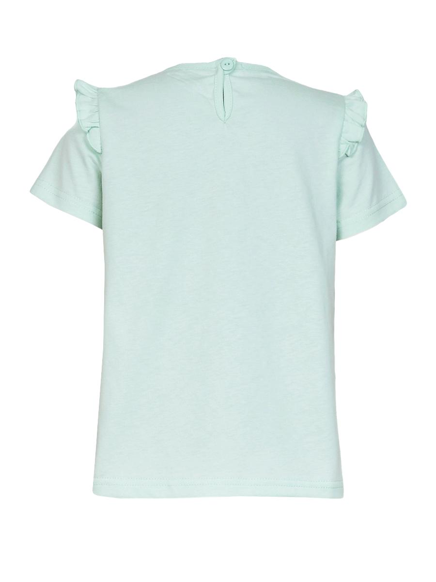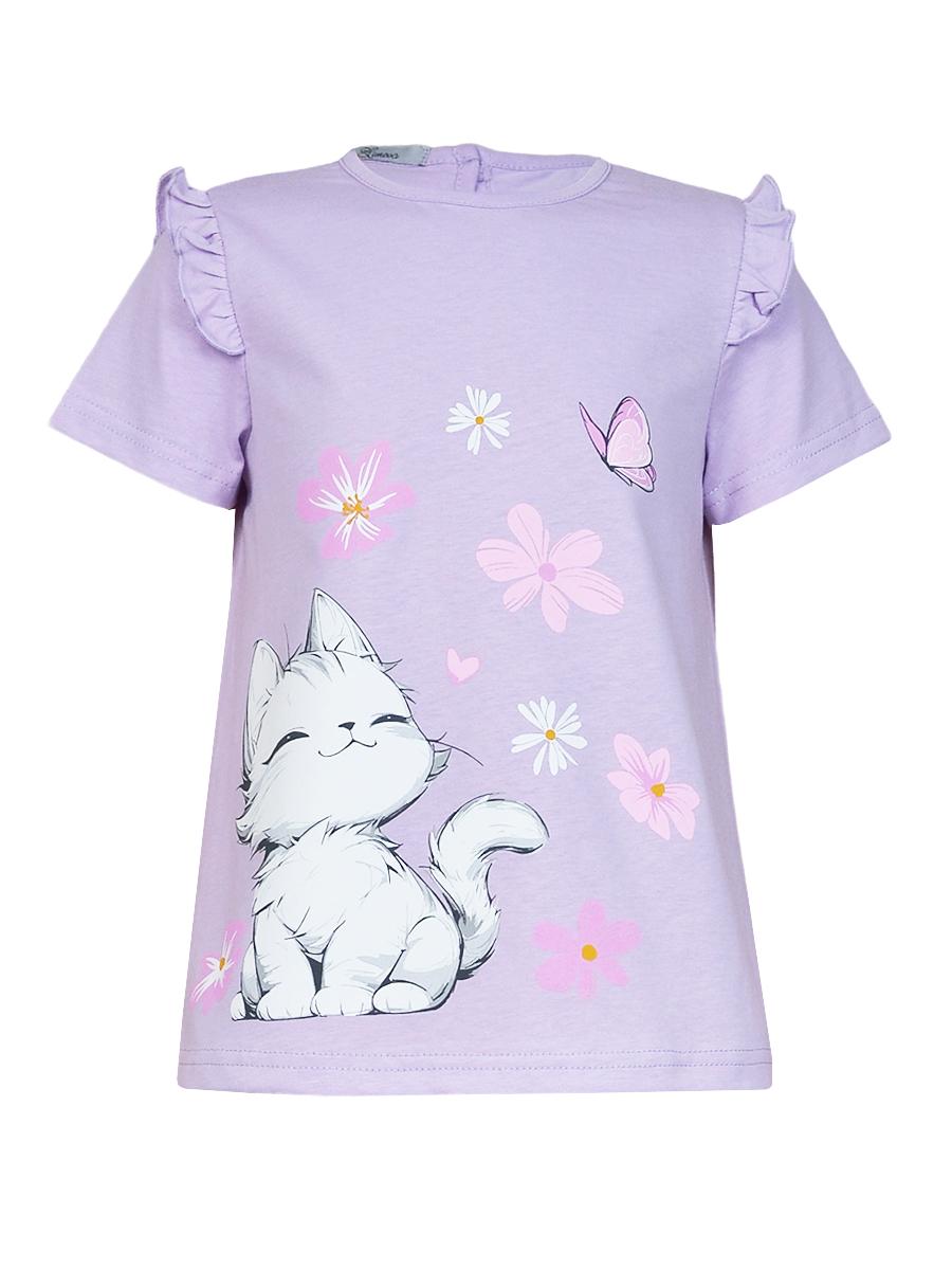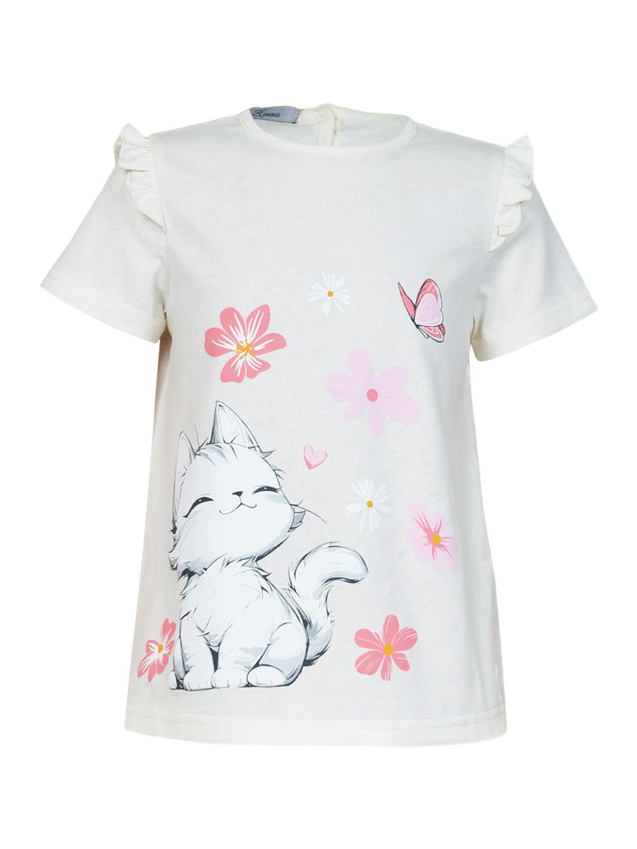 Кулирное полотно:100% х/б. Фуфайка-силуэт трапеция,короткий втачной рукав,в пройме рюша.Горловина окантована,застежка на пуговицу по спинке.Печать на переде.
