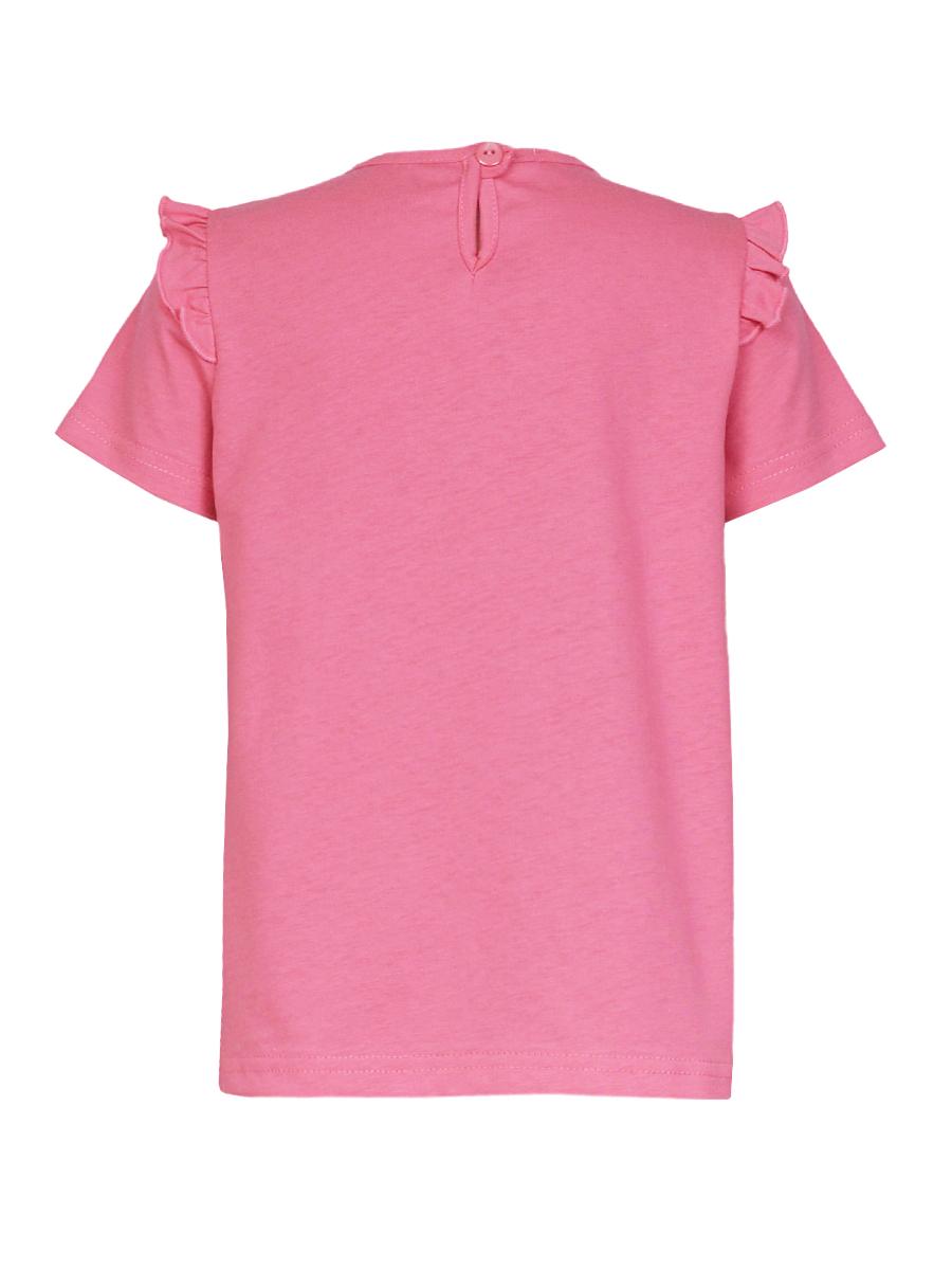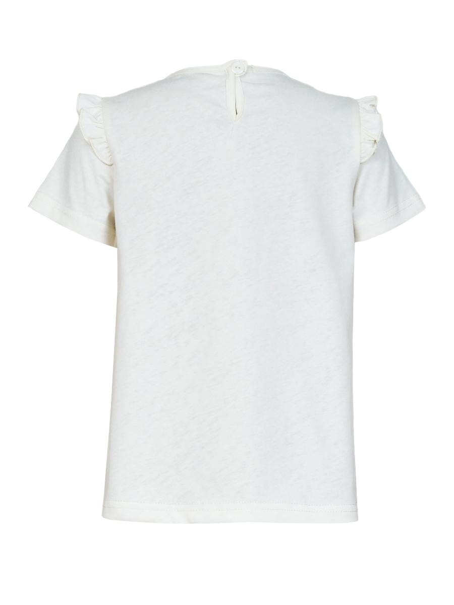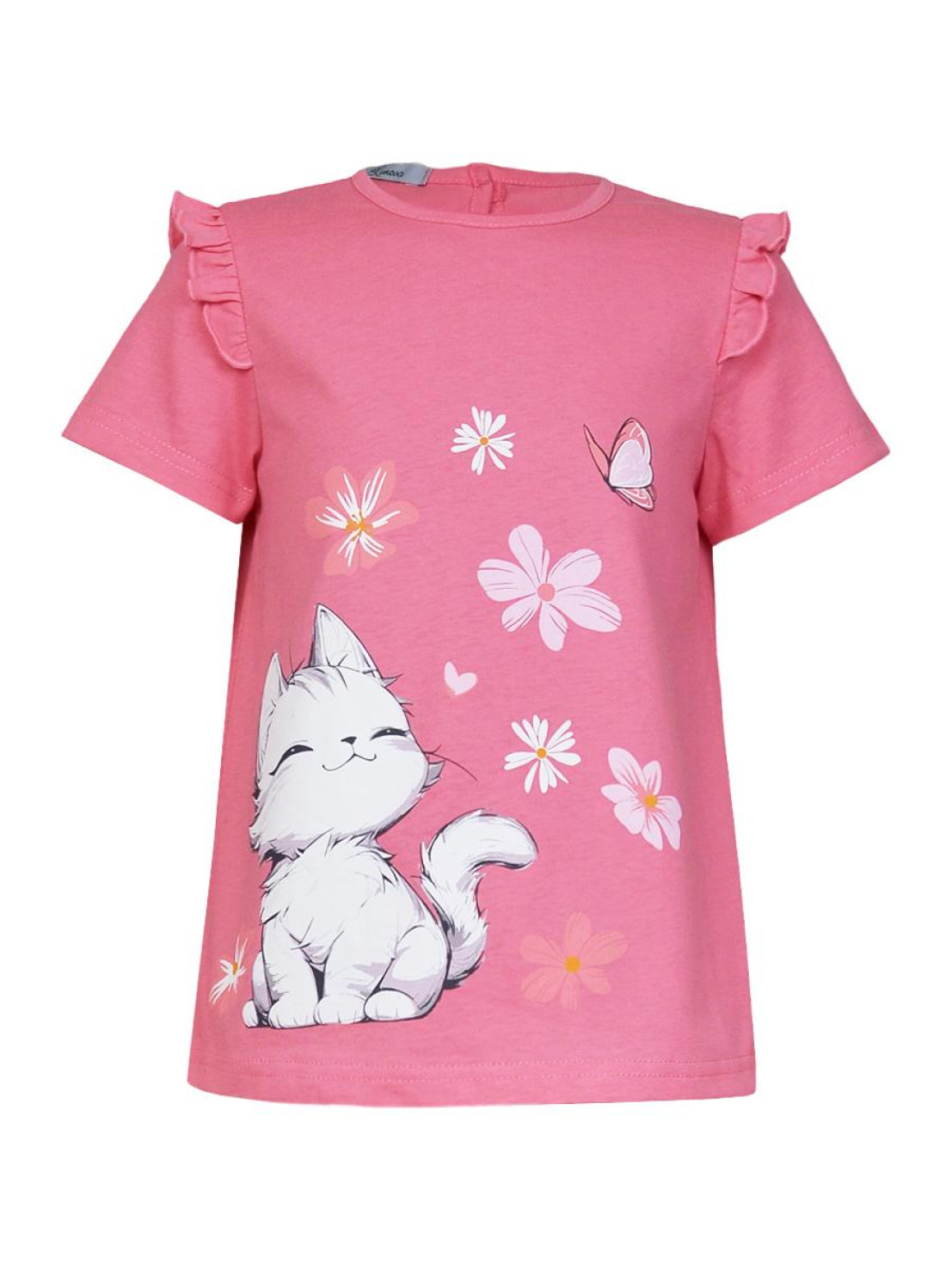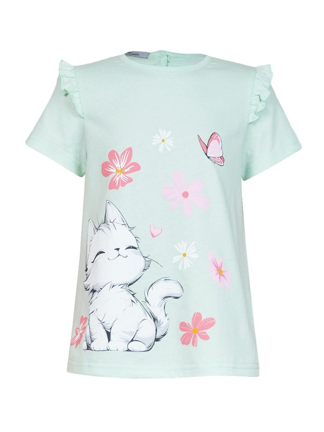 Кулирное полотно:100% х/б. Фуфайка-силуэт трапеция,короткий втачной рукав,в пройме рюша.Горловина окантована,застежка на пуговицу по спинке.Печать на переде.