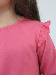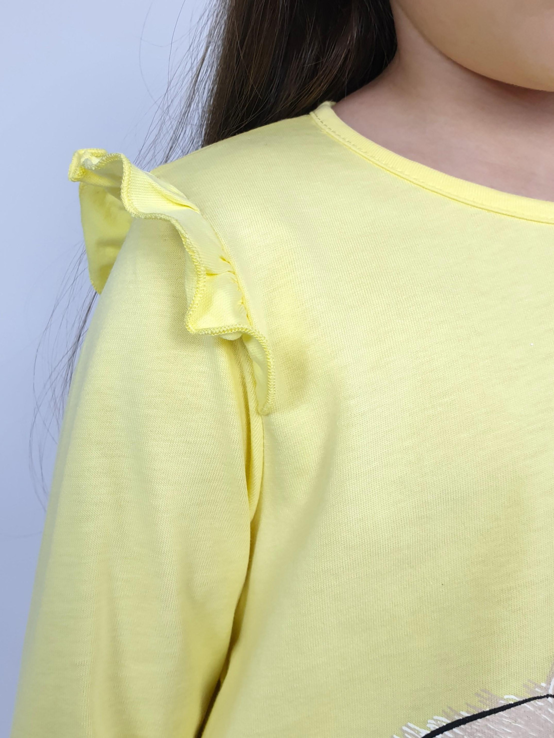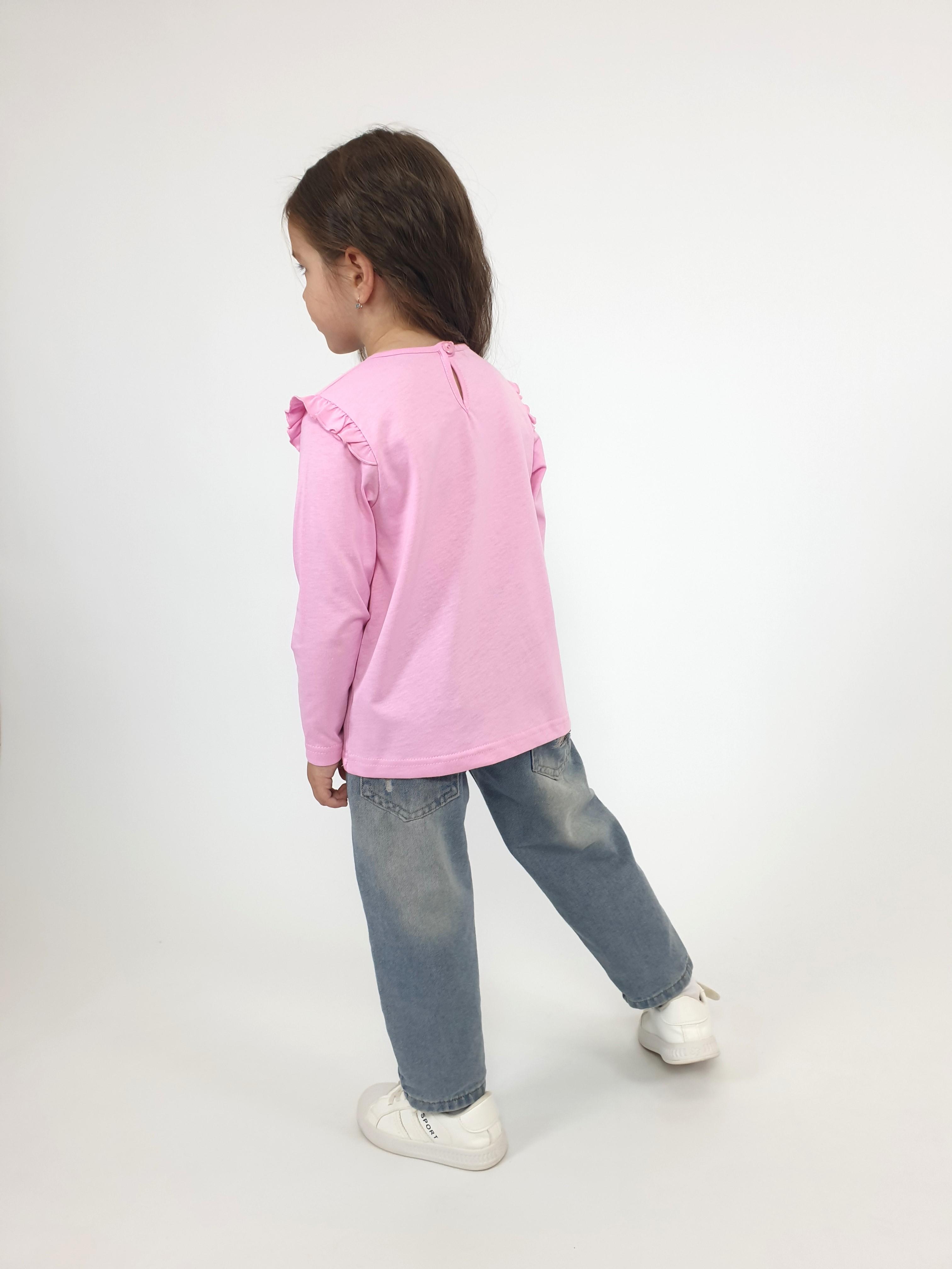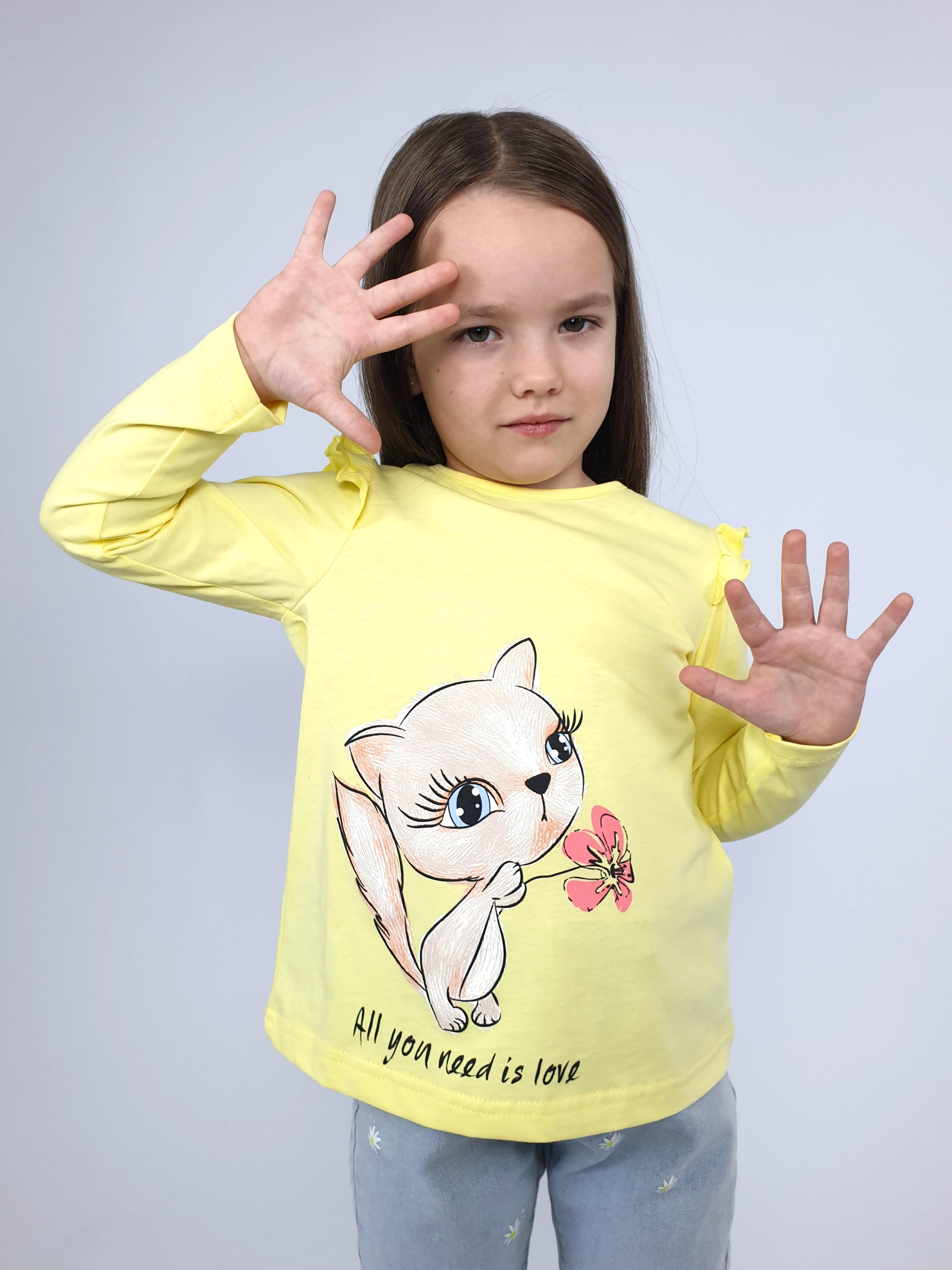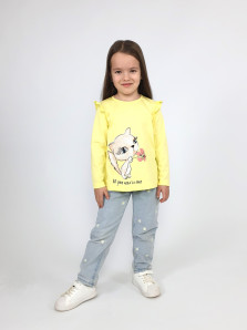 Кулирное полотно:100% х/б. Фуфайка-силуэт трапеция,длинный втачной рукав,в пройме рюша.Горловина окантована,застежка на пуговицу по спинке.Печать на переде.