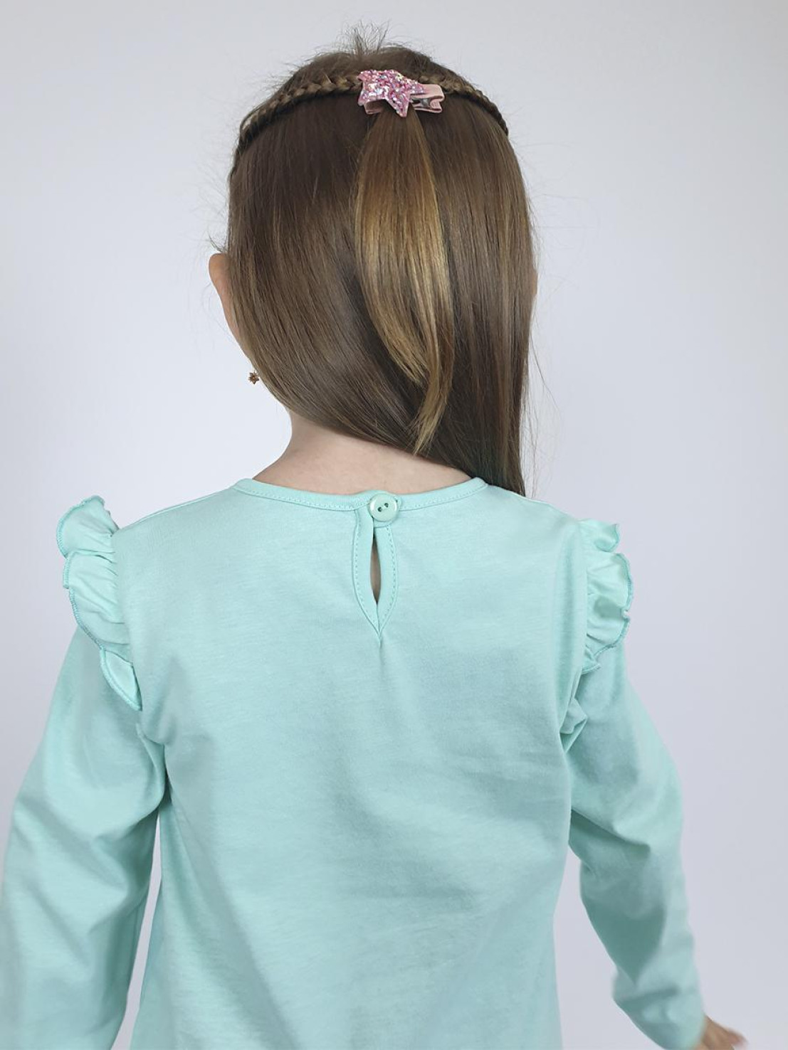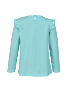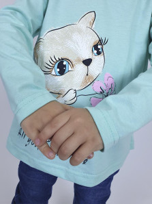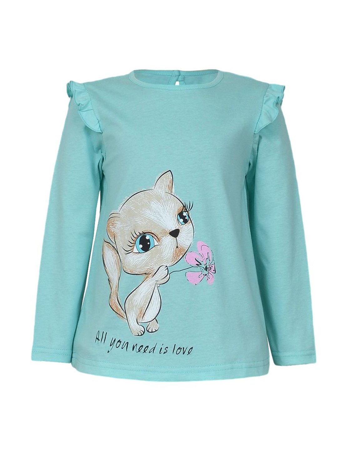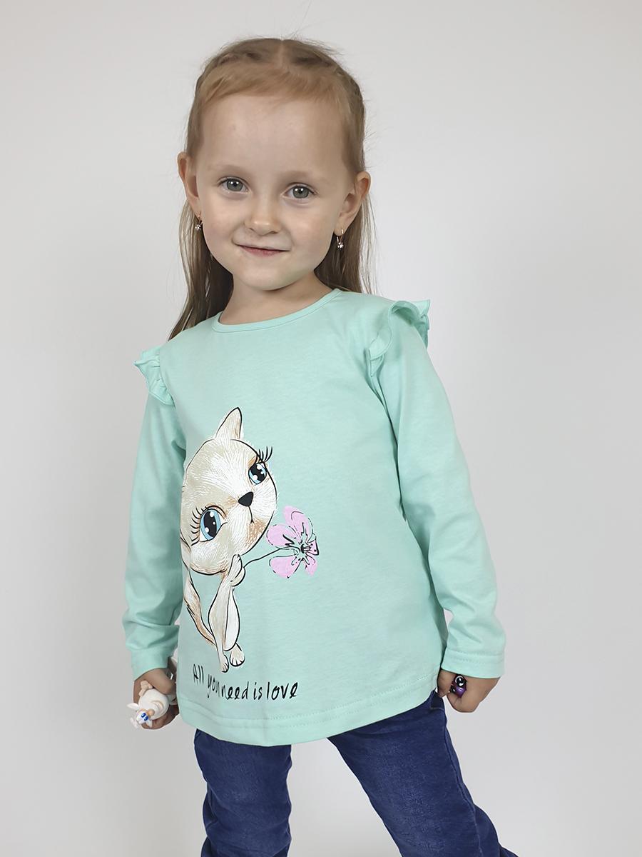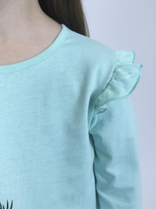 Кулирное полотно:100% х/б. Фуфайка-силуэт трапеция,длинный втачной рукав,в пройме рюша.Горловина окантована,застежка на пуговицу по спинке.Печать на переде.