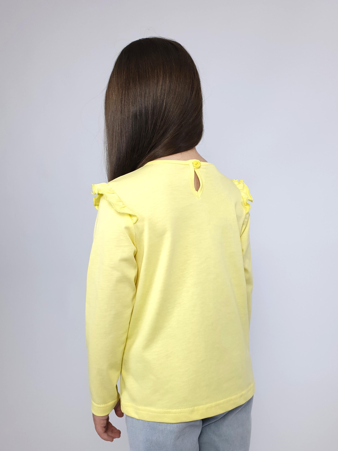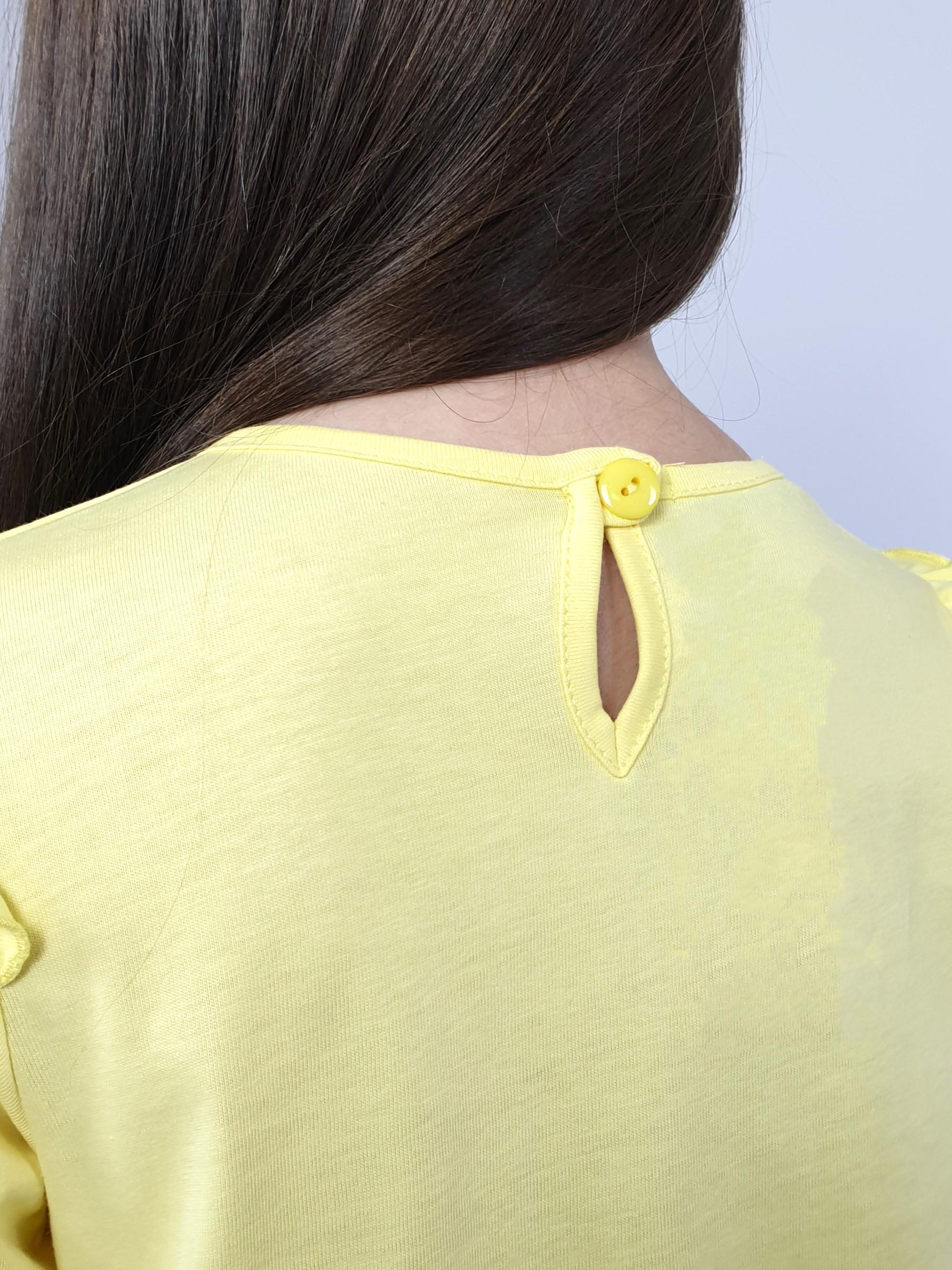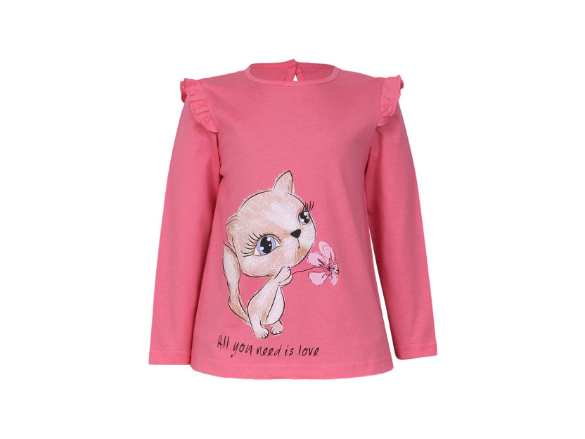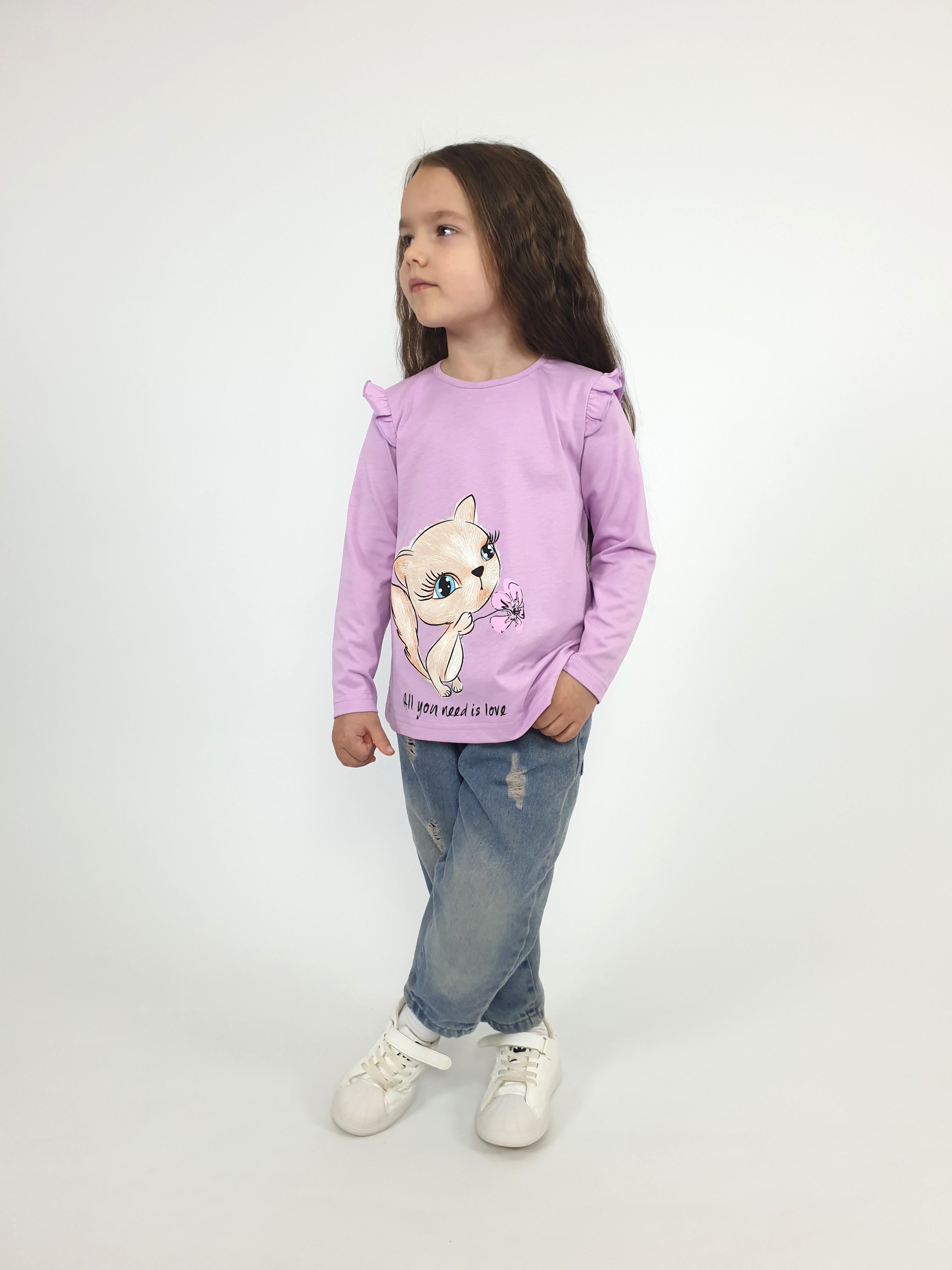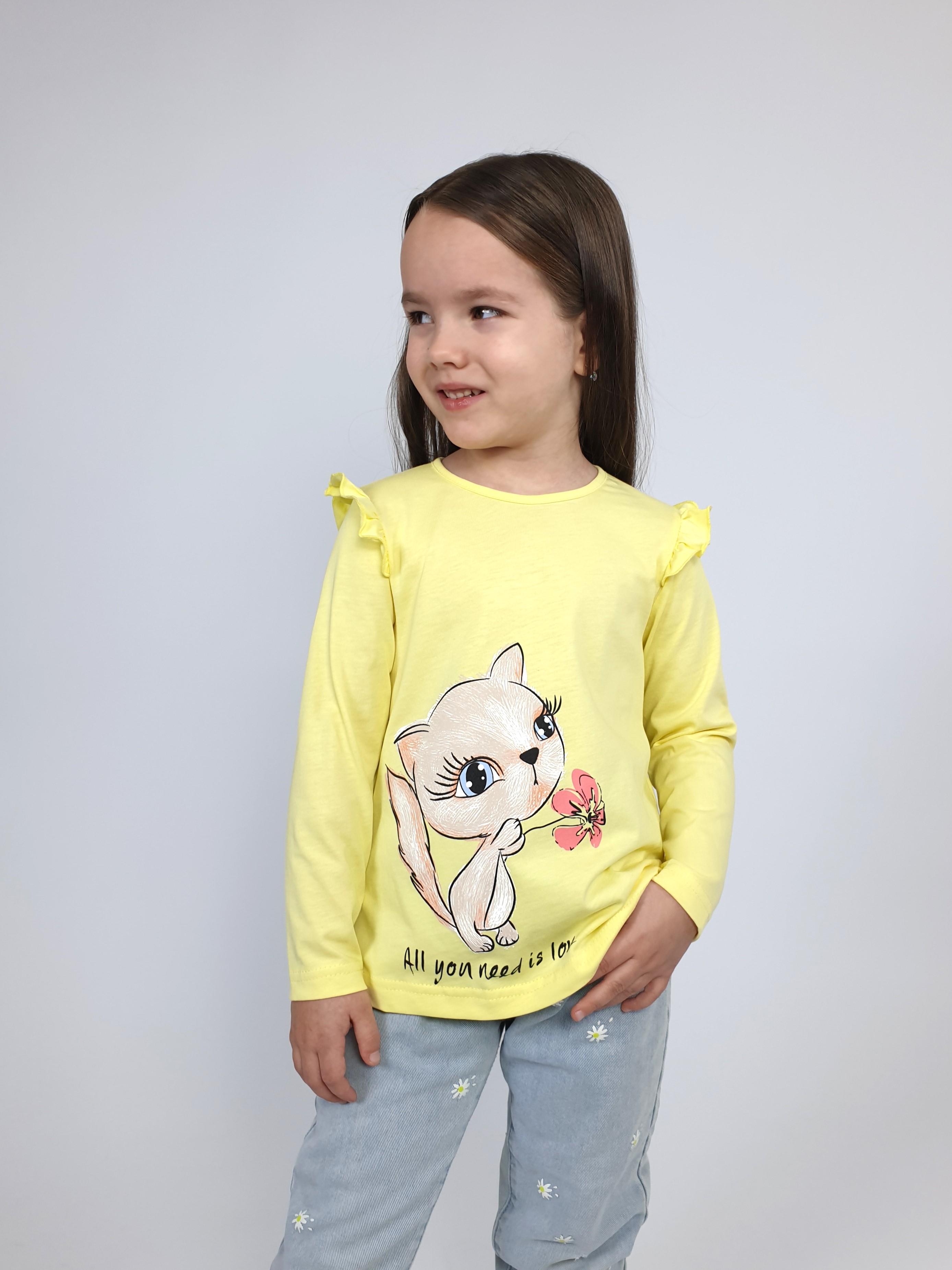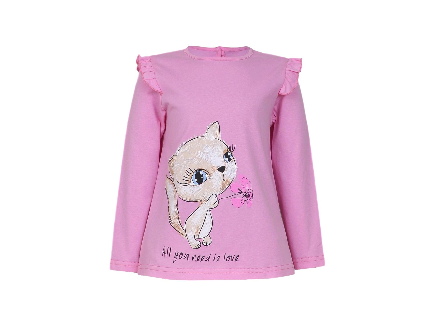 Кулирное полотно:100% х/б. Фуфайка-силуэт трапеция,длинный втачной рукав,в пройме рюша.Горловина окантована,застежка на пуговицу по спинке.Печать на переде.