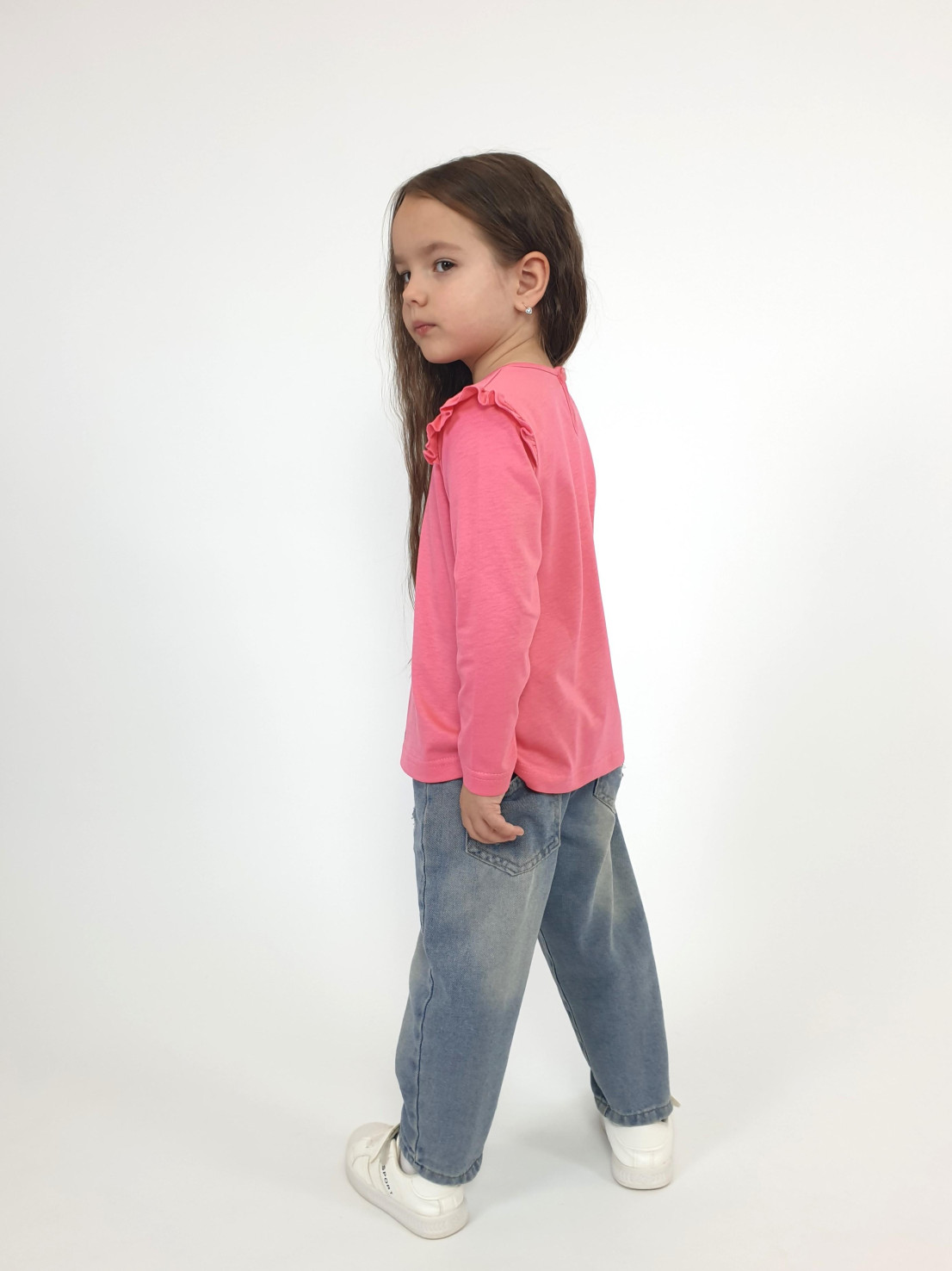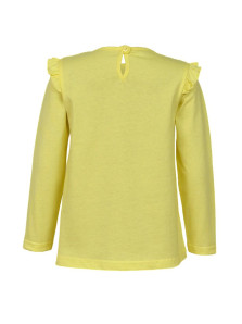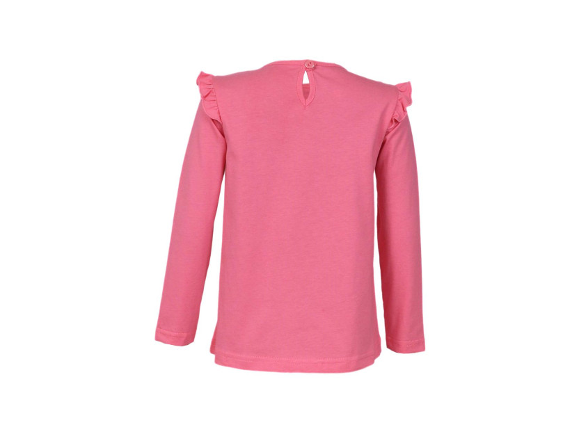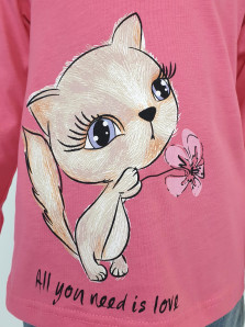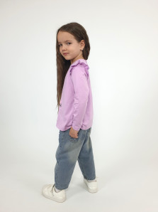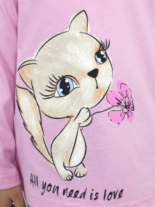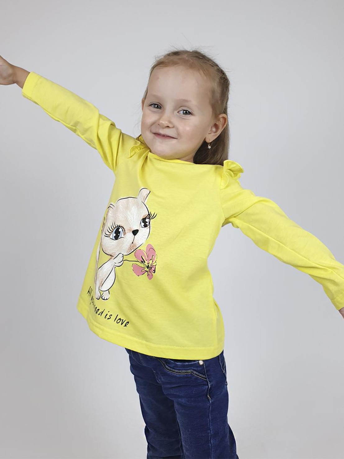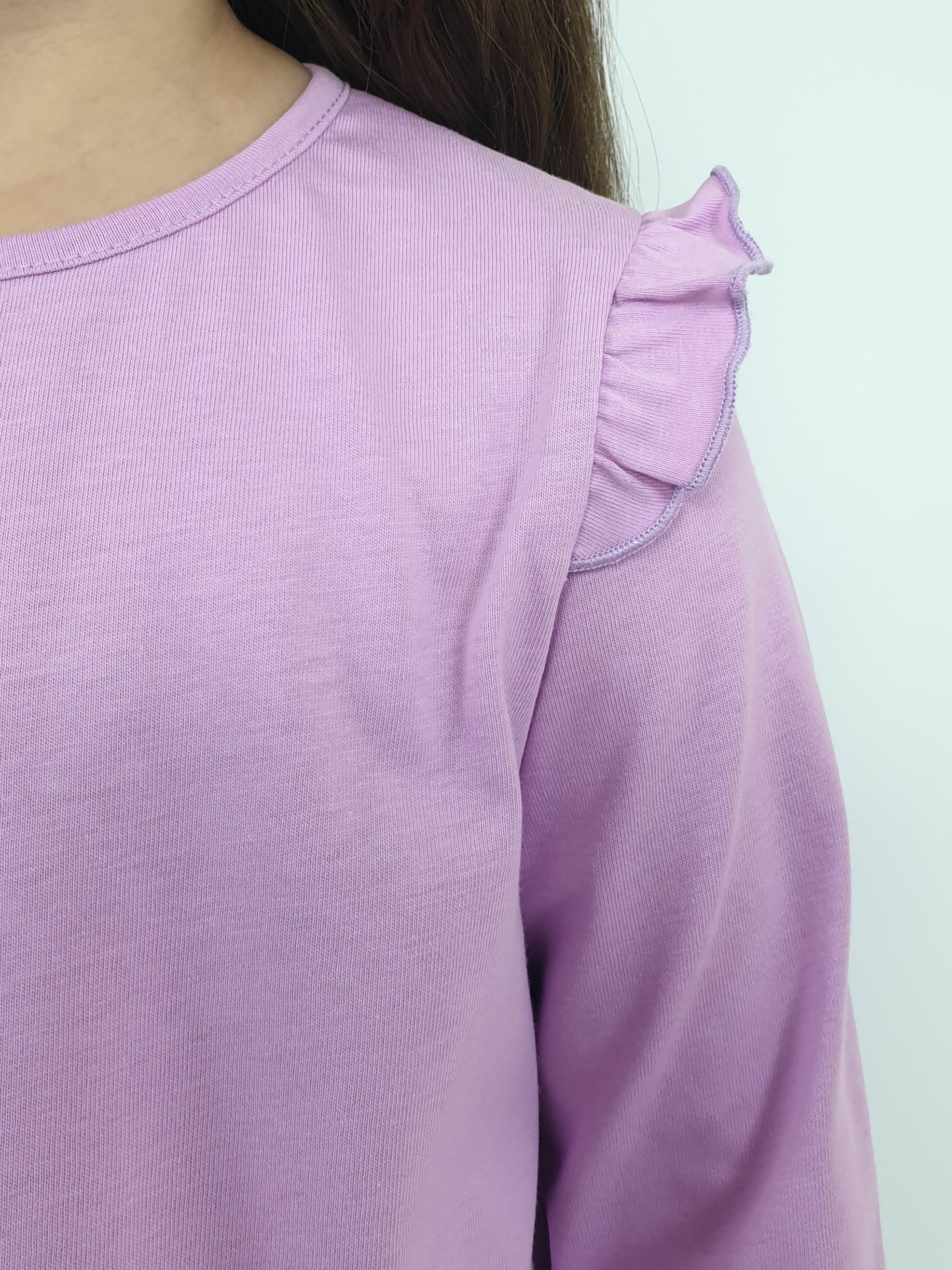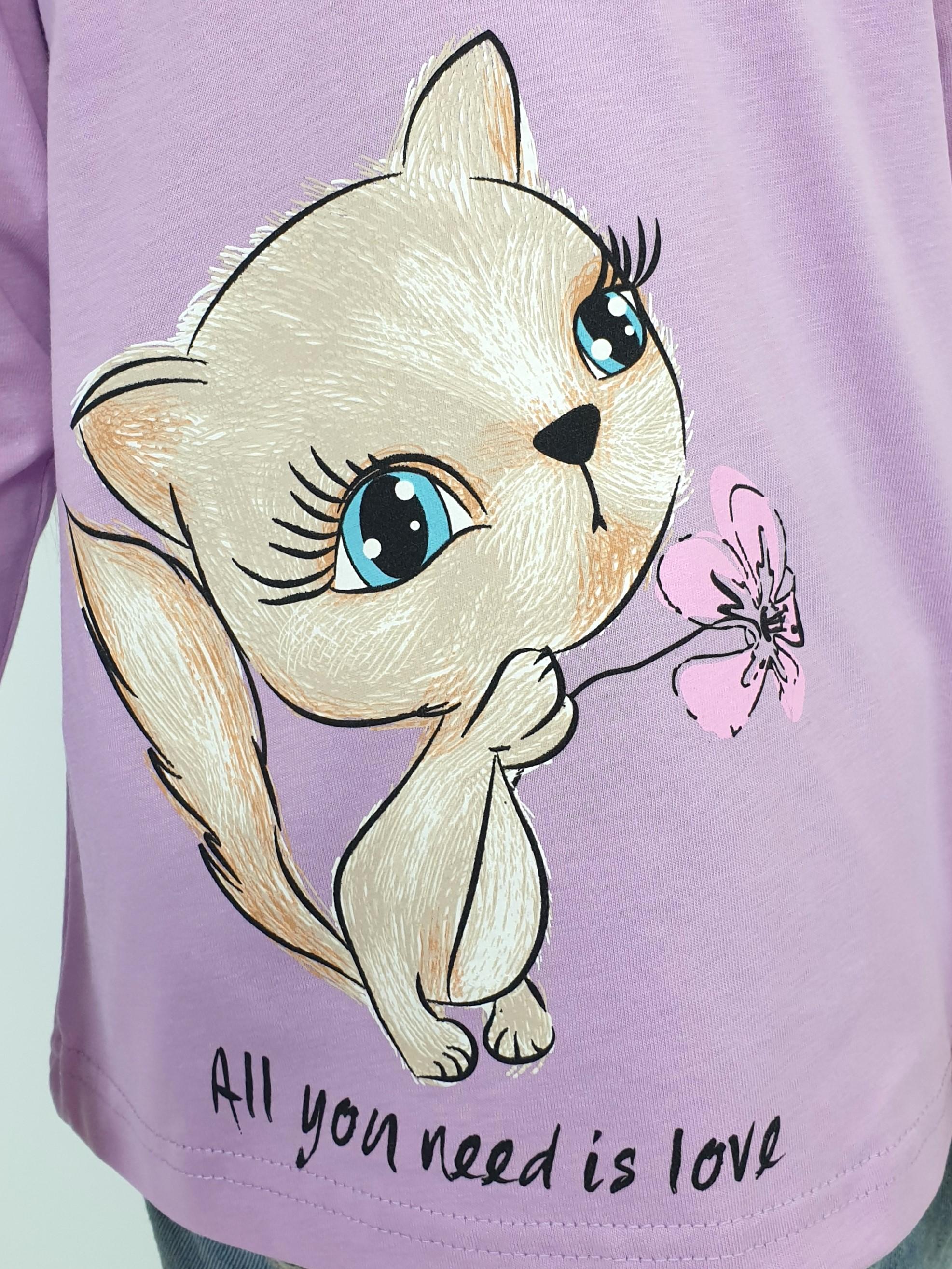 Кулирное полотно:100% х/б. Фуфайка-силуэт трапеция,длинный втачной рукав,в пройме рюша.Горловина окантована,застежка на пуговицу по спинке.Печать на переде.