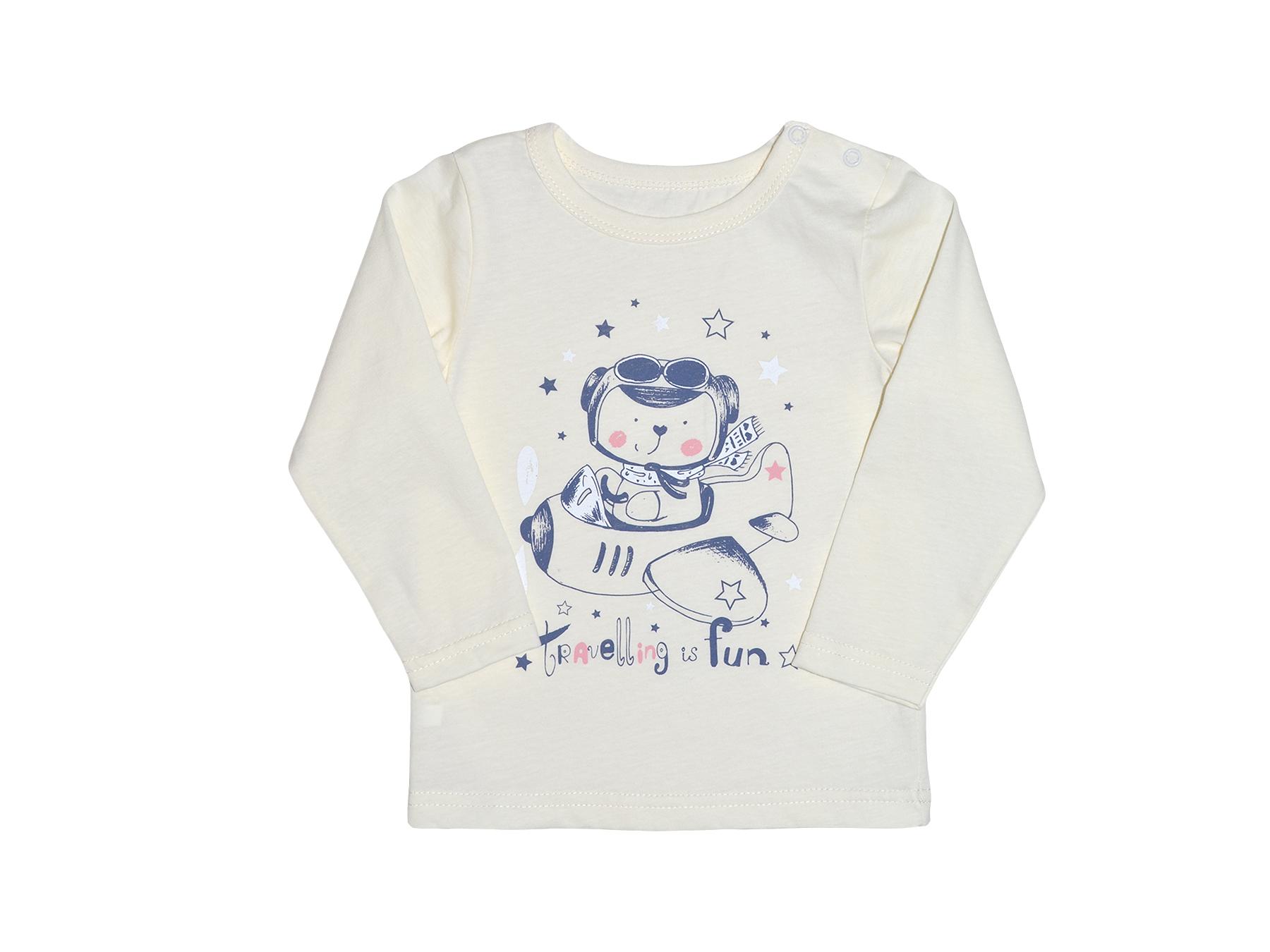 Кулирное полотно: 100% х/б. Фуфайка- прямой силуэт,длинный втачной рукав.Горловина окантована,застежка в плече на кнопки.Печать на переде.